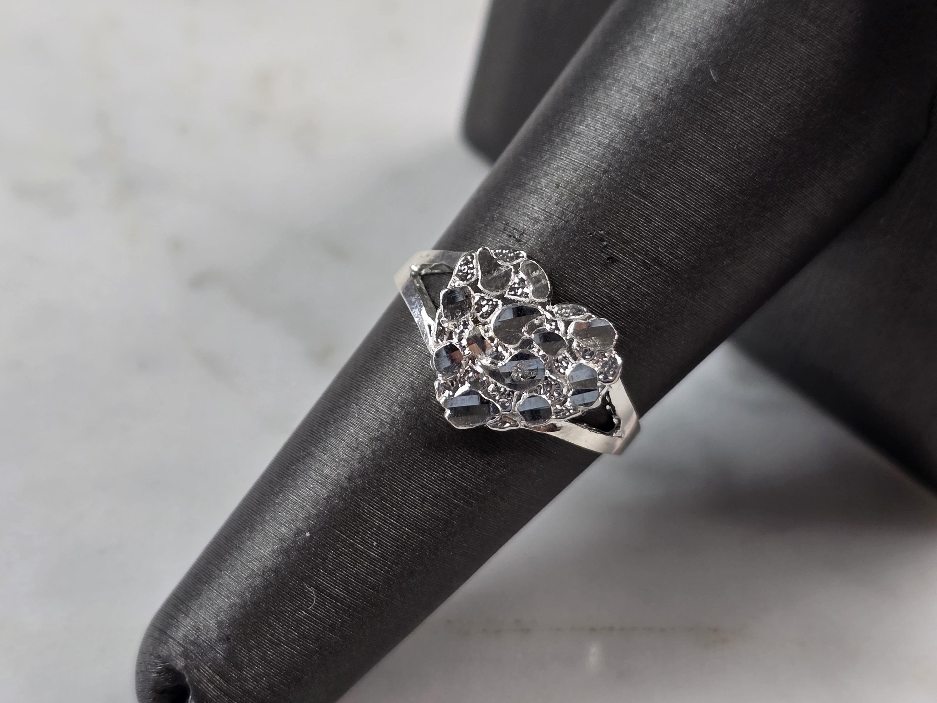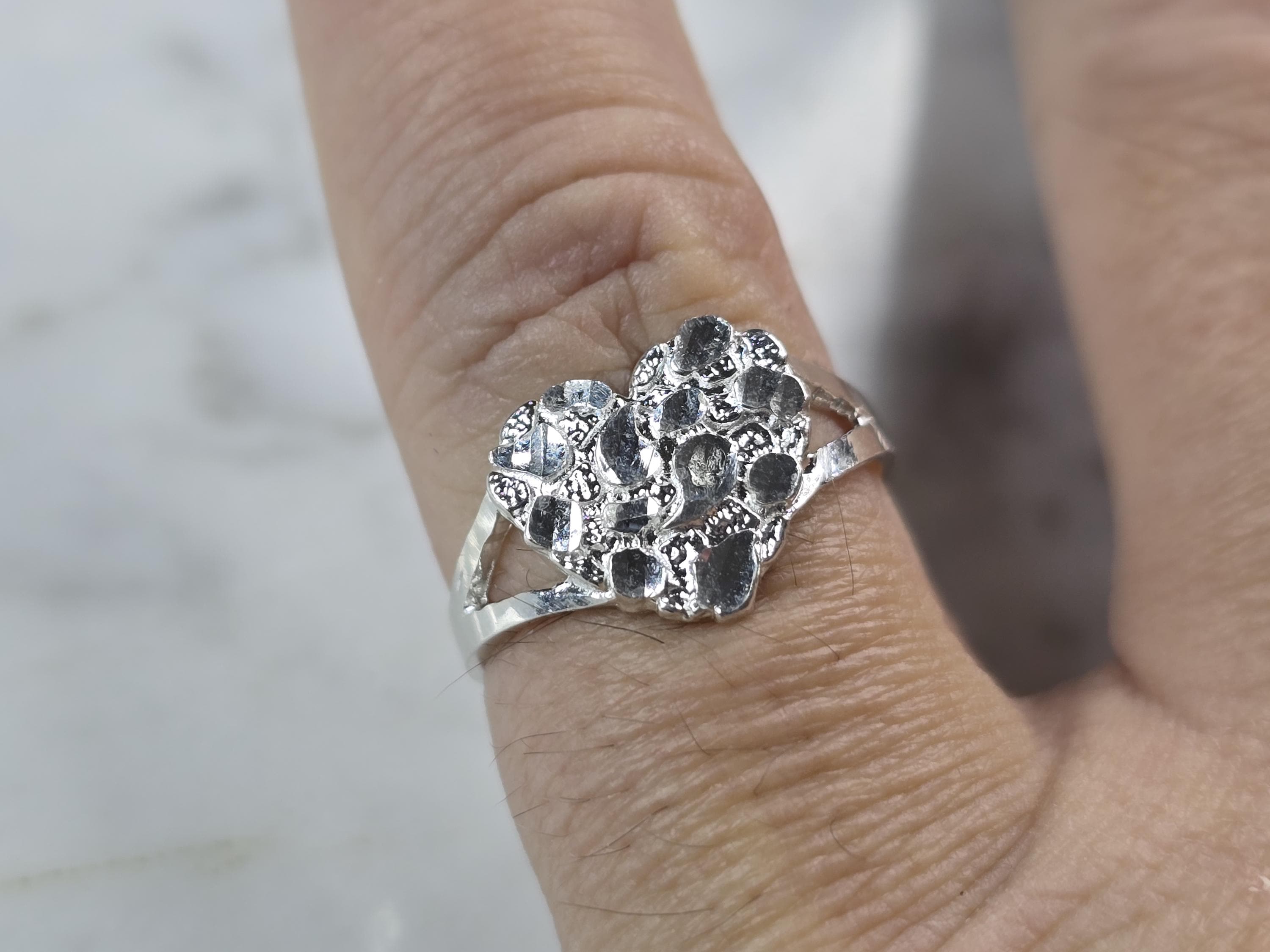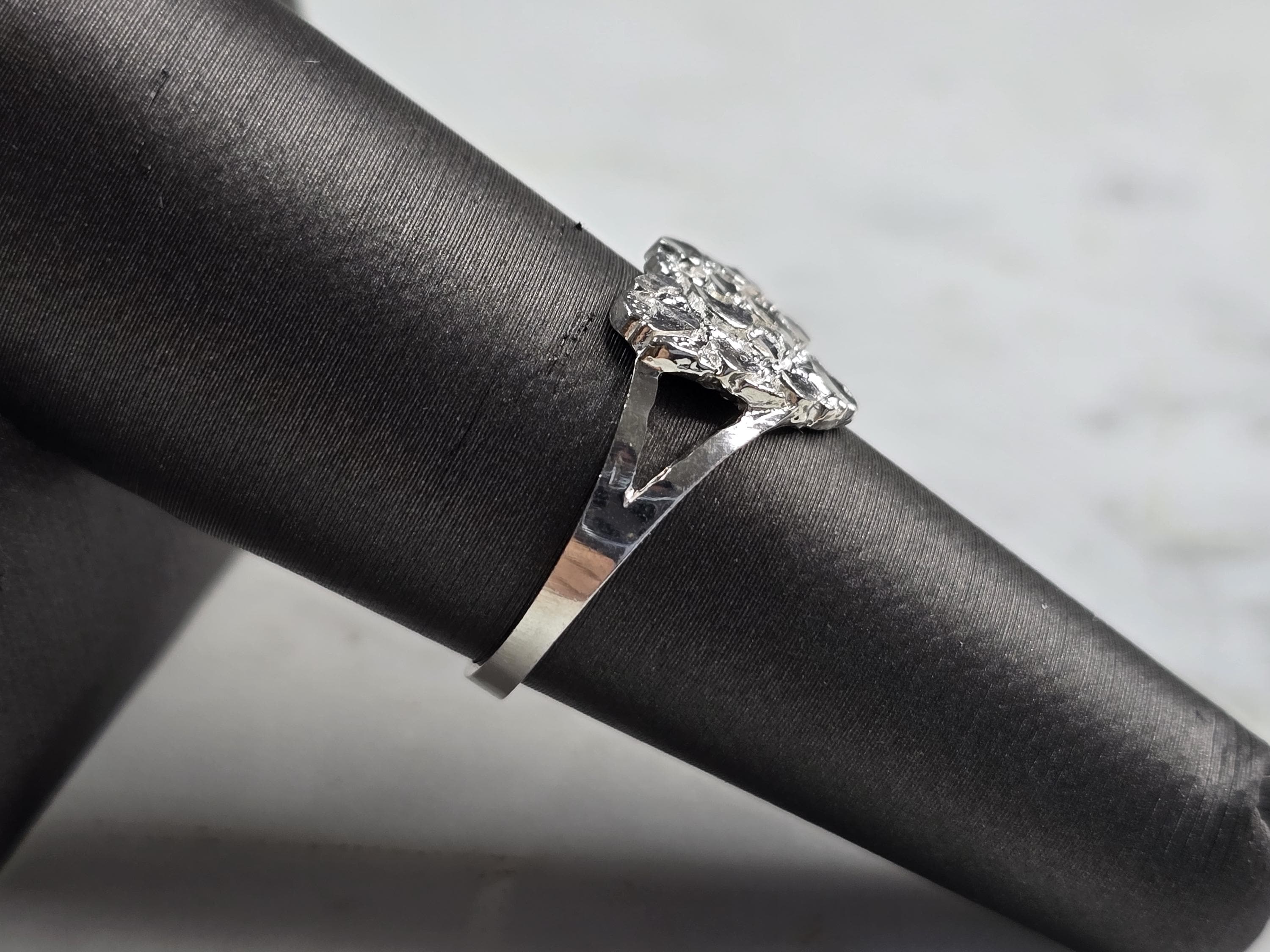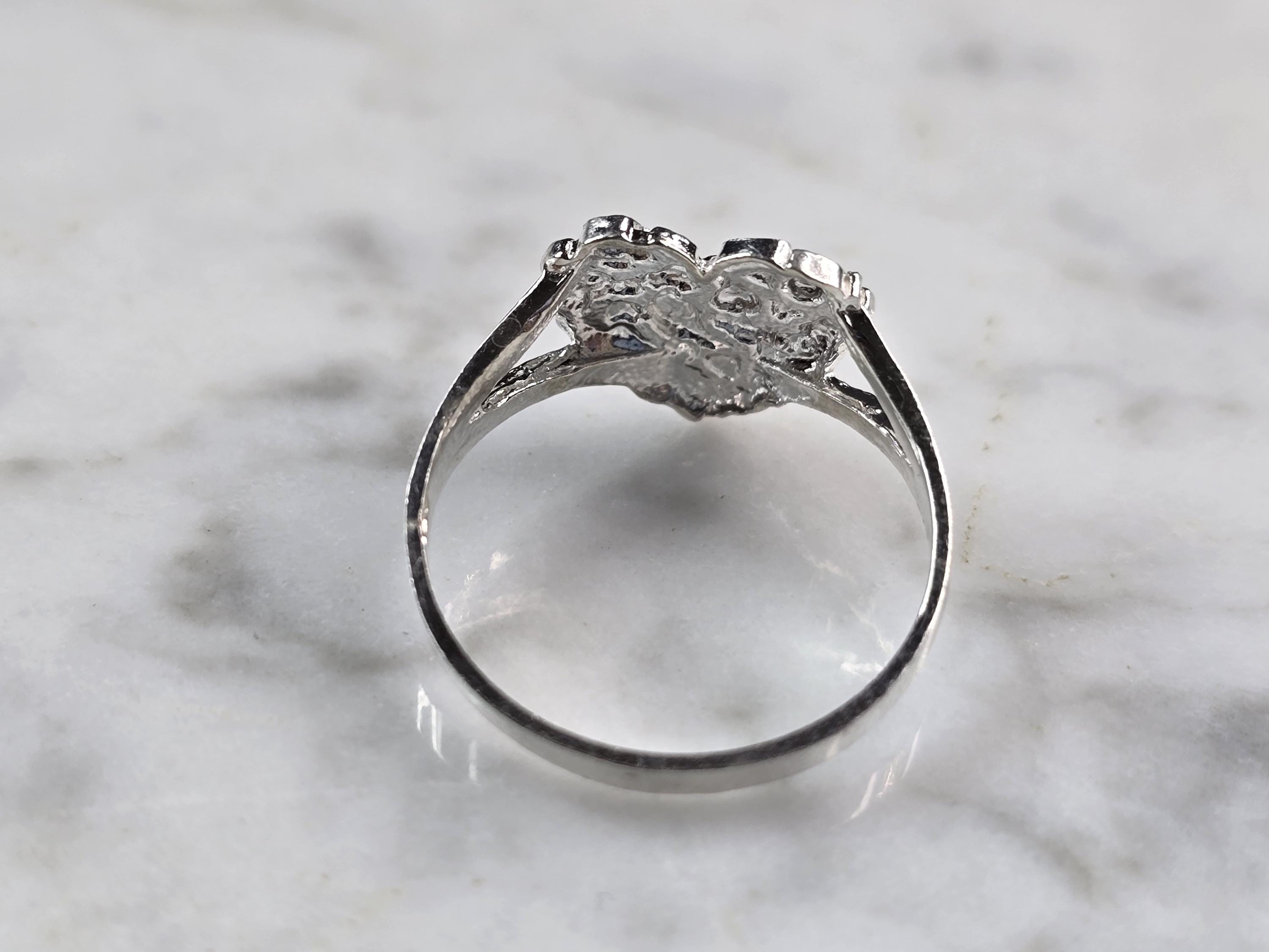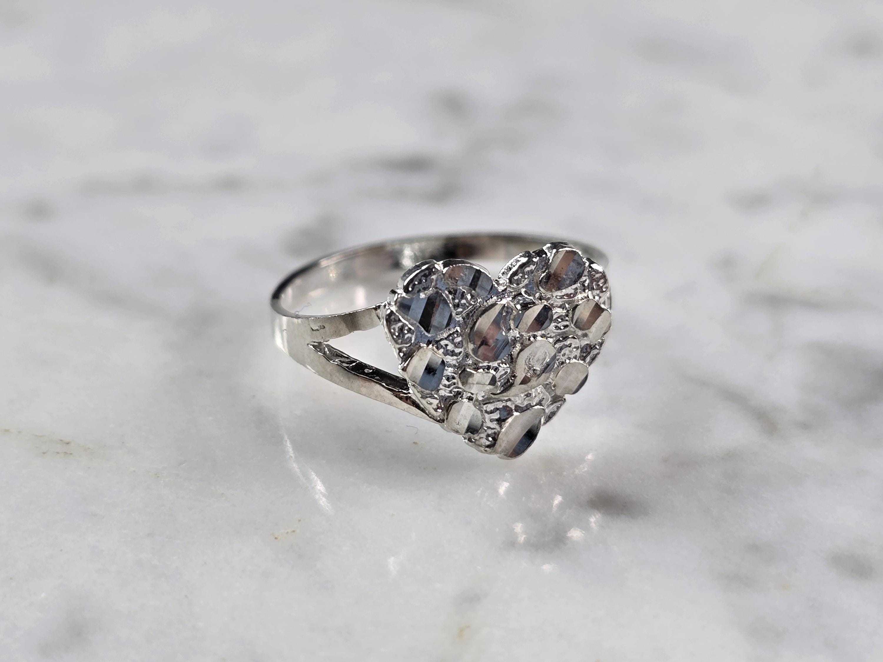 A WOMENS VINTAGE ESTATE STERLING SILVER MODERNIST HEART RING. THE TOTAL WEIGHT IS 1.9g, AND IS A SIZE 9.0. THE WIDTH OF THE RING IS 1/2". THIS RING WOULD MAKE A GREAT GIFT FOR SOMEONE SPECIAL. ANY QUESTIONS PLEASE DONT HESITATE TO ASK. BE SURE TO CHECK OUT SOME OF OUR OTHER GREAT ITEMS UP FOR SALE. THANK YOU.