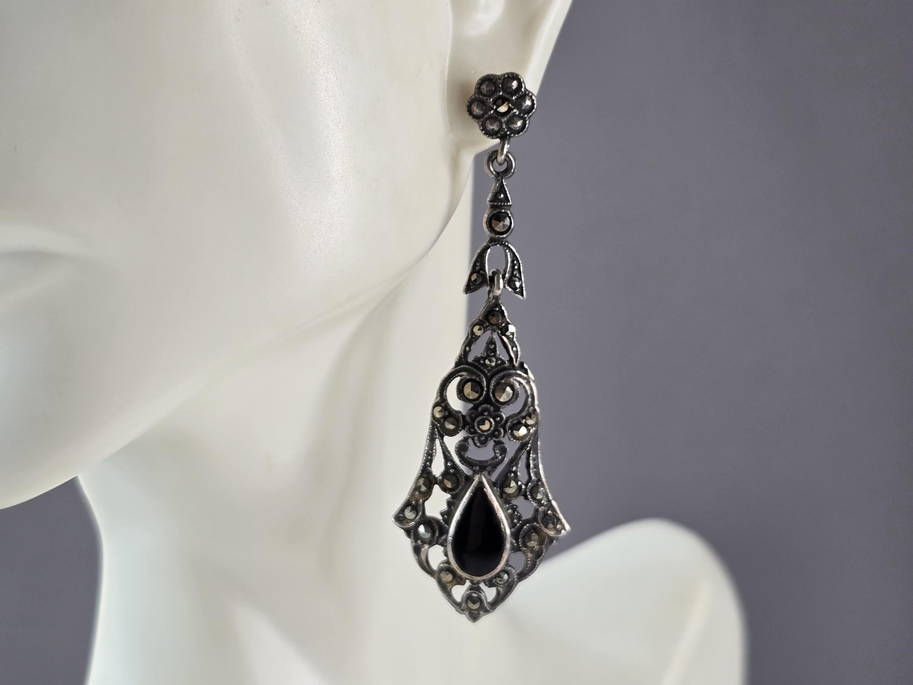 FOR SALE IS THIS PAIR OF WOMEN'S STERLING SILVER ONYX DANGLE EARRINGS. THE EARRINGS WEIGH 9.0g, AND MEASURE 2 1/4" LONG BY 3/4" WIDE. CONDITION IS VERY NICE. THEY MAKE A LOVELY GIFT FOR THAT SOMEONE SPECIAL. ANY QUESTIONS, PLEASE DON'T HESITATE TO ASK. BE SURE TO CHECK OUT SOME OF MY OTHER OTHER GREAT ITEMS UP FOR SALE. THANK YOU.