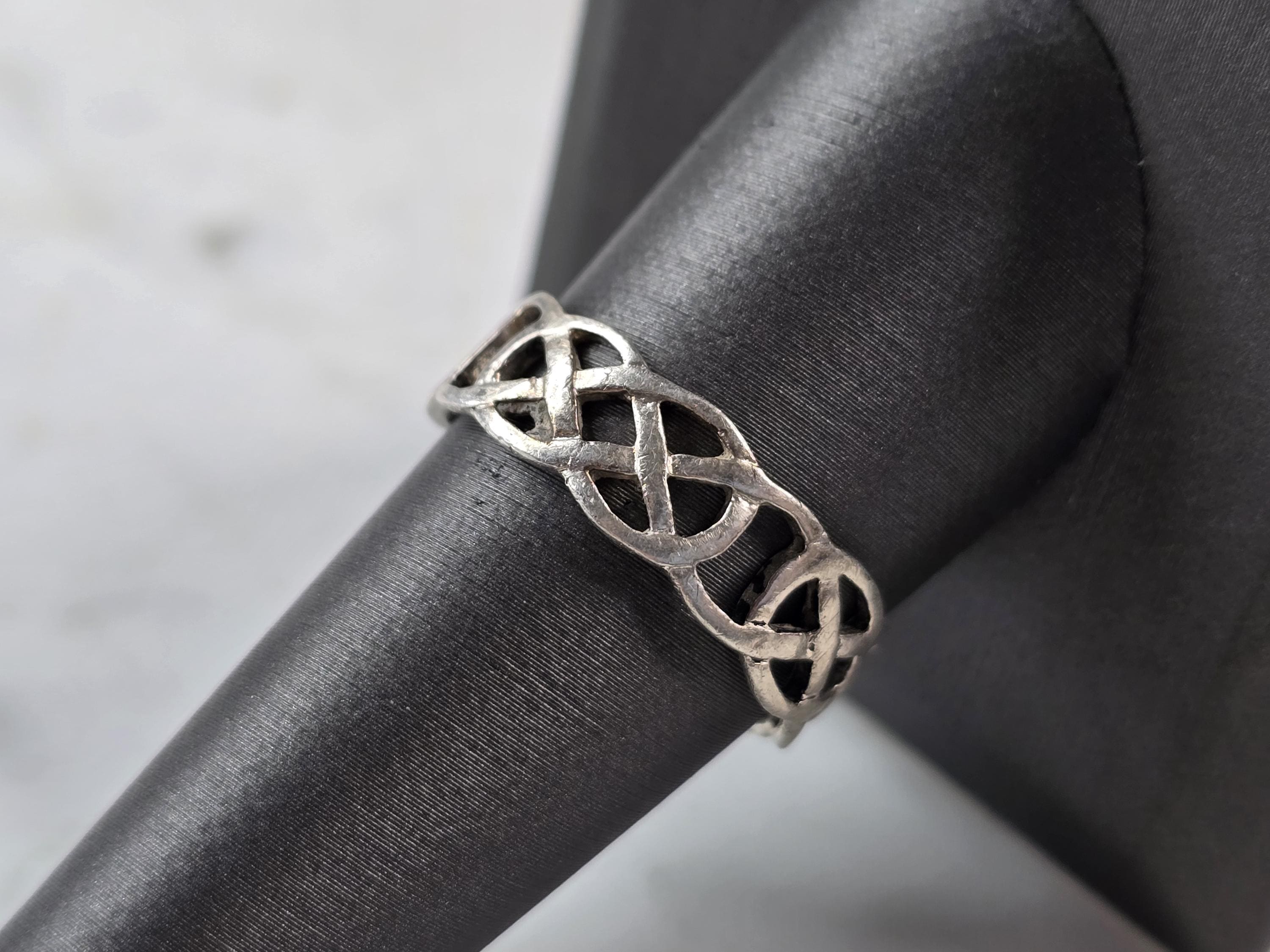 A WOMENS VINTAGE ESTATE STERLING SILVER MODERNIST ETERNITY KNOT RING. RING WEIGHS 2.9g, AND IS A SIZE 9.5. THE WIDTH OF THE RING IS 1/4". THIS WOULD MAKE A NICE GIFT FOR THAT SOMEONE SPECIAL. ANY QUESTIONS PLEASE DO NOT HESITATE TO ASK. BE SURE TO CHECK OUT SOME OF MY OTHER GREAT ITEMS UP FOR SALE. THANK YOU