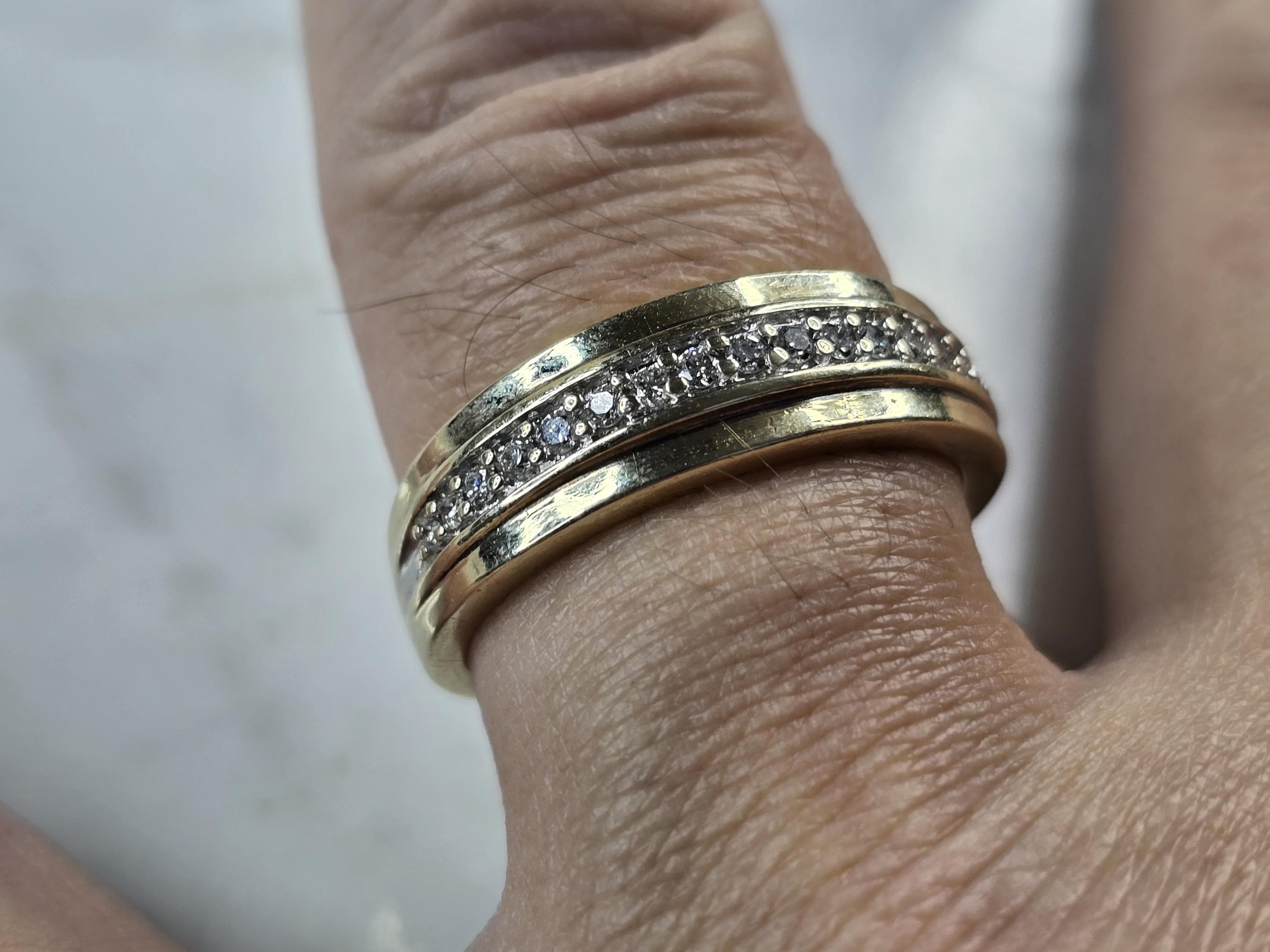 A MENS VINTAGE 10K YELLOW GOLD DIAMOND RING. THE SIZE OF THE RING IS A 10.0, AND WEIGHS 4.1g. THE WIDTH OF THE BAND IS 1/4". RING HAS 17 TINY DIAMONDS. RING IS STAMPED 10K. ANY QUESTIONS PLEASE DO NOT HESITATE TO ASK. BE SURE TO CHECK OUT SOME OF MY OTHER GREAT ITEMS UP FOR SALE. THANK YOU.