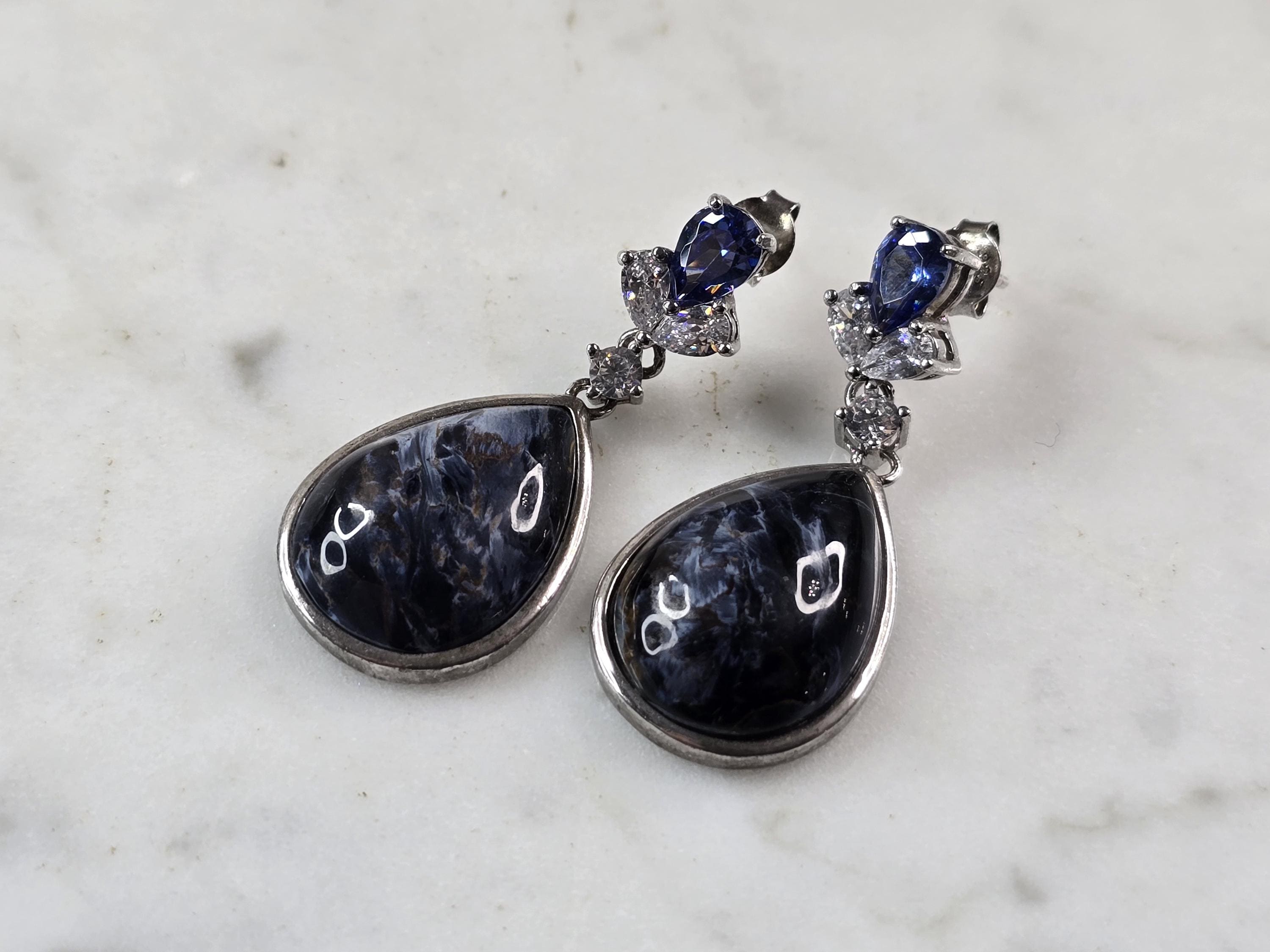 PAIR OF WOMENS VINTAGE ESTATE STERLING SILVER SODALITE DANGLE EARRINGS. EARRINGS MEASURE 1 1/2" LONG BY 5/8" WIDE. THE EARRINGS WEIGH 12.6g. MAKES A LOVELY GIFT FOR THAT SOMEONE SPECIAL. ANY QUESTIONS, PLEASE DON'T HESITATE TO ASK. BE SURE TO CHECK OUT SOME OF MY OTHER GREAT ITEMS UP FOR SALE. THANK YOU.