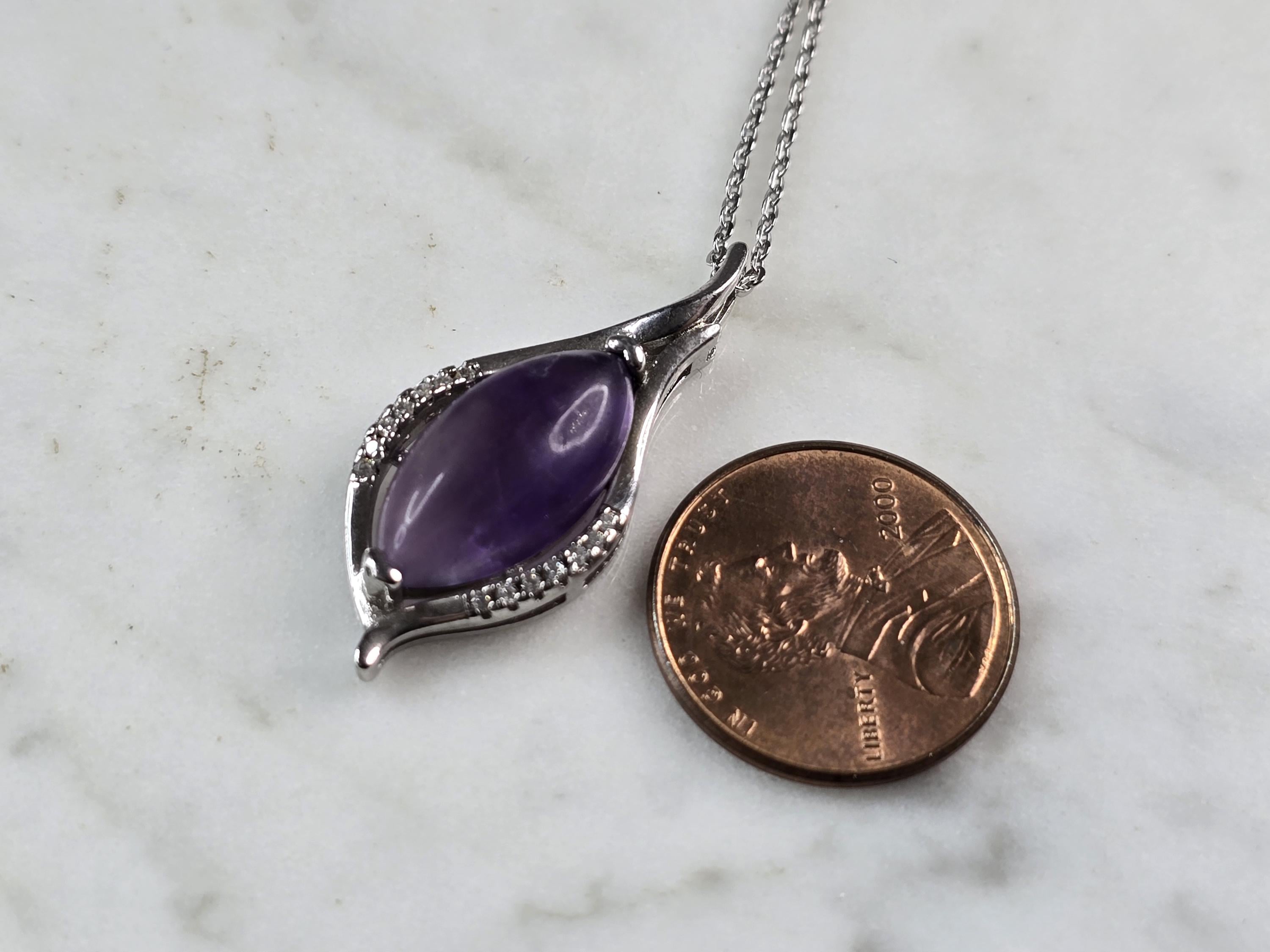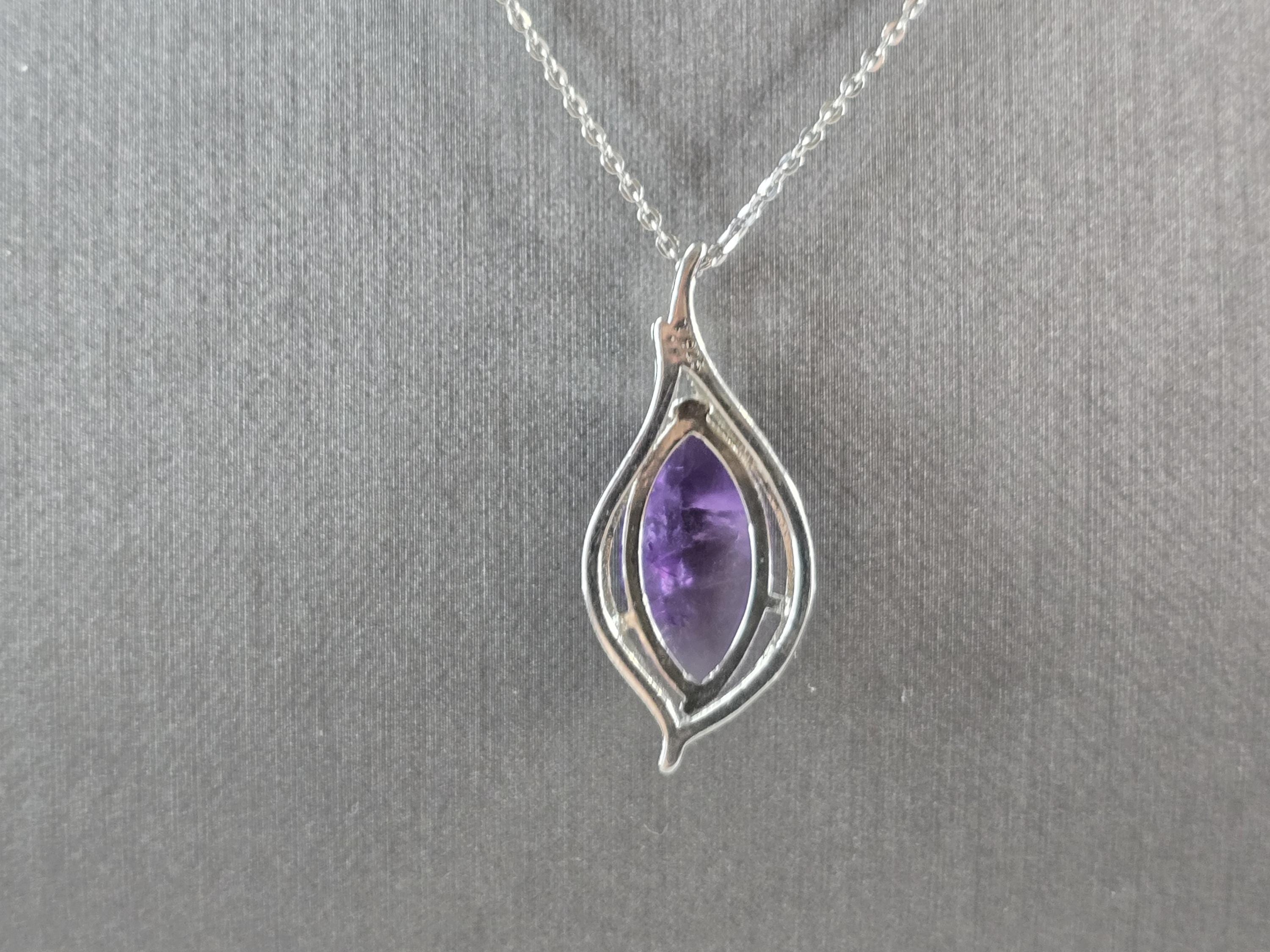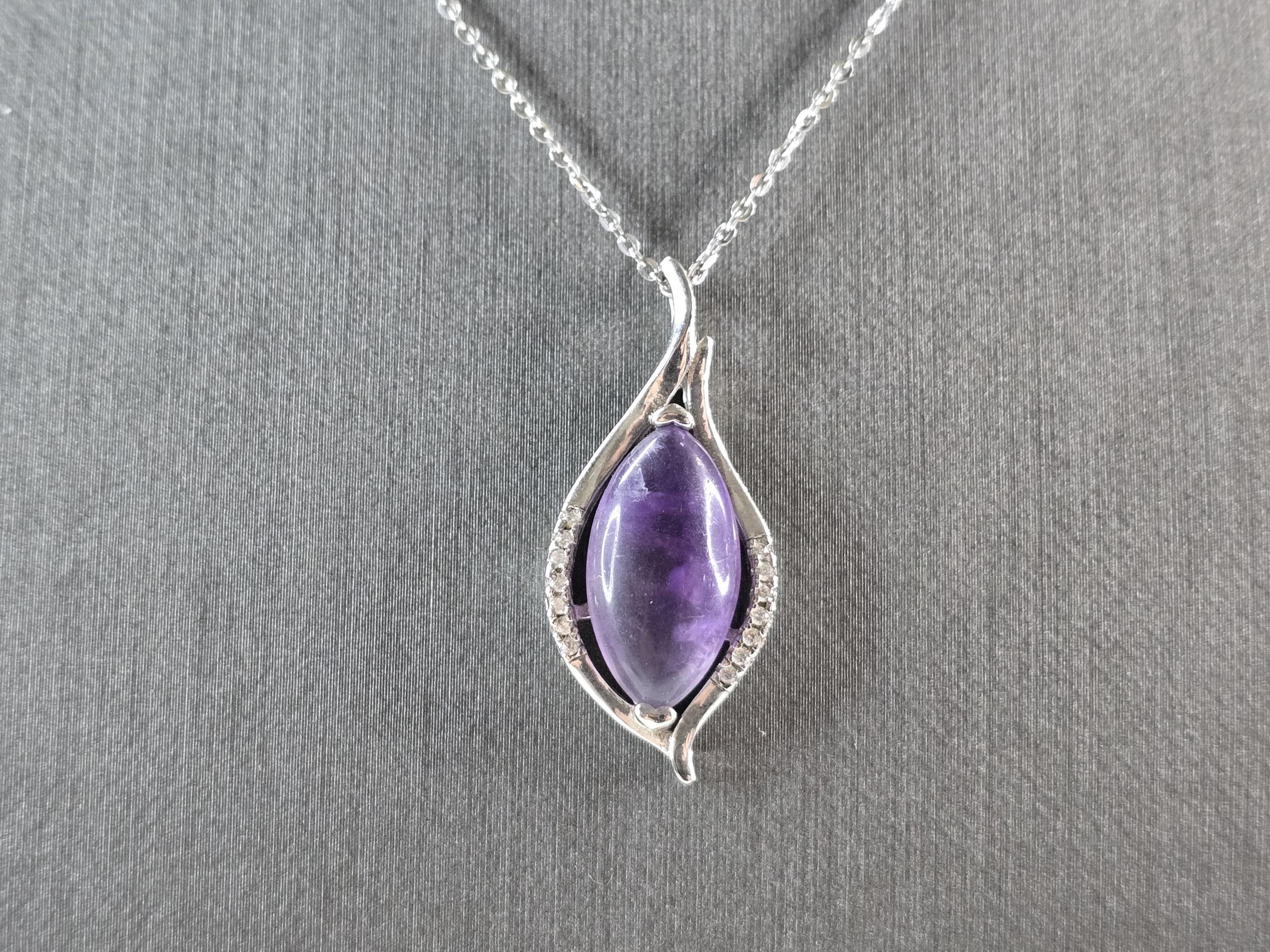A WOMENS ESTATE STERLING SILVER AMETHYST PENDANT WITH NECKLACE . THE PENDANT MEASURES 1 1/8" LONG BY 1/2" WIDE. THE NECKLACE MEASURES 18" LONG AND IS ADJUSTABLE TO 16" LONG. TOGETHER THEY WEIGH 5.2g. NOT SURE IF STONE IS NATURAL OR MAN MADE. WOULD MAKE A GREAT GIFT FOR THAT SPECIAL SOMEONE. ANY QUESTIONS PLEASE DO NOT HESITATE TO ASK. BE SURE TO CHECK OUT SOME OF MY OTHER GREAT ITEMS UP FOR SALE. THANK YOU.