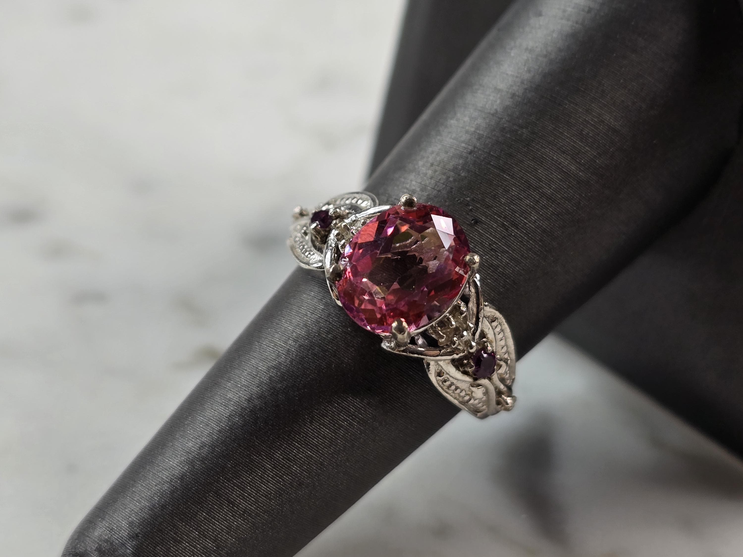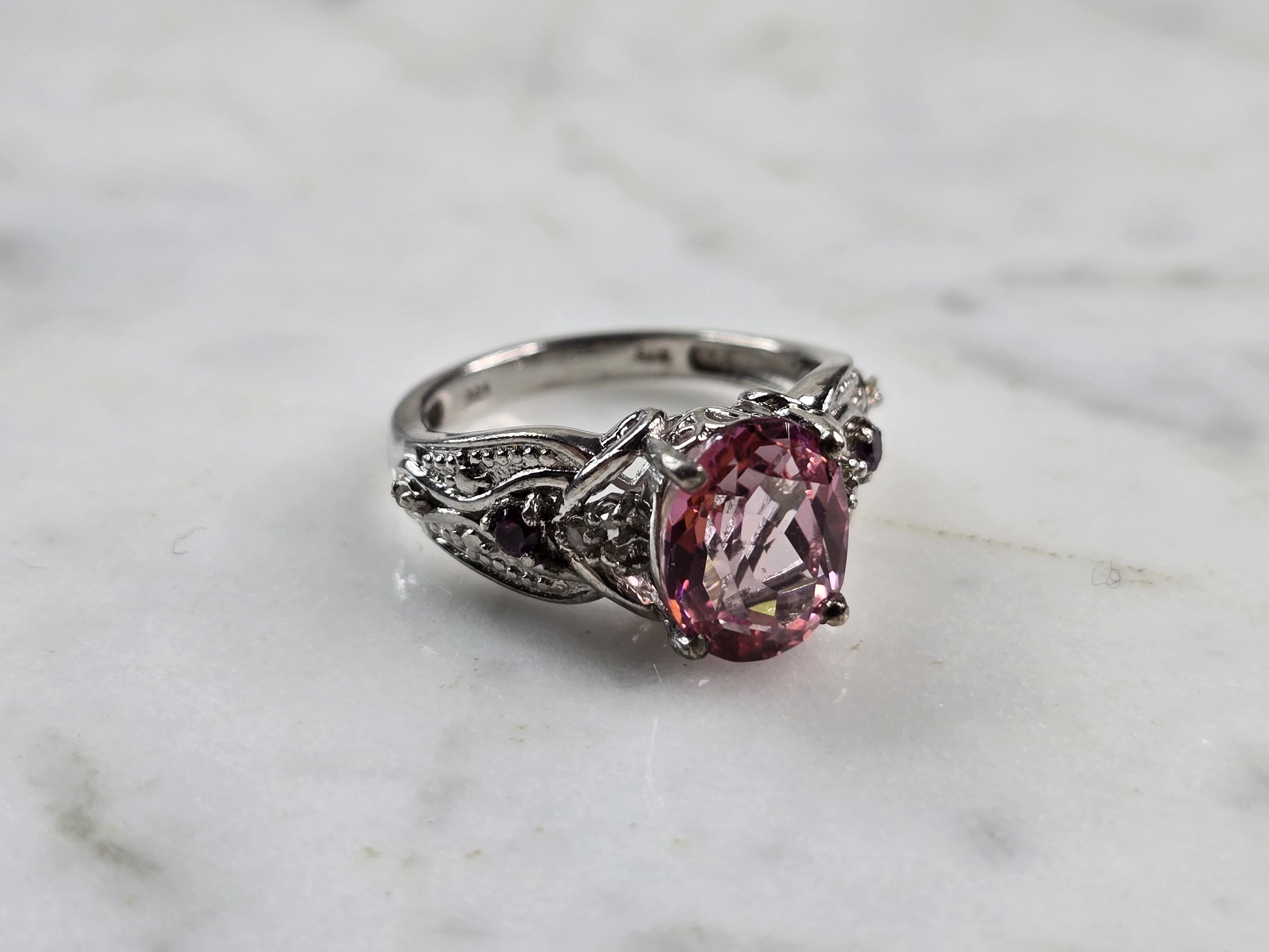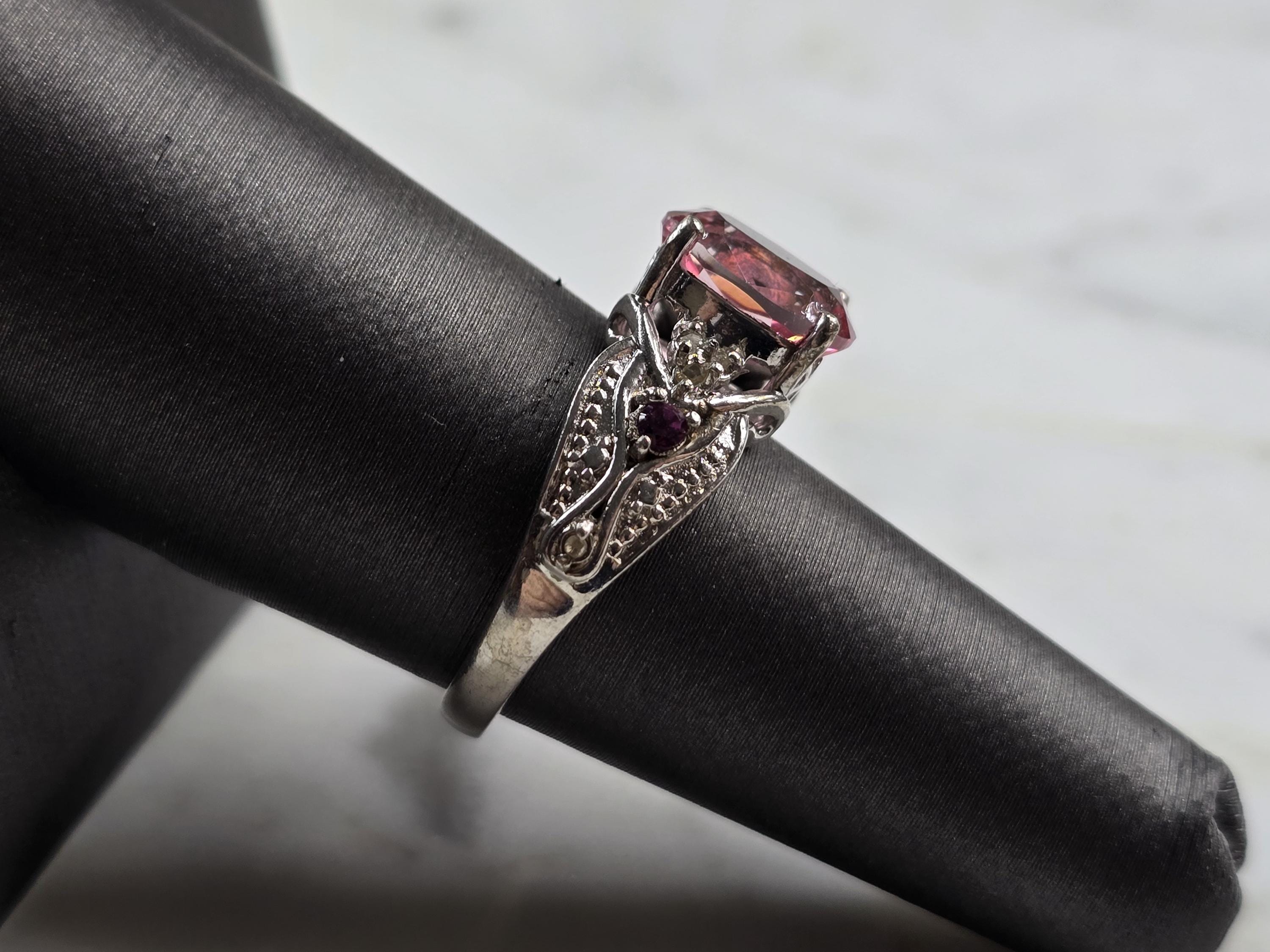 A WOMENS VINTAGE ESTATE STERLING SILVER PINK TOPAZ RING . RING WEIGHS 4.2g, AND IS A SIZE 7.0. THE WIDTH OF THE RING IS 3/8". NOT SURE IF THE STONE IS NATURAL OR MAN MADE. THIS WOULD MAKE A NICE GIFT FOR THAT SOMEONE SPECIAL. ANY QUESTIONS PLEASE DO NOT HESITATE TO ASK. BE SURE TO CHECK OUT SOME OF MY OTHER GREAT ITEMS UP FOR SALE. THANK YOU