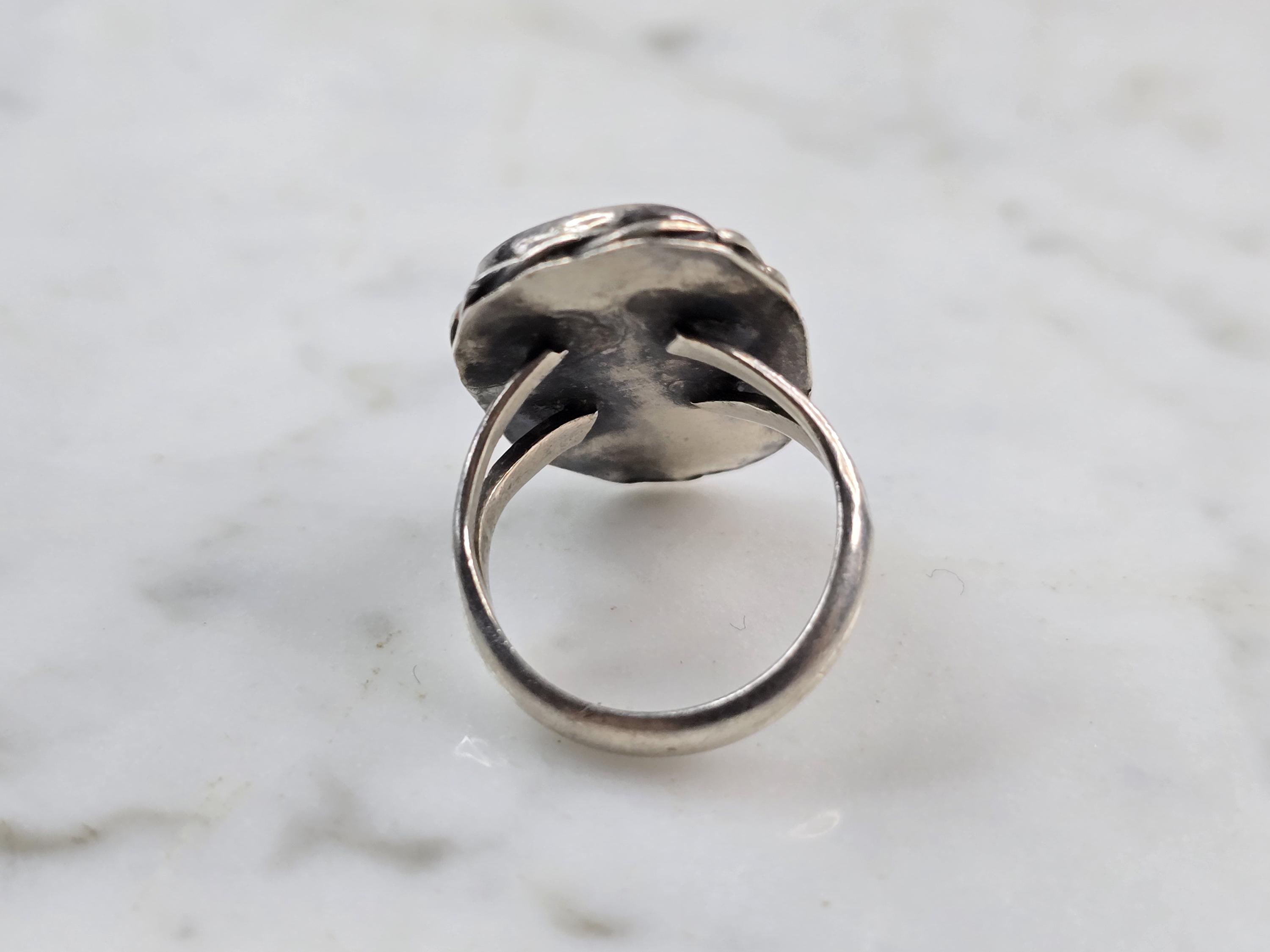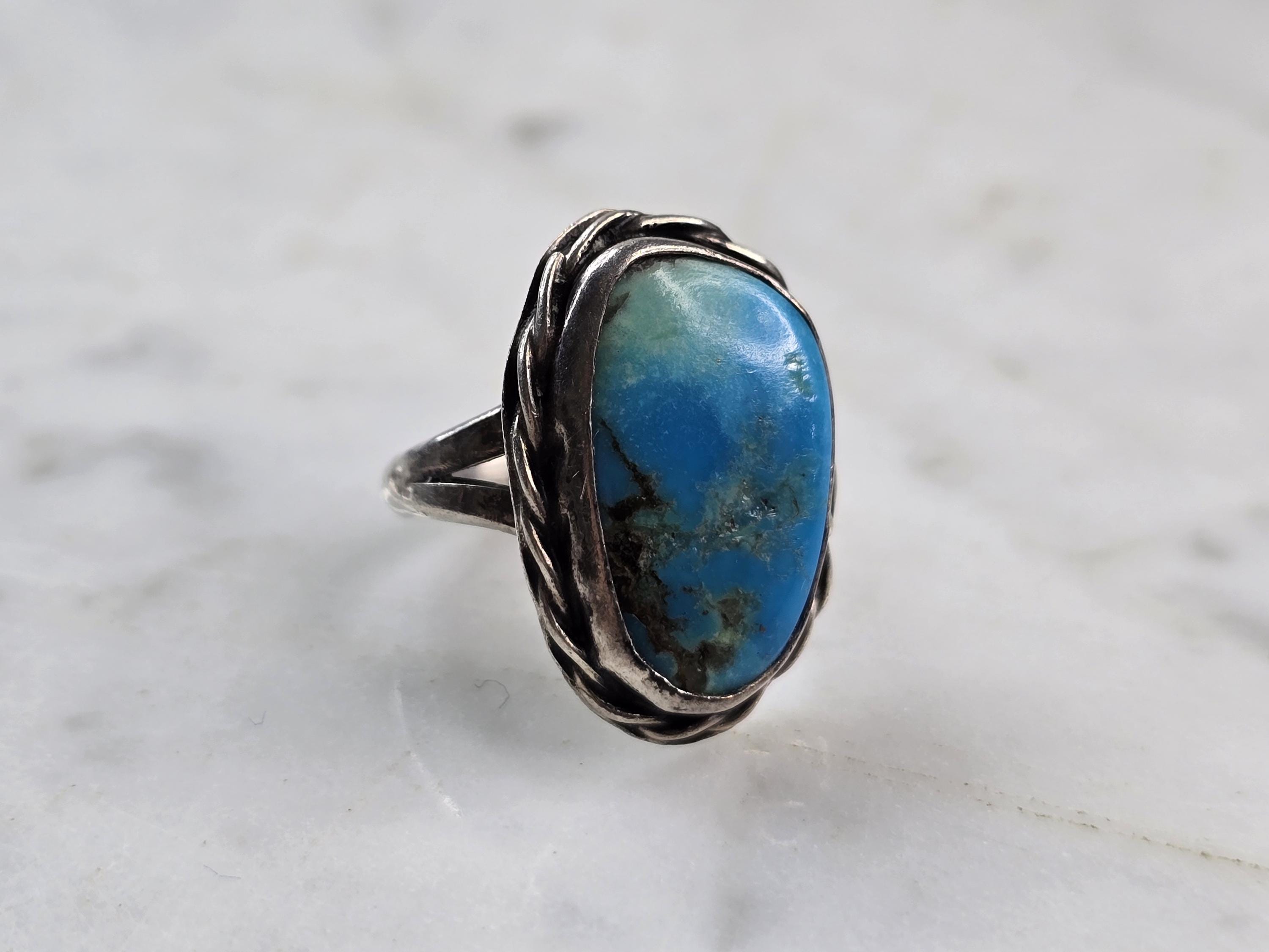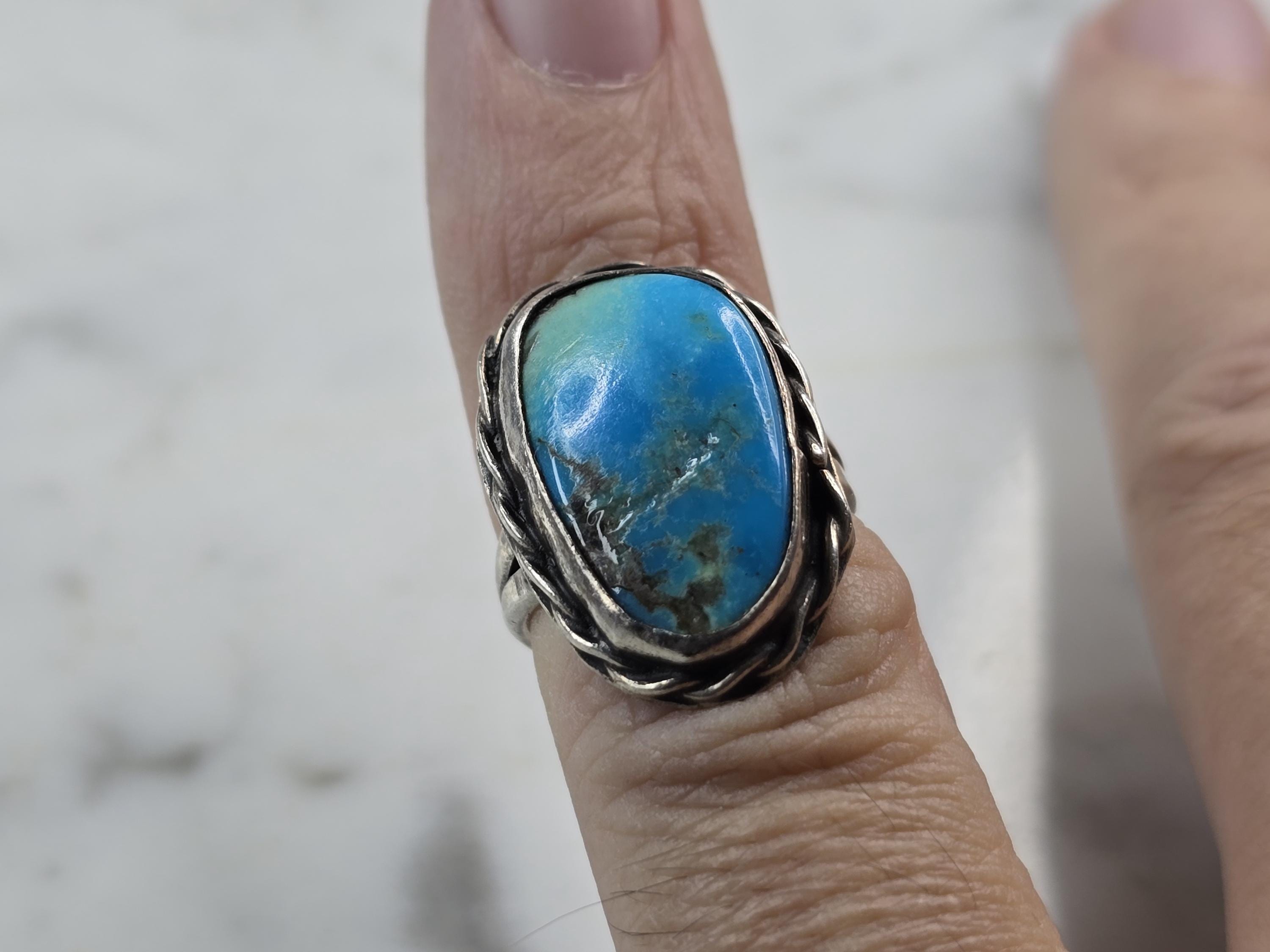 A WOMENS VINTAGE STERLING SILVER TURQUOISE RING. THE TOTAL WEIGHT IS 4.1g, AND IS A SIZE 4.0. RING IS NOT MARKED BUT IT HAS BEEN TESTED AND IS GUARANTEED TO BE AS DESCRIBED. THE LENGTH OF THE RING IS 7/8". THIS RING WOULD MAKE A GREAT GIFT FOR SOMEONE SPECIAL. ANY QUESTIONS PLEASE DONT HESITATE TO ASK. BE SURE TO CHECK OUT SOME OF OUR OTHER GREAT ITEMS UP FOR SALE. THANK YOU.