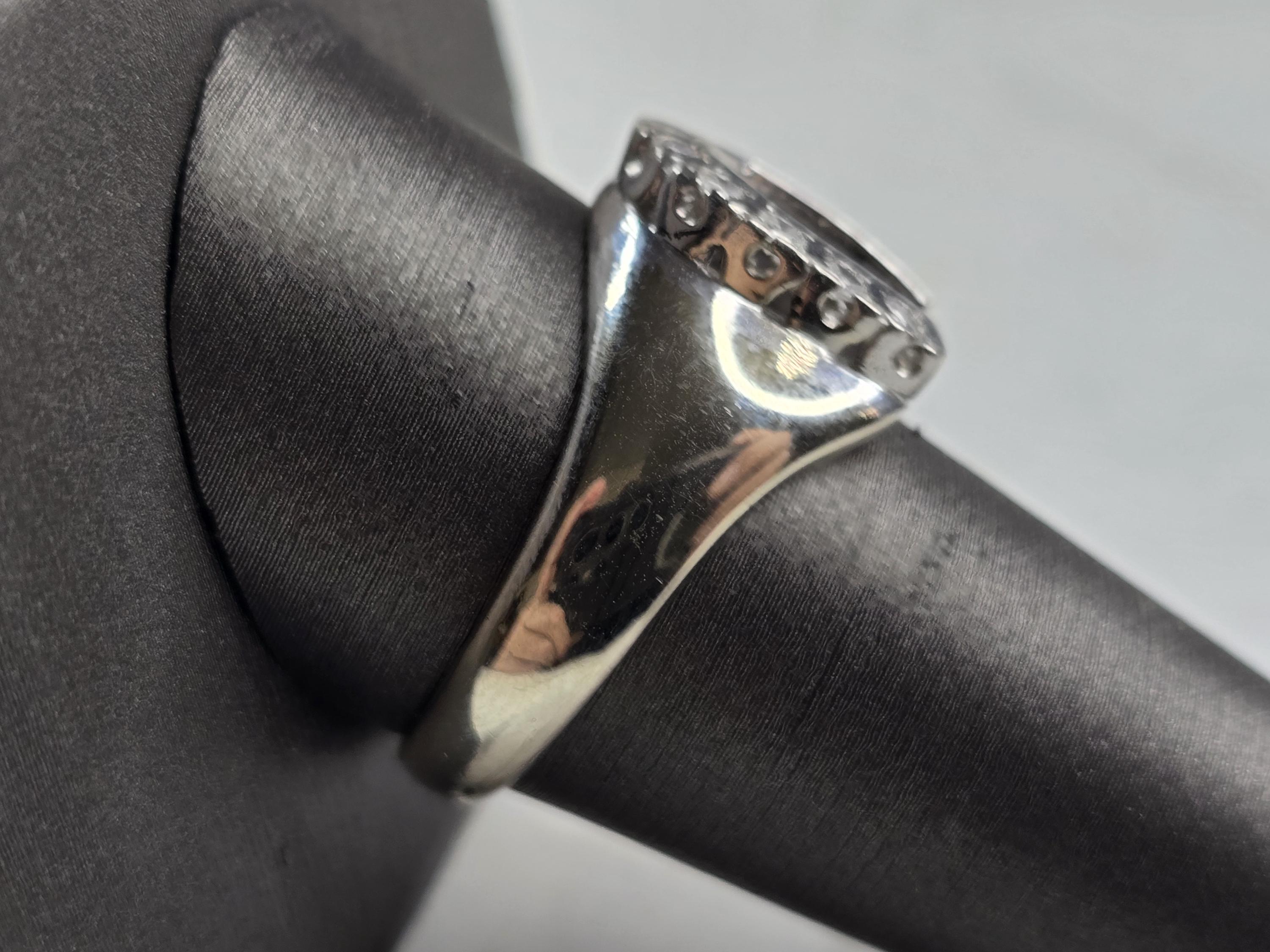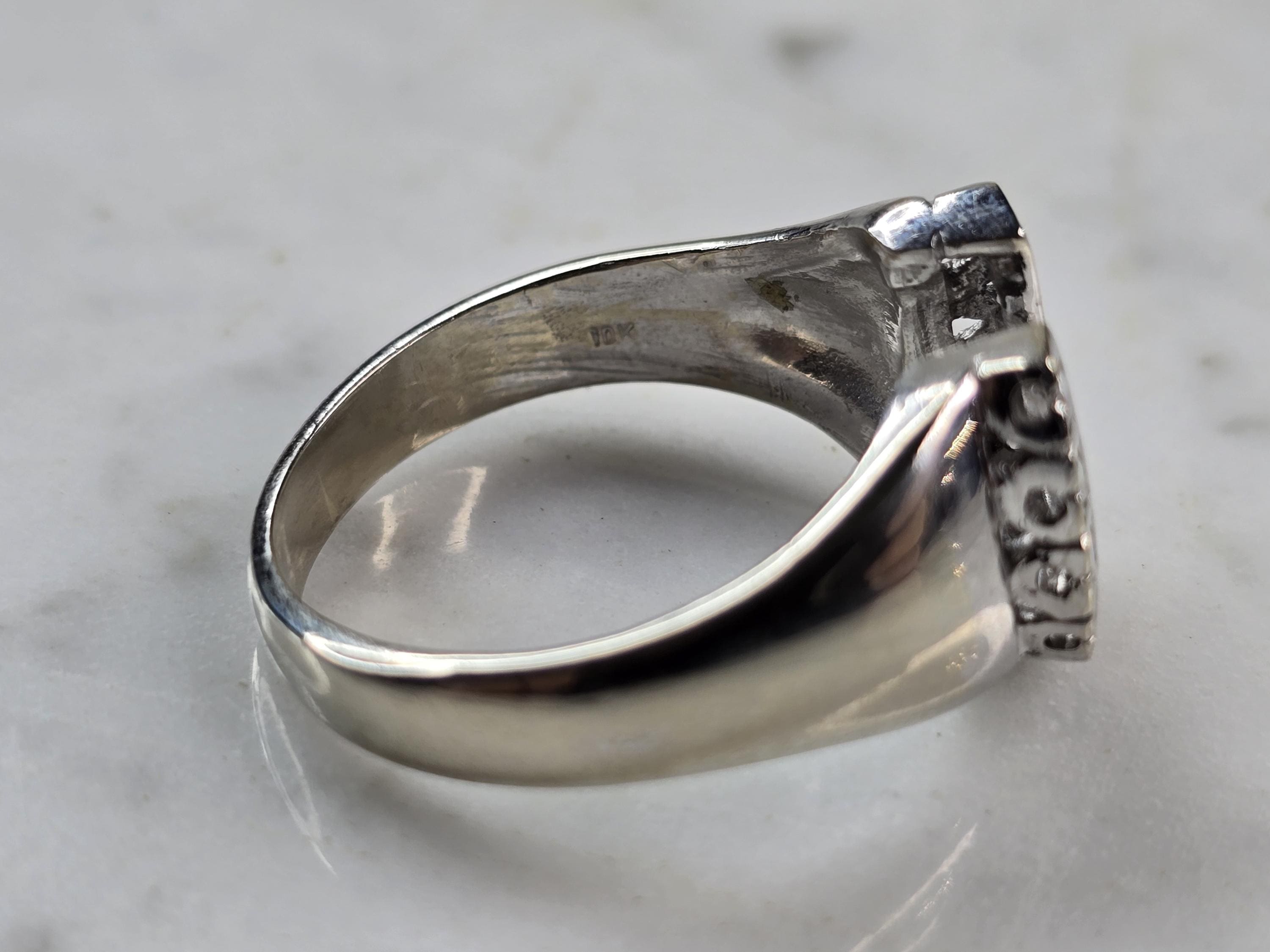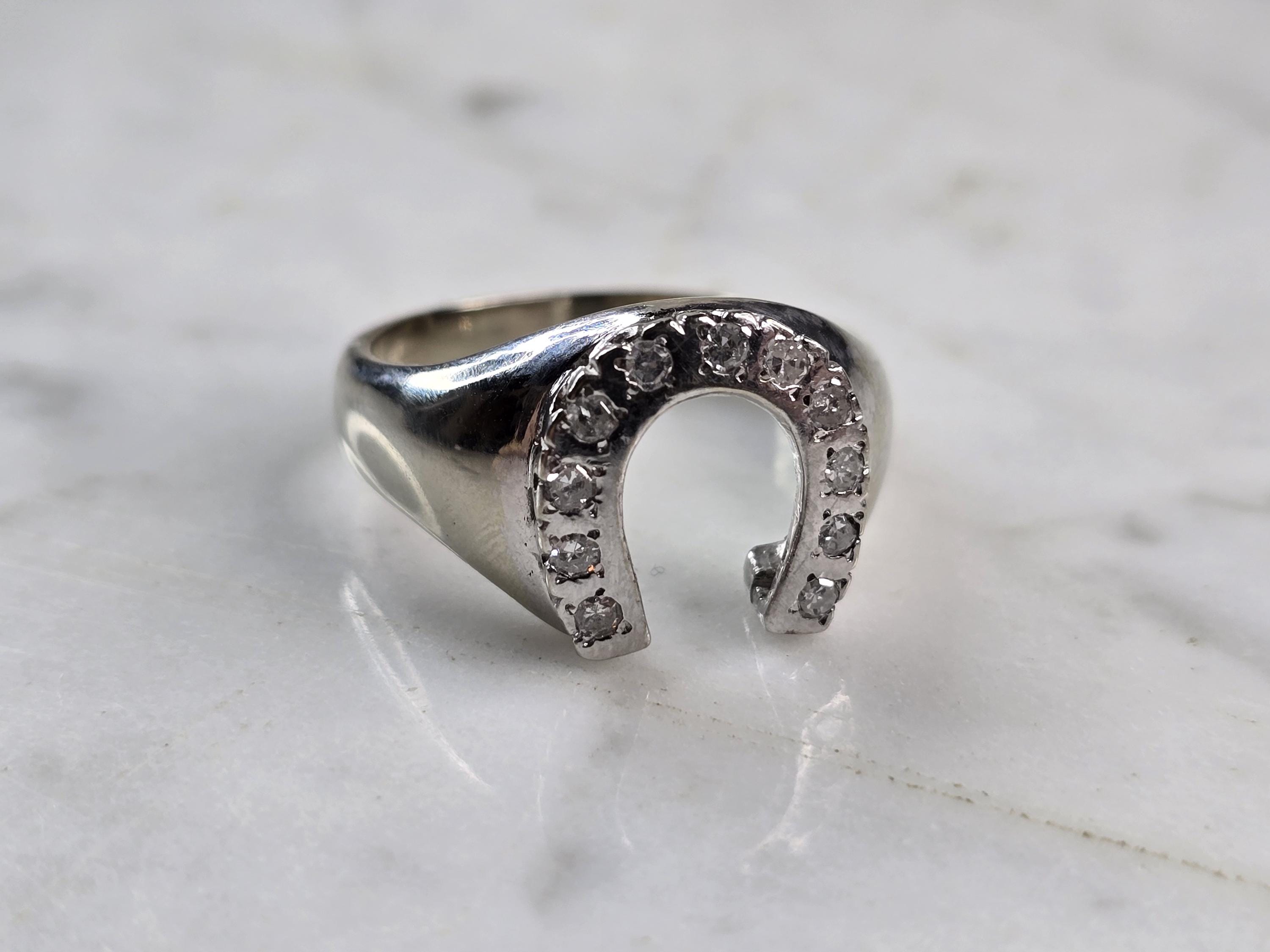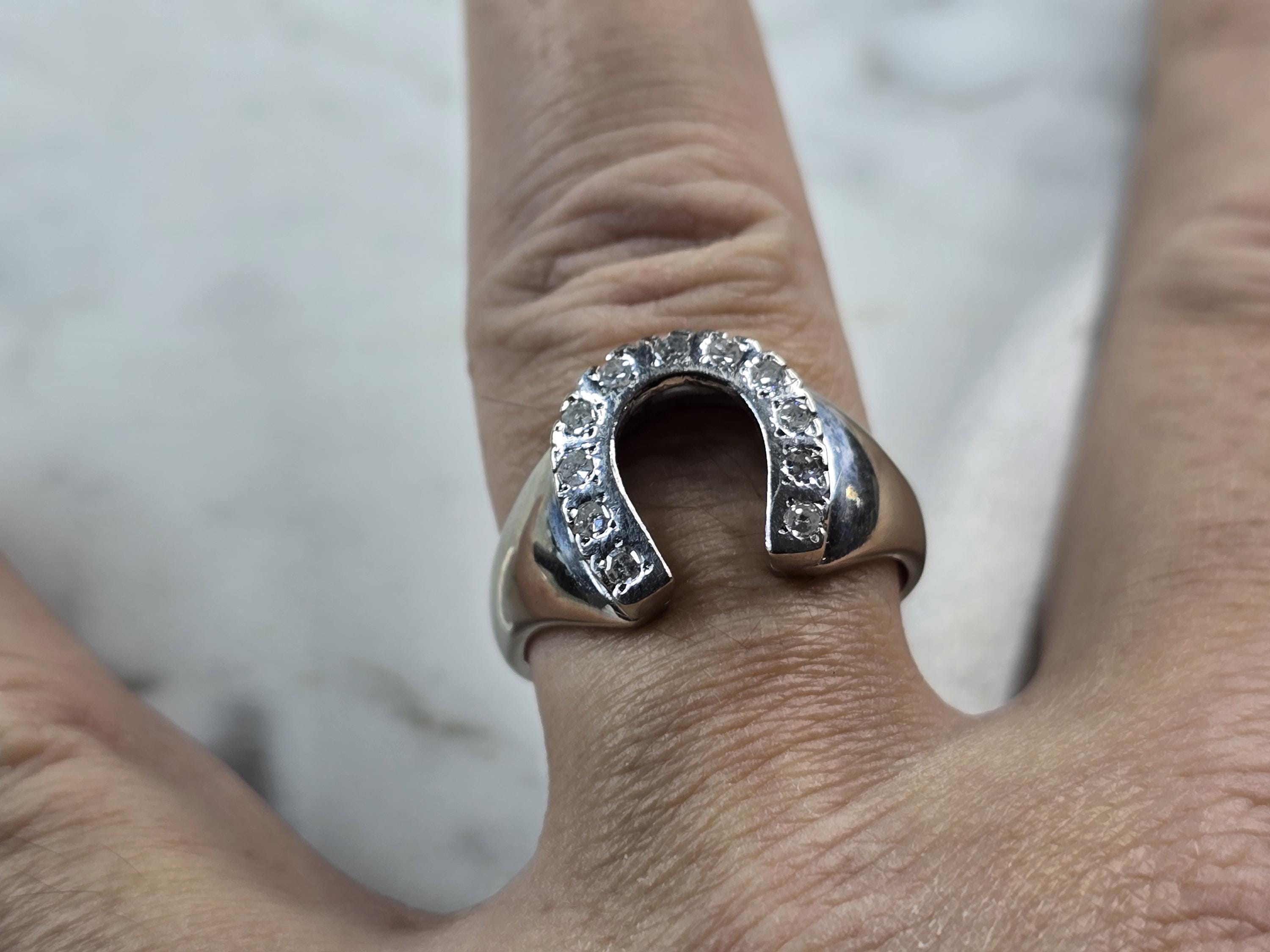 A MENS VINTAGE ESTATE 10K WHITE GOLD DIAMOND HORSESHOE RING. RING WEIGHS 7.8g AND IS A SIZE 11.0. THERE ARE 11 SMALL DIAMONDS IN THIS RING. THE LENGTH OF THE RING IS 1/2". RING IS MARKED "10k". ANY QUESTIONS PLEASE DONT HESITATE TO ASK. BE SURE TO CHECK OUT SOME OF OUR OTHER GREAT ITEMS UP FOR SALE. THANK YOU.