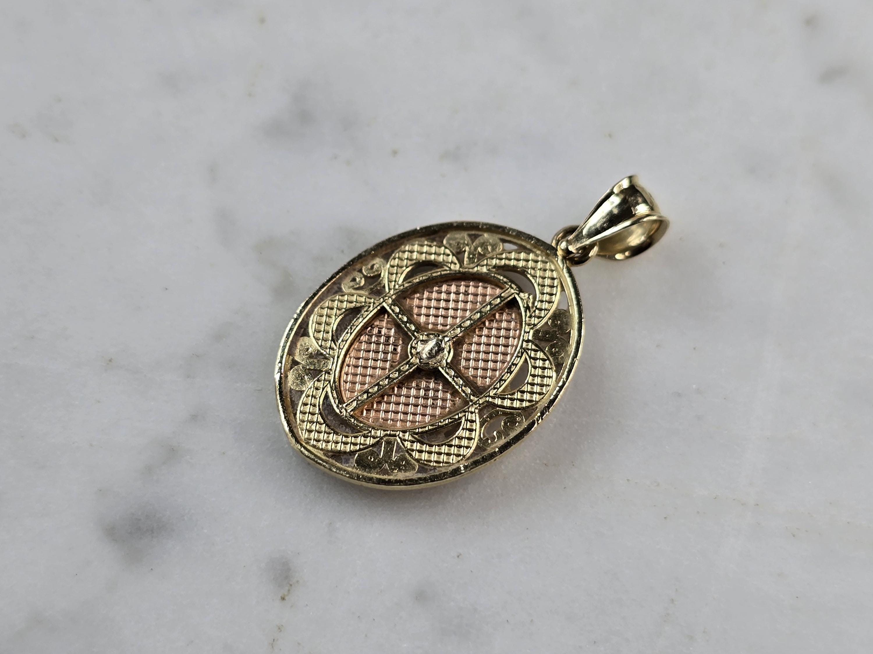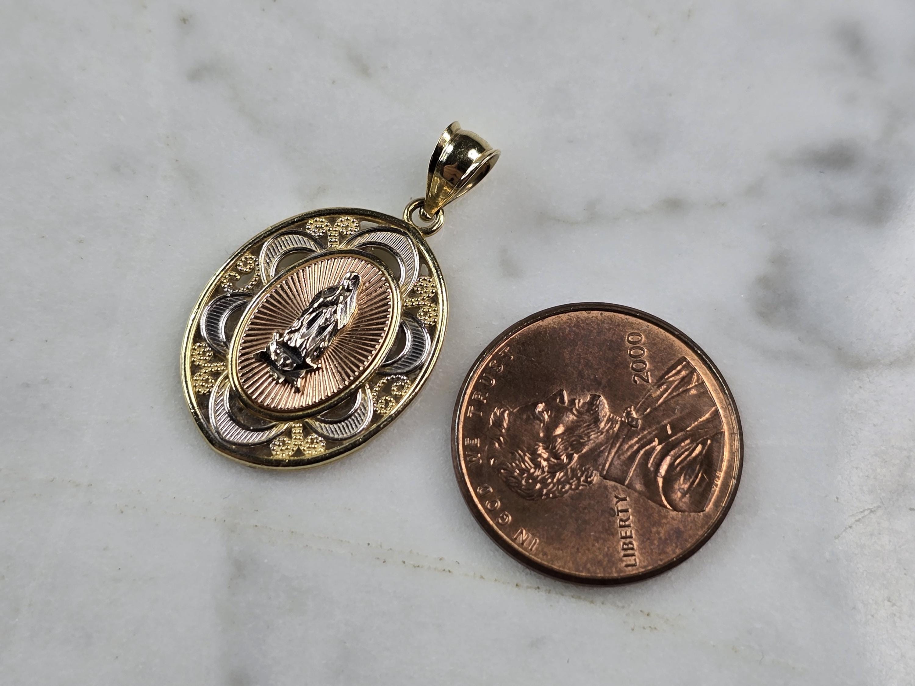 A WOMENS VINTAGE ESTATE 14K MIXED GOLD RELIGIOUS VIRGIN MARY PENDANT THAT WEIGHS 2.0g. THE PENDANT MEASURES 1" LONG BY 5/8" WIDE. MAKES A GREAT GIFT FOR THAT SPECIAL SOMEONE.