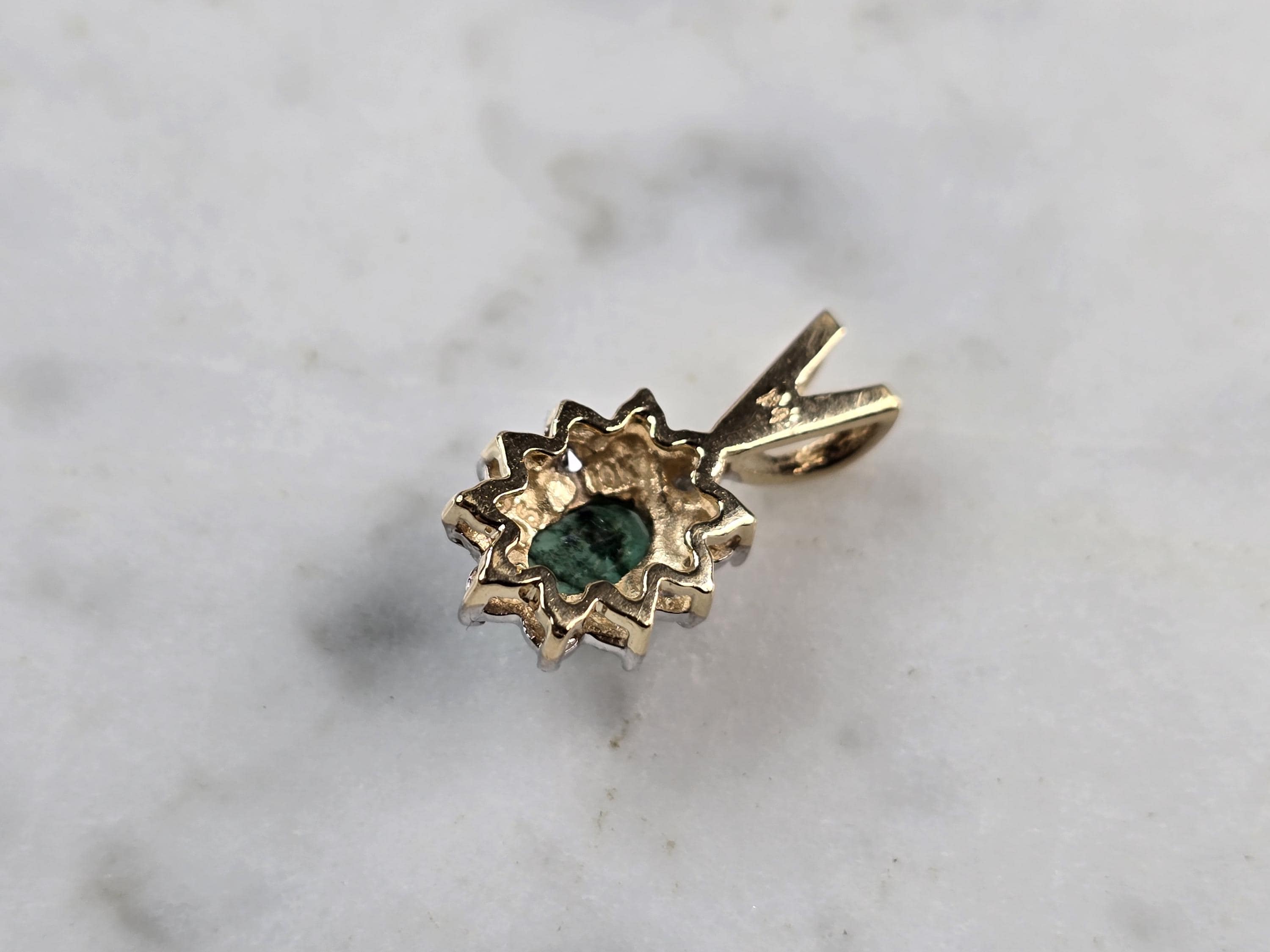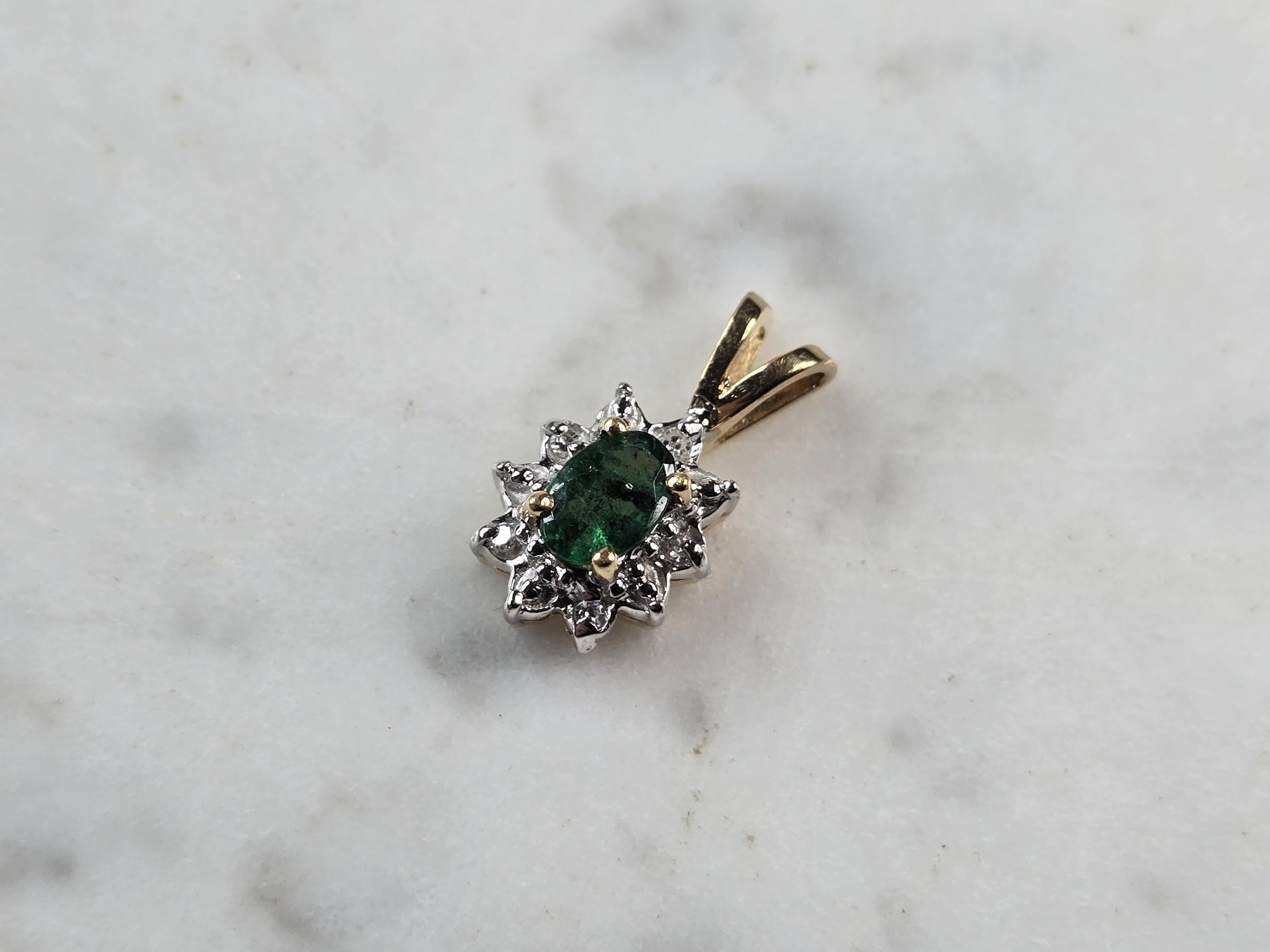 FOR SALE IS THIS ATTRACTIVE WOMENS VINTAGE ESTATE 10K YELLOW GOLD DIAMOND EMERALD PENDANT. THE PENDANT WEIGHS 1.3g, AND MEASURES 5/8" LONG BY 3/8" WIDE. THE EMERALD IS ABOUT 0.20cts, SURROUNDED BY 5 SMALL DIAMONDS. THIS MAKES A WONDERFUL GIFT FOR THAT SOMEONE SPECIAL. ANY QUESTIONS, PLEASE ASK. BE SURE TO CHECK OUT SOME OF MY OTHER GREAT ITEMS UP FOR SALE. THANK YOU.
