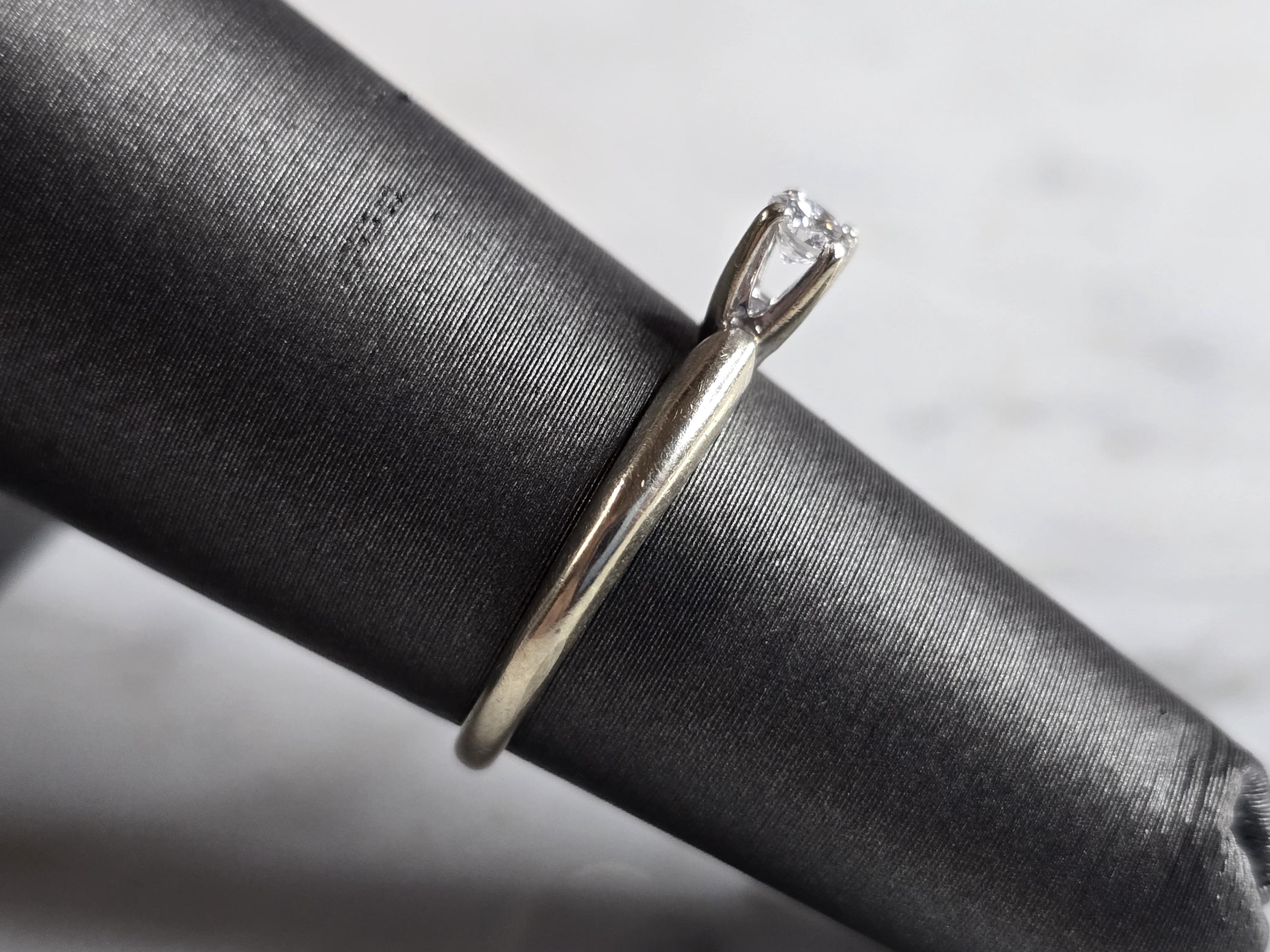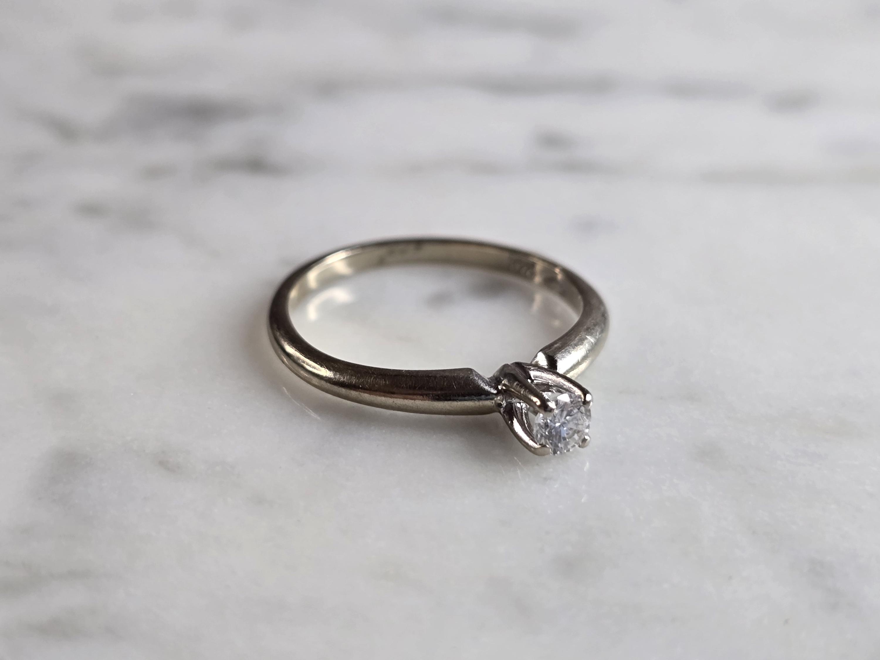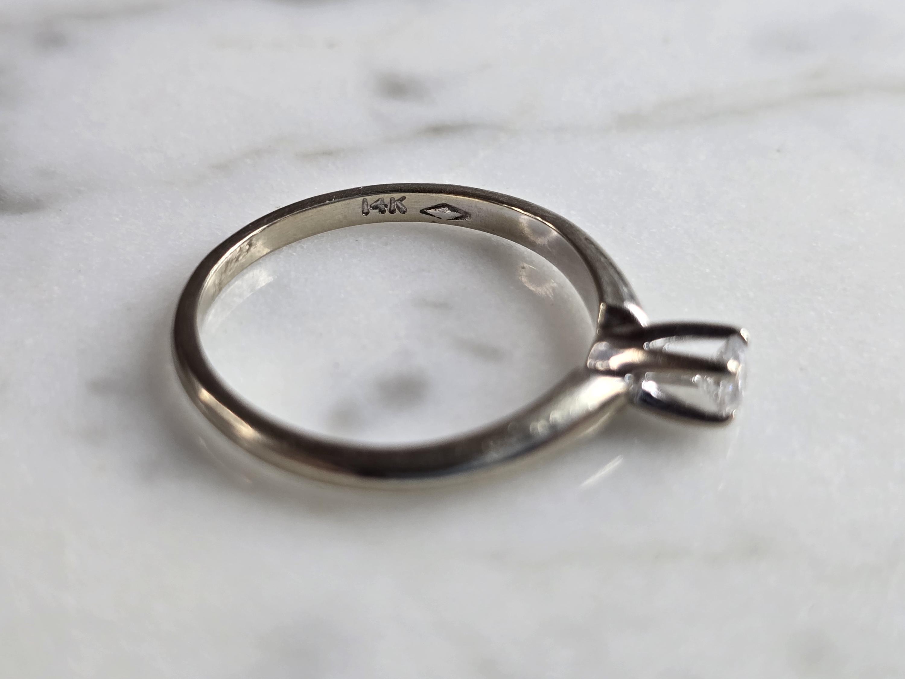 A WOMEN'S VINTAGE ESTATE 14K WHITE GOLD DIAMOND ENGAGEMENT RING, MADE BY STYLECREST. THE RING WEIGHS 1.8g, AND IS A SIZE 5.25. THE WIDTH OF THE RING IS 1/8". THE DIAMOND IS ABOUT 0.10cts. ANY QUESTIONS PLEASE DO NOT HESITATE TO ASK. BE SURE TO CHECK OUT SOME OF MY OTHER GREAT ITEMS UP FOR SALE. THANK YOU.