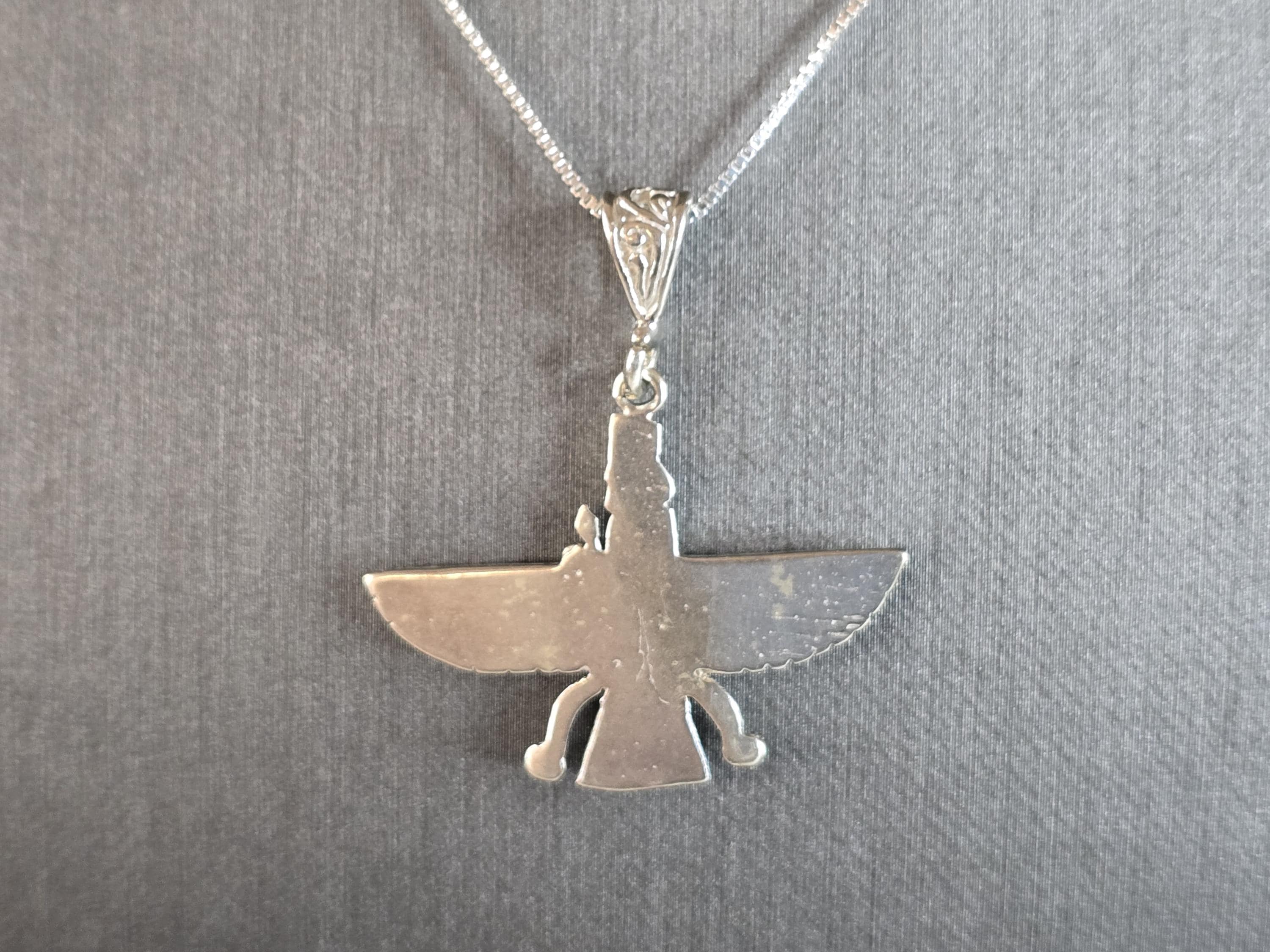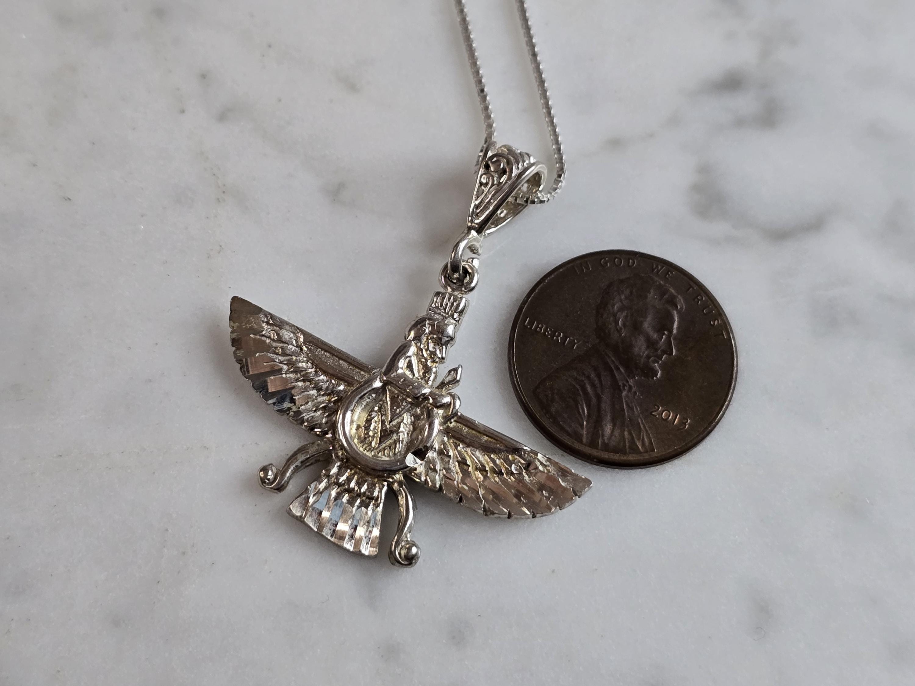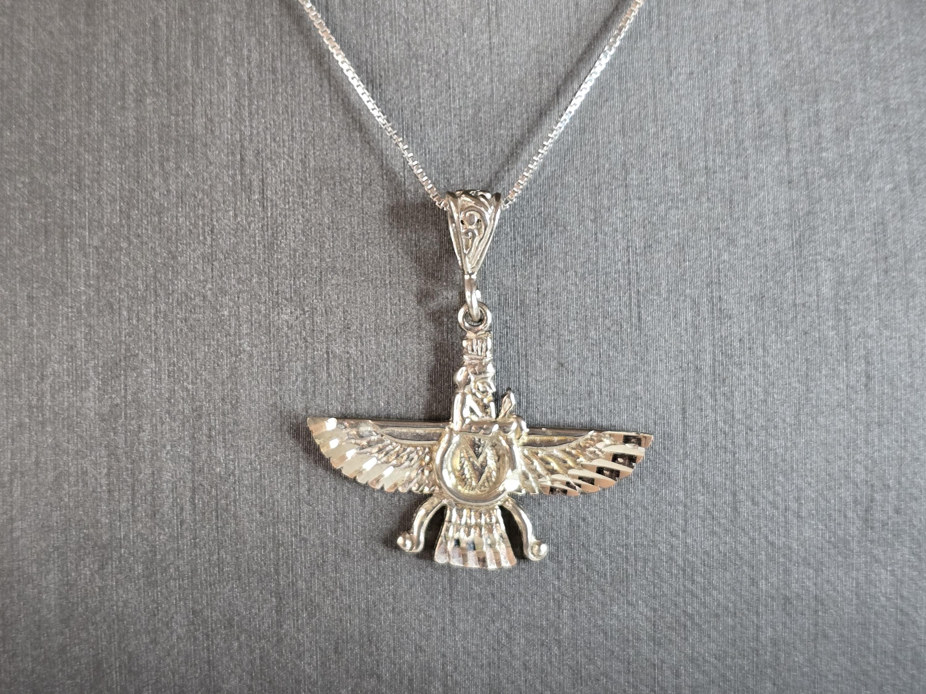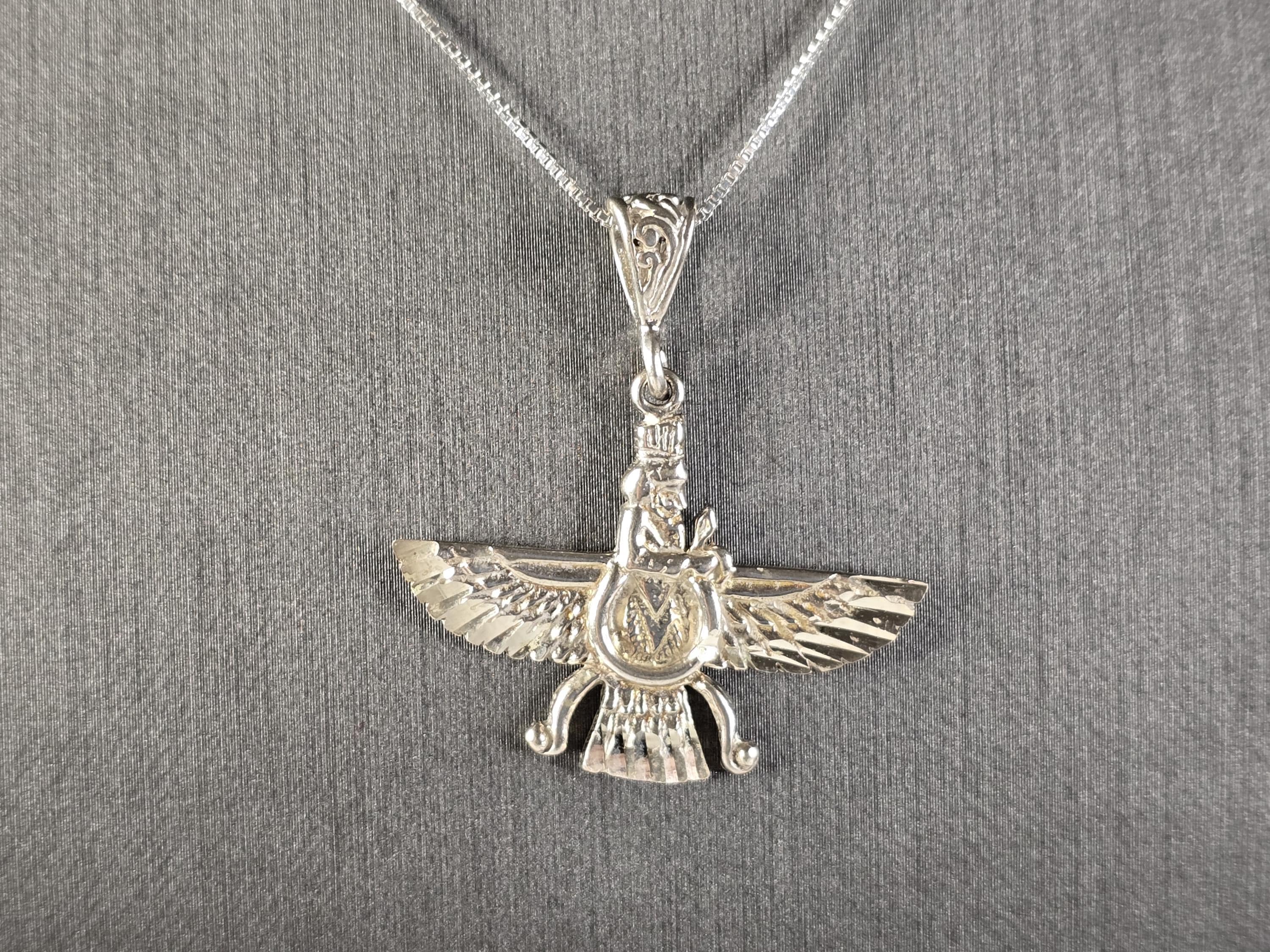 A WOMENS VINTAGE ESTATE STERLING SILVER PERSIAN FARVAHAR PENDANT NECKLACE. THE NECKLACE WITH PENDANT WEIGHS 6.5g. NECKLACE MEASURES 18" LONG. THE PENDANT MEASURES 1 3/8" BY 1 1/4". MAKES A GREAT GIFT FOR THAT SPECIAL SOMEONE. ANY QUESTIONS, PLEASE DO NOT HESITATE TO ASK.