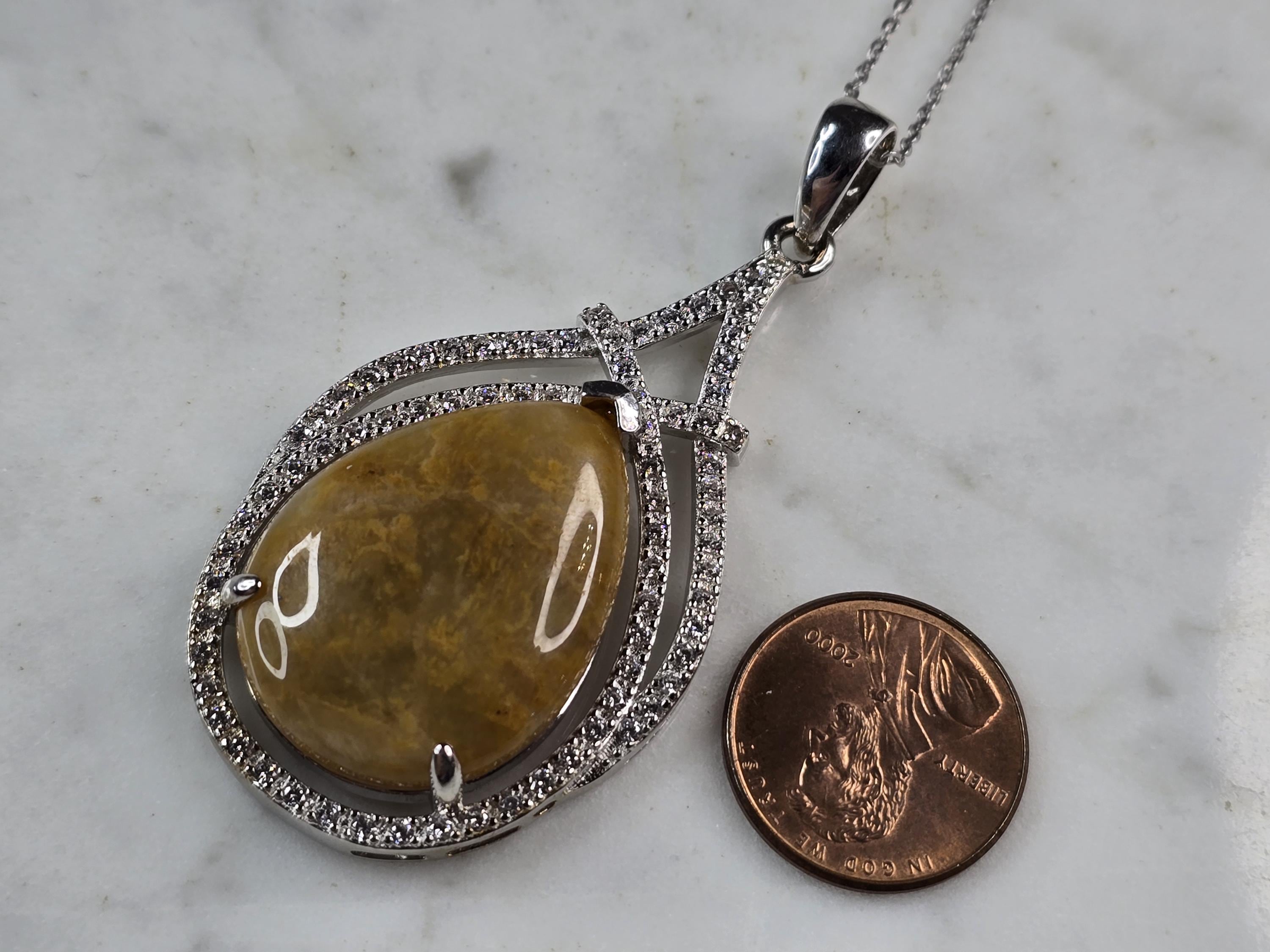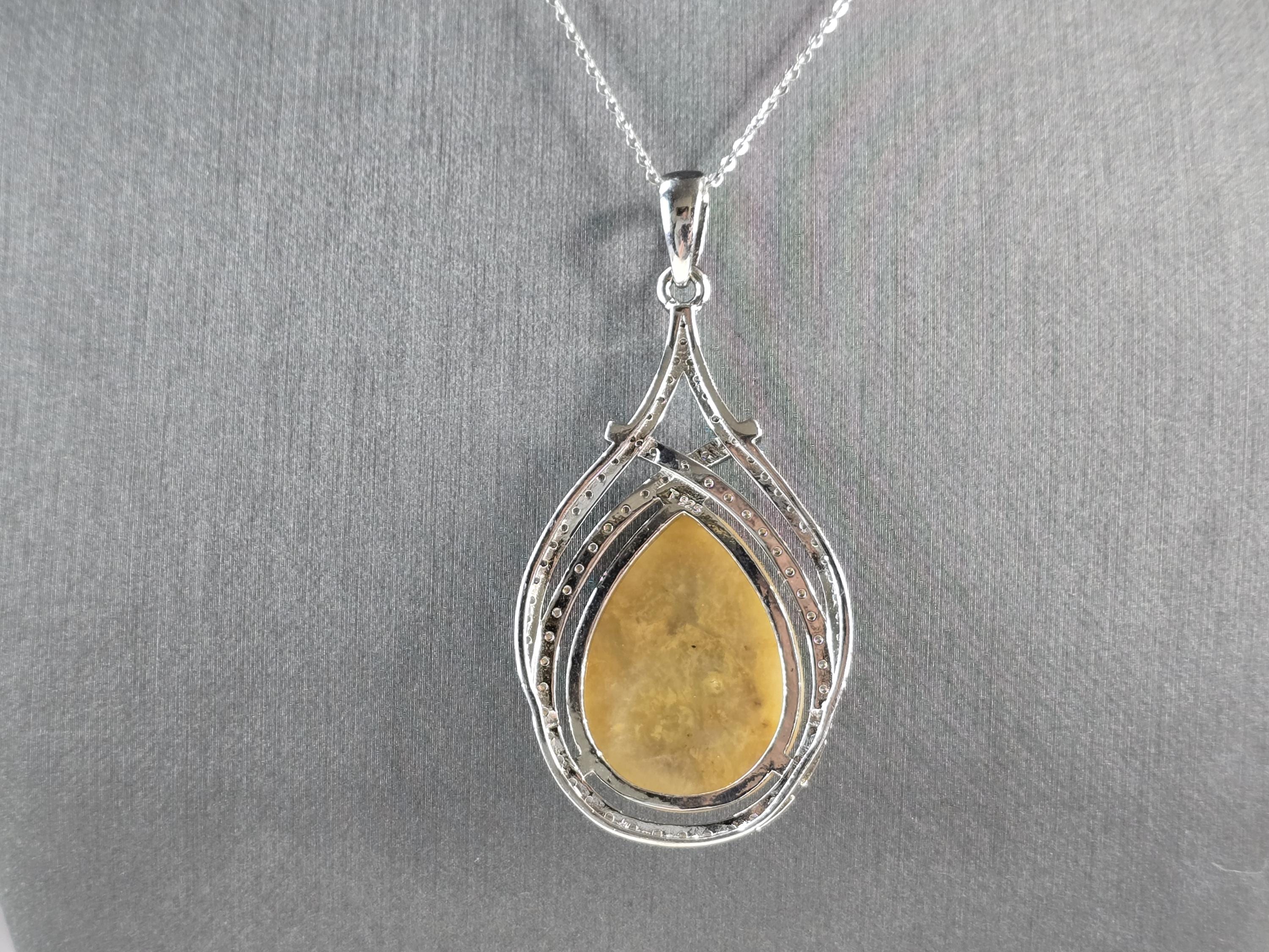 A WOMEN STERLING SILVER NECKLACE WITH WHAT APPEARS TO BE A CALCITE & CZ PENDANT. THE PENDANT MEASURES 1 1/4" BY 2 3/8". THE NECKLACE MEASURES 18" LONG. TOGETHER THEY WEIGH 16.7g. NOT SURE IF THE STONE IS NATURAL OR MAN MADE. THIS WOULD MAKE A LOVELY GIFT FOR THAT SOMEONE SPECIAL. ANY QUESTIONS PLEASE ASK. BE SURE TO CHECK OUT SOME OF MY OTHER GREAT ITEMS UP FOR SALE. THANK YOU