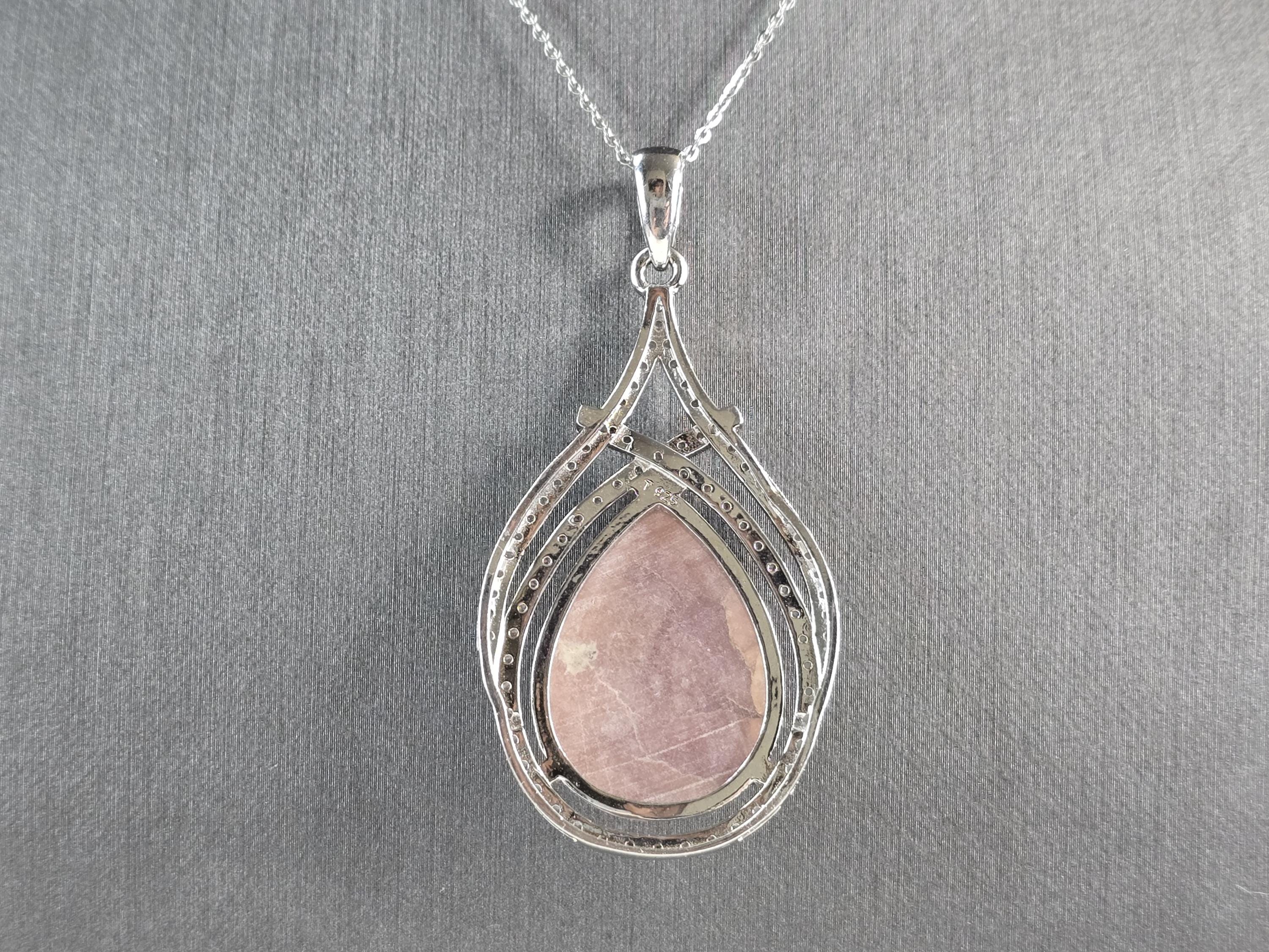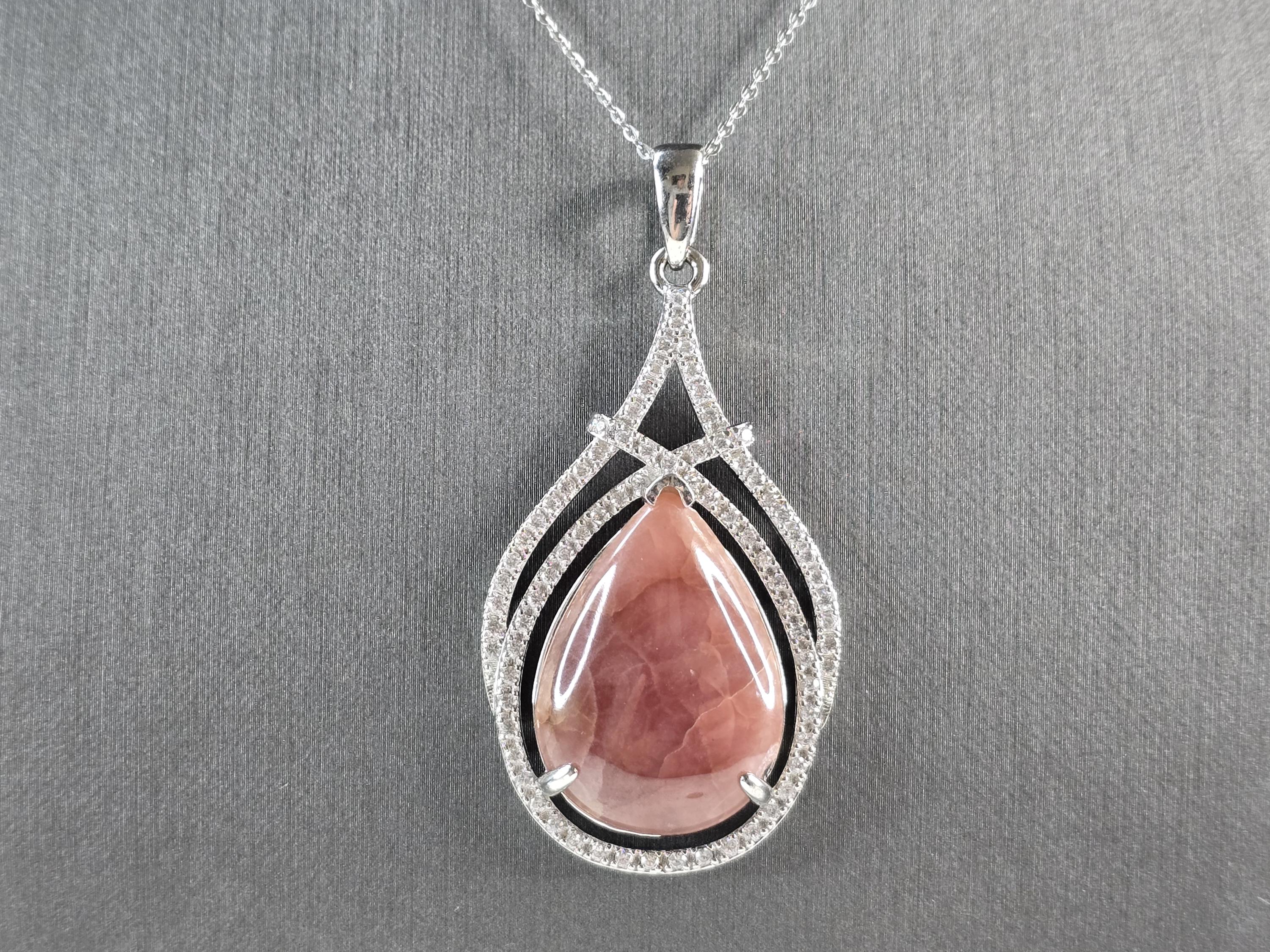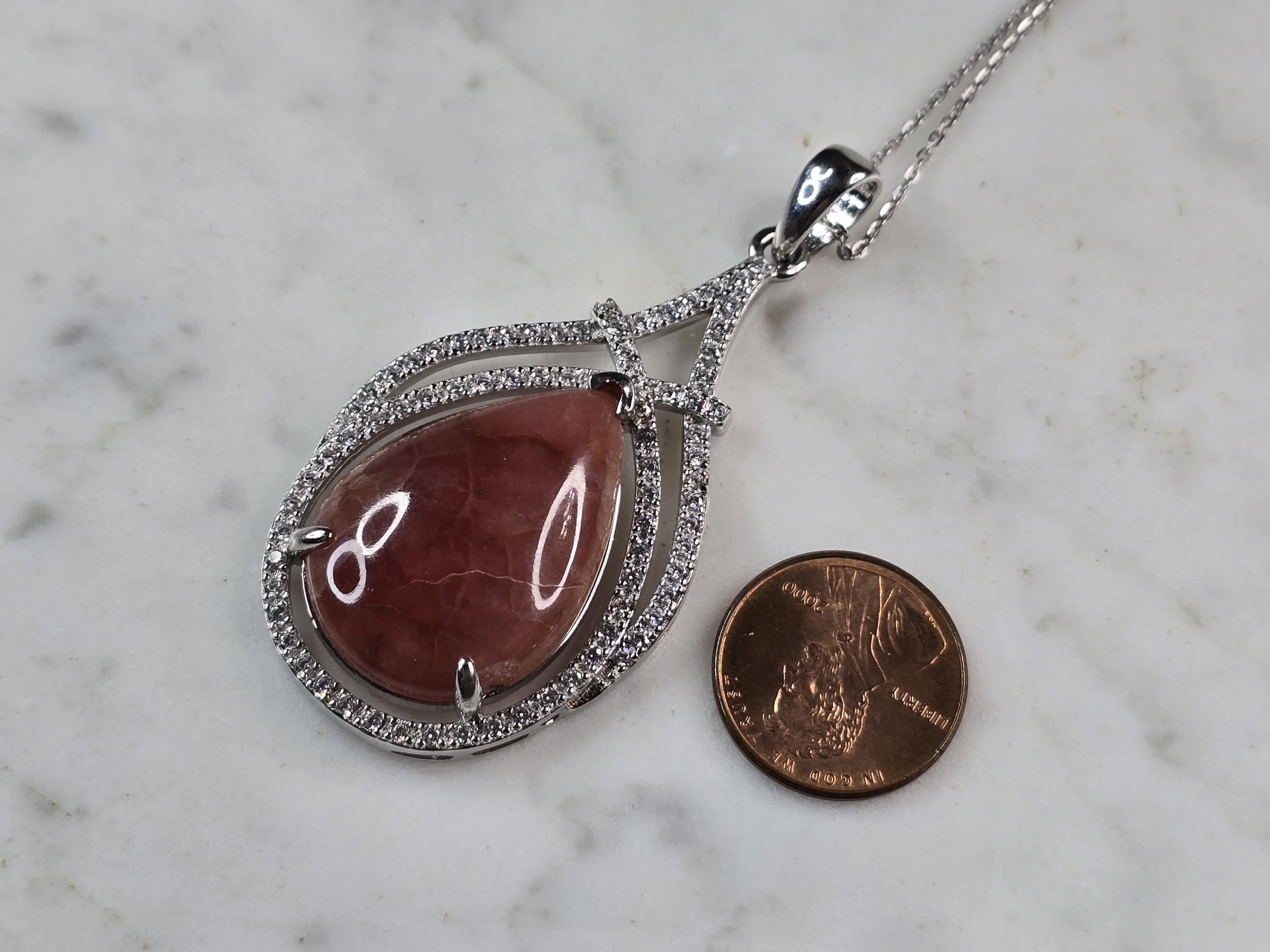A WOMEN STERLING SILVER NECKLACE WITH WHAT APPEARS TO BE A RHODOCHROSITE & CZ PENDANT. THE PENDANT MEASURES 2 3/8" BY 1 1/4". THE NECKLACE MEASURES 18" LONG. TOGETHER THEY WEIGH 17.5g. NOT SURE IF THE STONE IS NATURAL OR MAN MADE. THIS WOULD MAKE A LOVELY GIFT FOR THAT SOMEONE SPECIAL. ANY QUESTIONS PLEASE ASK. BE SURE TO CHECK OUT SOME OF MY OTHER GREAT ITEMS UP FOR SALE. THANK YOU
