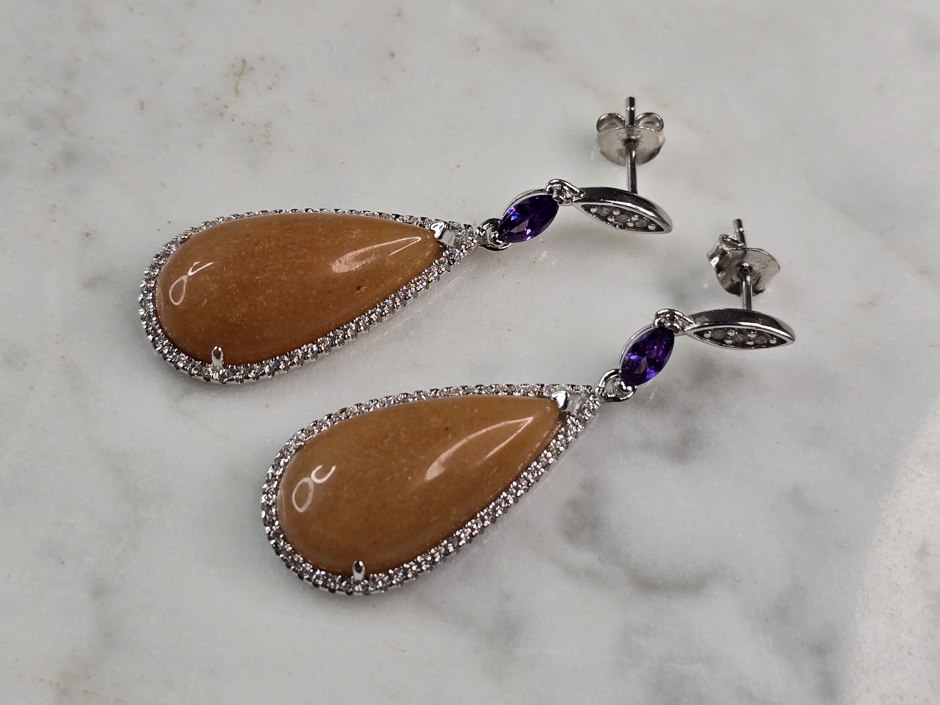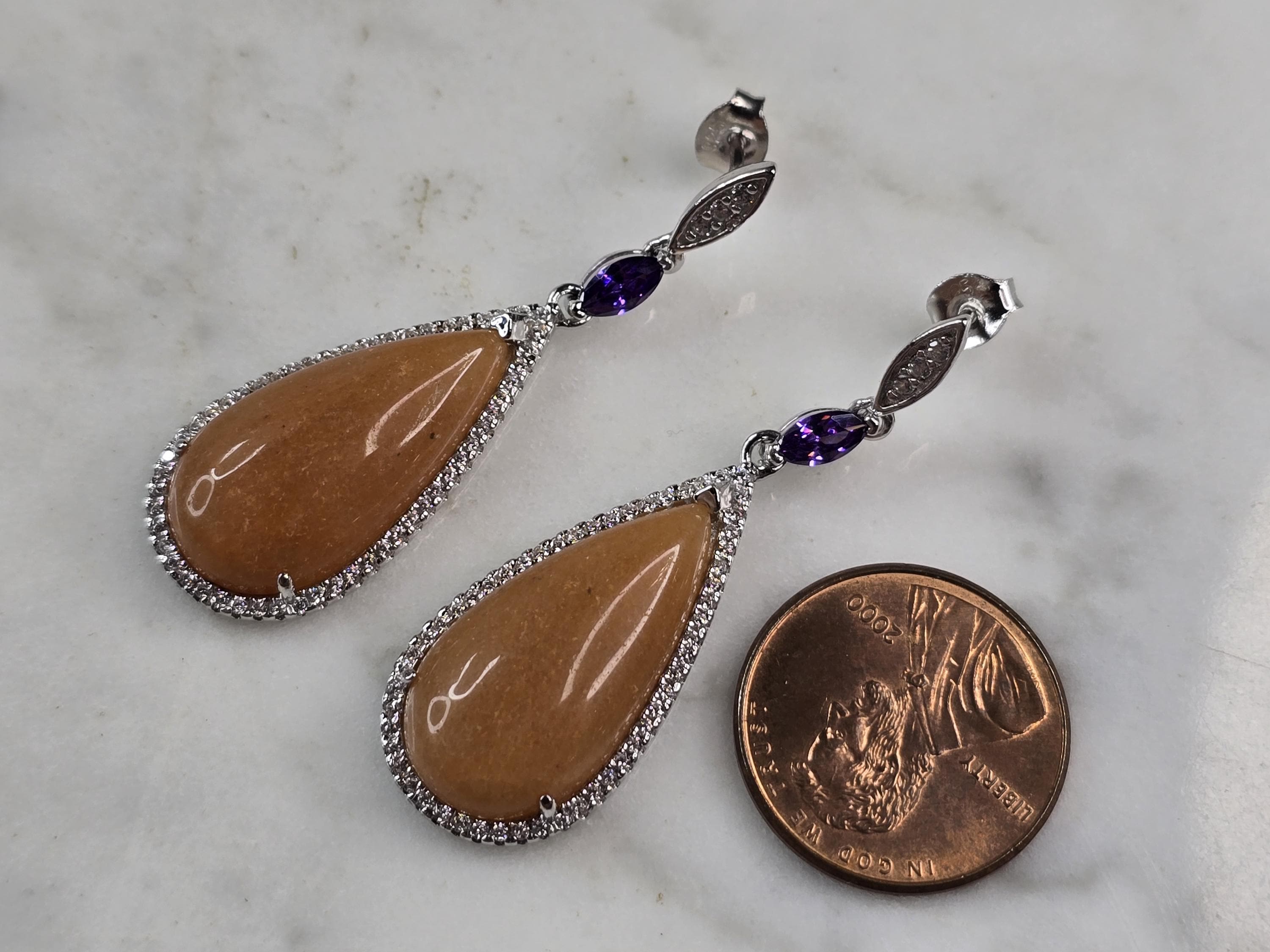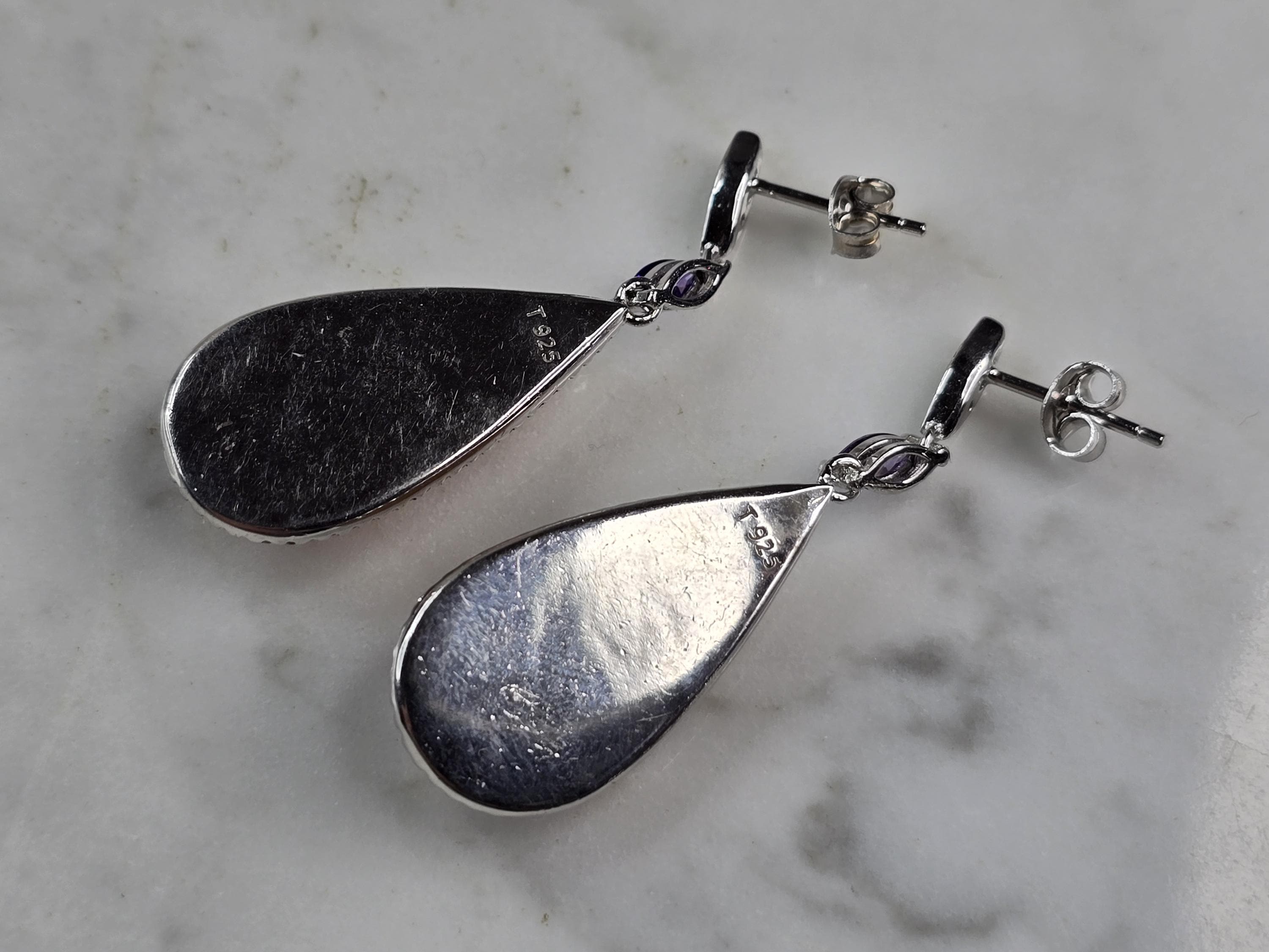 A PAIR OF WOMENS VINTAGE ESTATE STERLING SILVER CALCITE AMETHYST COLORED EARRINGS. NOT SURE IF STONES ARE NATURAL OR MAN MADE. THE EARRINGS WEIGH 11.4g AND MEASURE 1 3/4" LONG BY 5/8" WIDE. ANY QUESTIONS PLEASE DO NOT HESITATE TO ASK. BE SURE TO CHECK OUT SOME OF OUR OTHER GREAT PIECES OF JEWELRY FOR SALE. THANK YOU.
