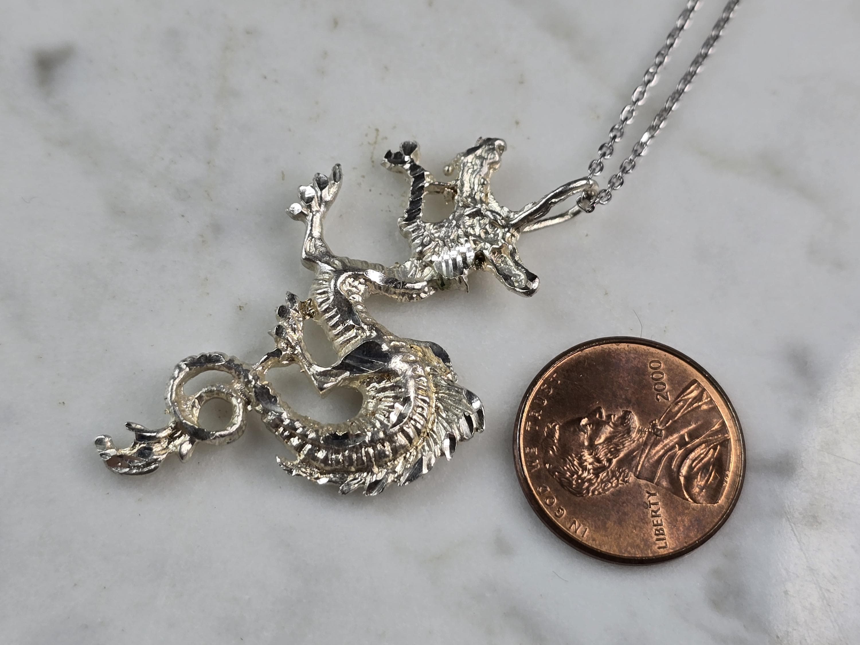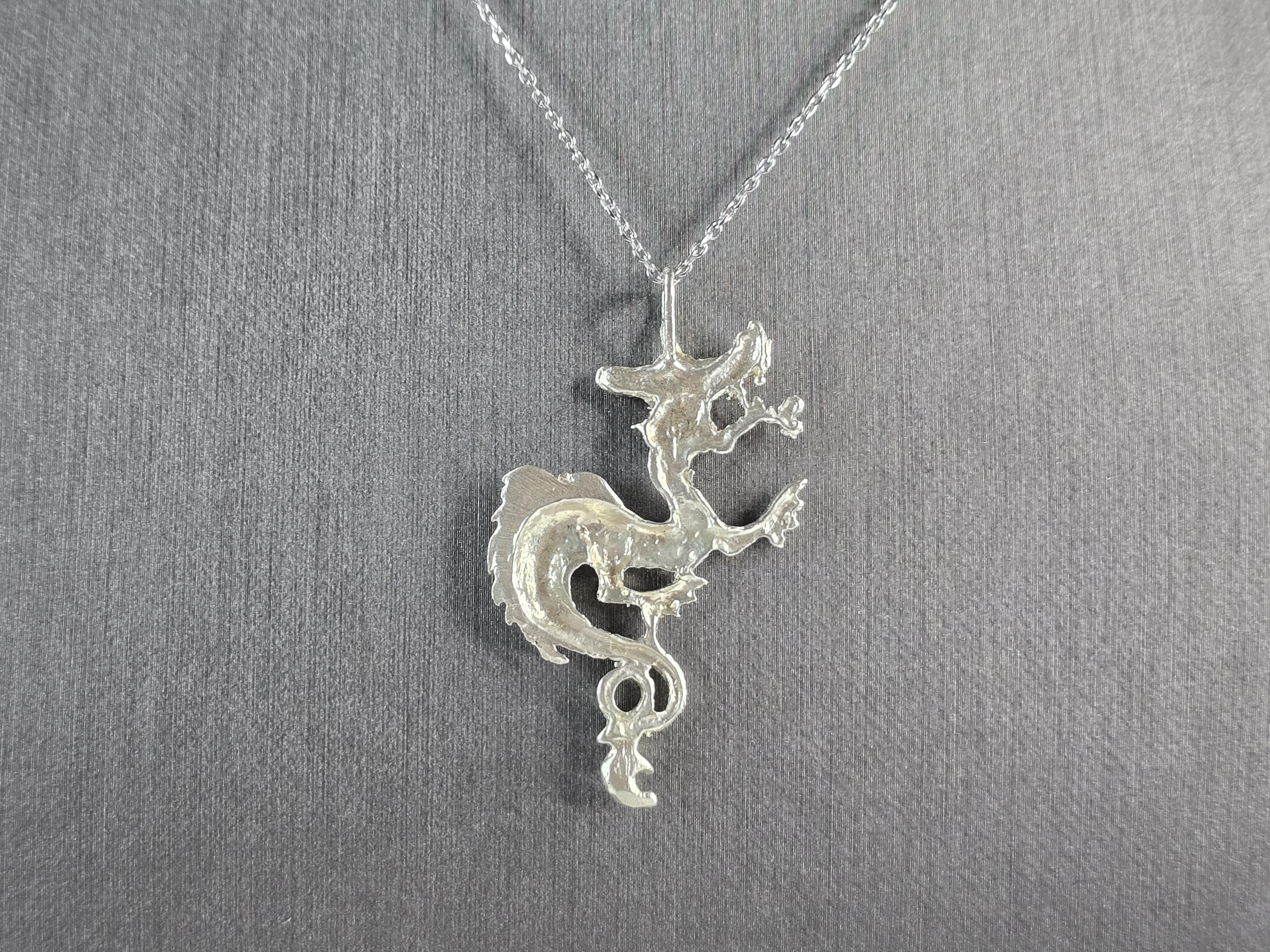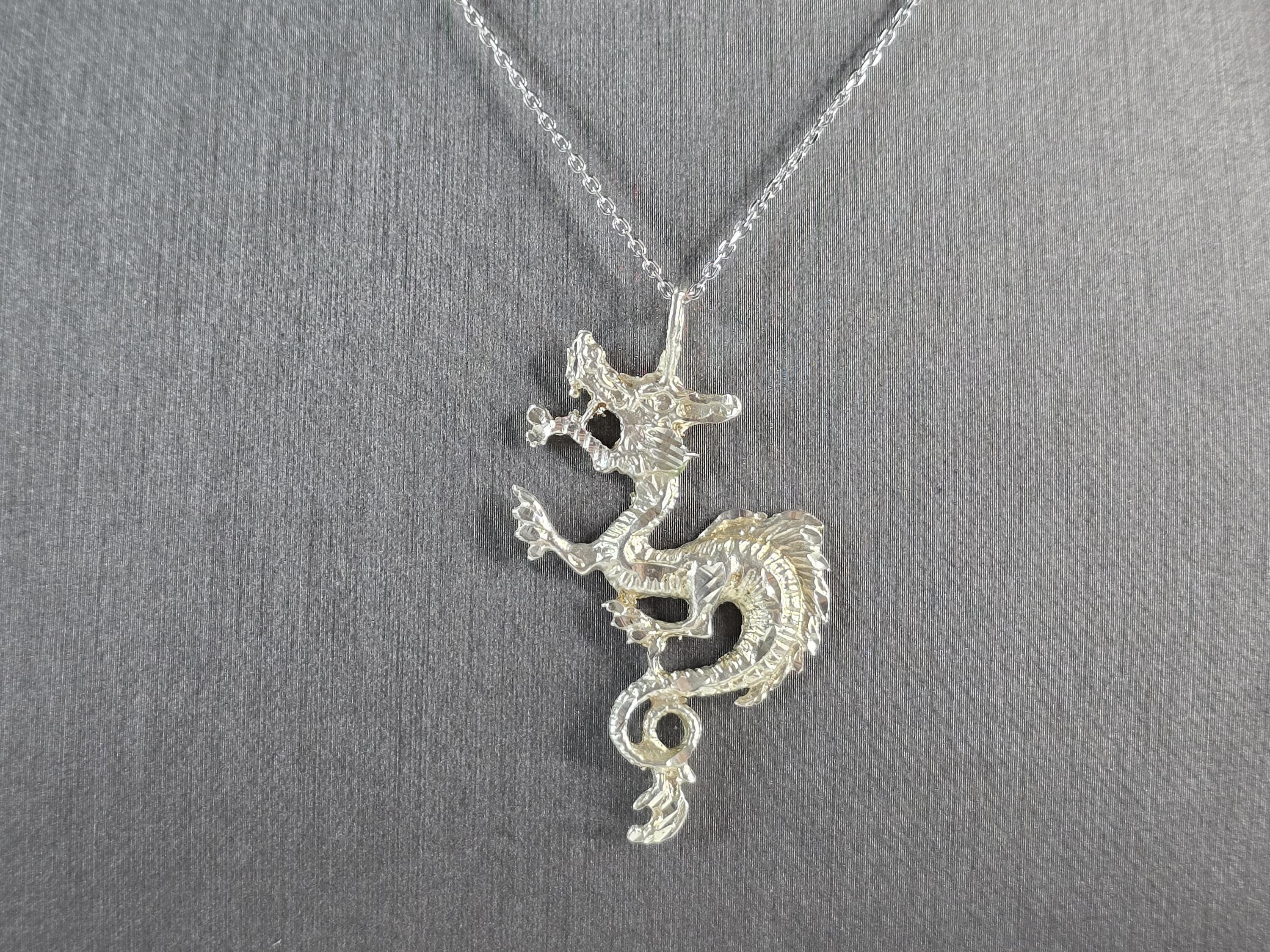 A WOMENS VINTAGE ESTATE STERLING SILVER DRAGON PENDANT WITH NECKLACE . PENDANT WITH NECKLACE WEIGHS 6.0g. THE PENDANT MEASURES 1 3/4" LONG BY 1" WIDE. THE NECKLACE MEASURES 18" LONG. MAKES A GREAT GIFT FOR THAT SOMEONE SPECIAL. ANY QUESTIONS, PLEASE ASK. BE SURE TO CHECK OUT OUR OTHER ITEMS FOR SALE.