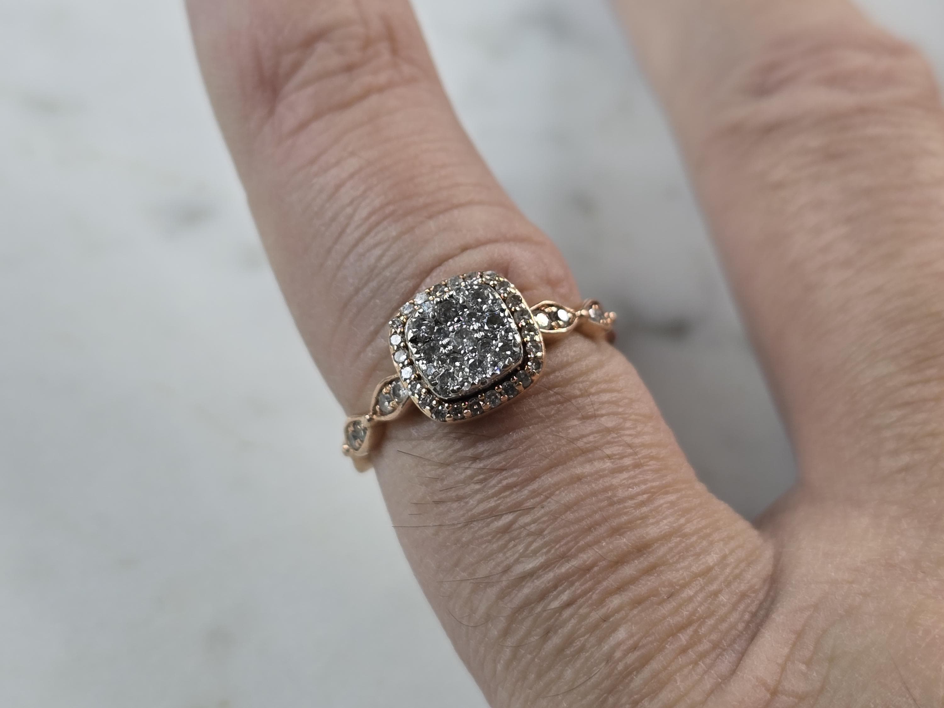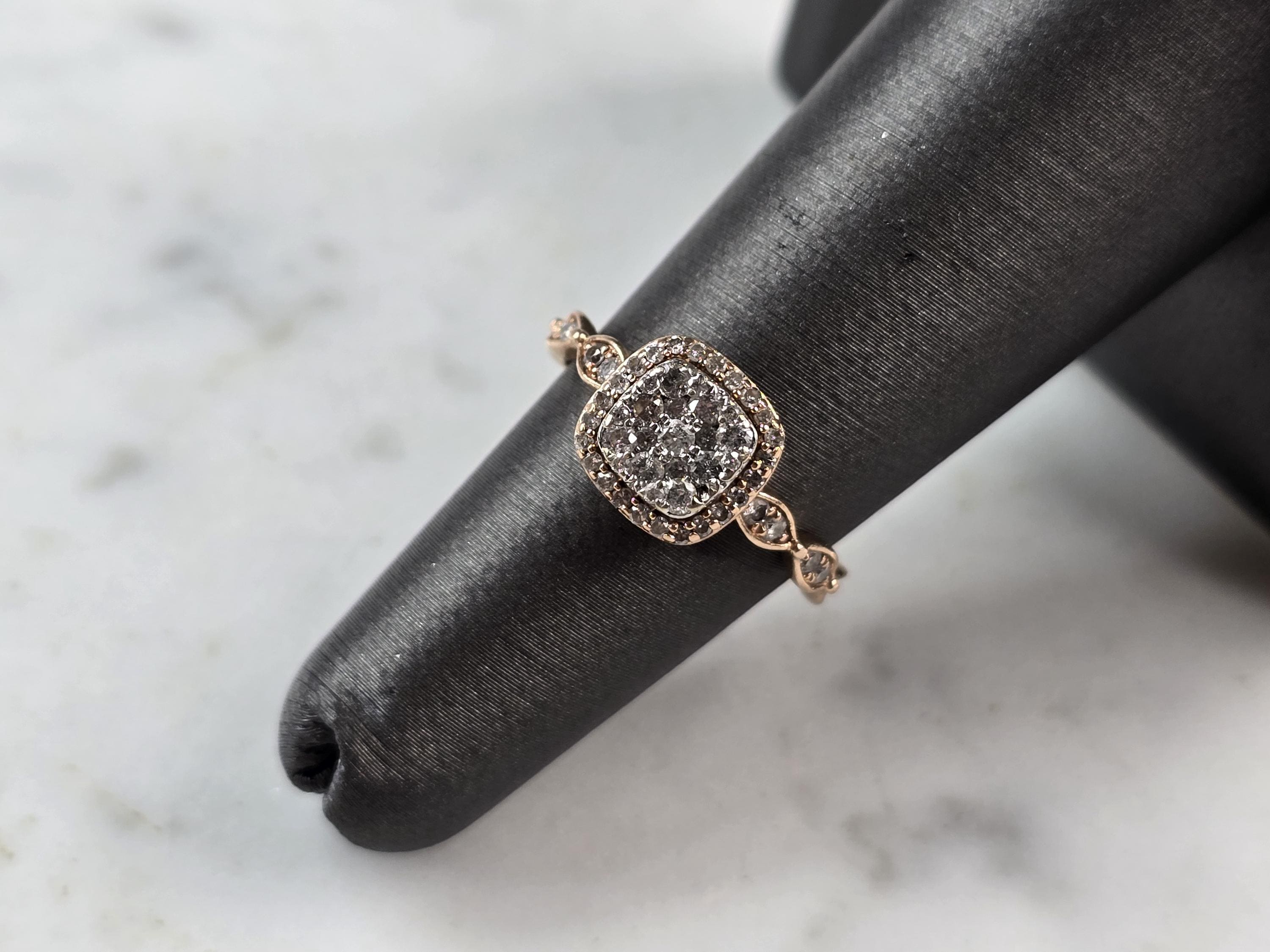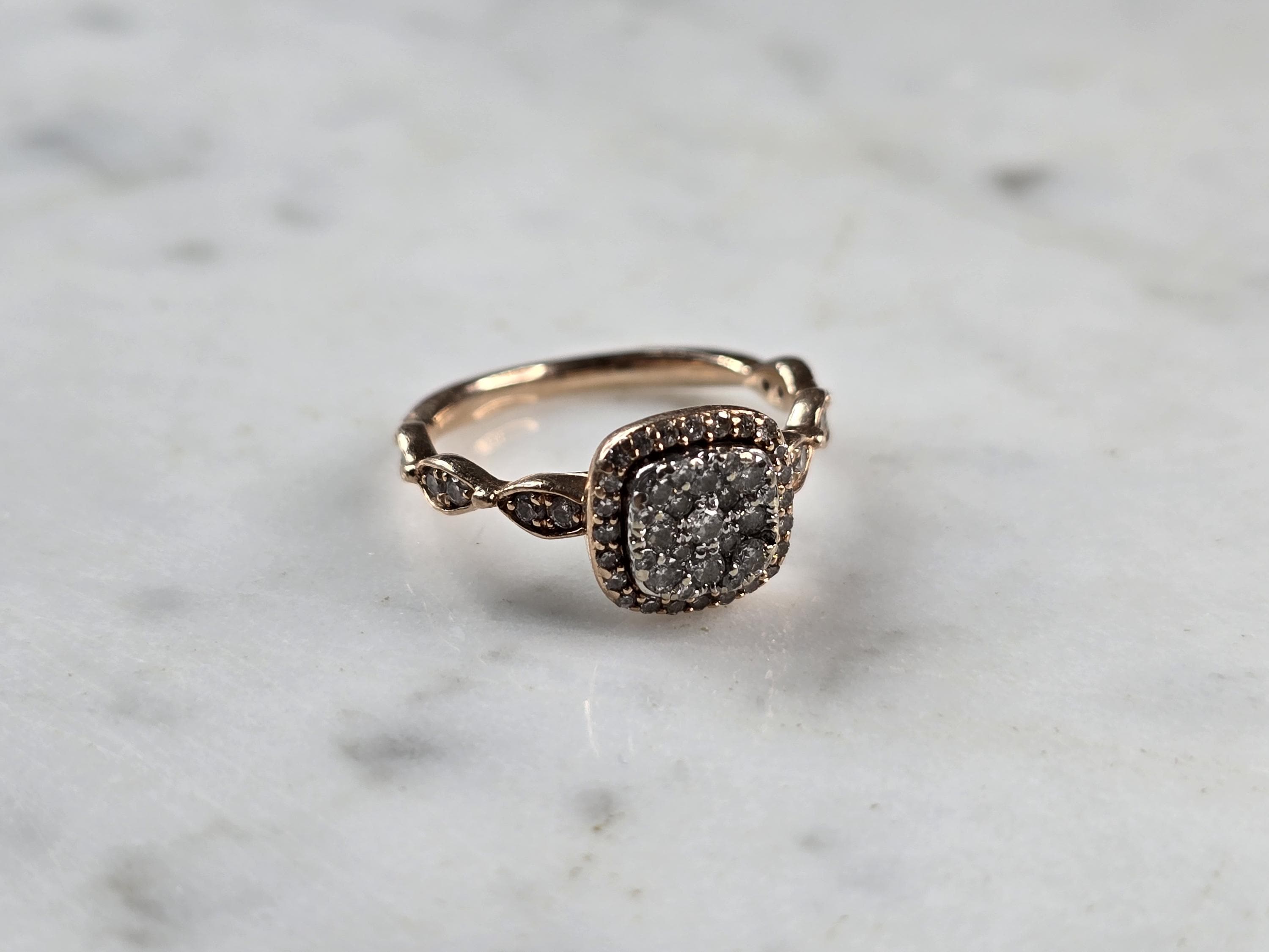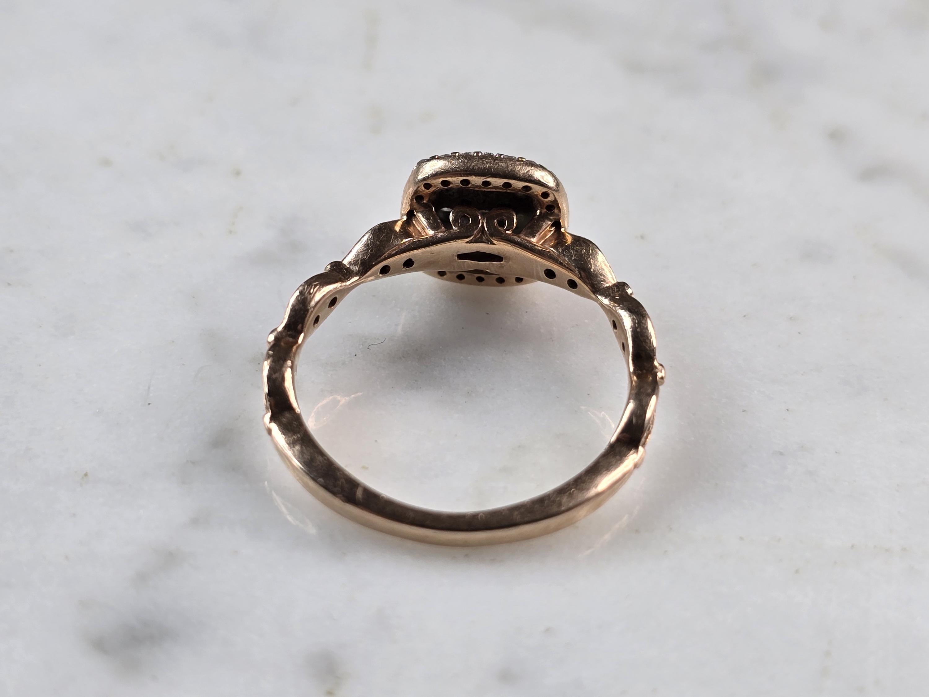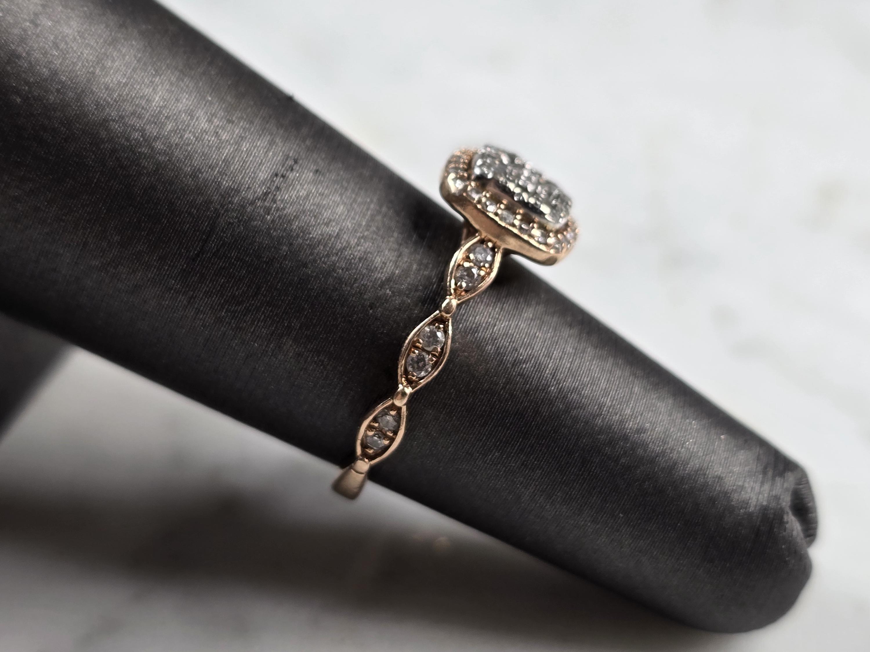A WOMENS VINTAGE ESTATE 10K ROSE GOLD DIAMOND RING. THE RING WEIGHS 2.7g, AND IS A SIZE 5.25. THE WIDTH OF THE RING IS 3/8". THERE ARE ABOUT 48 SMALL DIAMONDS IN THIS RING. RING IS NOT MARKED, BUT IT HAS BEEN TESTED AND IS GUARANTEED TO BE AS DESCRIBED. ANY QUESTIONS, PLEASE DON'T HESITATE TO ASK. BE SURE TO CHECK OUT SOME OF MY OTHER GREAT ITEMS UP FOR SALE. THANK YOU .