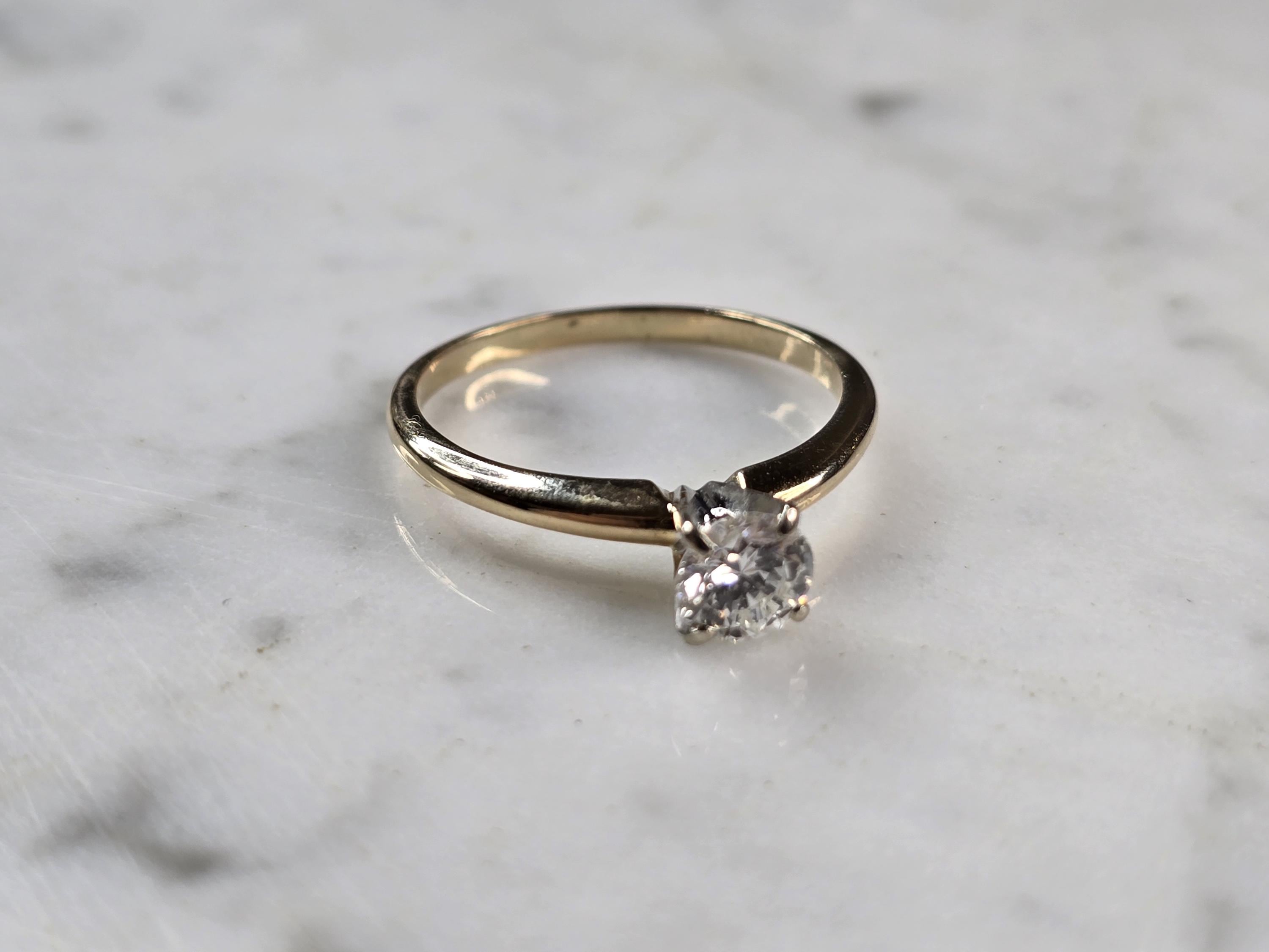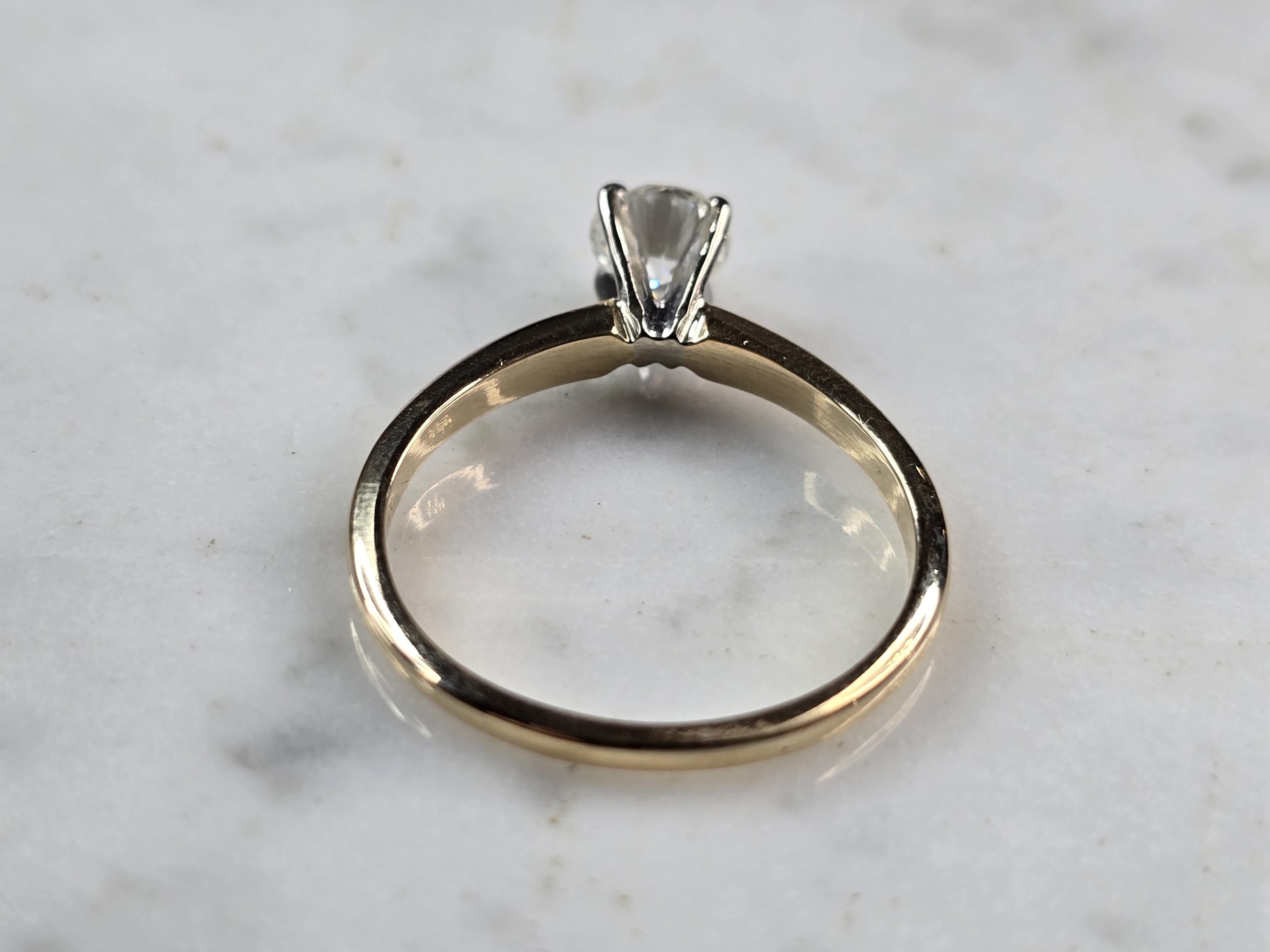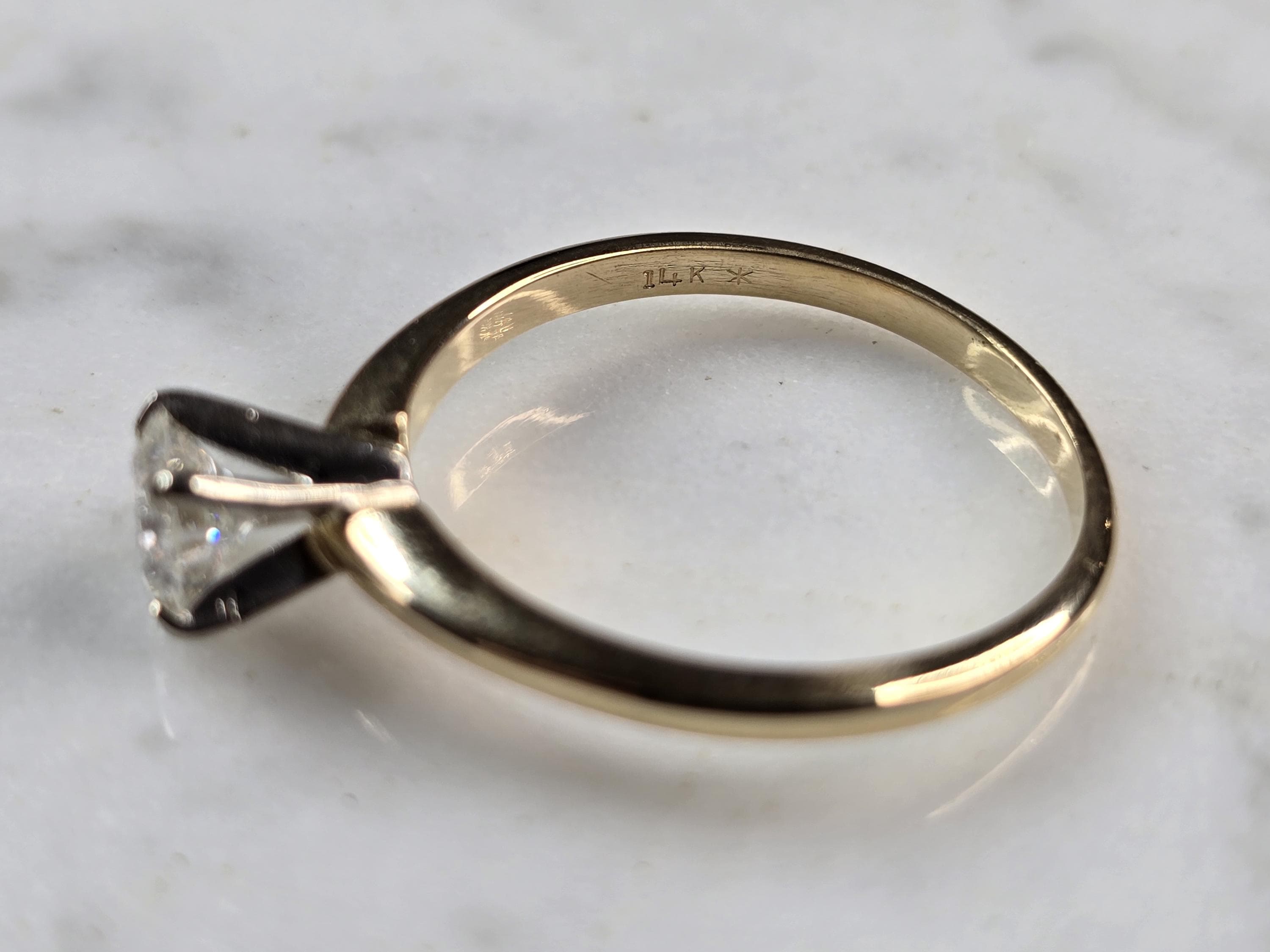 A WOMEN'S VINTAGE ESTATE 14K GOLD DIAMOND ENGAGEMENT RING. THE RING WEIGHS 2.7g. THE SIZE OF THE RING IS AN 8.0, AND IS ABOUT 1/4" WIDE. THE DIAMOND IS ABOUT .65cts. MAKES A LOVELY GIFT FOR THAT SOMEONE SPECIAL. ANY QUESTIONS PLEASE DO NOT HESITATE TO ASK. BE SURE TO CHECK OUT SOME OF MY OTHER GREAT ITEMS UP FOR SALE. THANK YOU.