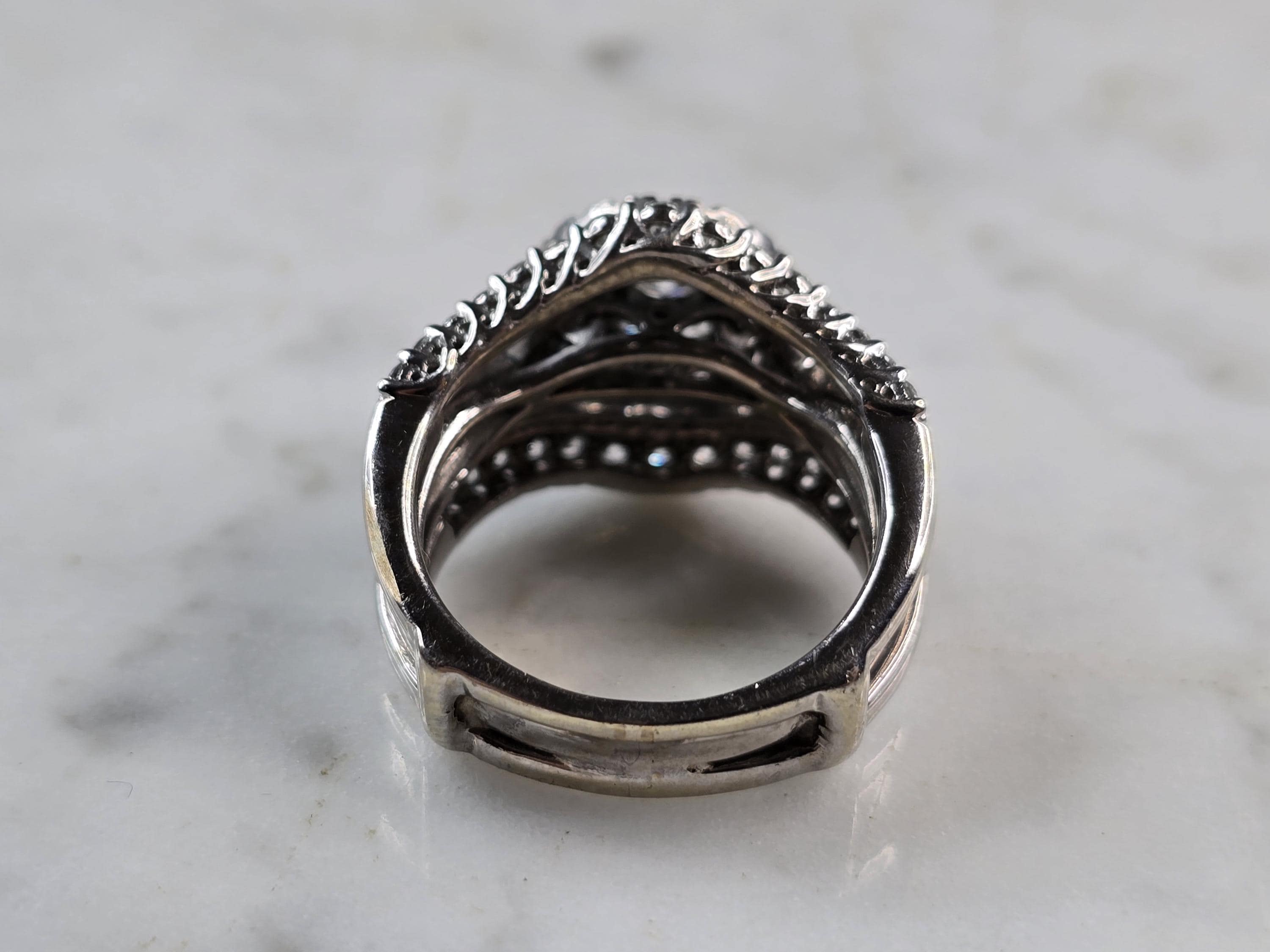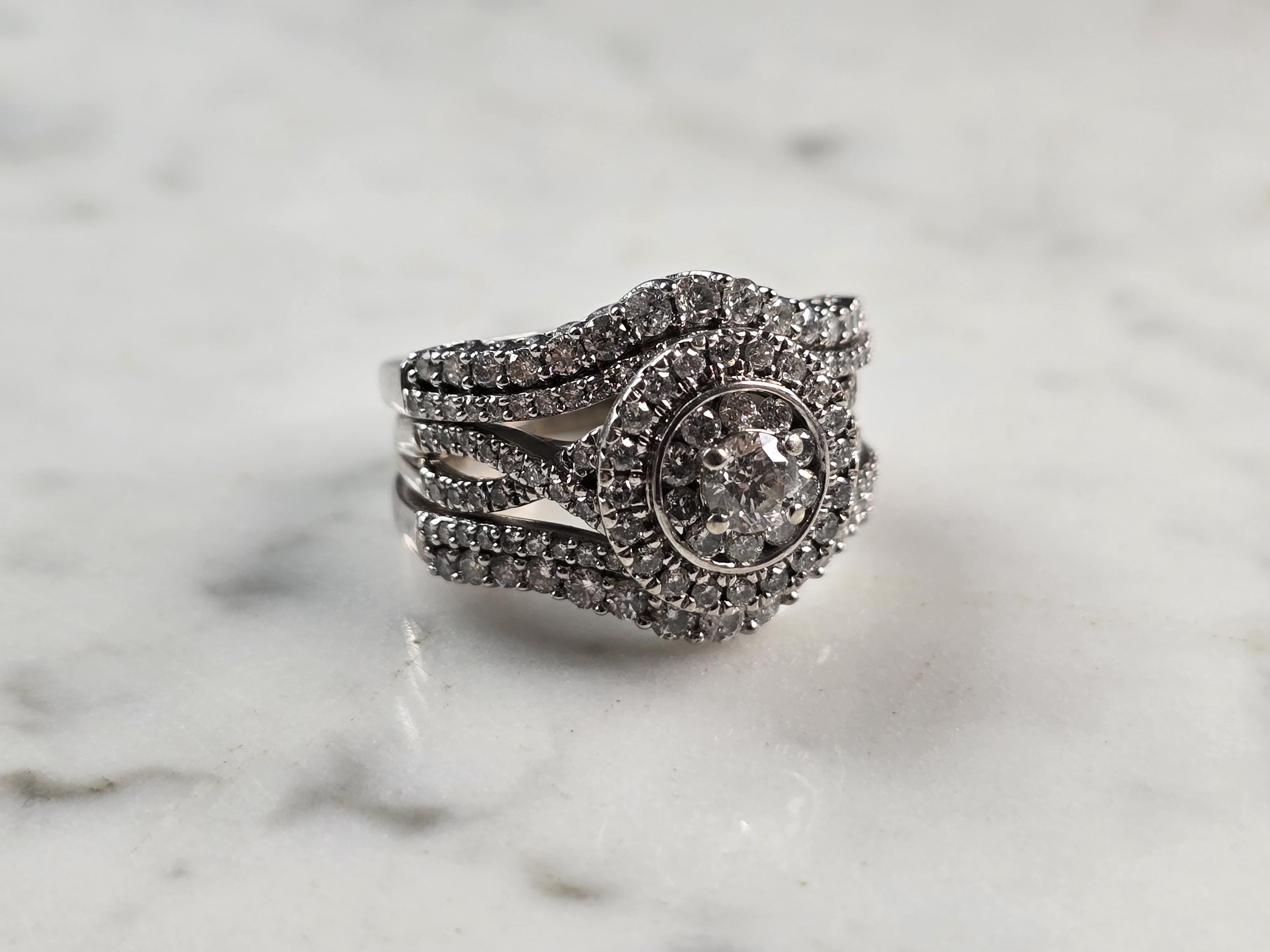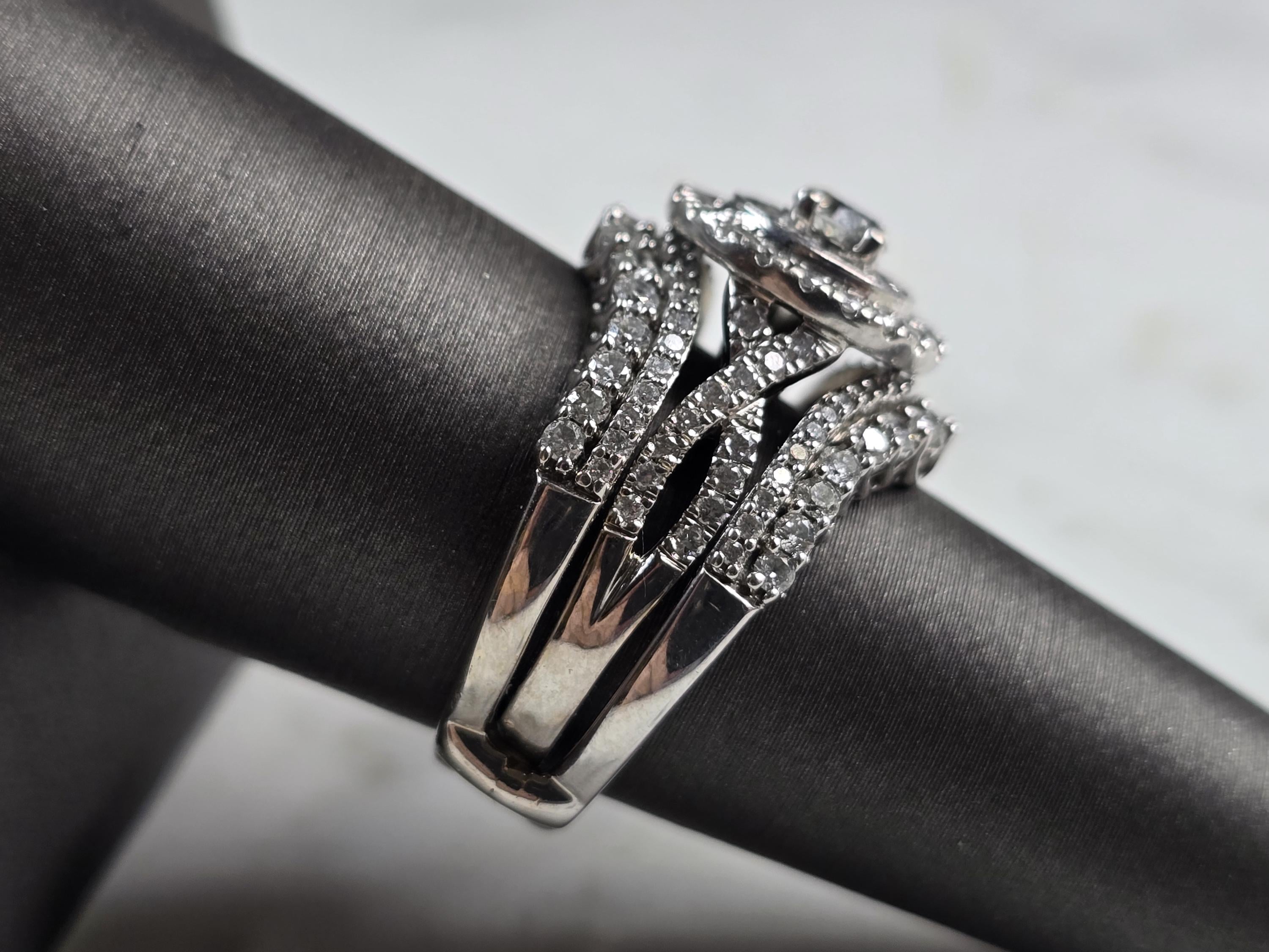 A WOMENS VINTAGE ESTATE 14K WHITE GOLD DIAMOND RING. THE RING IS A SIZE 7.5 AND WEIGHS 10.7g. THE CENTER IS ABOUT 0.30cts, WITH 84 SMALL ACCENT DIAMONDS. THE WIDTH OF THE RING IS 5/8". THE RING MAKES A BEAUTIFUL GIFT FOR THAT SOMEONE SPECIAL. ANY QUESTIONS, PLEASE ASK. BE SURE TO CHECK OUT SOME OF MY OTHER GREAT ITEMS UP FOR SALE. THANK YOU