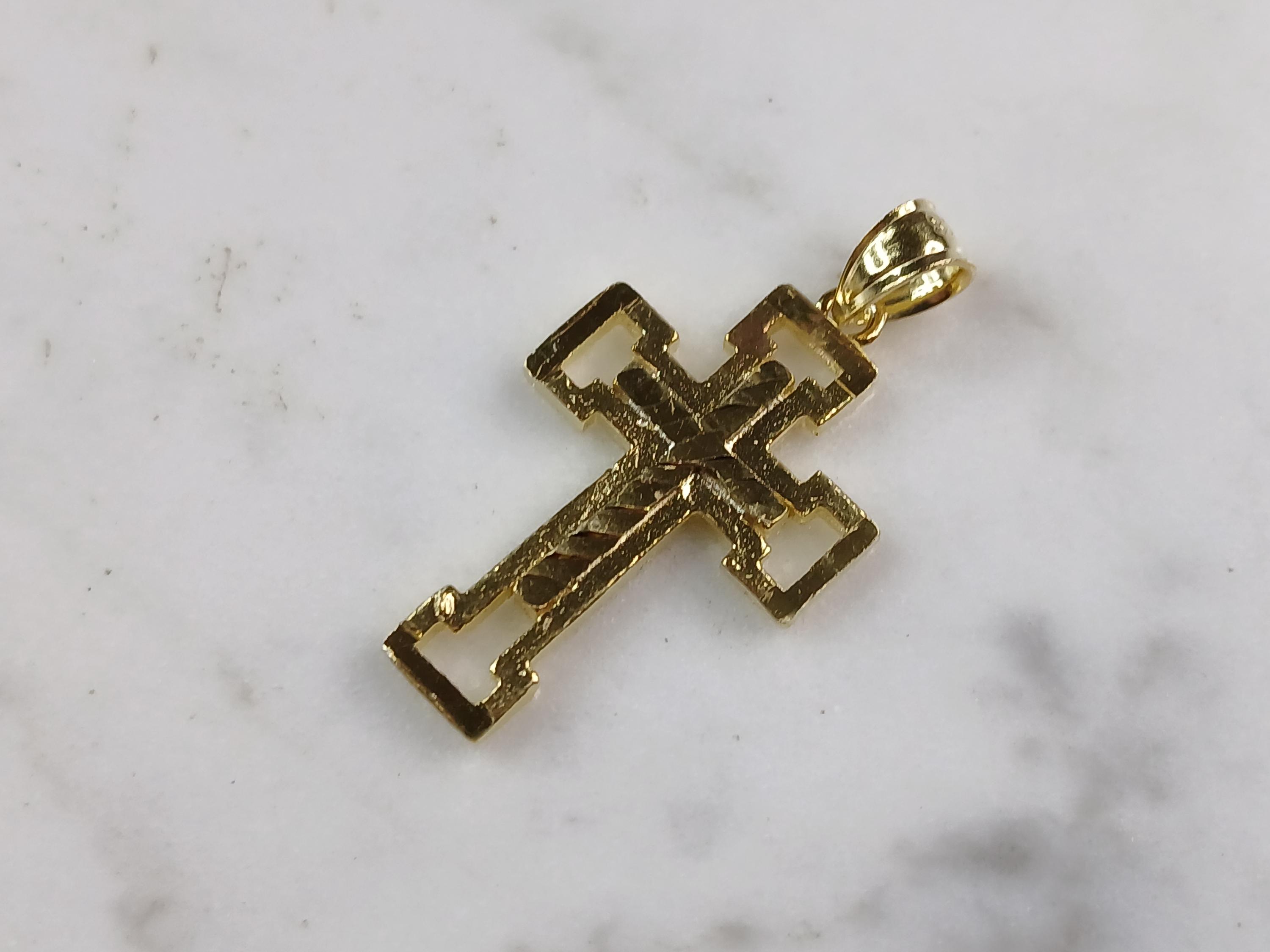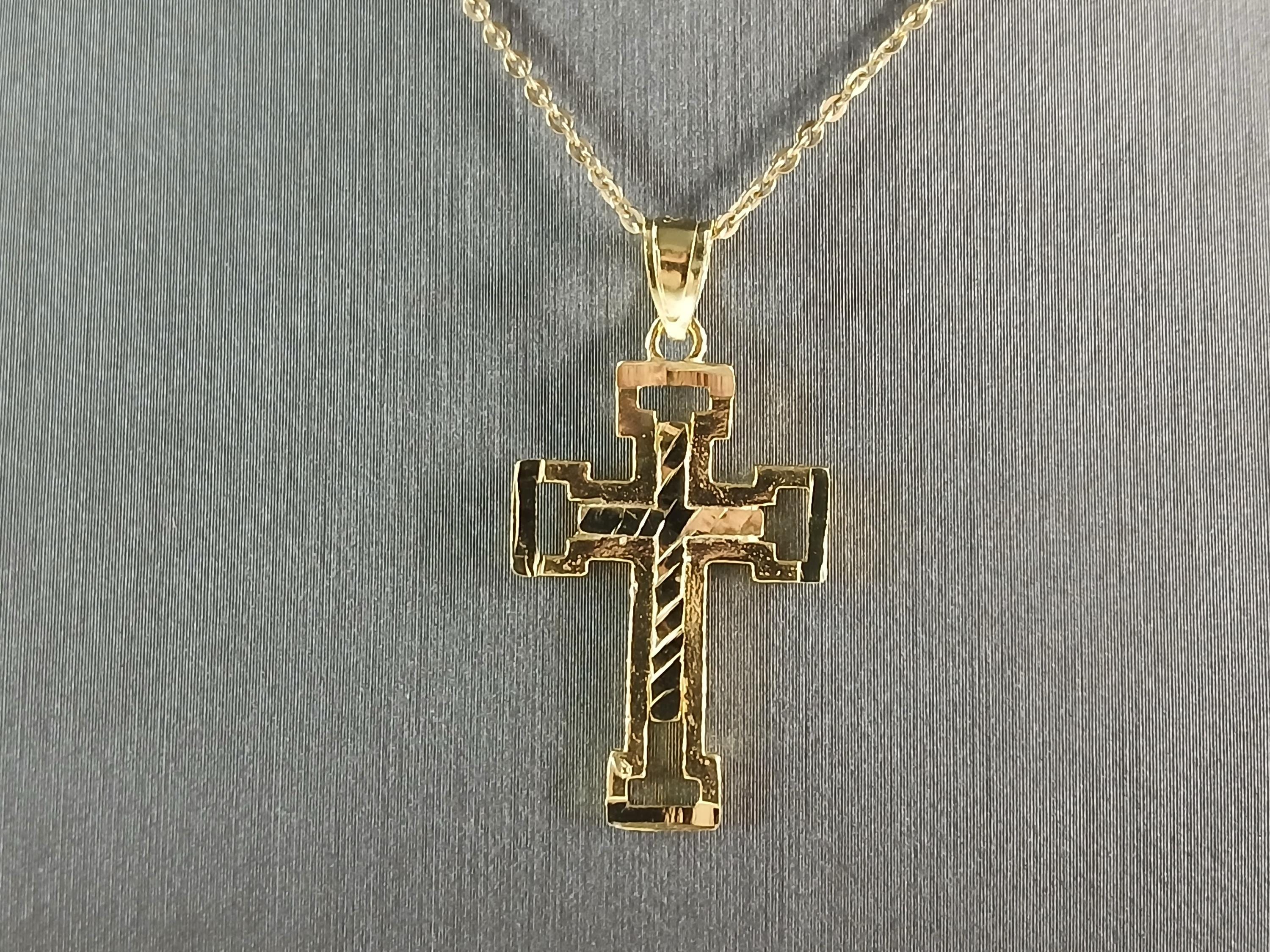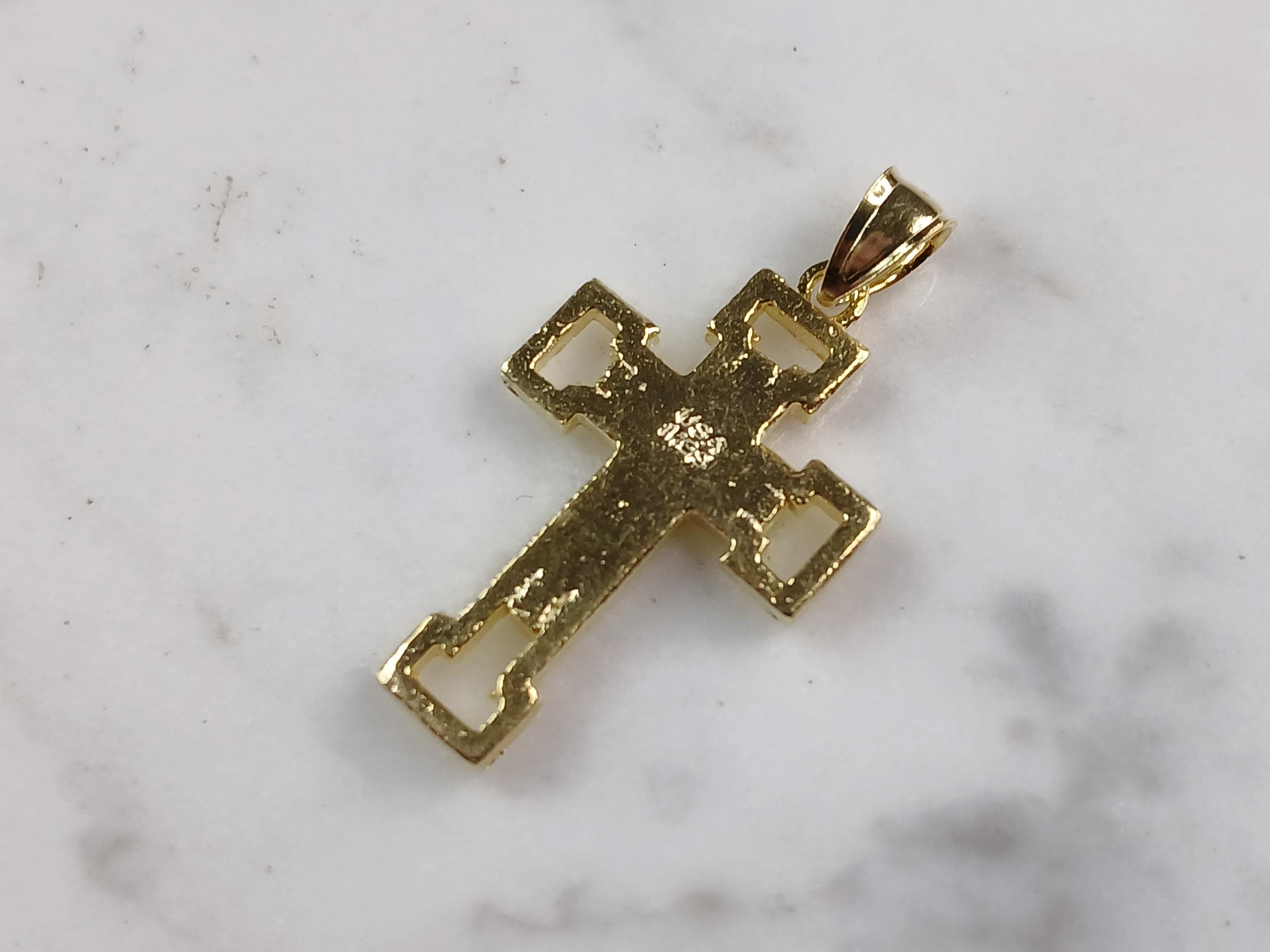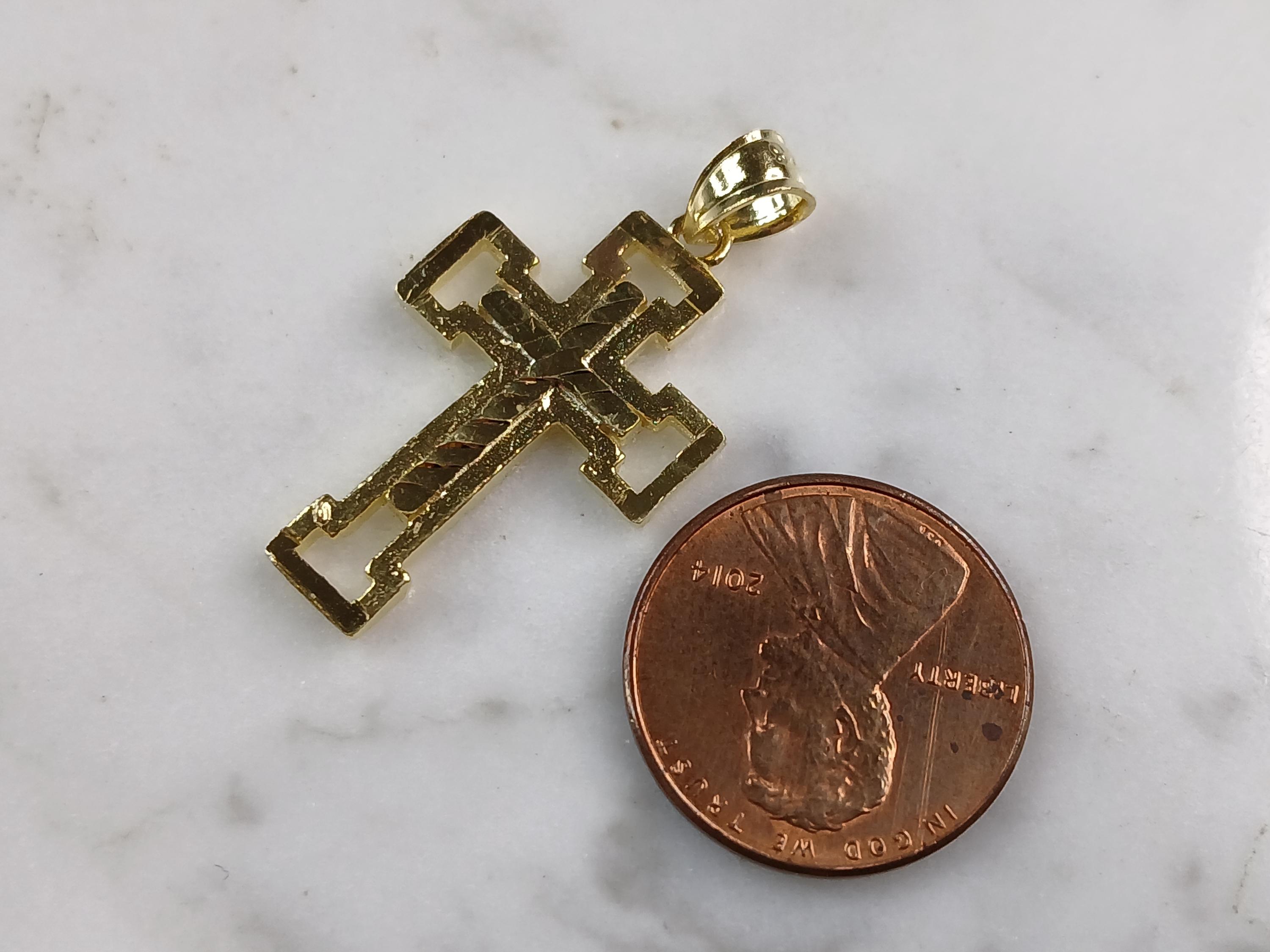 A VERY NICE STERLING SILVER GOLD TONE RELIGIOUS CROSS NECKLACE THAT WEIGHS 4.1g. THE NECKLACE MEASURES 18" LONG AND THE PENDANT MEASURES 1 1/4" LONG BY 3/4" WIDE. ANY QUESTIONS PLEASE DONT HESITATE TO ASK. BE SURE TO CHECK OUT SOME OF MY OTHER GREAT ITEMS UP FOR SALE. THANK YOU