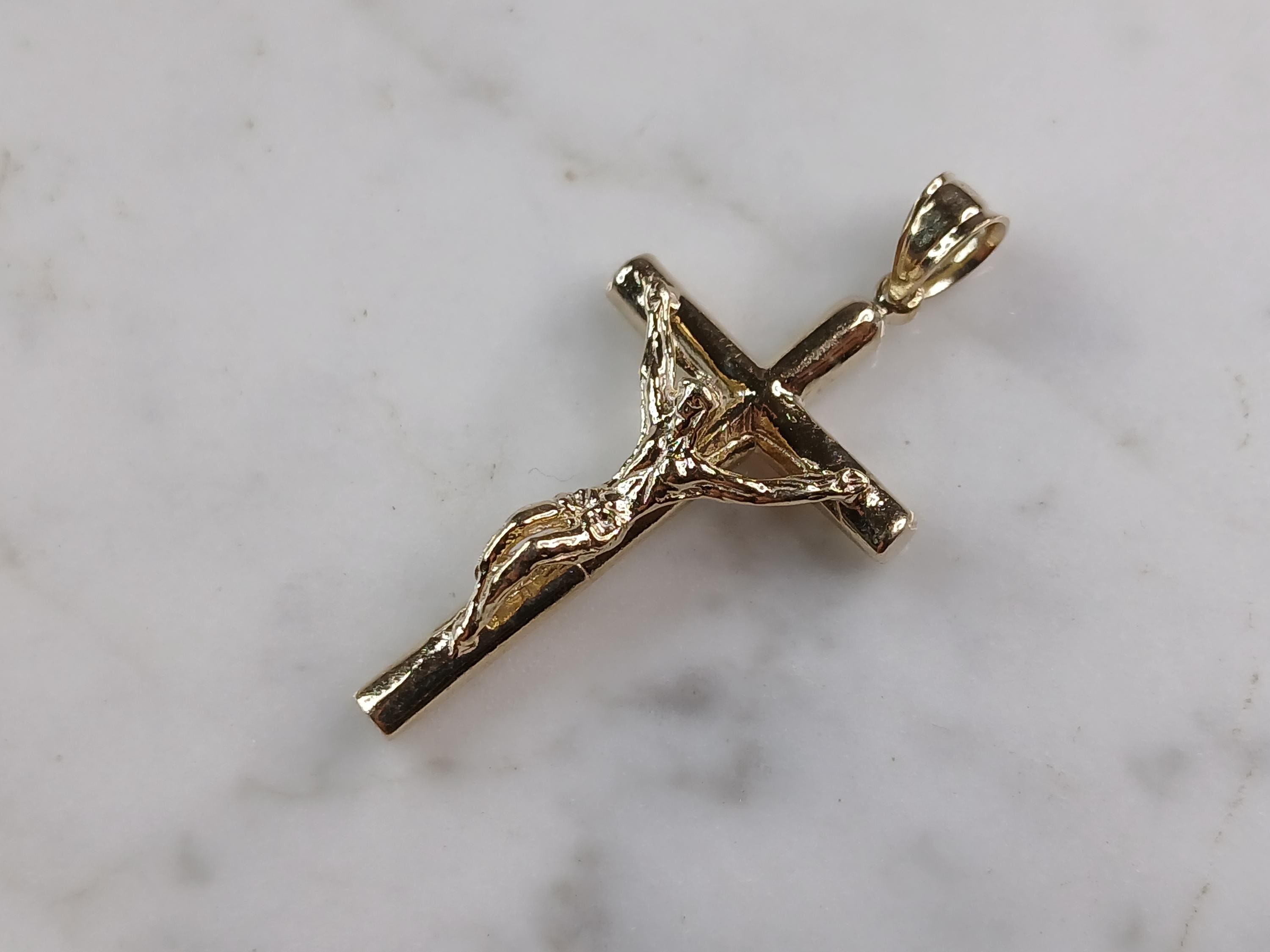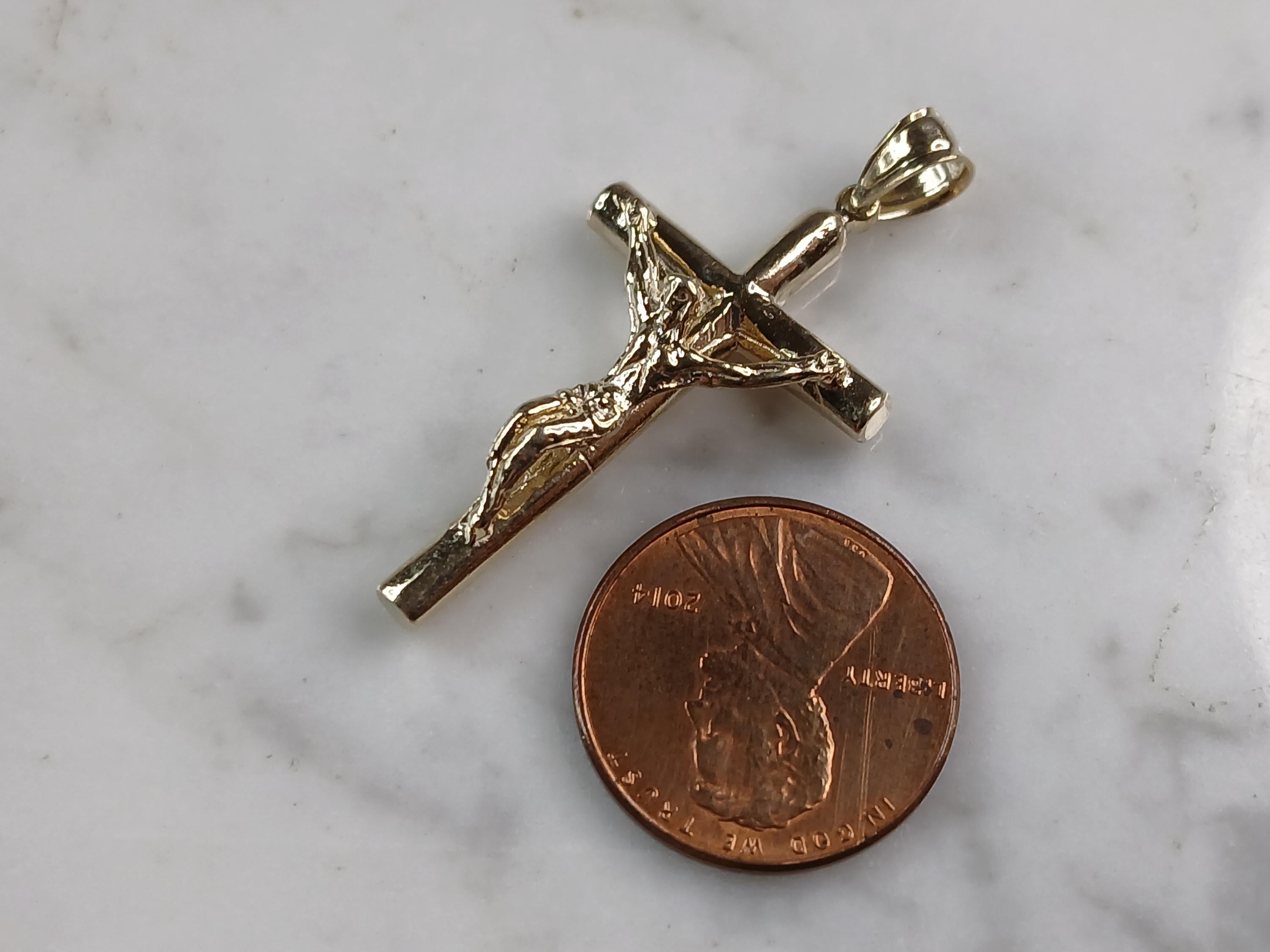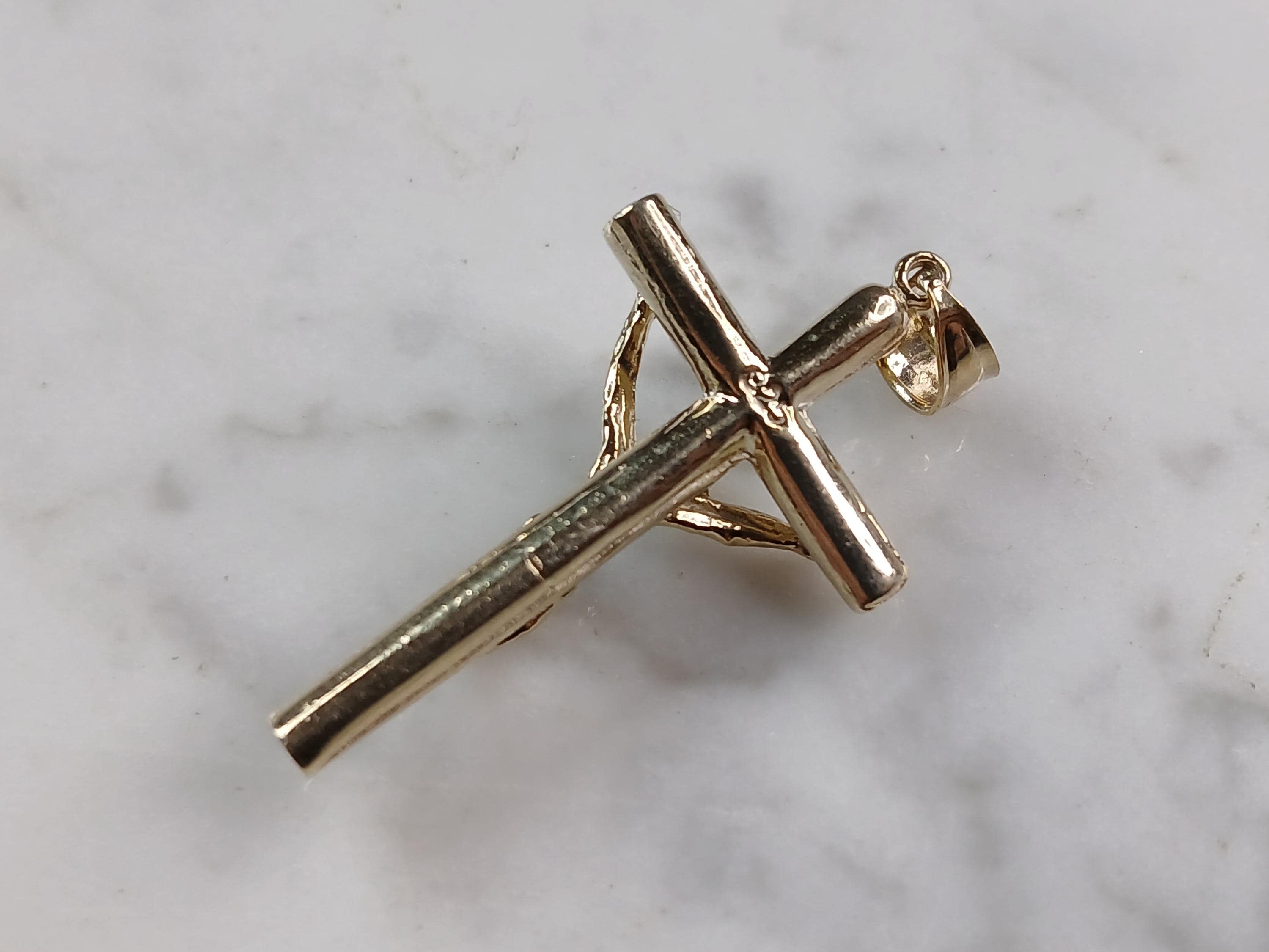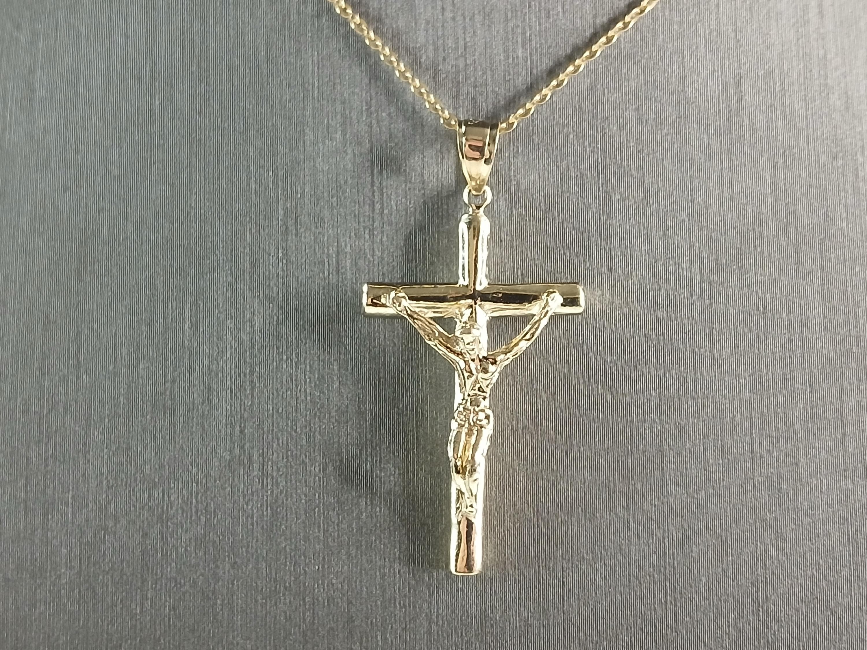 A VERY NICE STERLING SILVER GOLD TONE RELIGIOUS CROSS NECKLACE THAT WEIGHS 6.0g. THE NECKLACE MEASURES 18" LONG AND THE PENDANT MEASURES 1 1/2" LONG BY 3/4" WIDE. ANY QUESTIONS PLEASE DONT HESITATE TO ASK. BE SURE TO CHECK OUT SOME OF MY OTHER GREAT ITEMS UP FOR SALE. THANK YOU