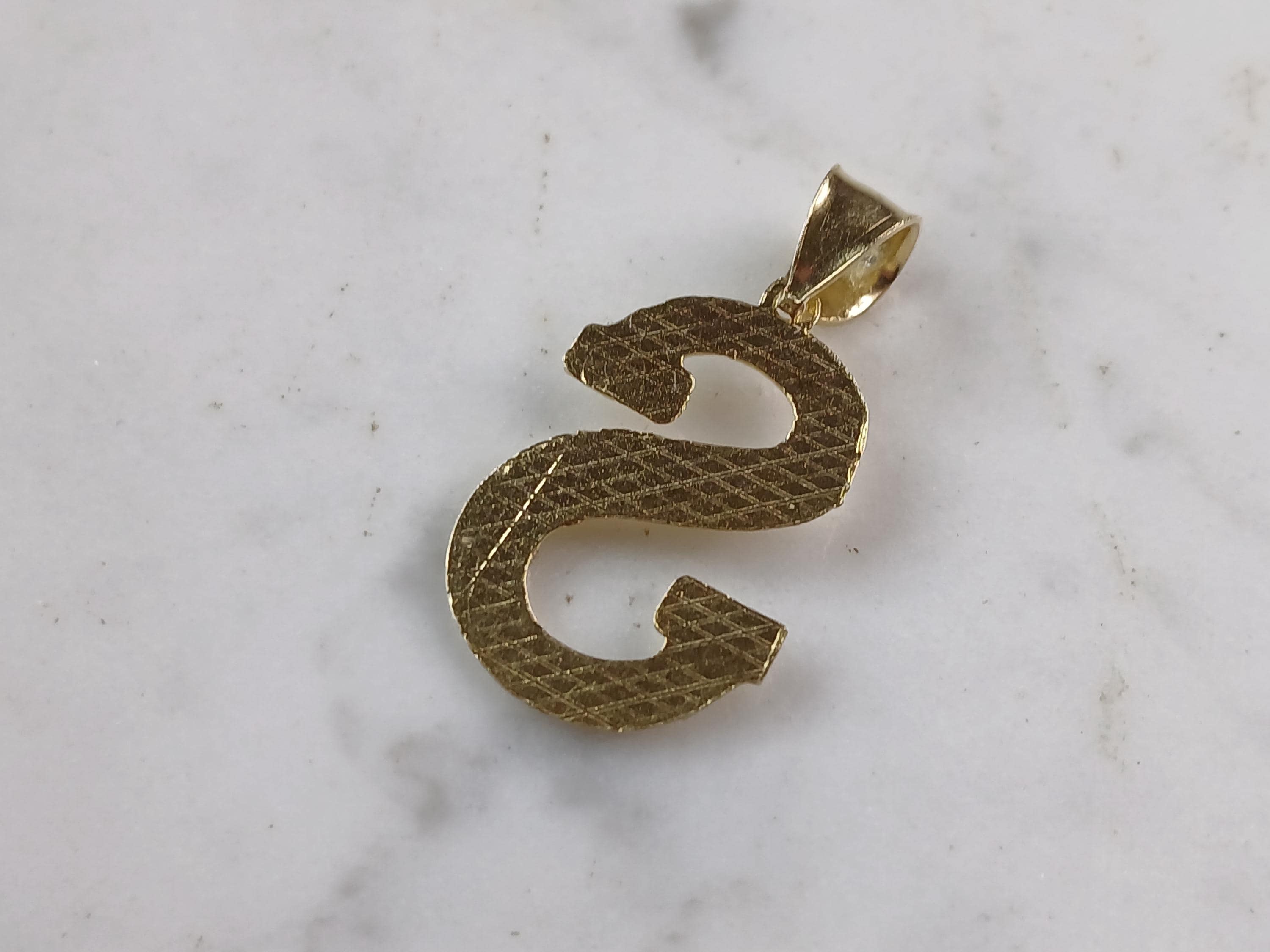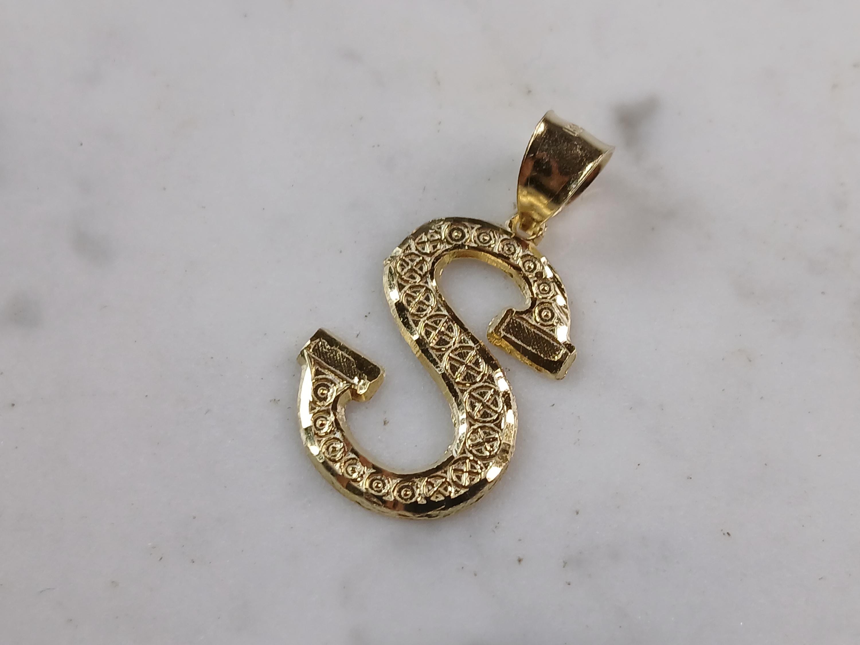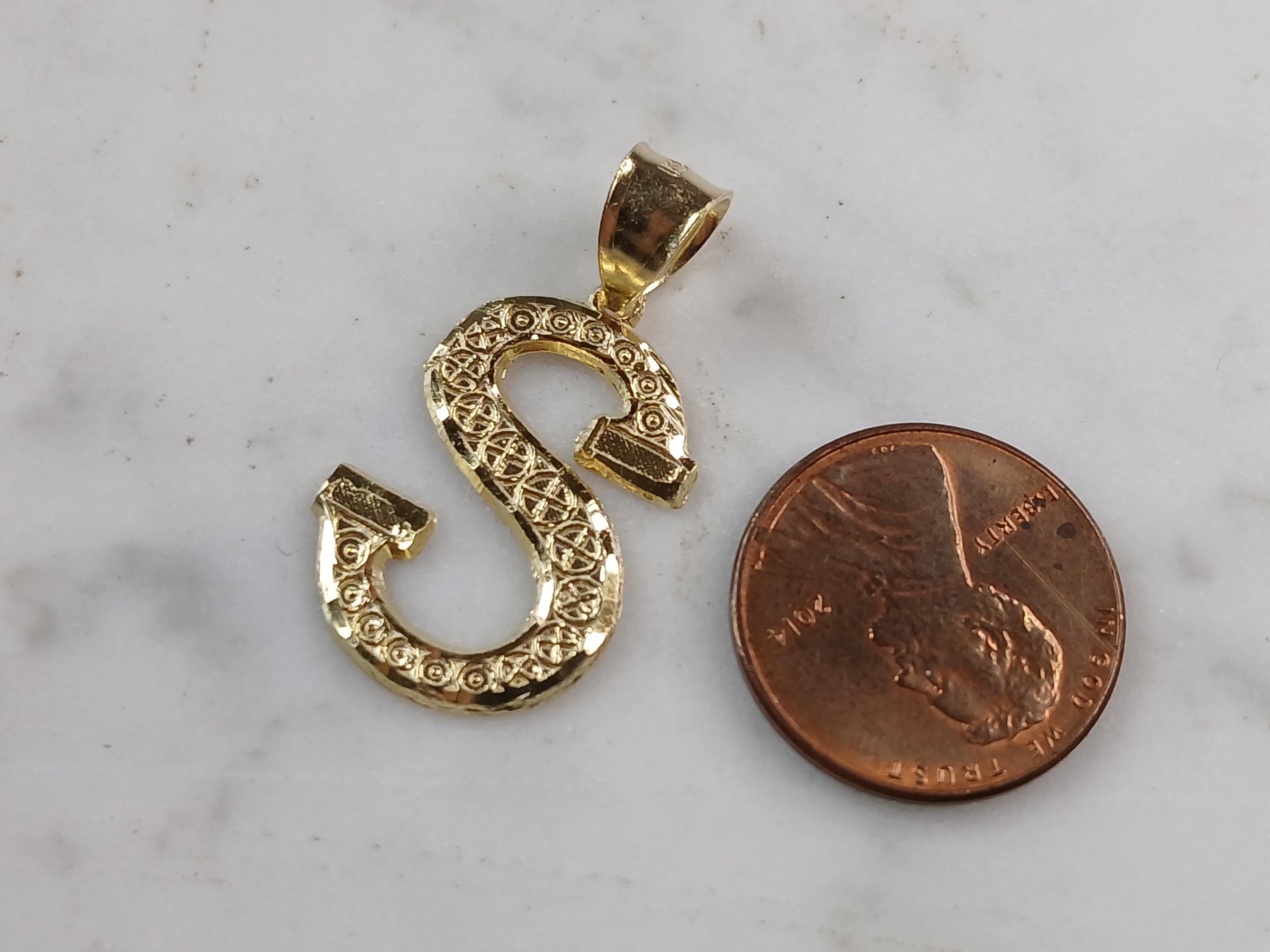 A WOMENS STERLING SILVER GOLD TONE INITIAL LETTER "S" PENDANT. PENDANT WEIGHS 1.9g AND MEASURES 1 1/8" LONG BY 5/8" WIDE. MAKES A GREAT GIFT FOR THAT SOMEONE SPECIAL. ANY QUESTIONS, PLEASE ASK. BE SURE TO CHECK OUT OUR OTHER ITEMS FOR SALE.