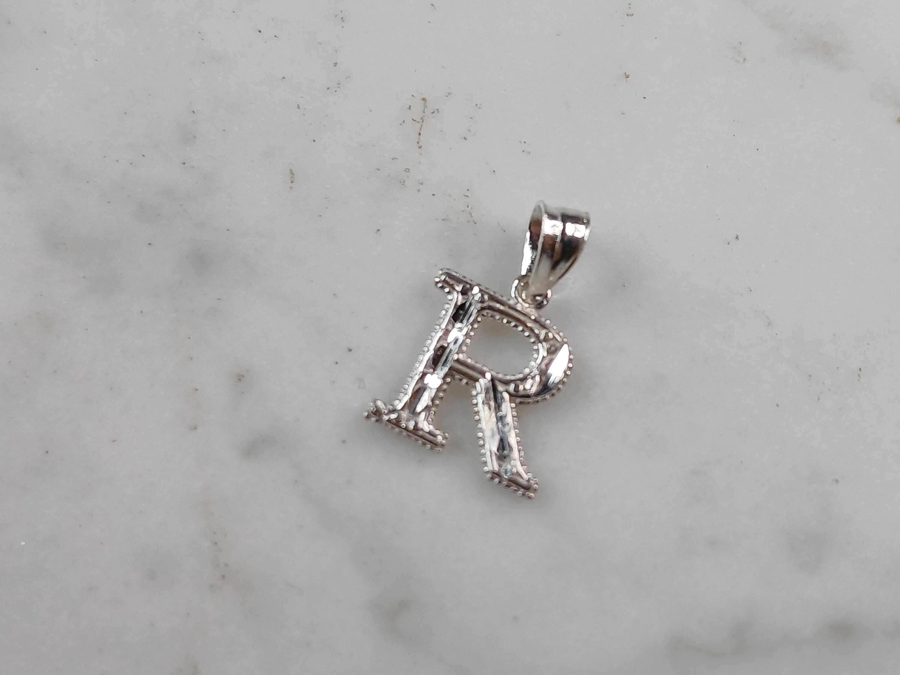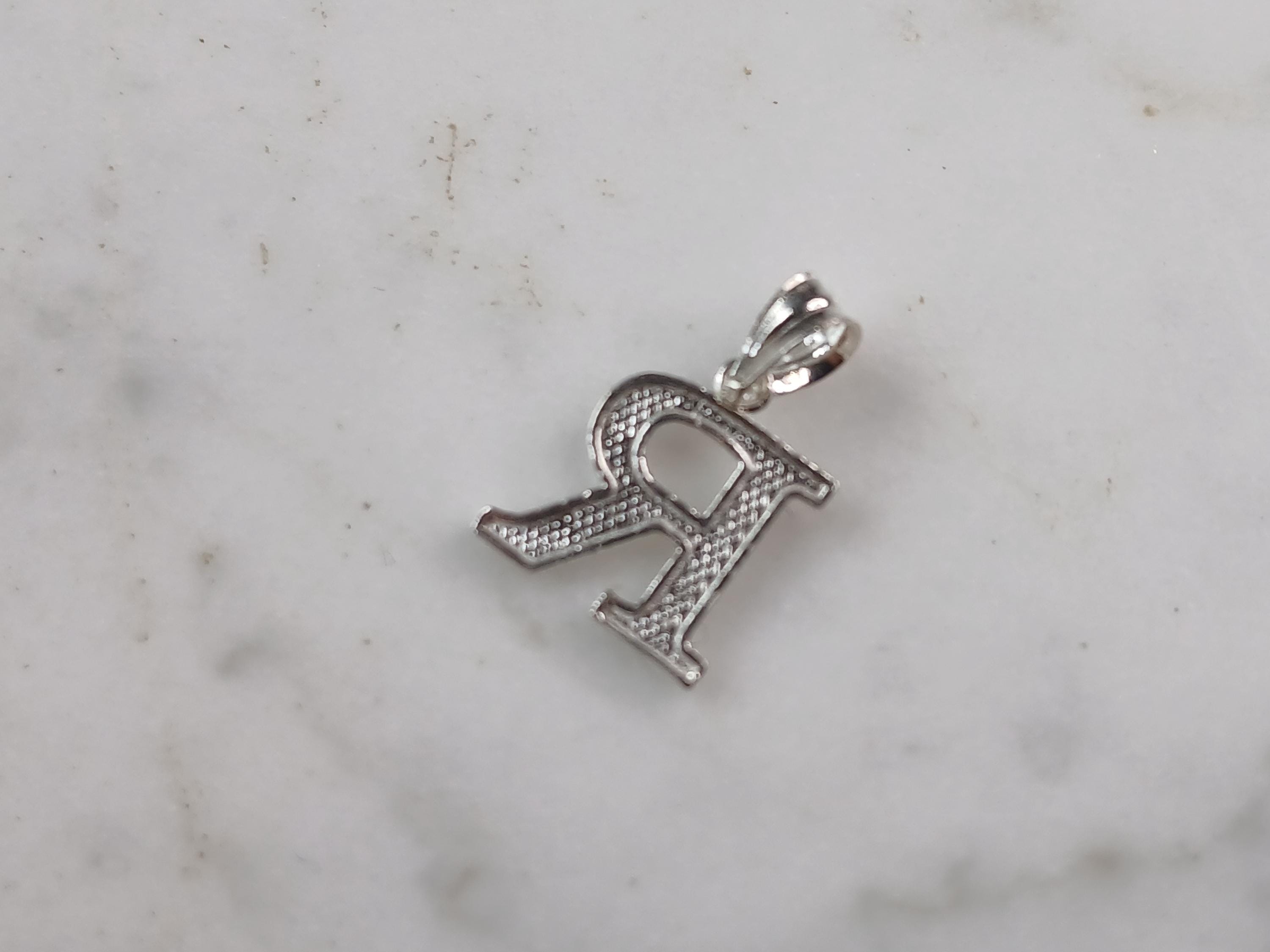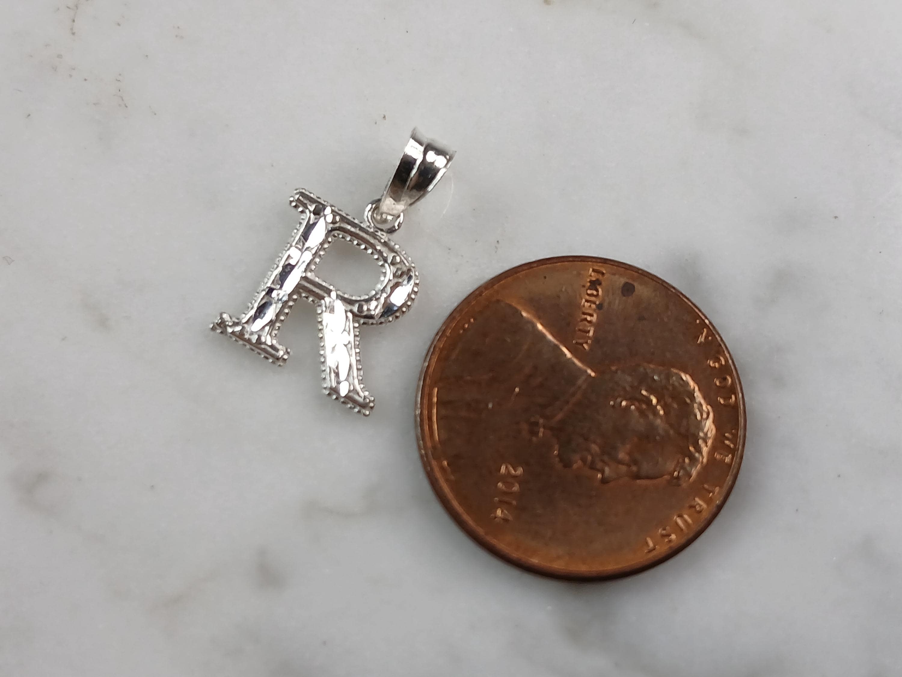 A WOMENS STERLING SILVER INITIAL LETTER "R" PENDANT. PENDANT WEIGHS 0.3g AND MEASURES 5/8" LONG BY 3/8" WIDE. MAKES A GREAT GIFT FOR THAT SOMEONE SPECIAL. ANY QUESTIONS, PLEASE ASK. BE SURE TO CHECK OUT OUR OTHER ITEMS FOR SALE.