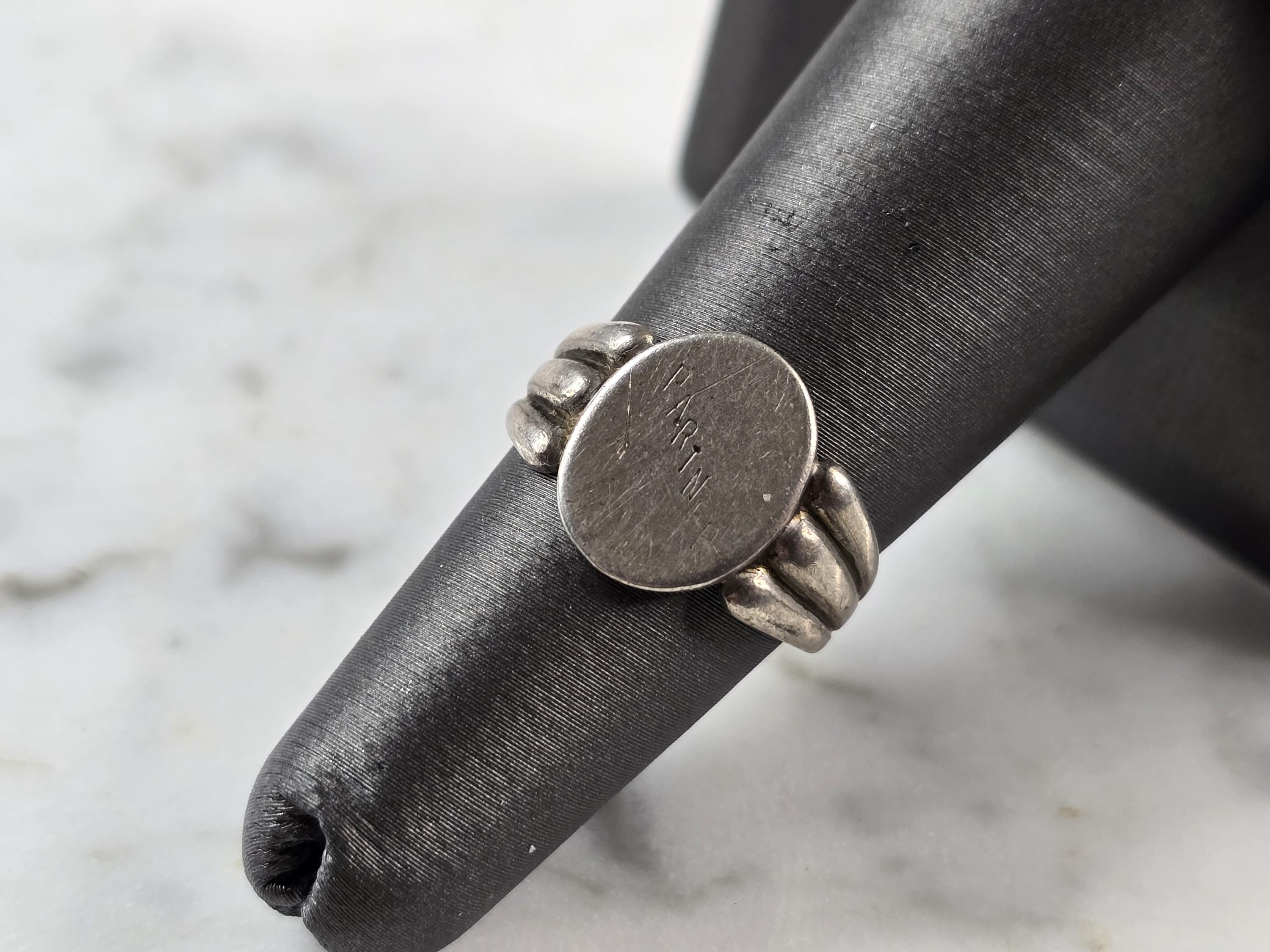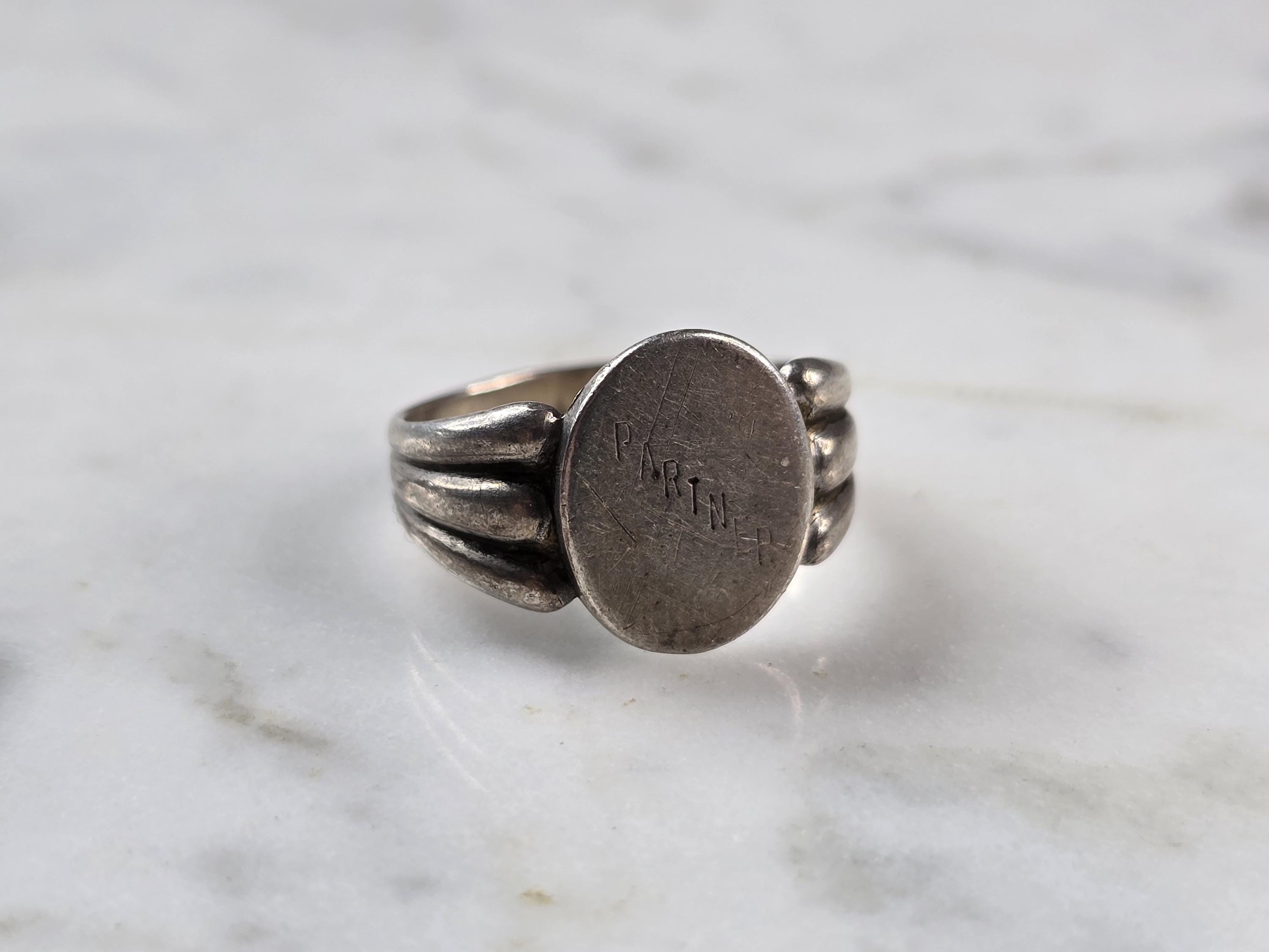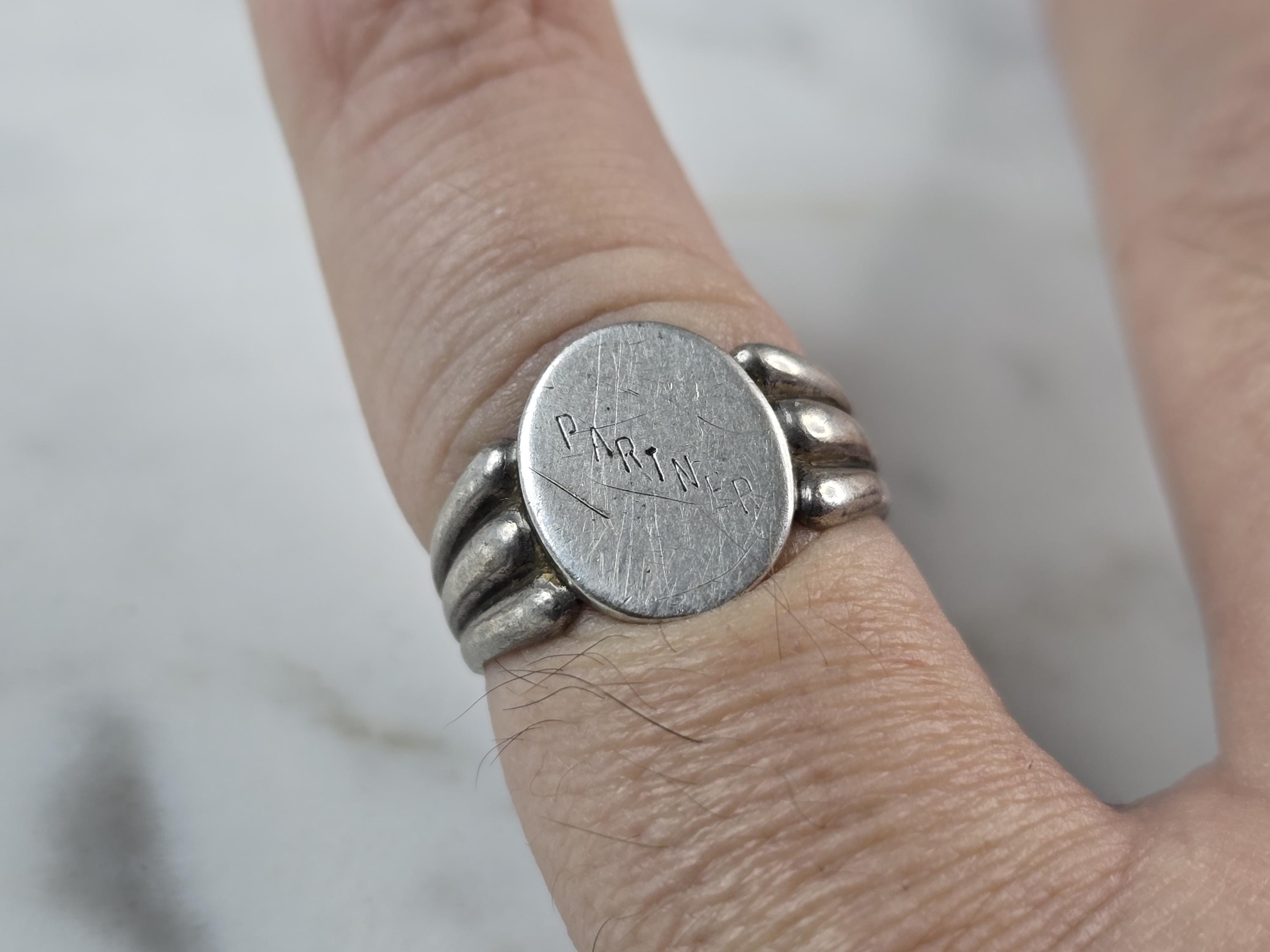 A VINTAGE ESTATE STERLING SILVER SIGNET " PARTNER " RING. THE RING WEIGHS 2.9g, AND IS A SIZE 5.75. THE WIDTH OF THE RING IS 1/2". ANY QUESTIONS PLEASE DO NOT HESITATE TO ASK. BE SURE TO CHECK OUT SOME OF MY OTHER GREAT ITEMS UP FOR SALE. THANK YOU.