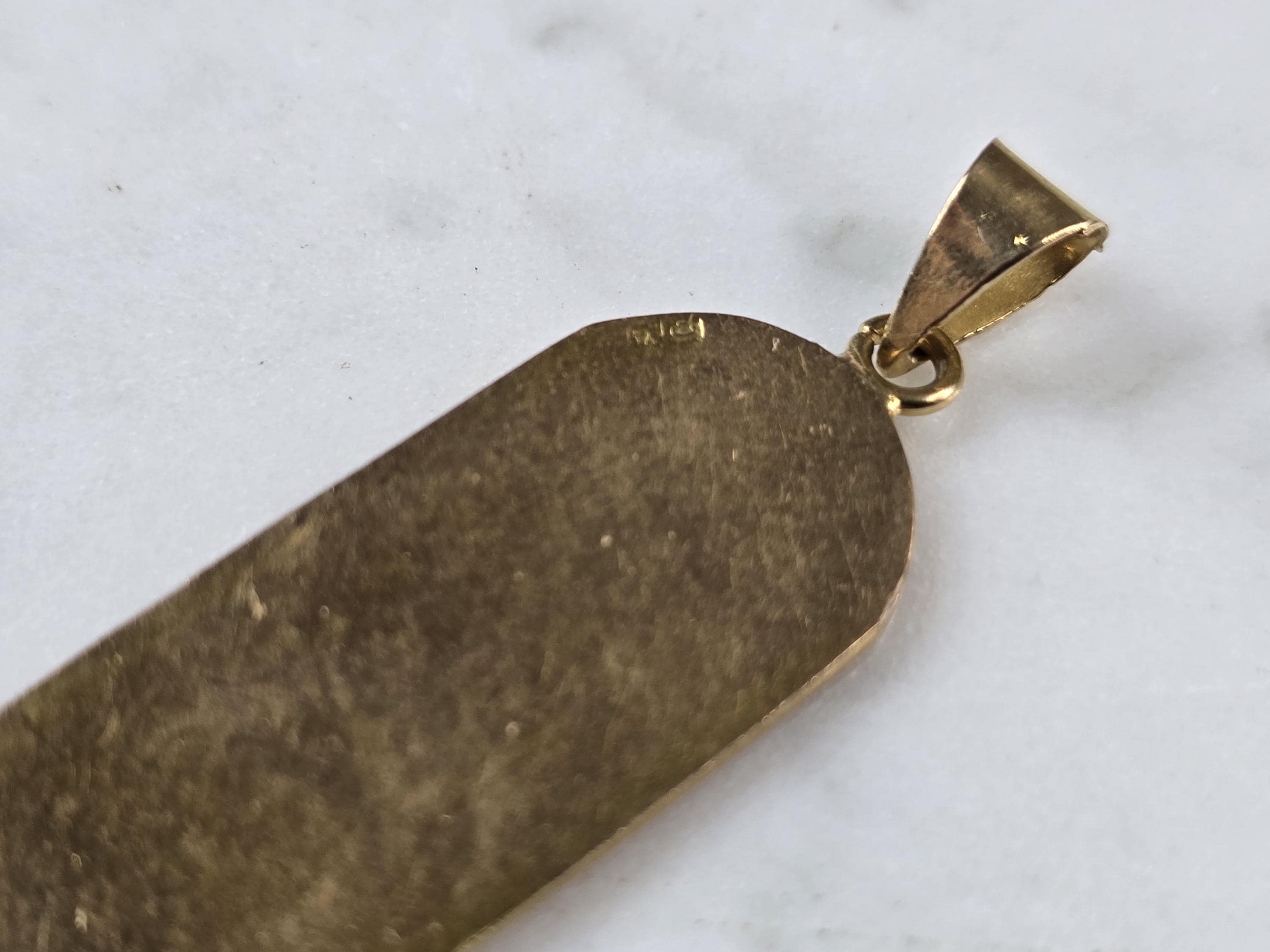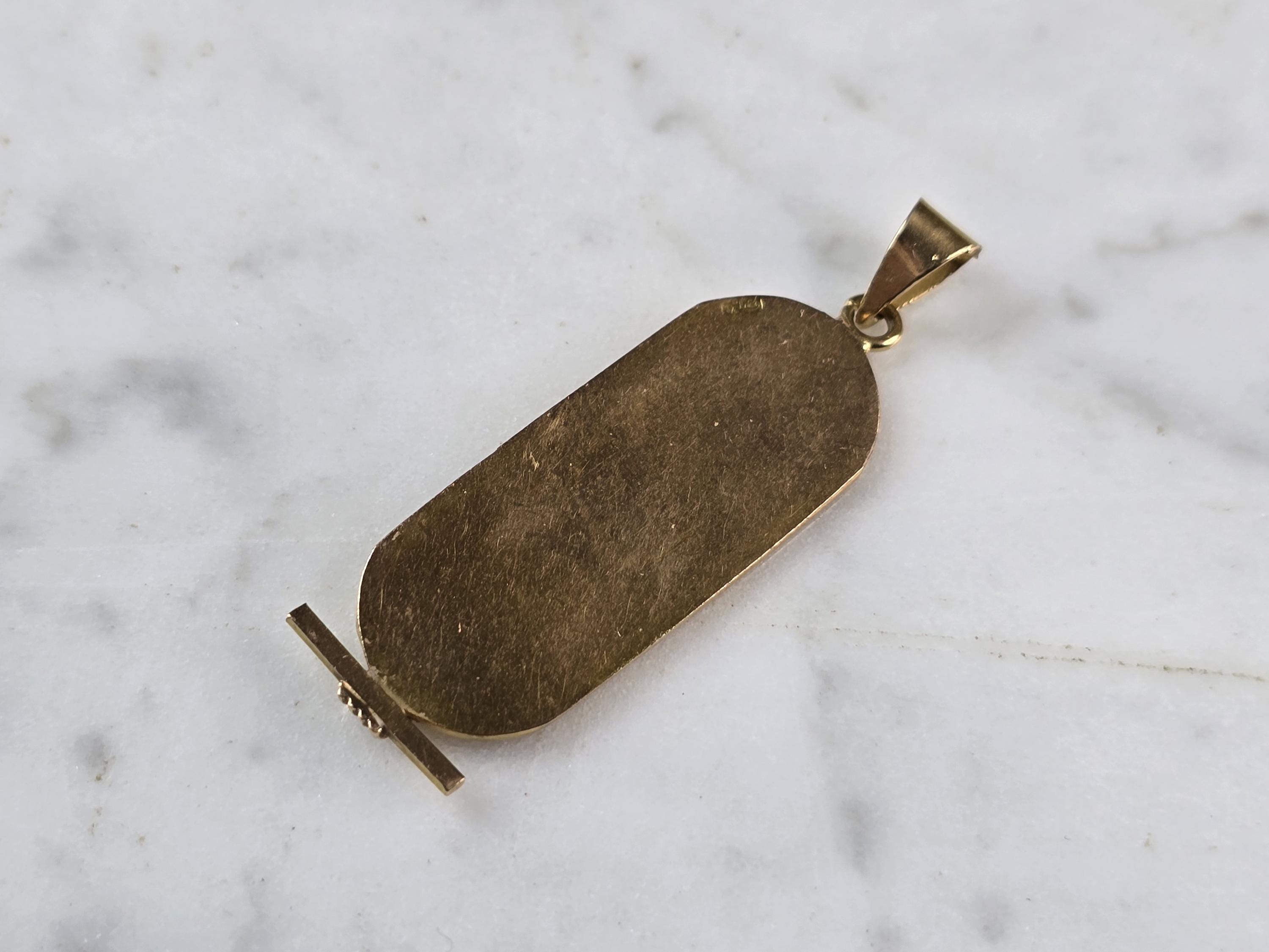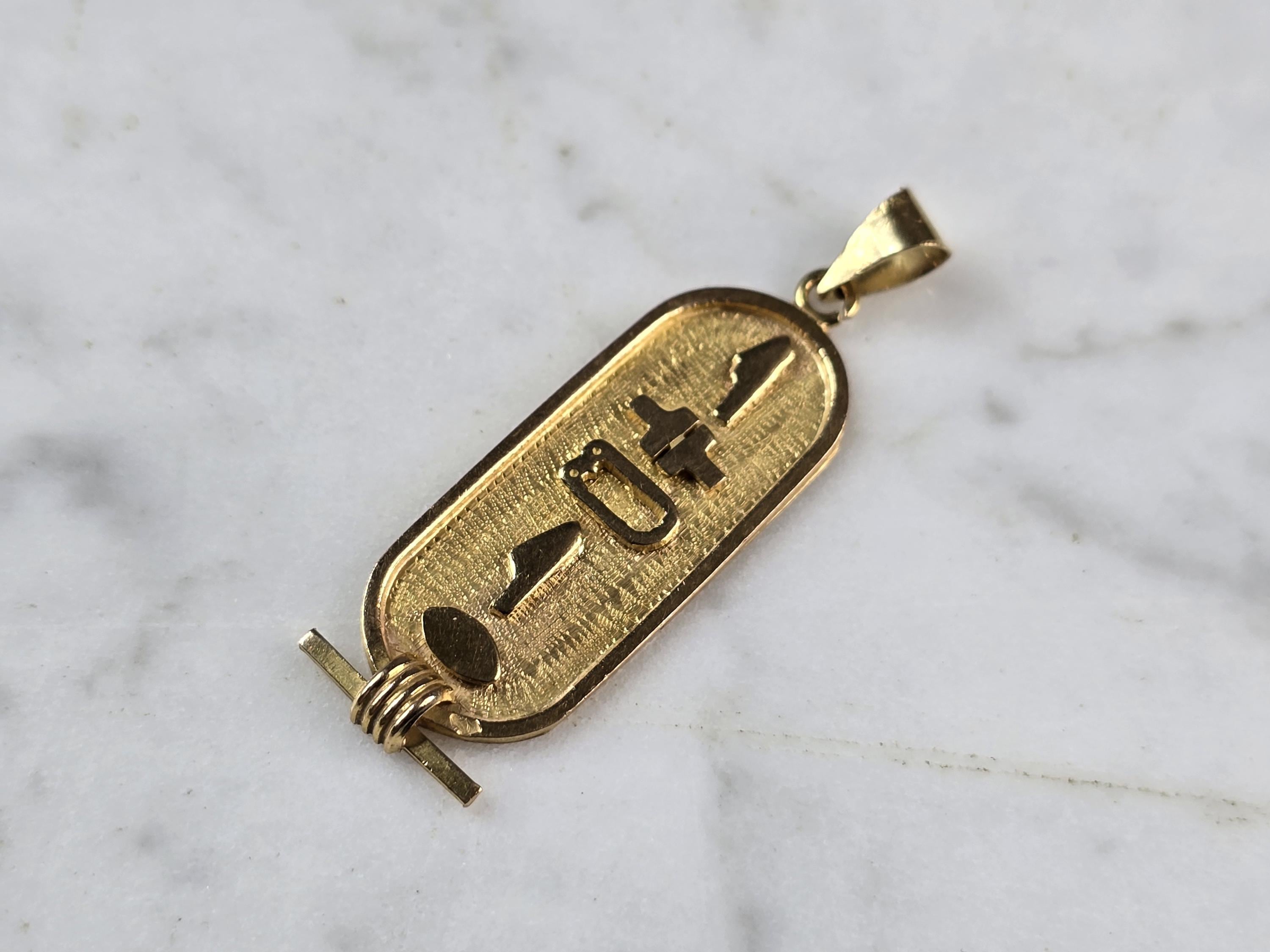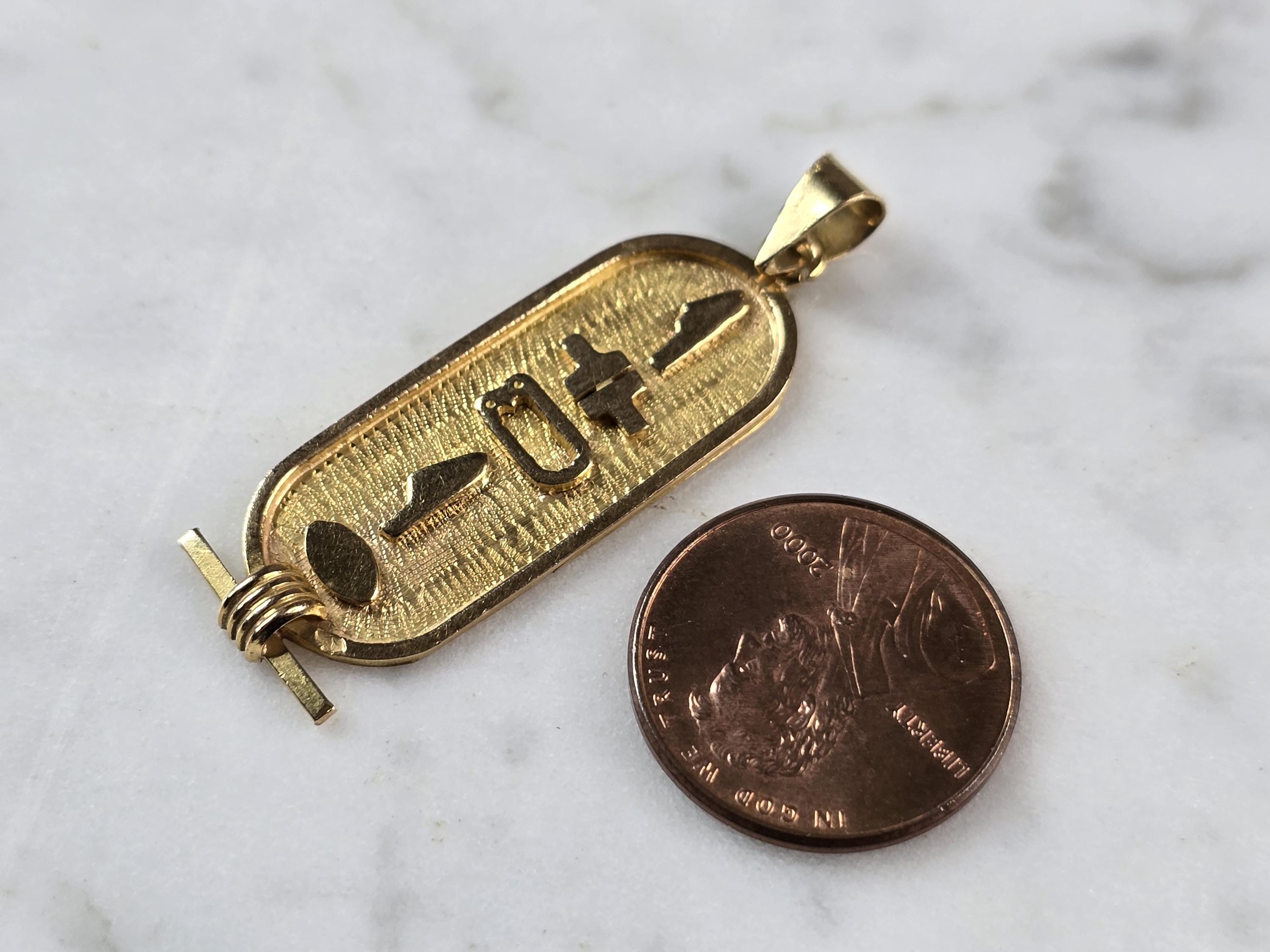 A VINTAGE ESTATE 18K YELLOW GOLD EGYPTIAN HIEROGLYPH PENDANT. THE PENDANT MEASURES 1 5/8" BY 1/2", AND WEIGHS 2.8g. PENDANT HAS A FAINT FOREIGN MARK ON THE BACK TOP CORNER. MAKES A GREAT GIFT FOR THAT SOMEONE SPECIAL. ANY QUESTIONS, PLEASE DO NOT HESITATE TO ASK. BE SURE TO CHECK OUT OUR OTHER ITEMS FOR SALE.