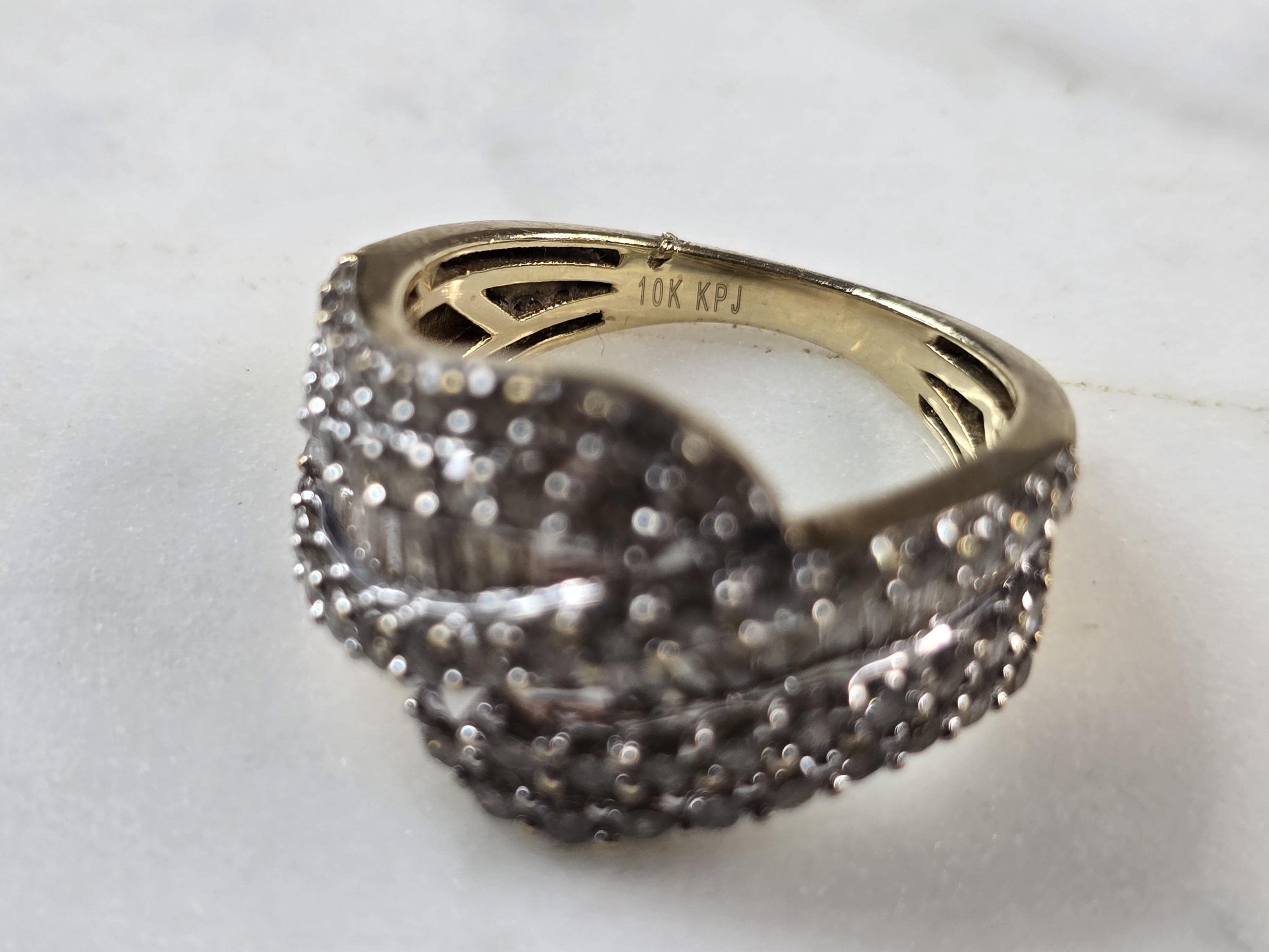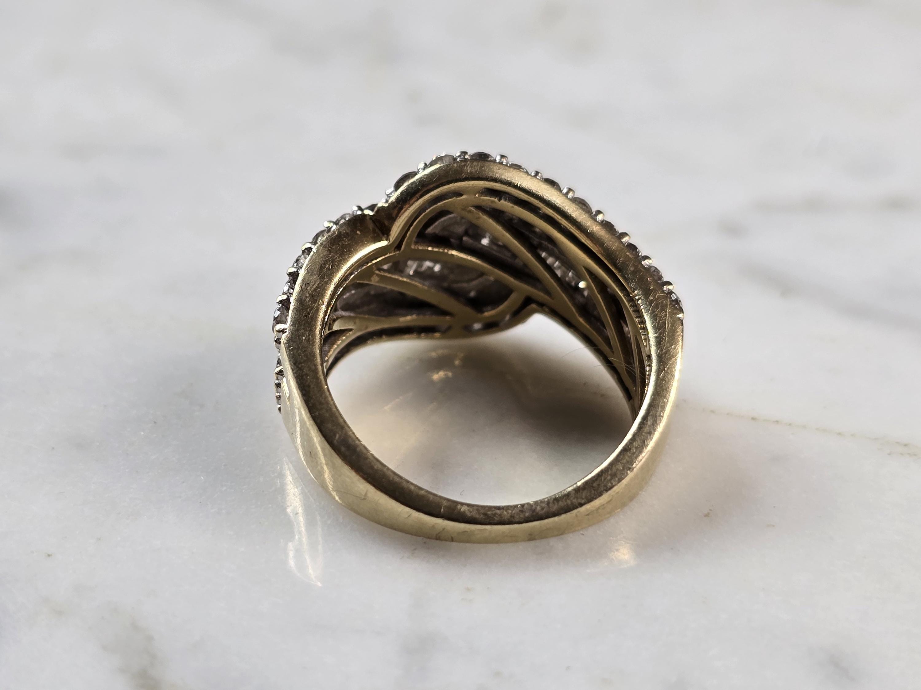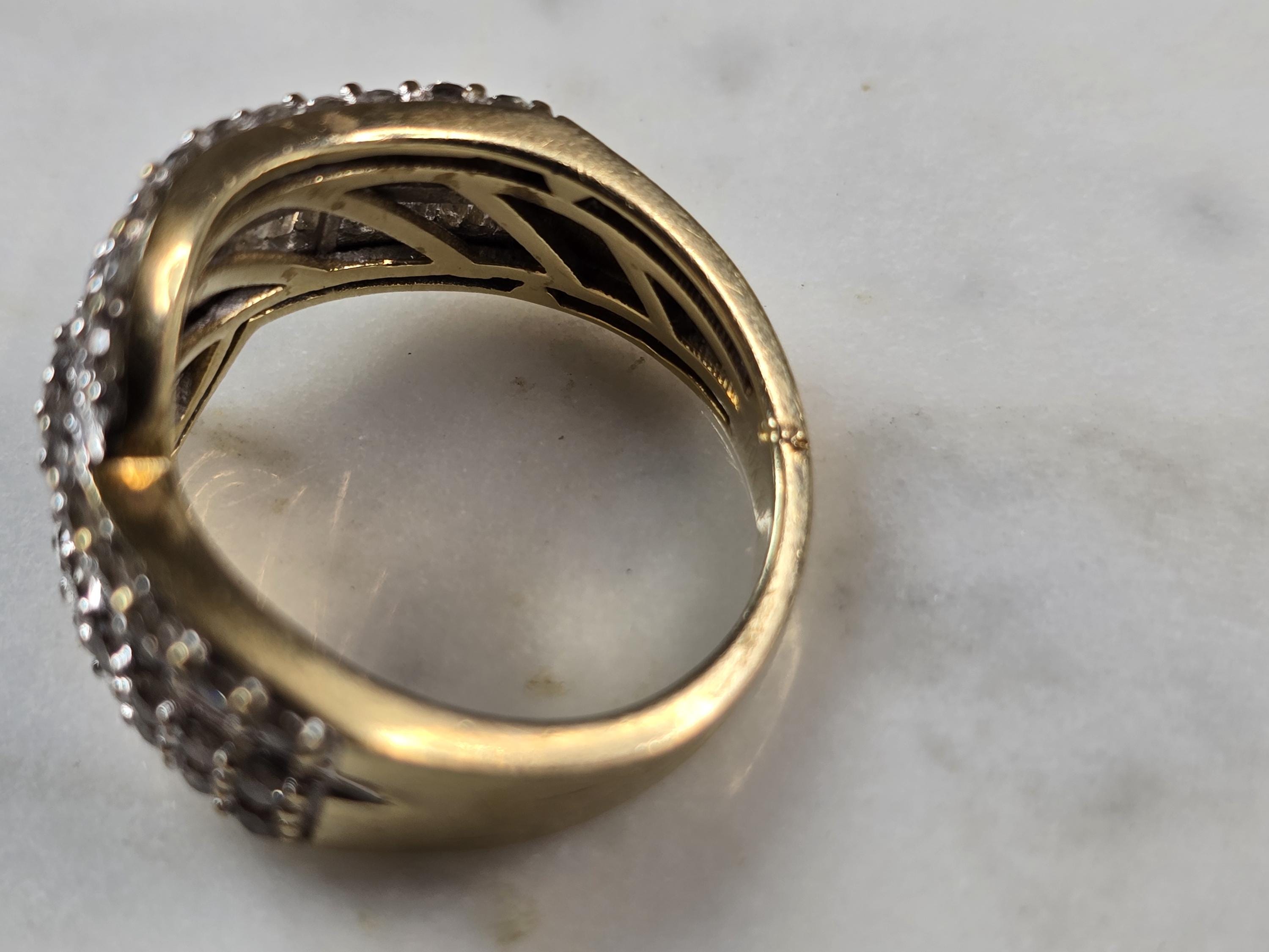A WOMENS VINTAGE ESTATE 10K GOLD DIAMOND RING. THE RING WEIGHS 6.0g AND IS A SIZE 7.0. THERE ARE ABOUT 88 SMALL DIAMONDS. THE WIDTH OF THE RING IS 5/8". RING DOES HAVE A TINY BLEMISH ALONG THE SHANK. BUYING AS IS. ANY QUESTIONS PLEASE DO NOT HESITATE TO ASK. BE SURE TO CHECK OUT SOME OF MY OTHER GREAT ITEMS UP FOR SALE. THANK YOU.
