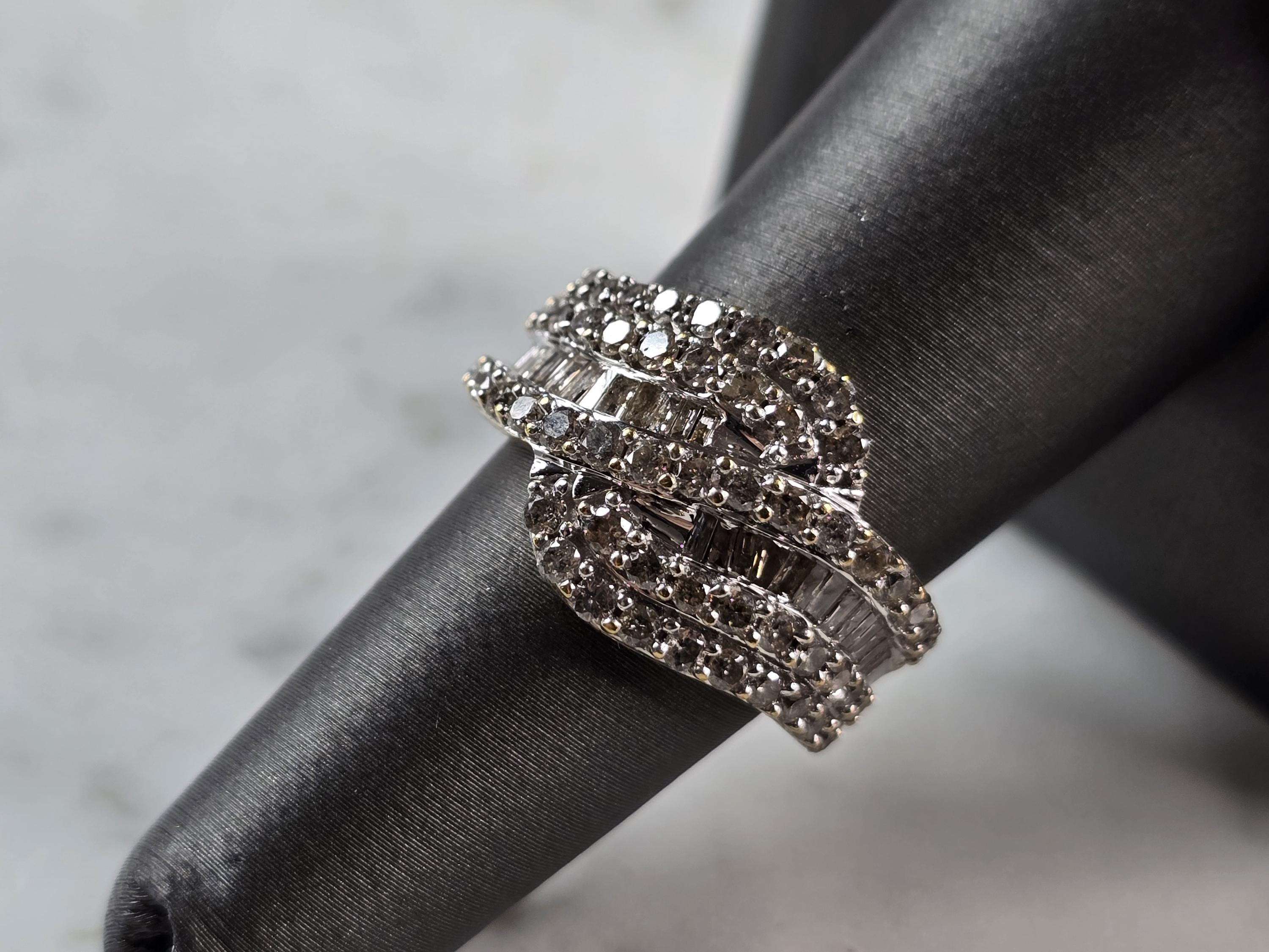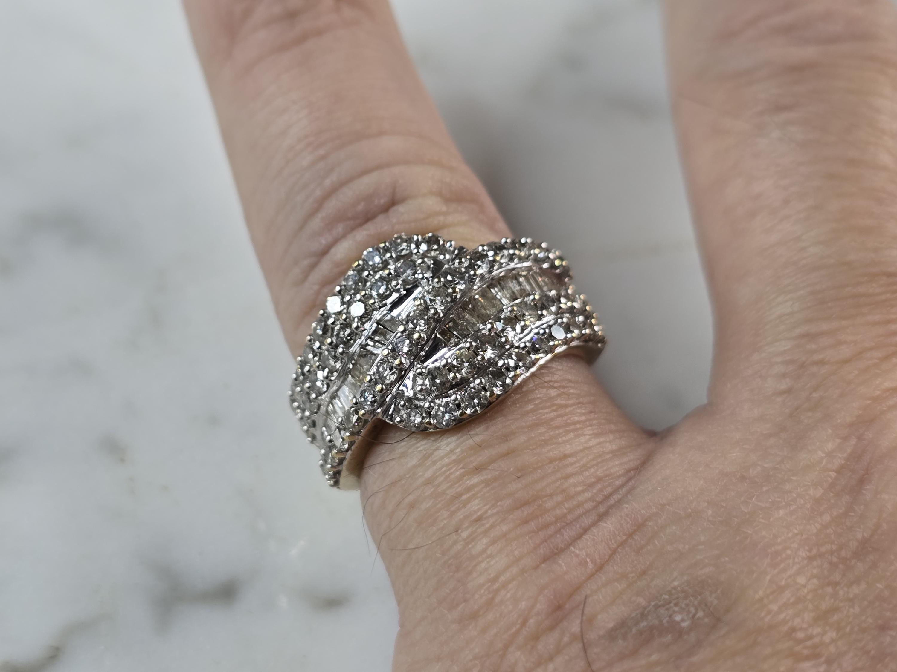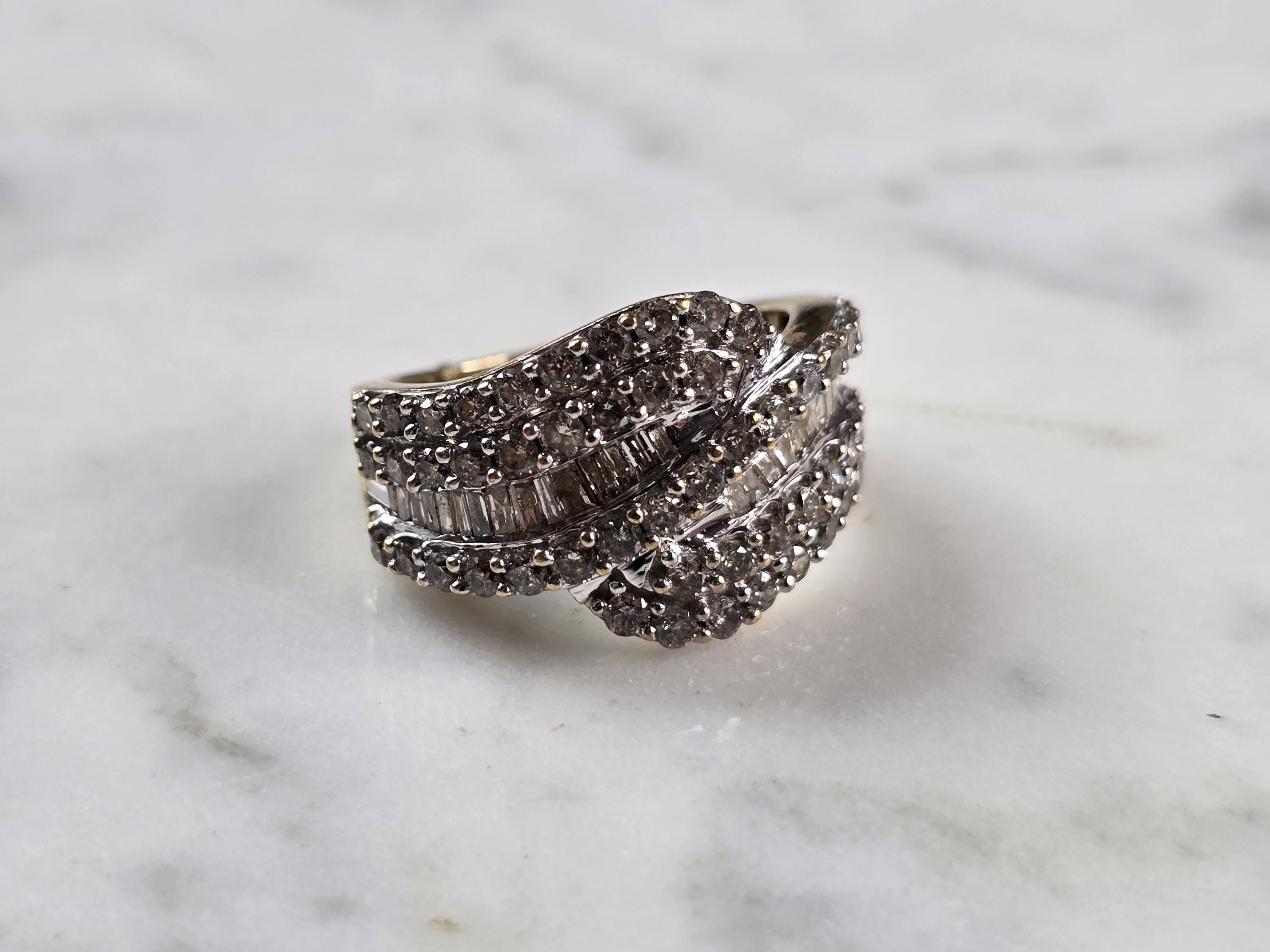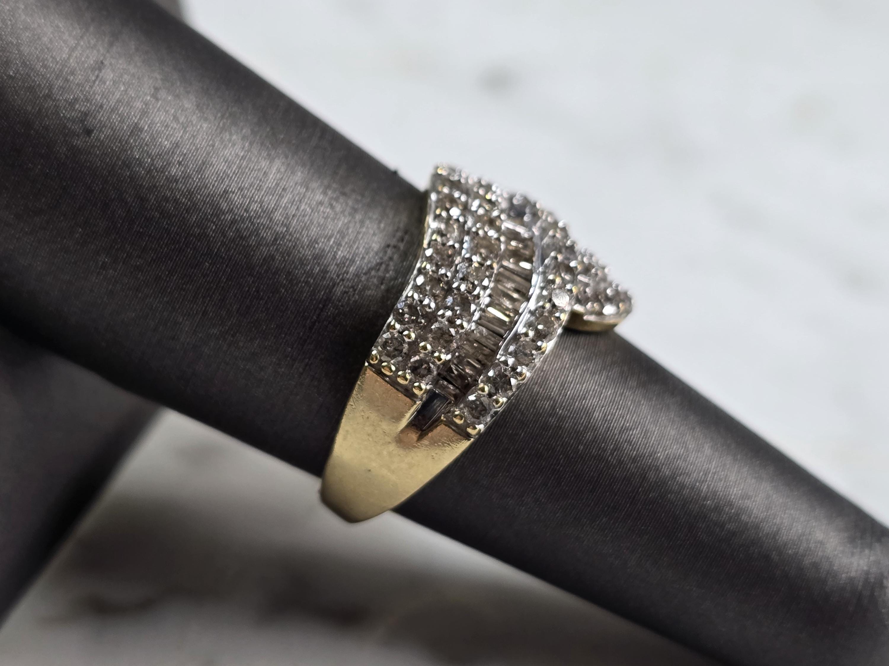 A WOMENS VINTAGE ESTATE 10K GOLD DIAMOND RING. THE RING WEIGHS 6.0g AND IS A SIZE 7.0. THERE ARE ABOUT 88 SMALL DIAMONDS. THE WIDTH OF THE RING IS 5/8". RING DOES HAVE A TINY BLEMISH ALONG THE SHANK. BUYING AS IS. ANY QUESTIONS PLEASE DO NOT HESITATE TO ASK. BE SURE TO CHECK OUT SOME OF MY OTHER GREAT ITEMS UP FOR SALE. THANK YOU.