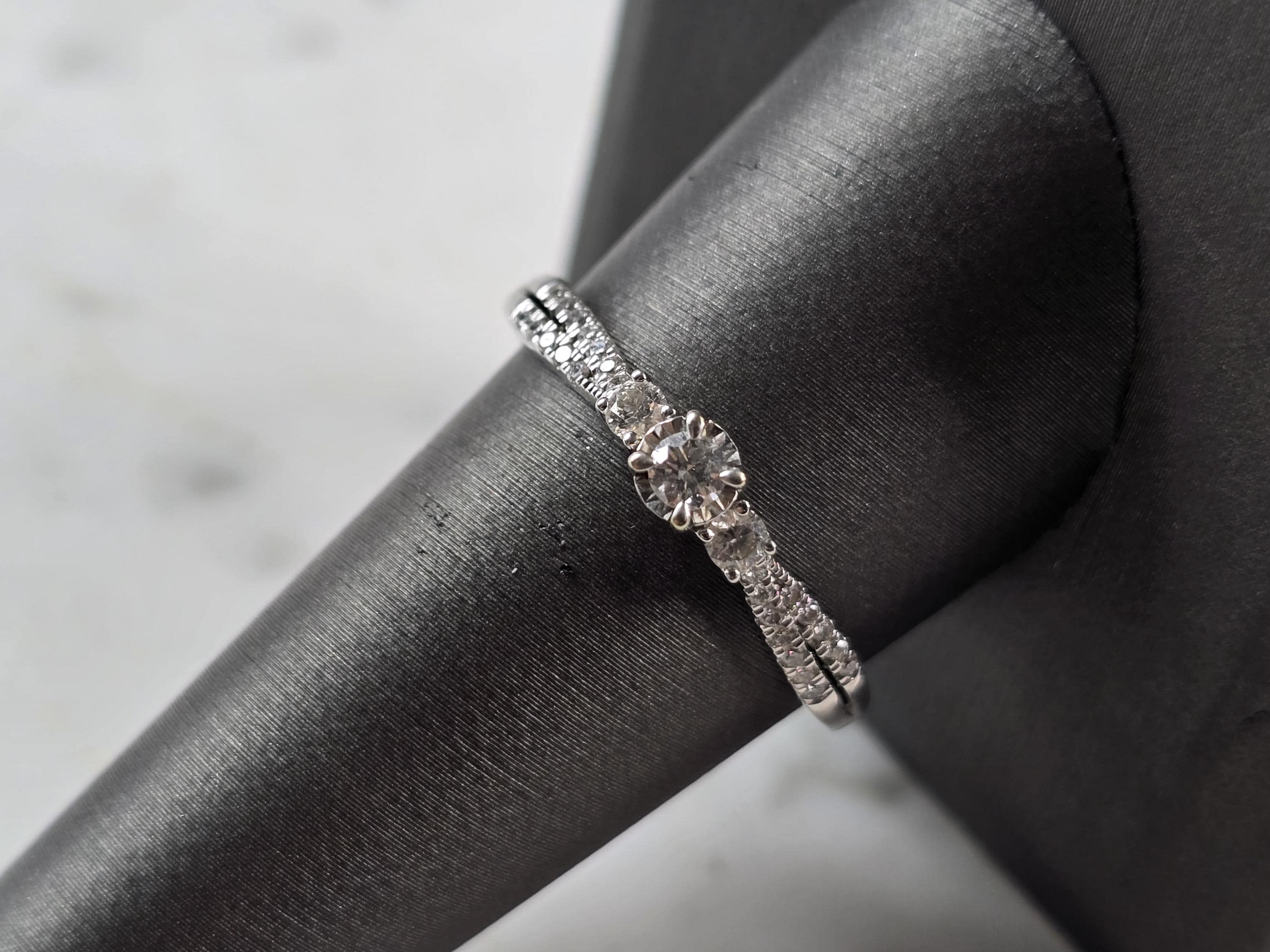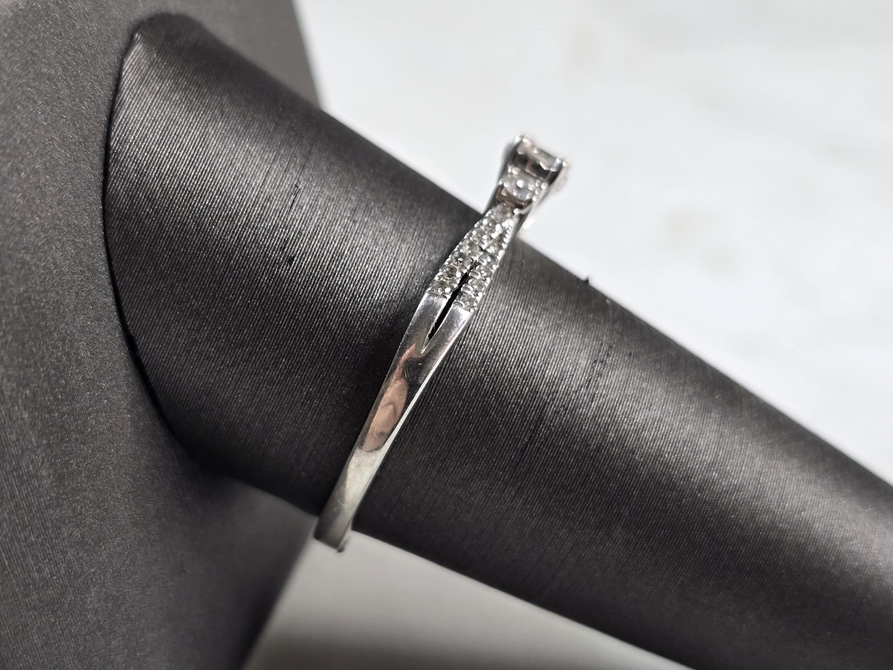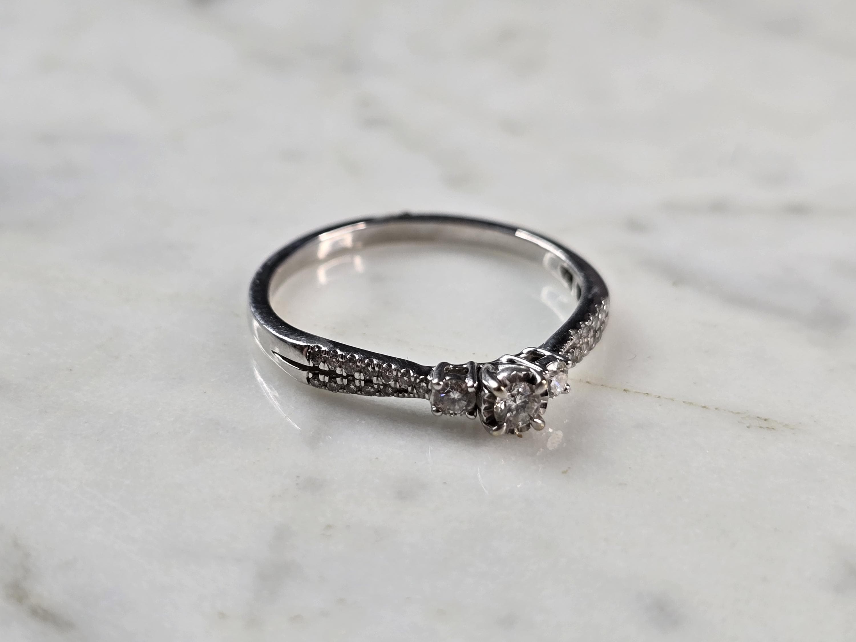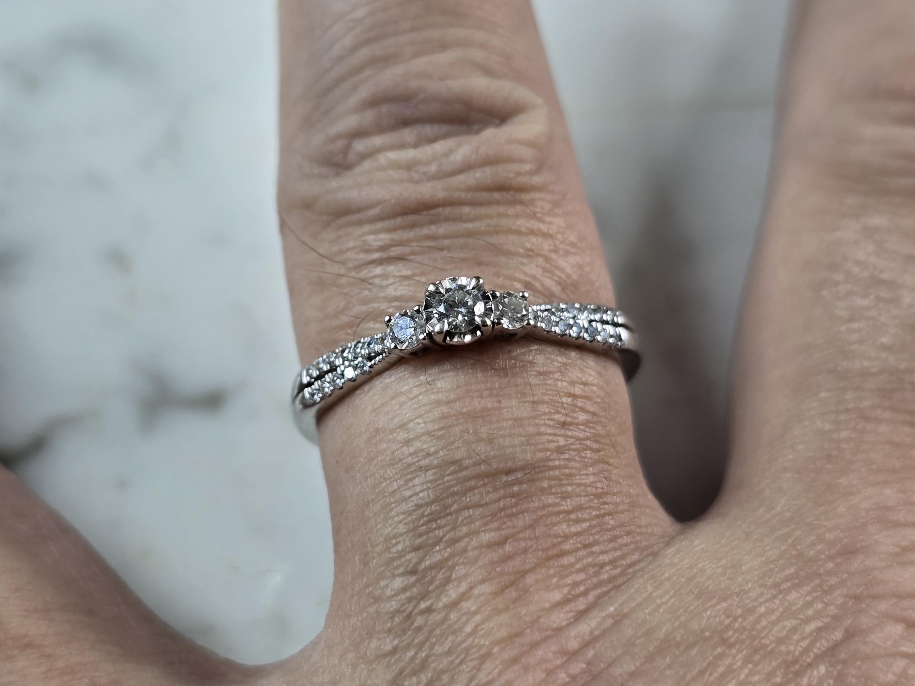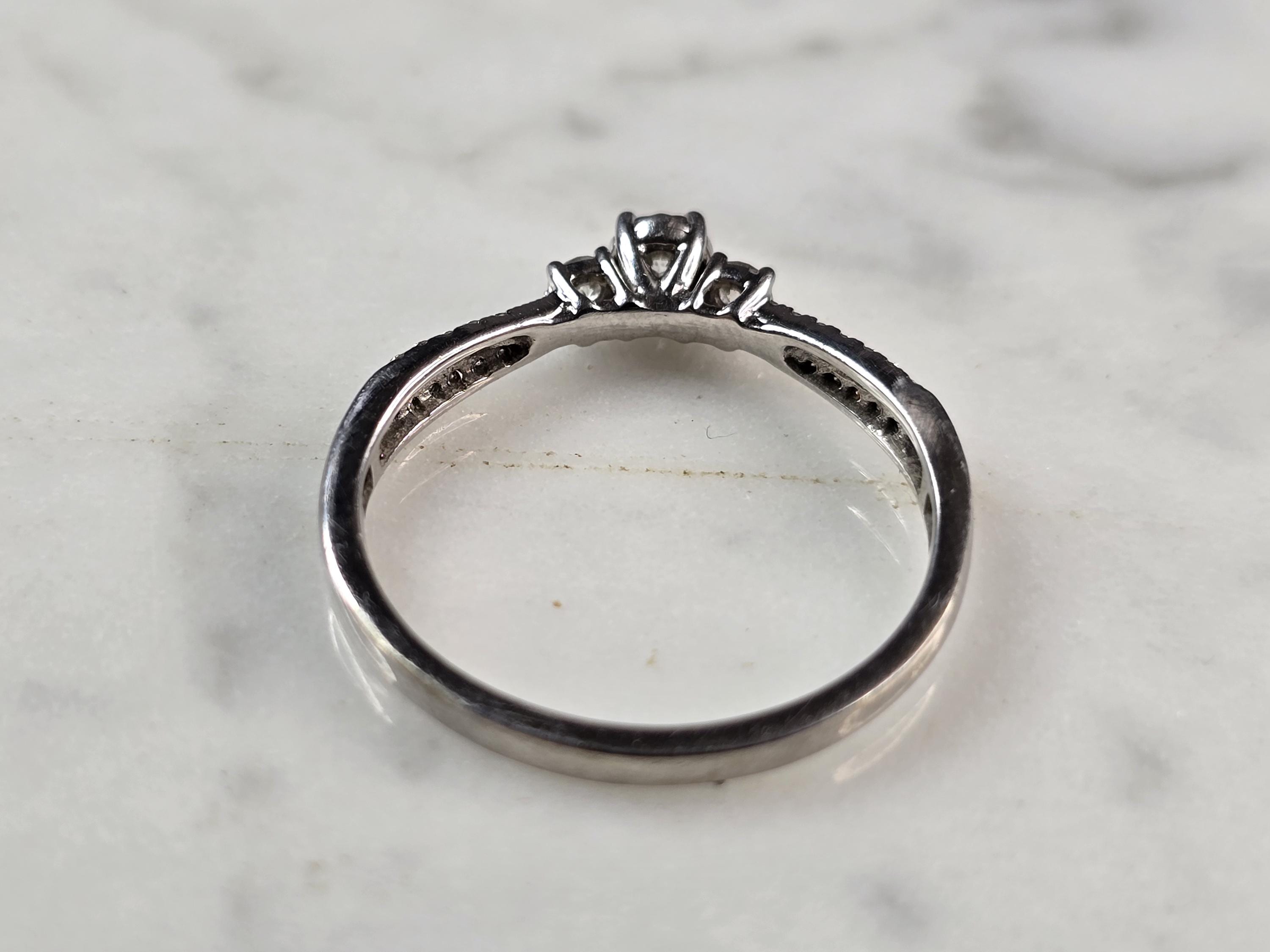 FOR SALE IS THIS VINTAGE ESTATE 10K WHITE GOLD DIAMOND RING. THE RING IS A SIZE 10.0 AND WEIGHS 2.4g. THE CENTER DIAMOND IS ABOUT .07cts, WITH TWO .05cts FLANKING IT AND ANOTHER 28 TINY ACCENT DIAMONDS. RING IS NOT MARKED BUT IT HAS BEEN TESTED. THE RING MAKES A BEAUTIFUL GIFT FOR THAT SOMEONE SPECIAL. ANY QUESTIONS, PLEASE ASK. BE SURE TO CHECK OUT SOME OF MY OTHER GREAT ITEMS UP FOR SALE. THANK YOU