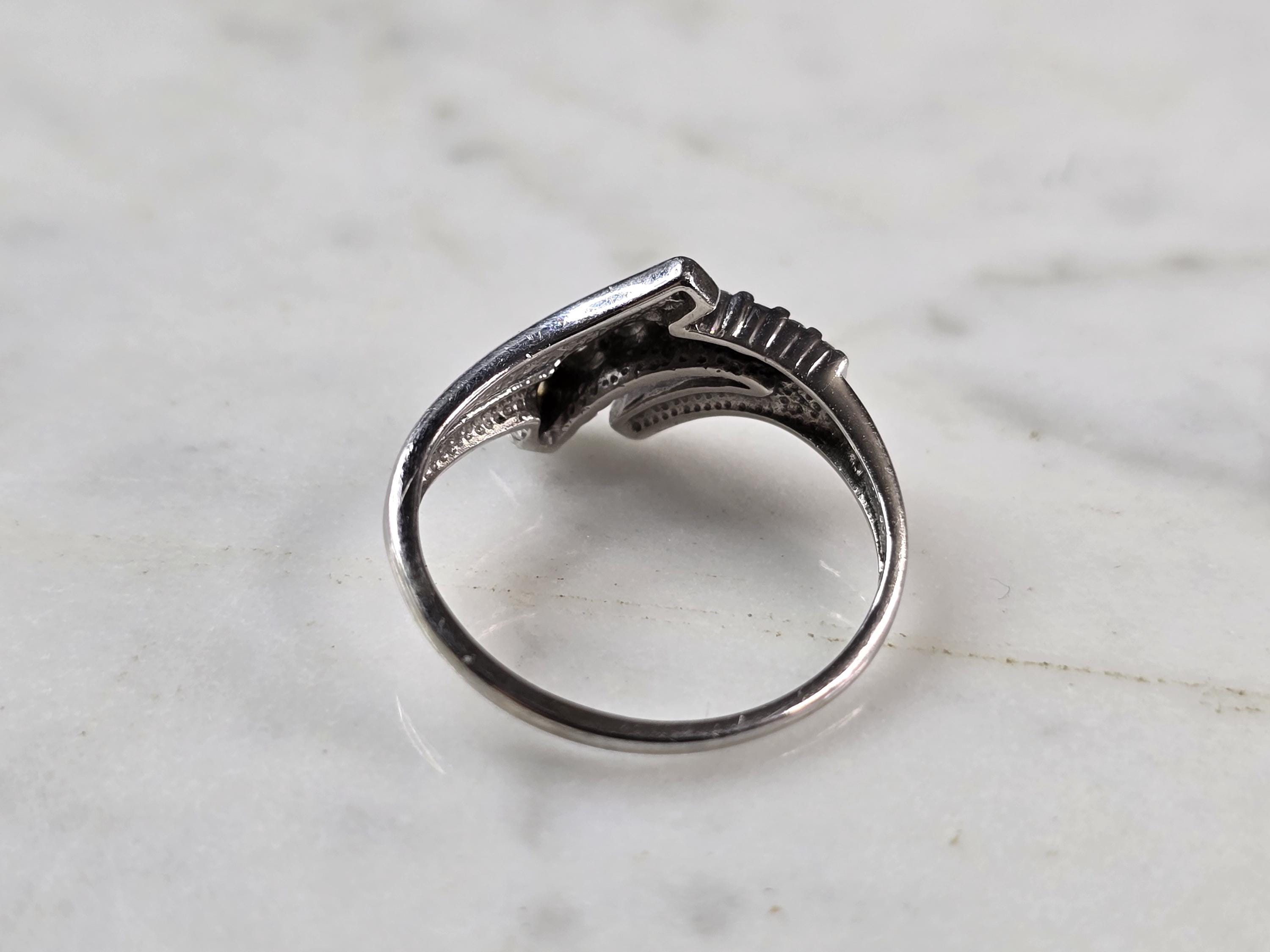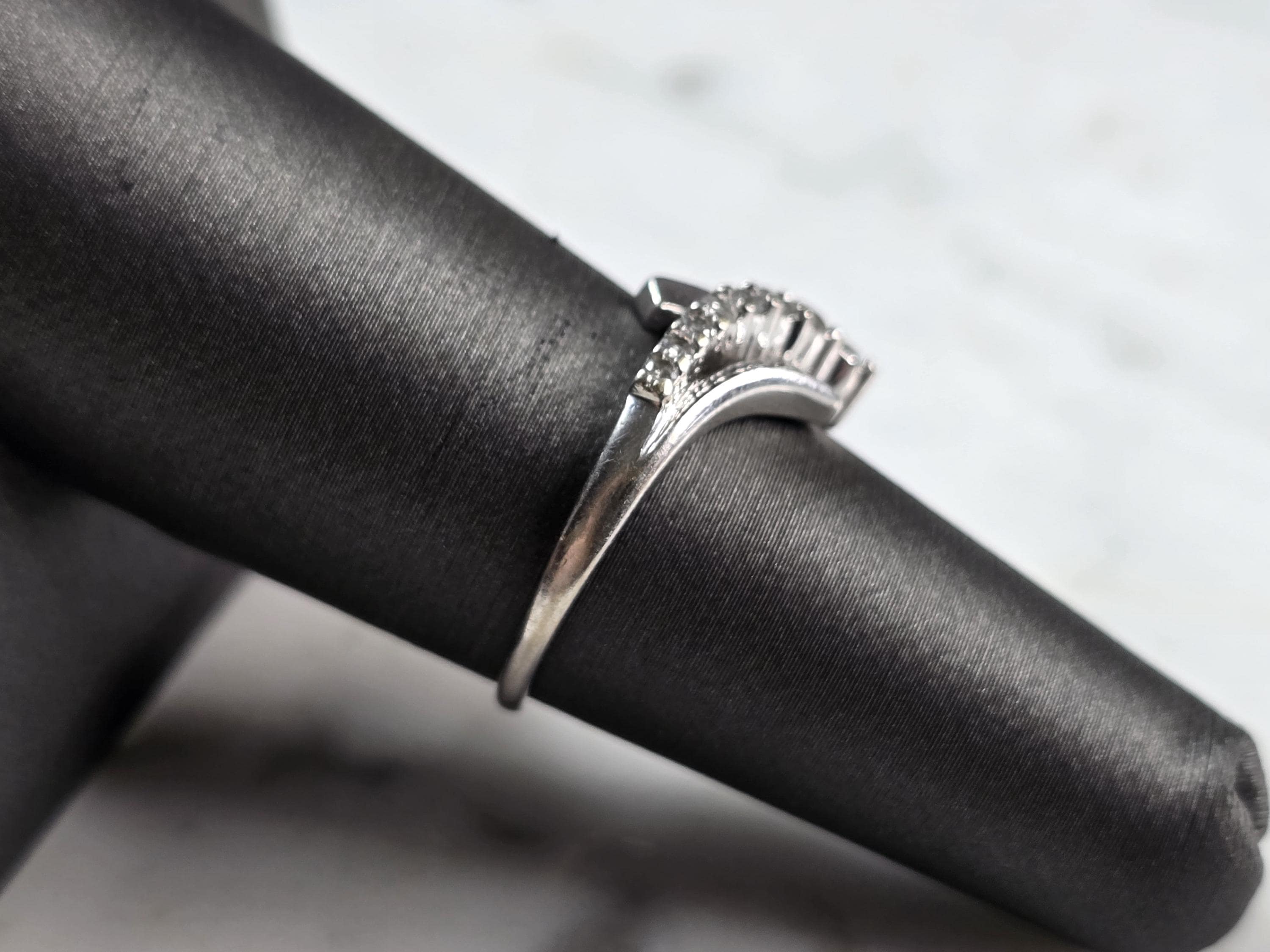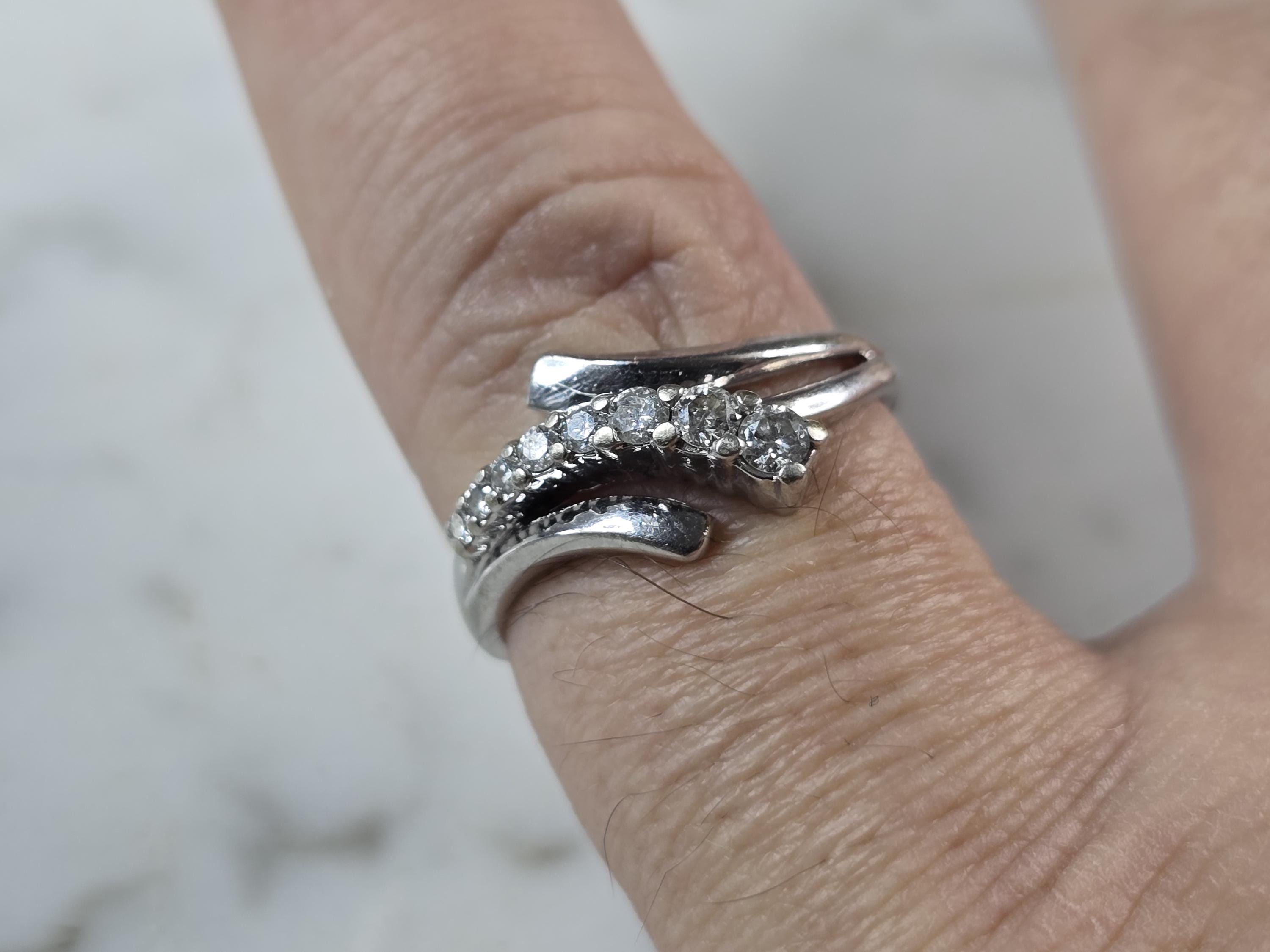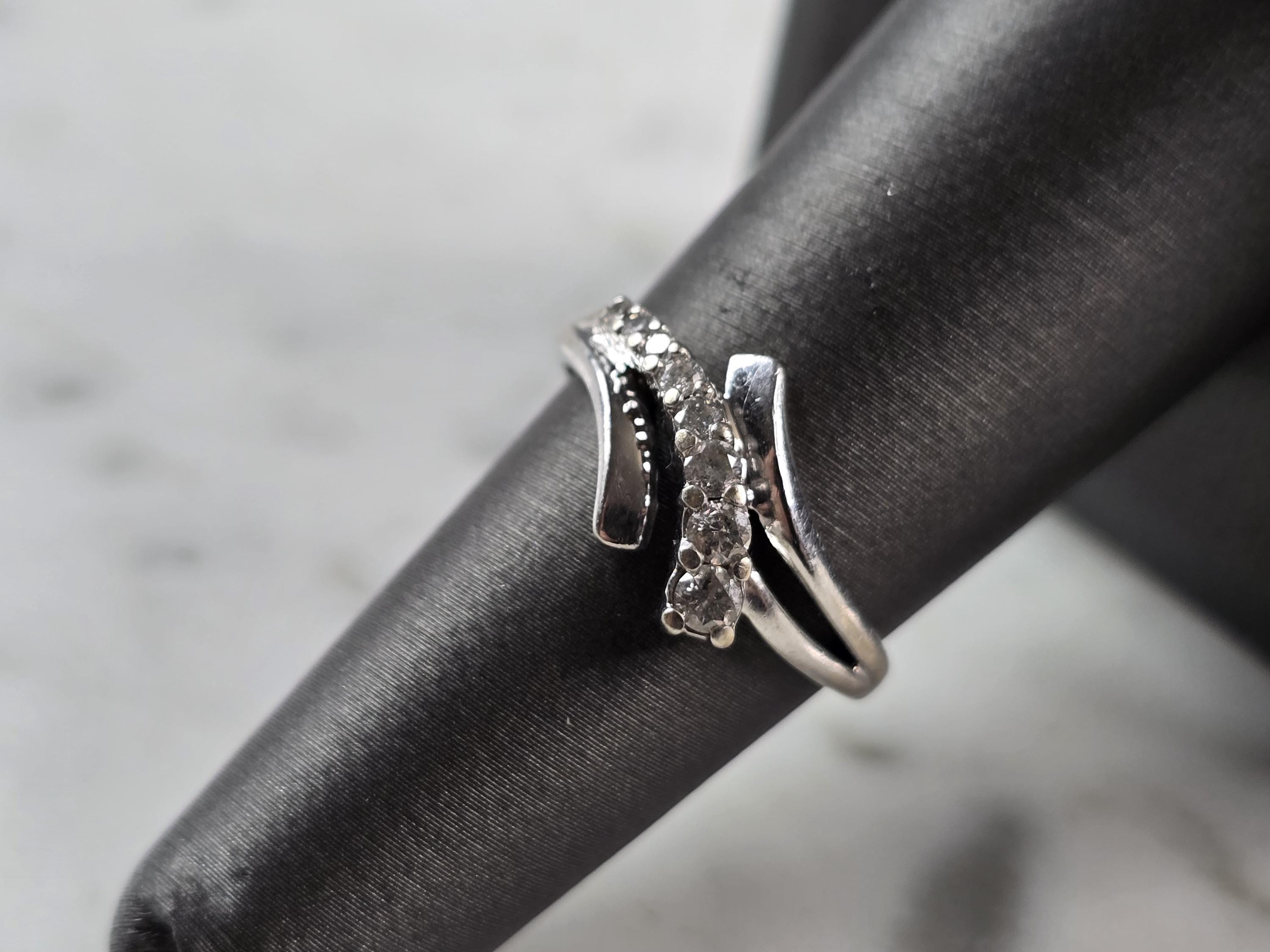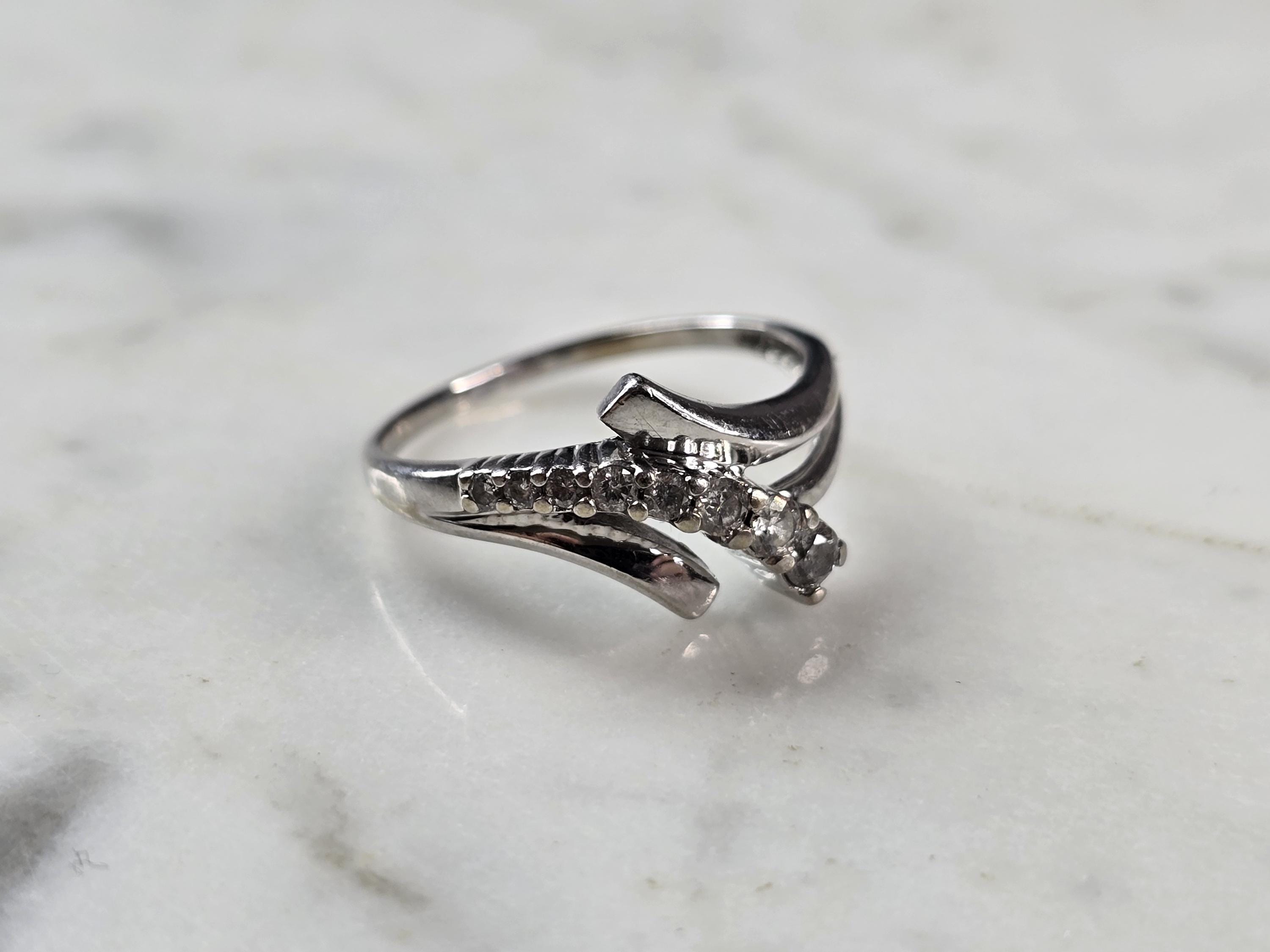 FOR SALE IS THIS VINTAGE ESTATE 10K WHITE GOLD MODERNIST DIAMOND RING. THE RING IS A SIZE 7.0 AND WEIGHS 2.3g. THE WDITH OF THE RING IS 3/8". THERE ARE 8 TINY GRADUATED DIAMONDS. THE RING MAKES A BEAUTIFUL GIFT FOR THAT SOMEONE SPECIAL. ANY QUESTIONS, PLEASE ASK. BE SURE TO CHECK OUT SOME OF MY OTHER GREAT ITEMS UP FOR SALE. THANK YOU