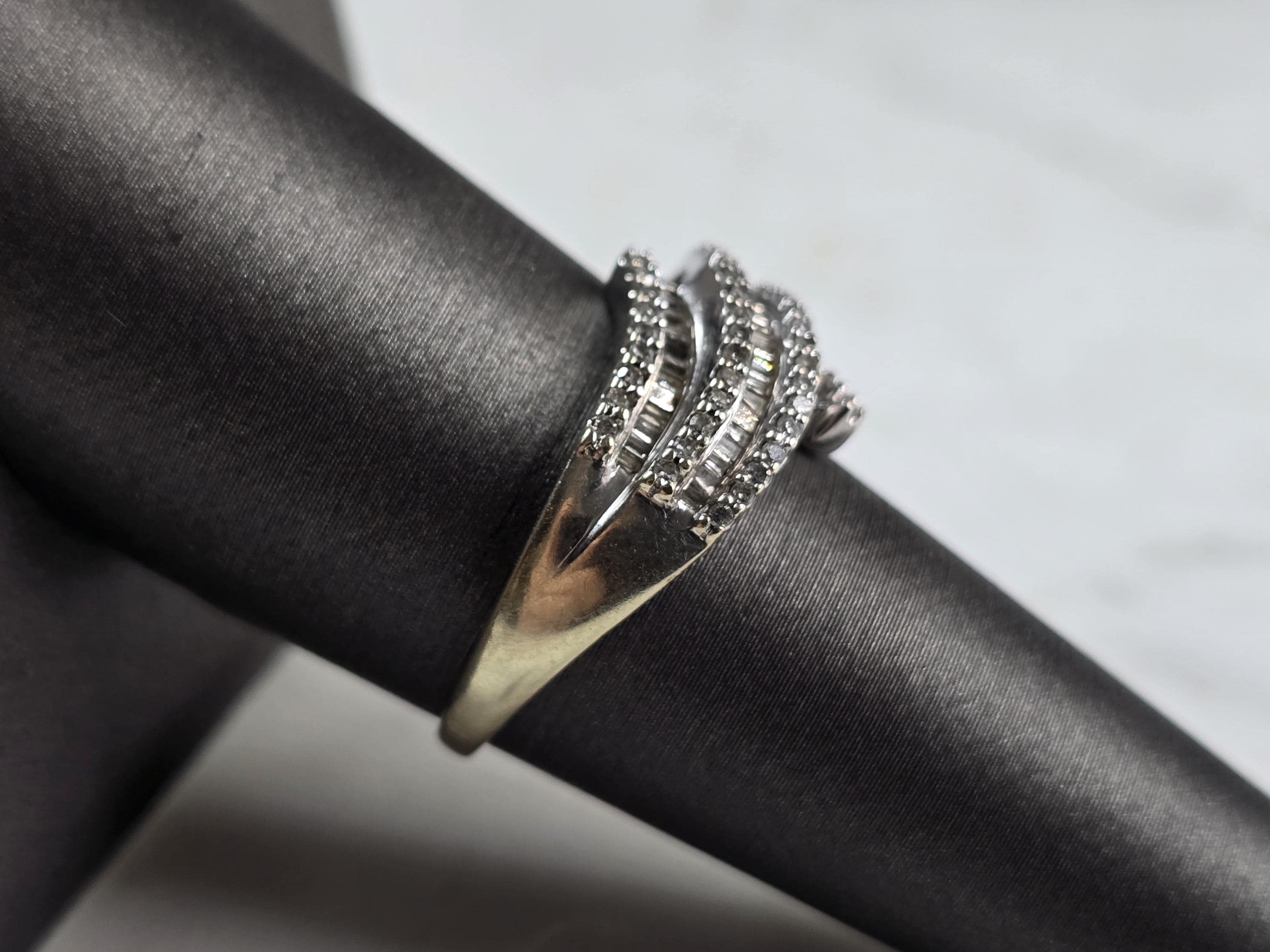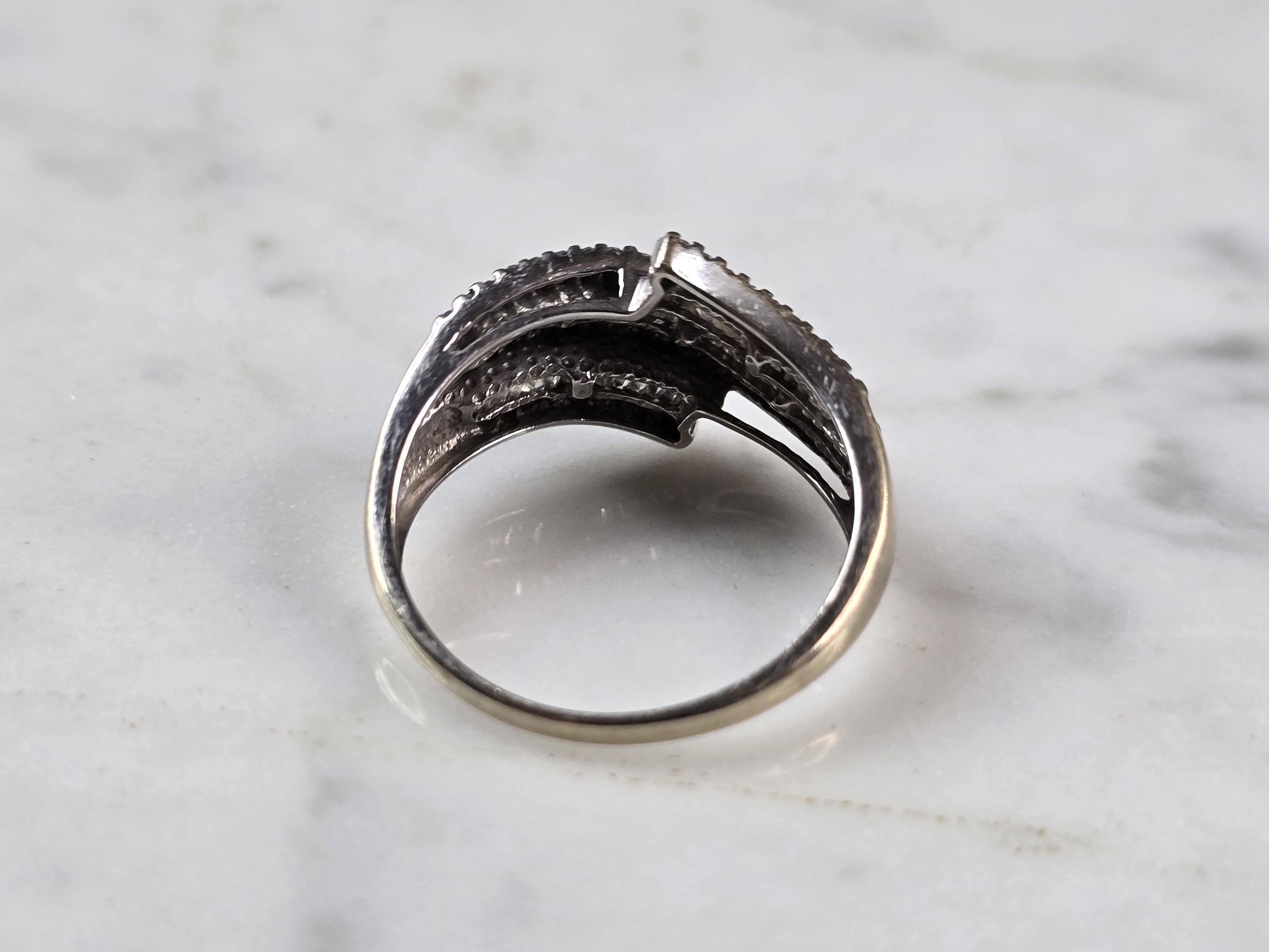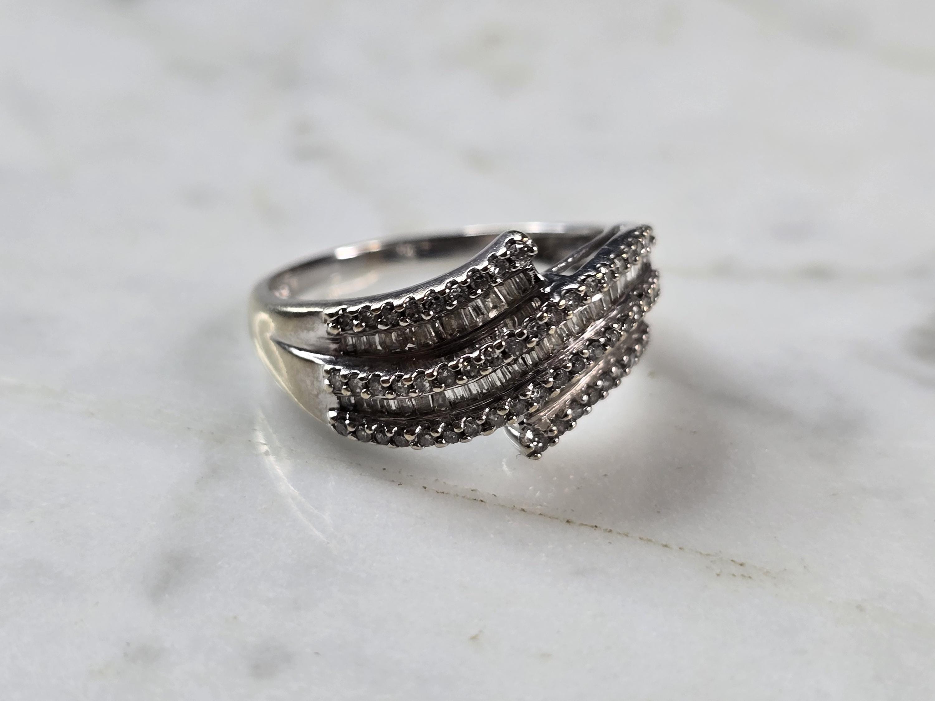 A WOMENS VINTAGE ESTATE 10K WHITE GOLD DIAMOND RING. THE RING WEIGHS 3.2g AND IS A SIZE 8.0. THERE ARE ABOUT 35 SMALL DIAMONDS. THE WIDTH OF THE RING IS 1/2". ANY QUESTIONS PLEASE DO NOT HESITATE TO ASK. BE SURE TO CHECK OUT SOME OF MY OTHER GREAT ITEMS UP FOR SALE. THANK YOU.