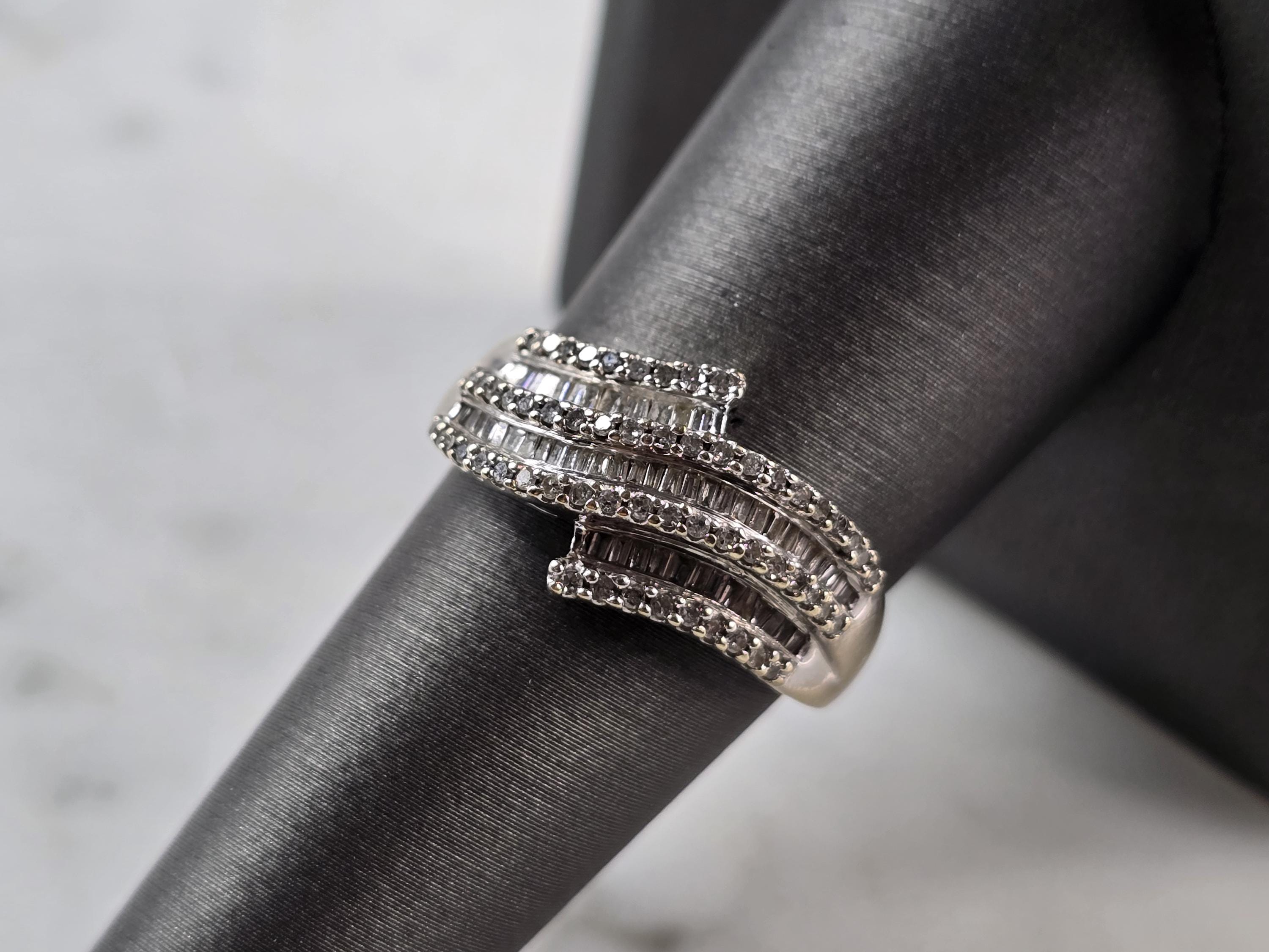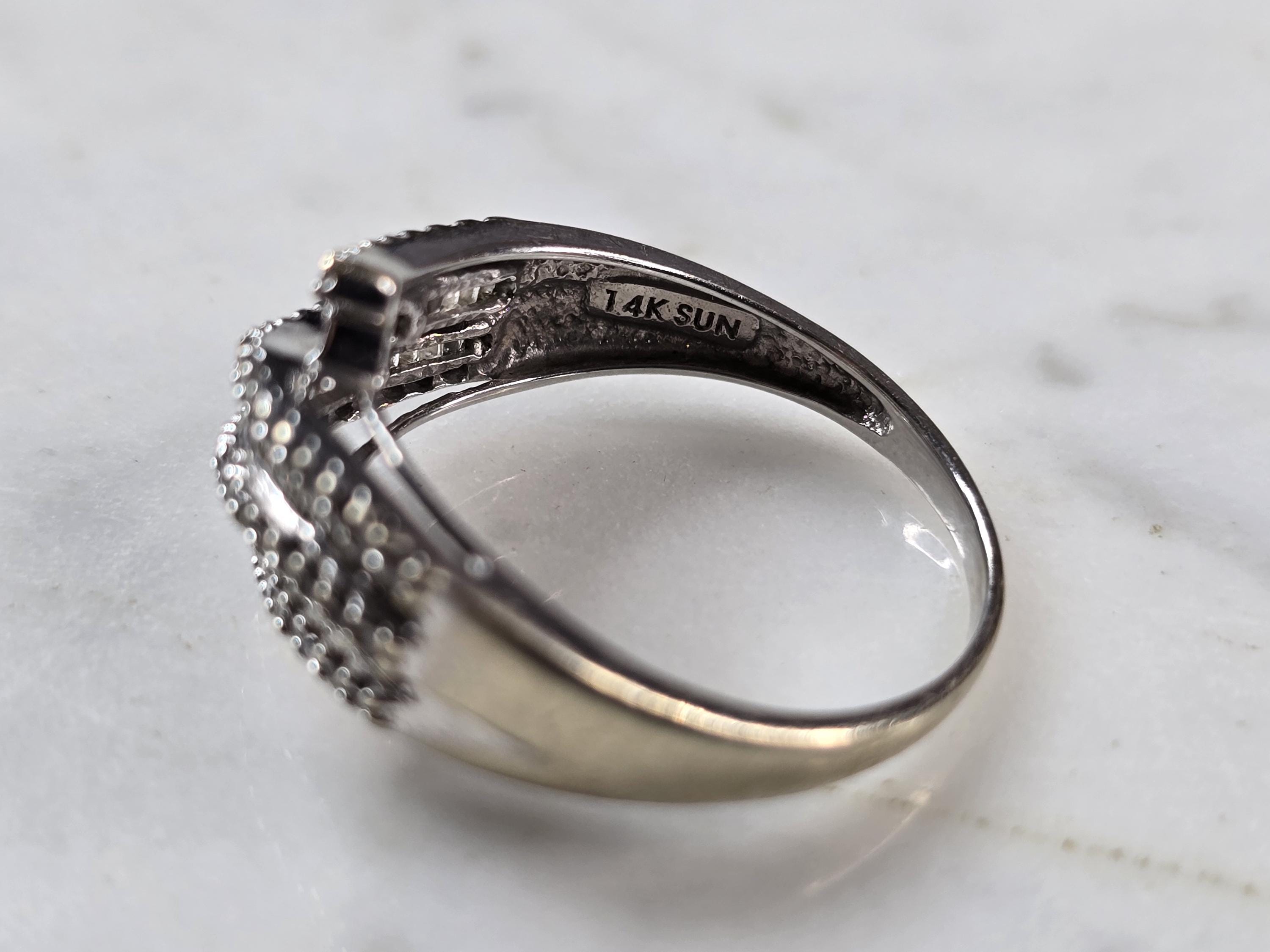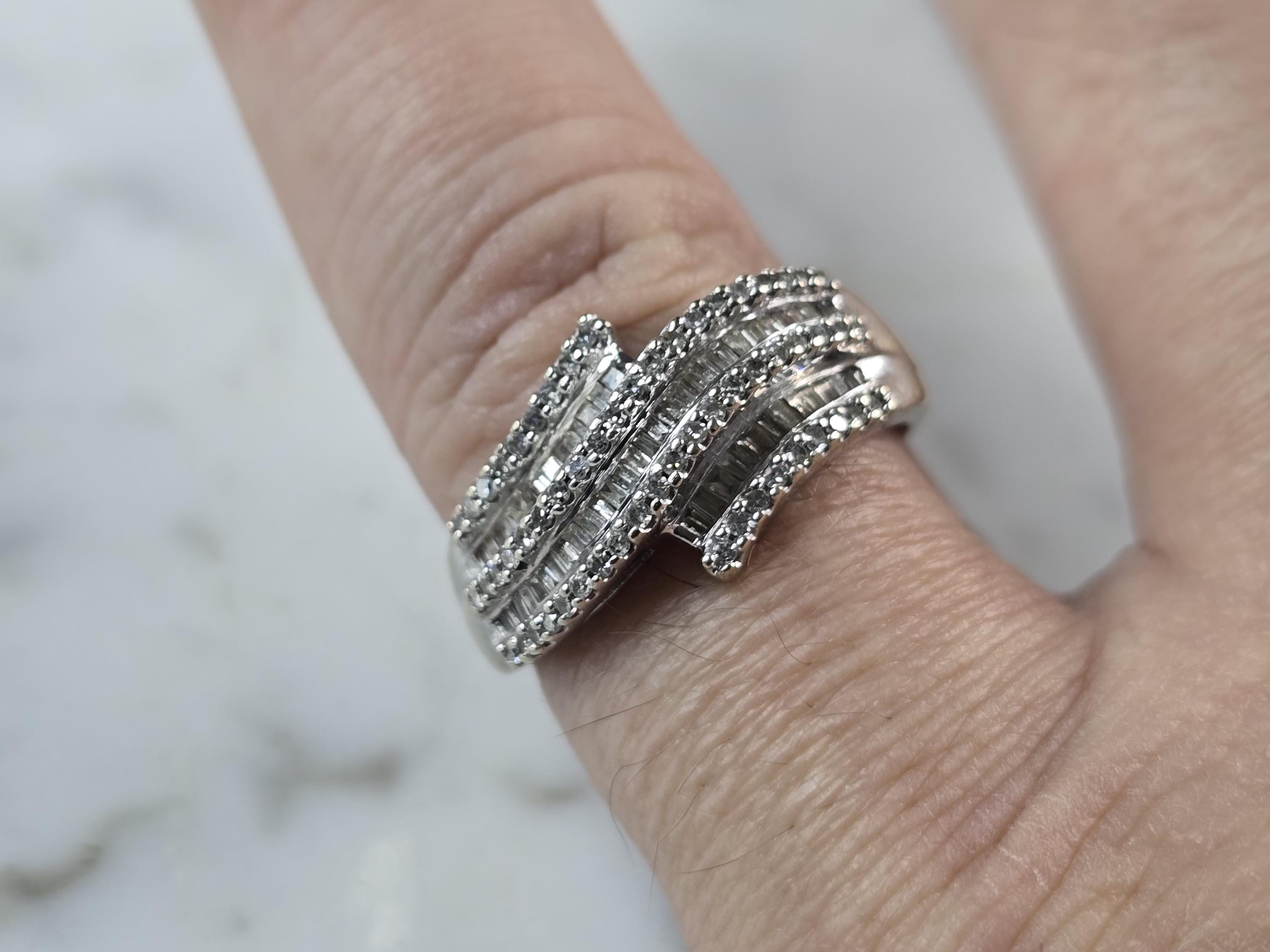 A WOMENS VINTAGE ESTATE 10K WHITE GOLD DIAMOND RING. THE RING WEIGHS 3.2g AND IS A SIZE 8.0. THERE ARE ABOUT 35 SMALL DIAMONDS. THE WIDTH OF THE RING IS 1/2". ANY QUESTIONS PLEASE DO NOT HESITATE TO ASK. BE SURE TO CHECK OUT SOME OF MY OTHER GREAT ITEMS UP FOR SALE. THANK YOU.