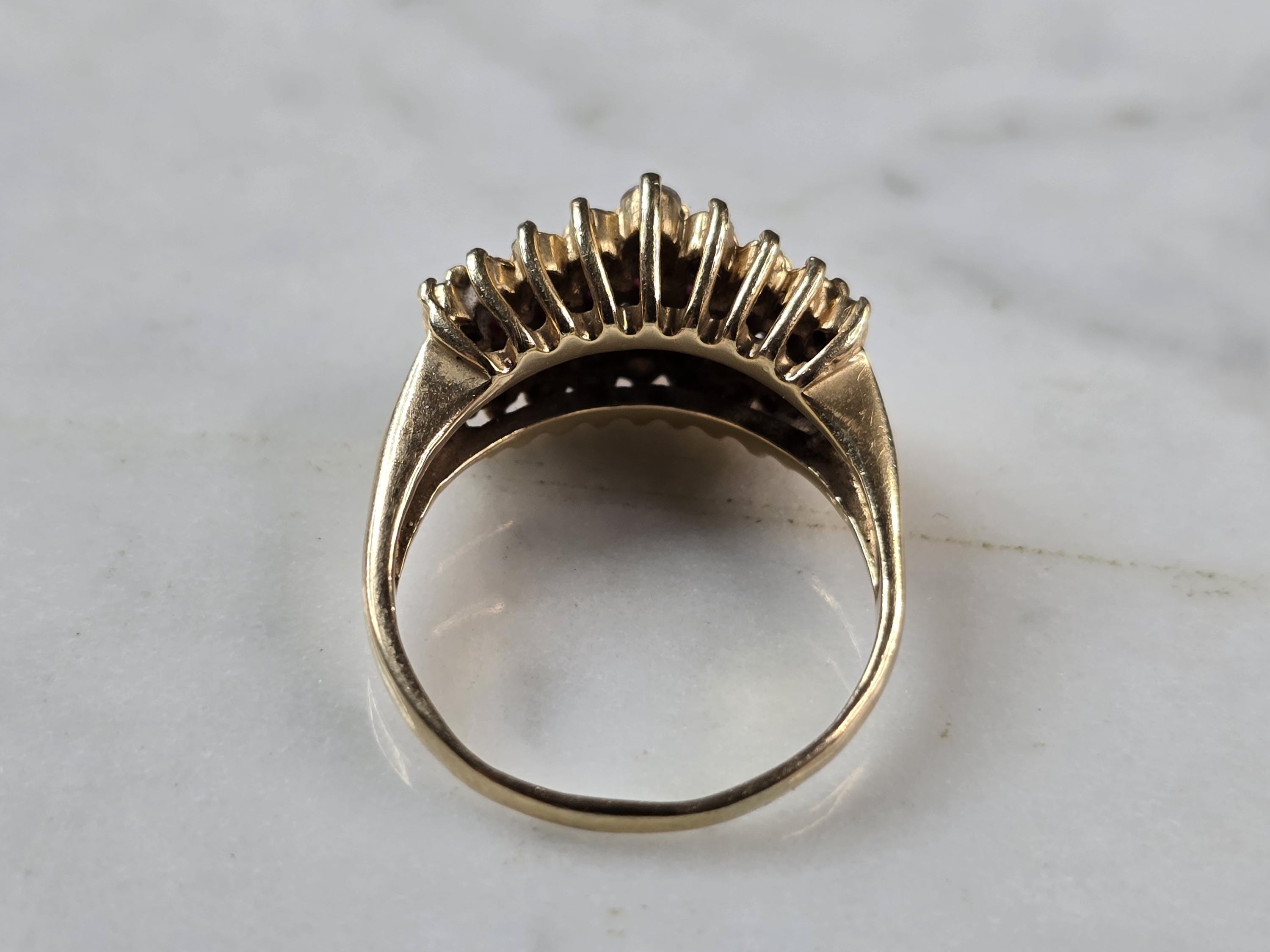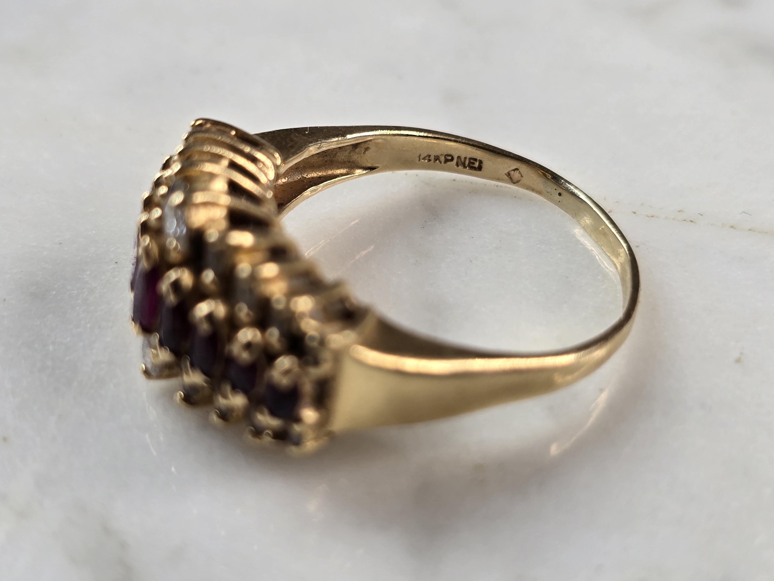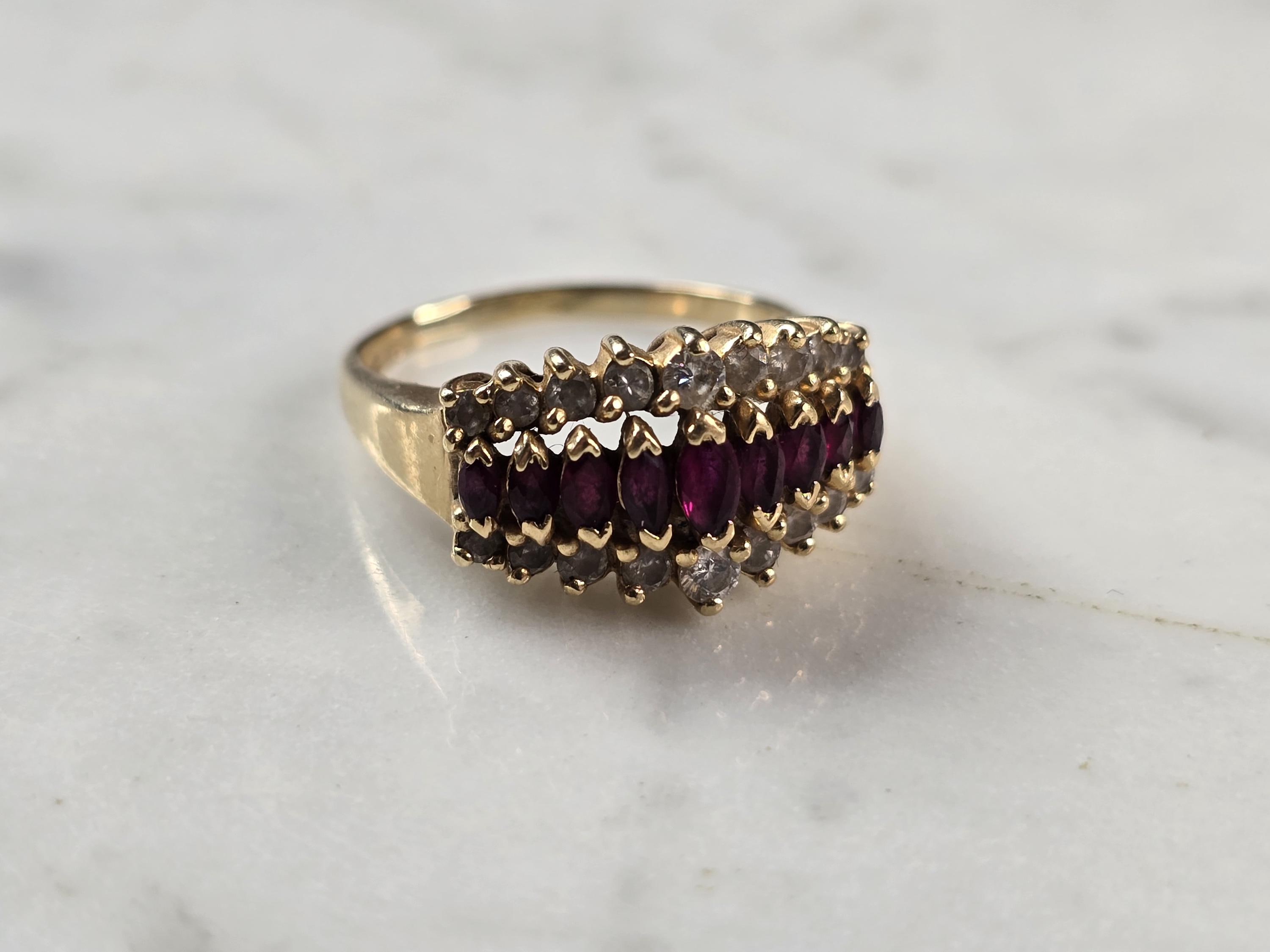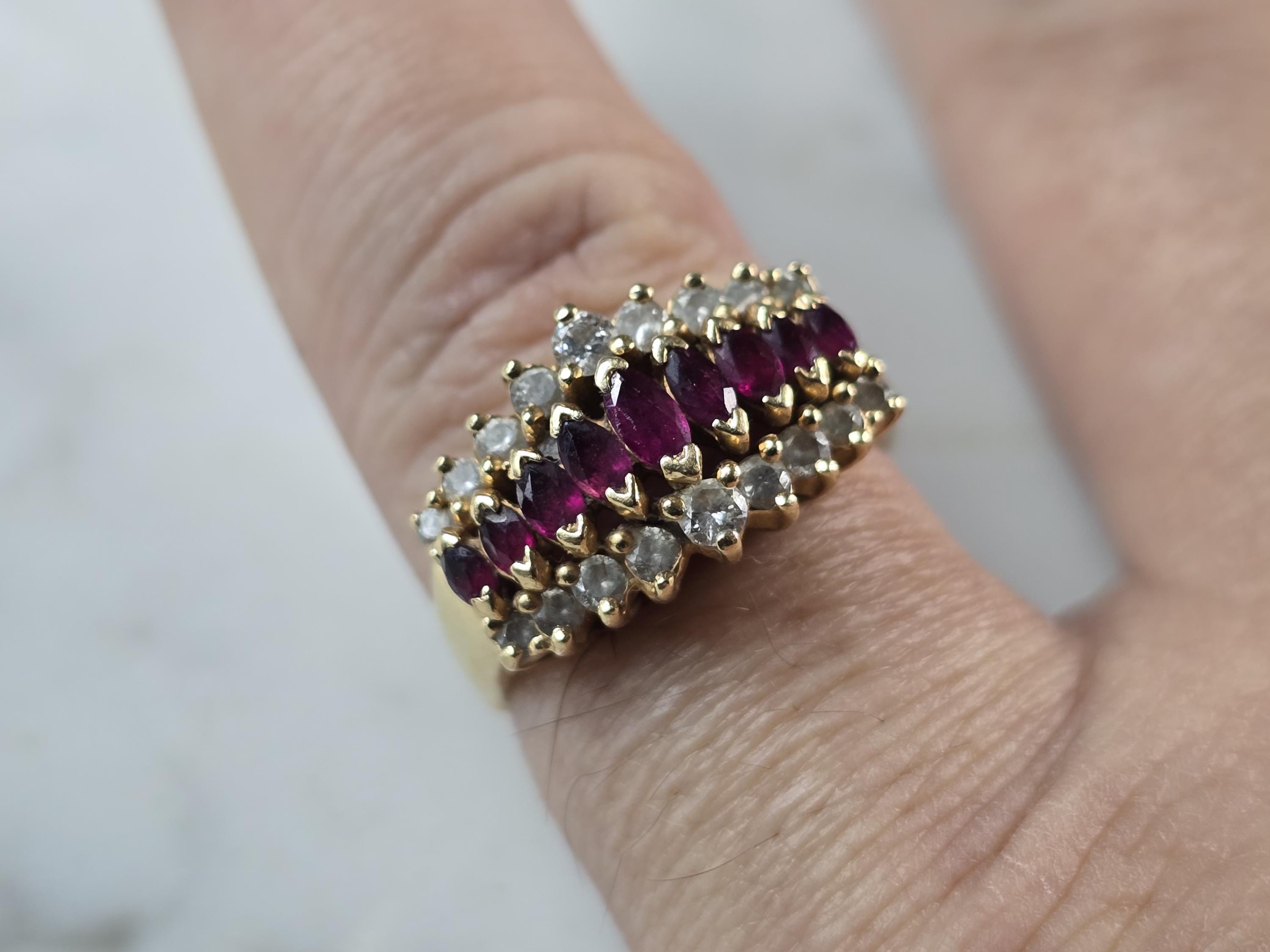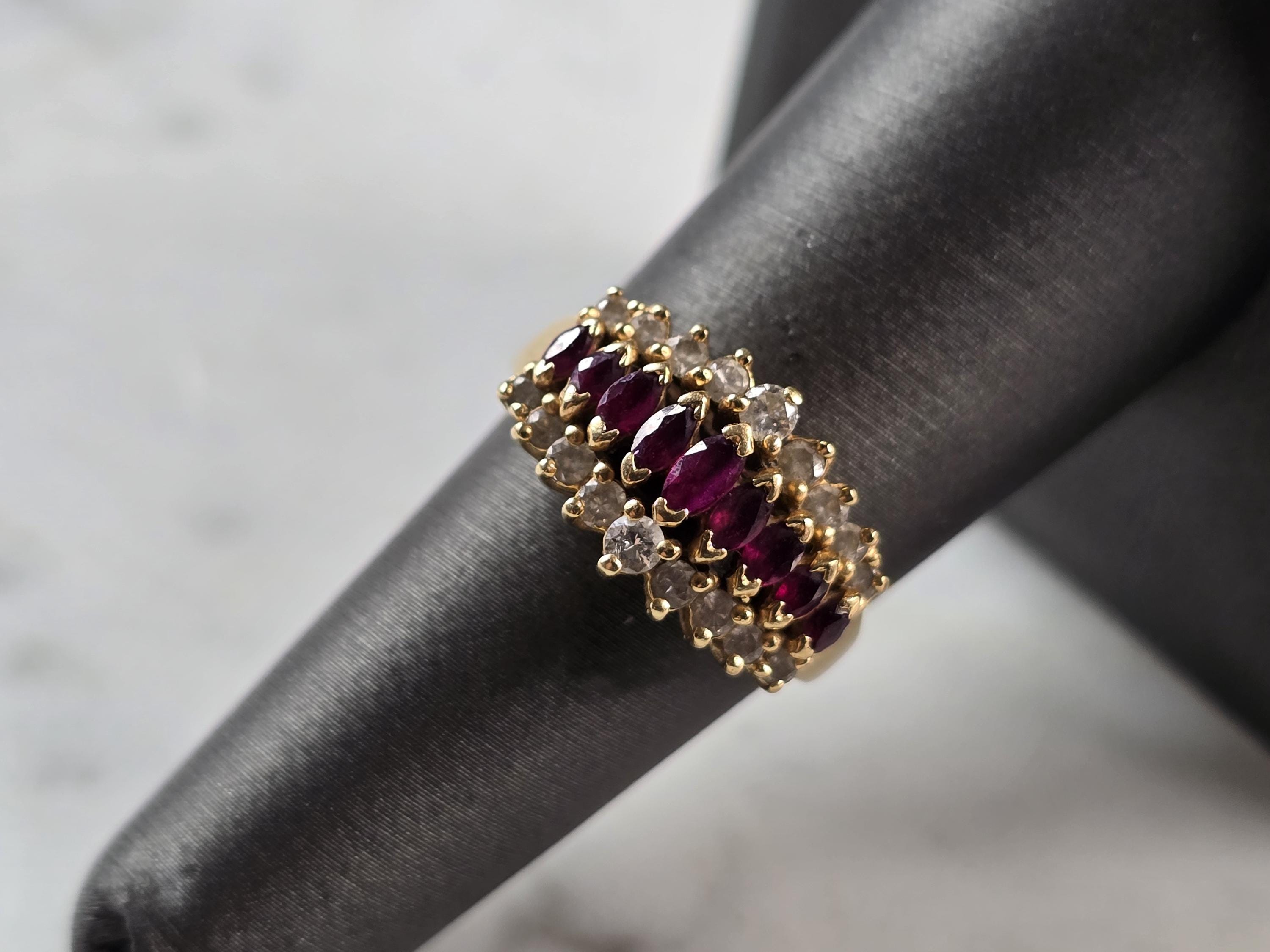 A WOMENS VINTAGE ESTATE 14K GOLD RUBY & DIAMOND RING. THE SIZE OF THE RING IS A 7.0, AND WEIGHS 4.6g. THE WIDTH OF THE RING IS 3/8". THERE ARE 18 DIAMONDS WITH 9 RUBIES. ANY QUESTIONS PLEASE DO NOT HESITATE TO ASK. BE SURE TO CHECK OUT SOME OF MY OTHER GREAT ITEMS UP FOR SALE. THANK YOU