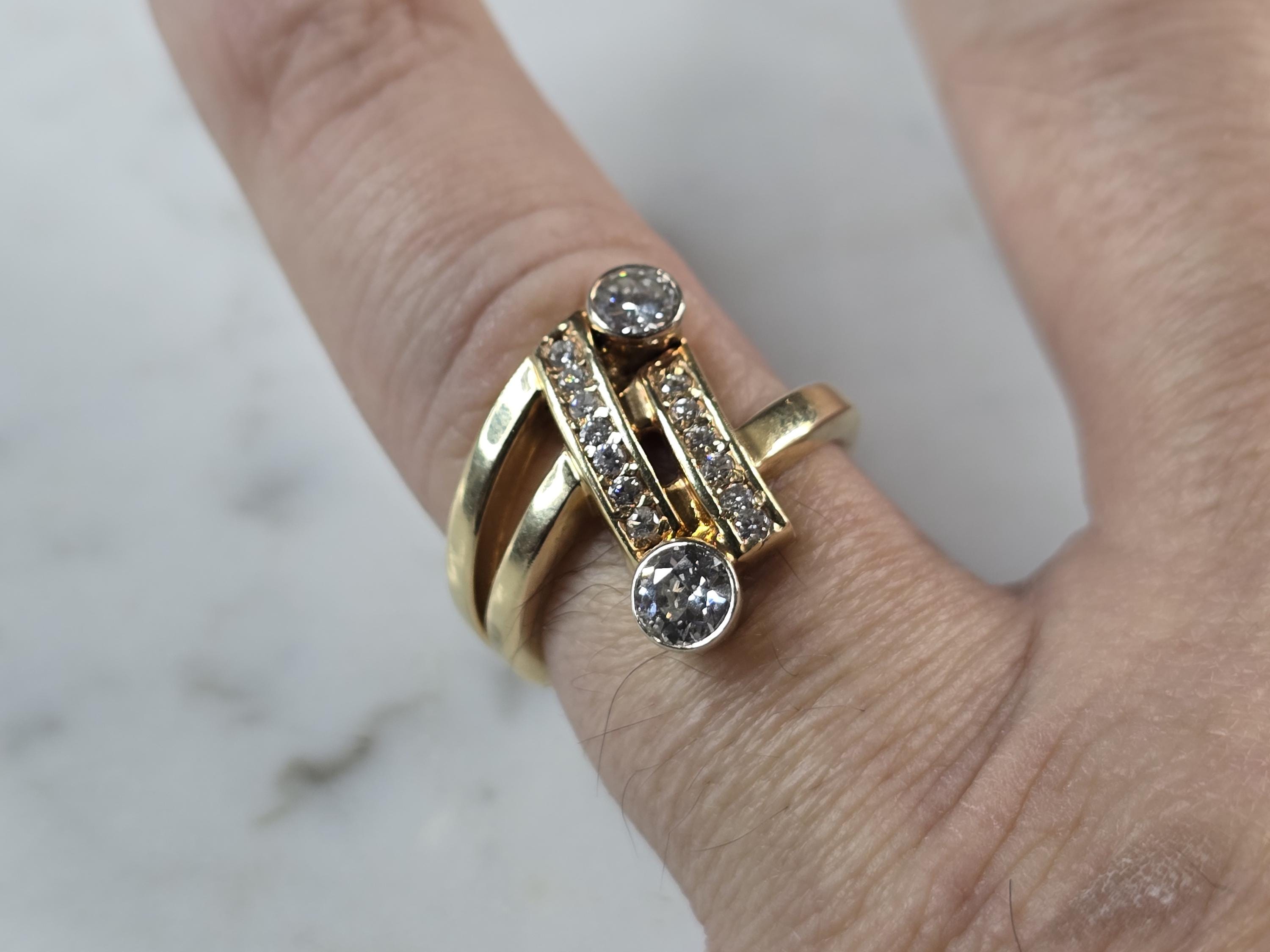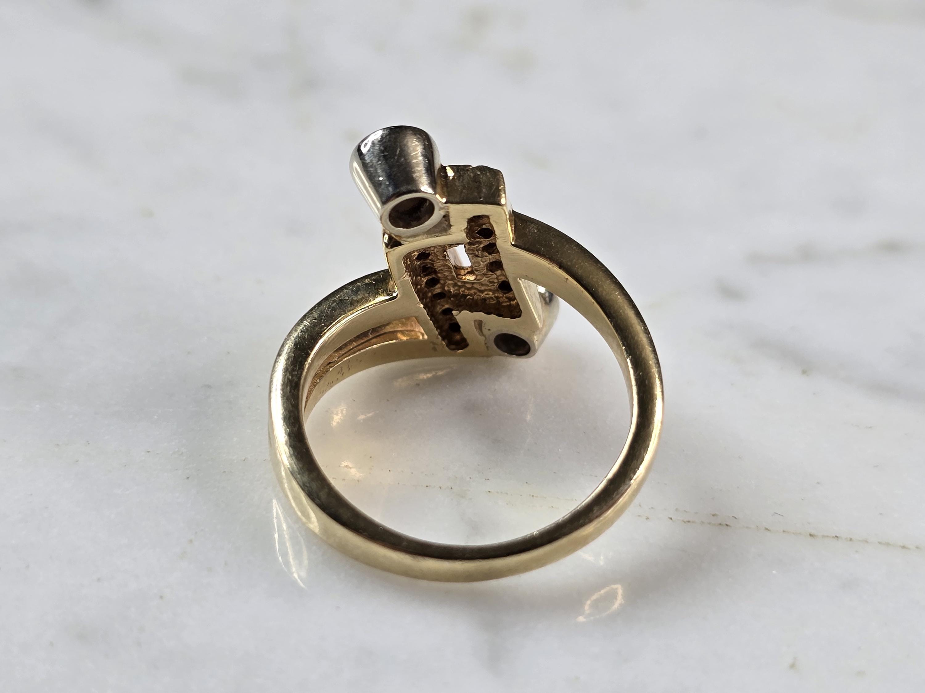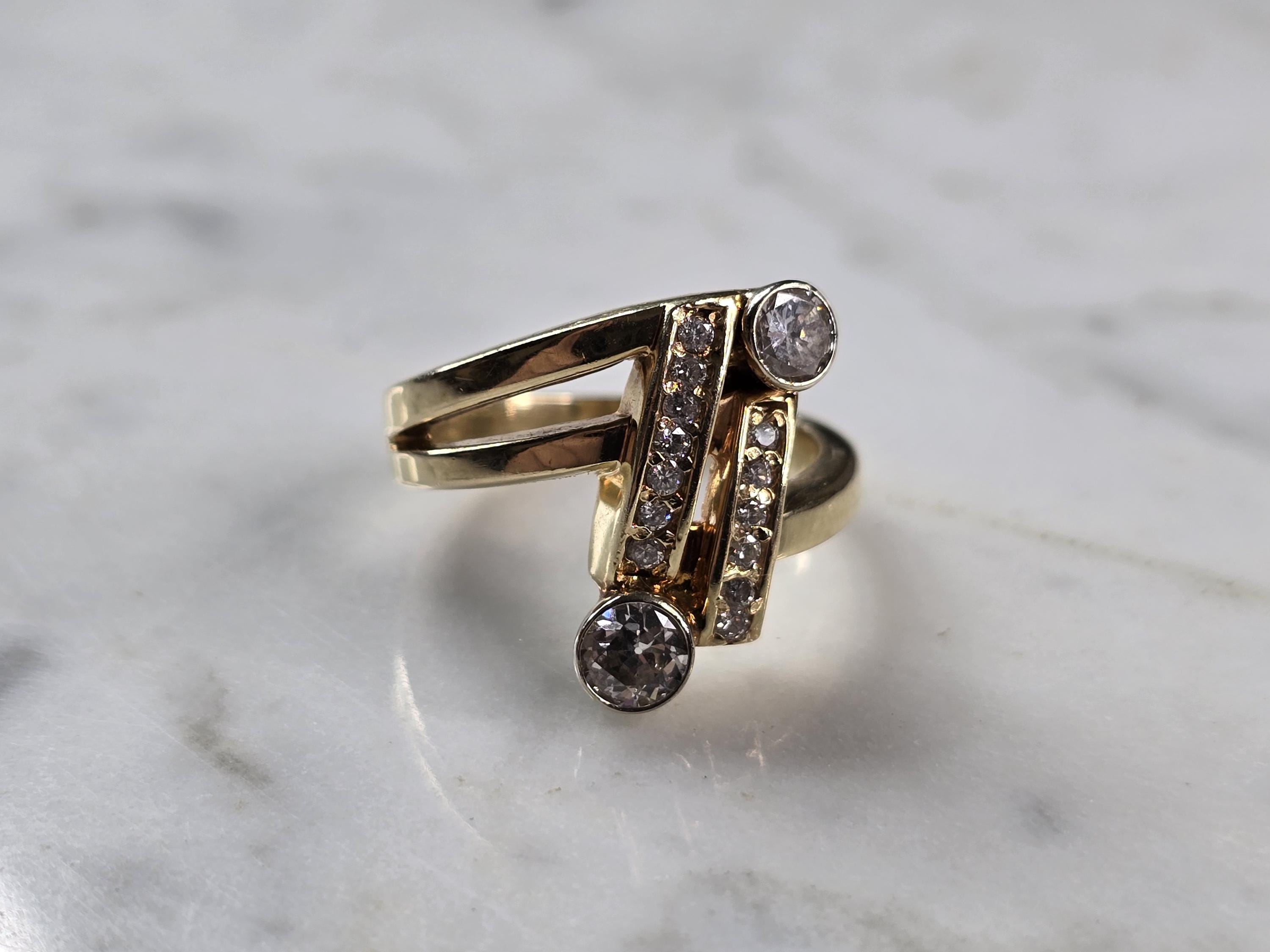 A WOMENS VINTAGE ESTATE 14K YELLOW GOLD MODERNIST DIAMOND RING. THE RING IS A SIZE 6.5 AND WEIGHS 6.8g. THE TWO DIAMONDS ARE ABOUT 0.25cts EACH WITH 13 TINY ACCENT DIAMONDS. THE LENGTH OF THE RING IS 3/4". THE RING MAKES A BEAUTIFUL GIFT FOR THAT SOMEONE SPECIAL. ANY QUESTIONS, PLEASE ASK. BE SURE TO CHECK OUT SOME OF MY OTHER GREAT ITEMS UP FOR SALE. THANK YOU