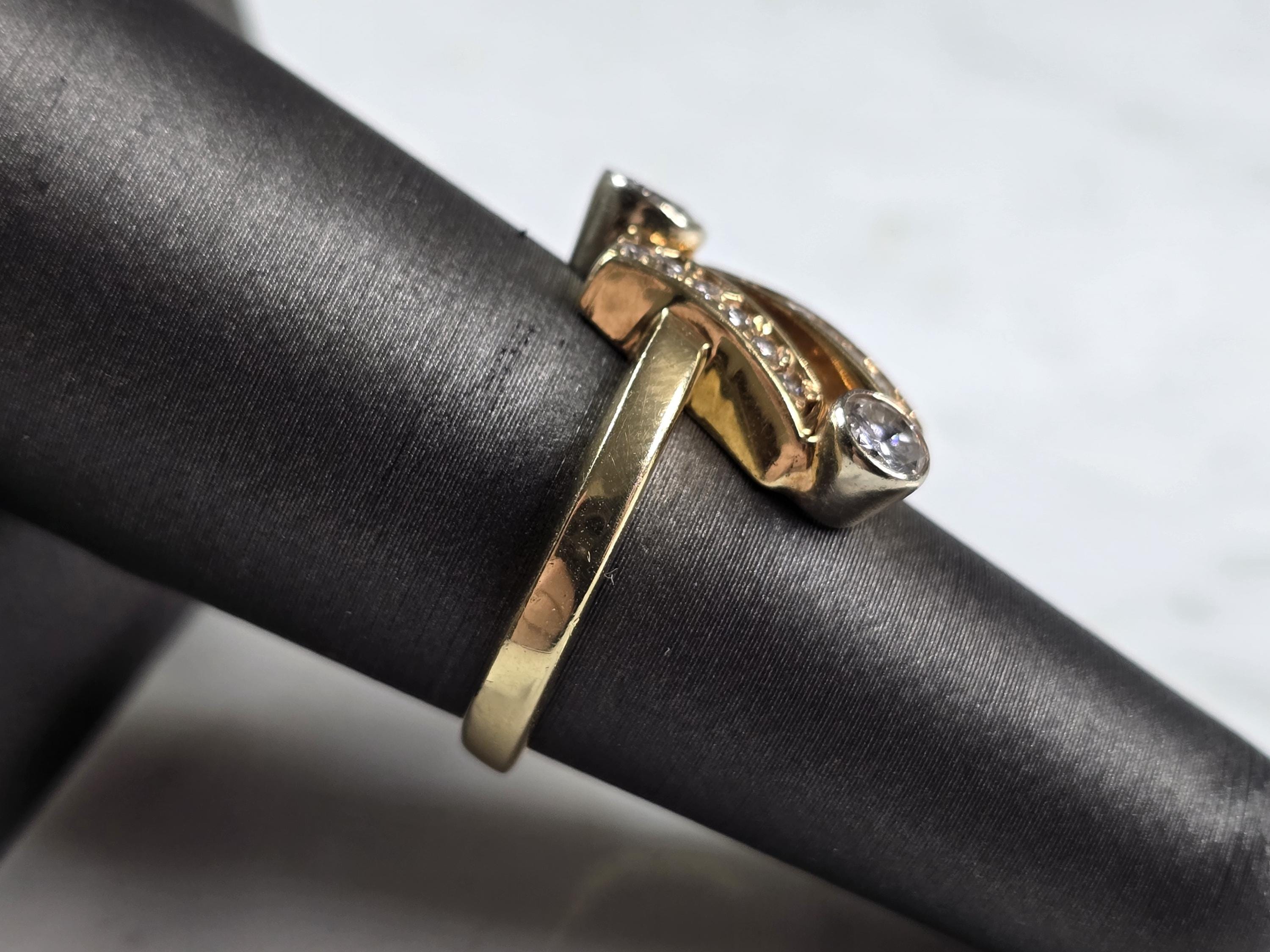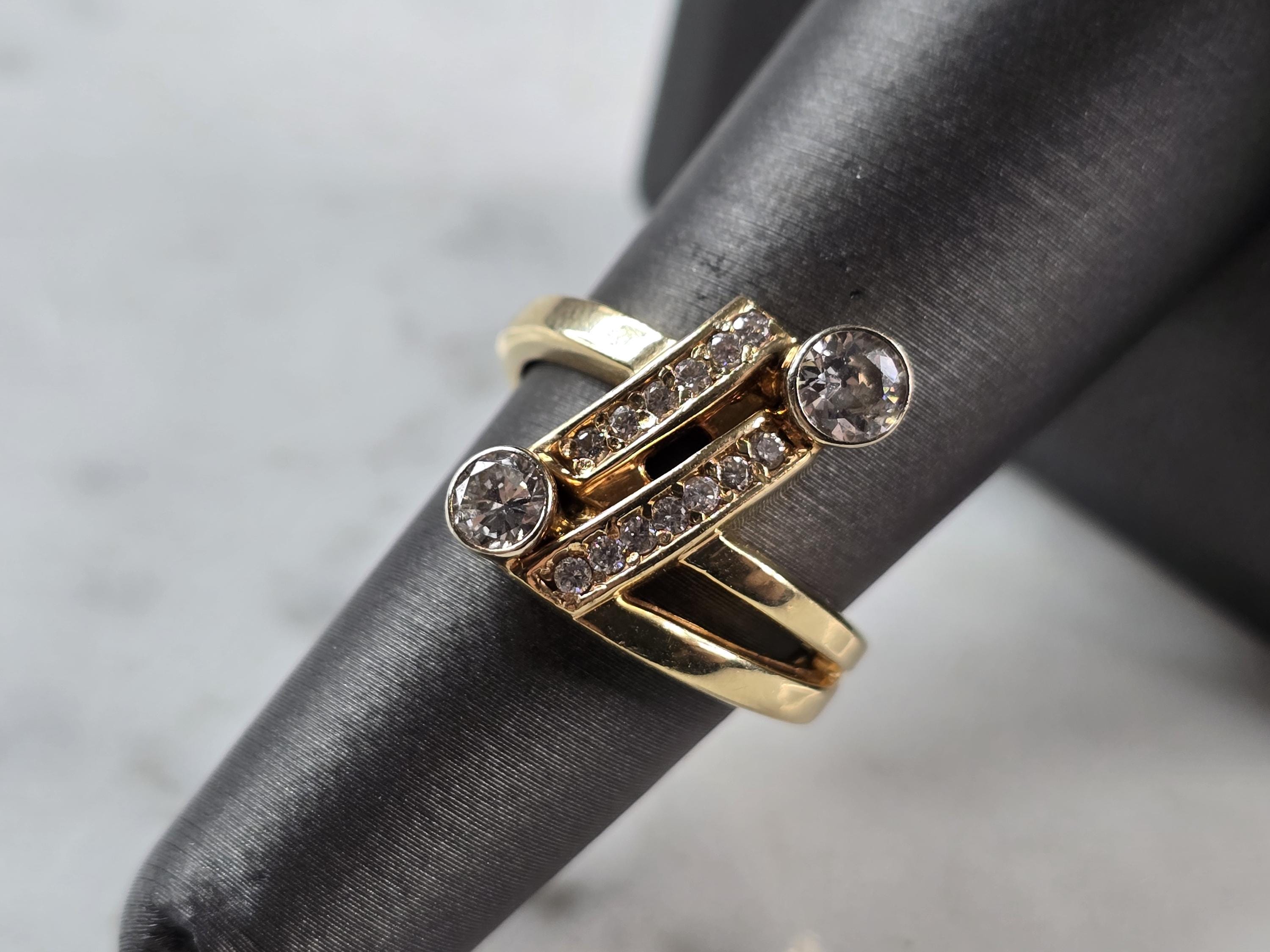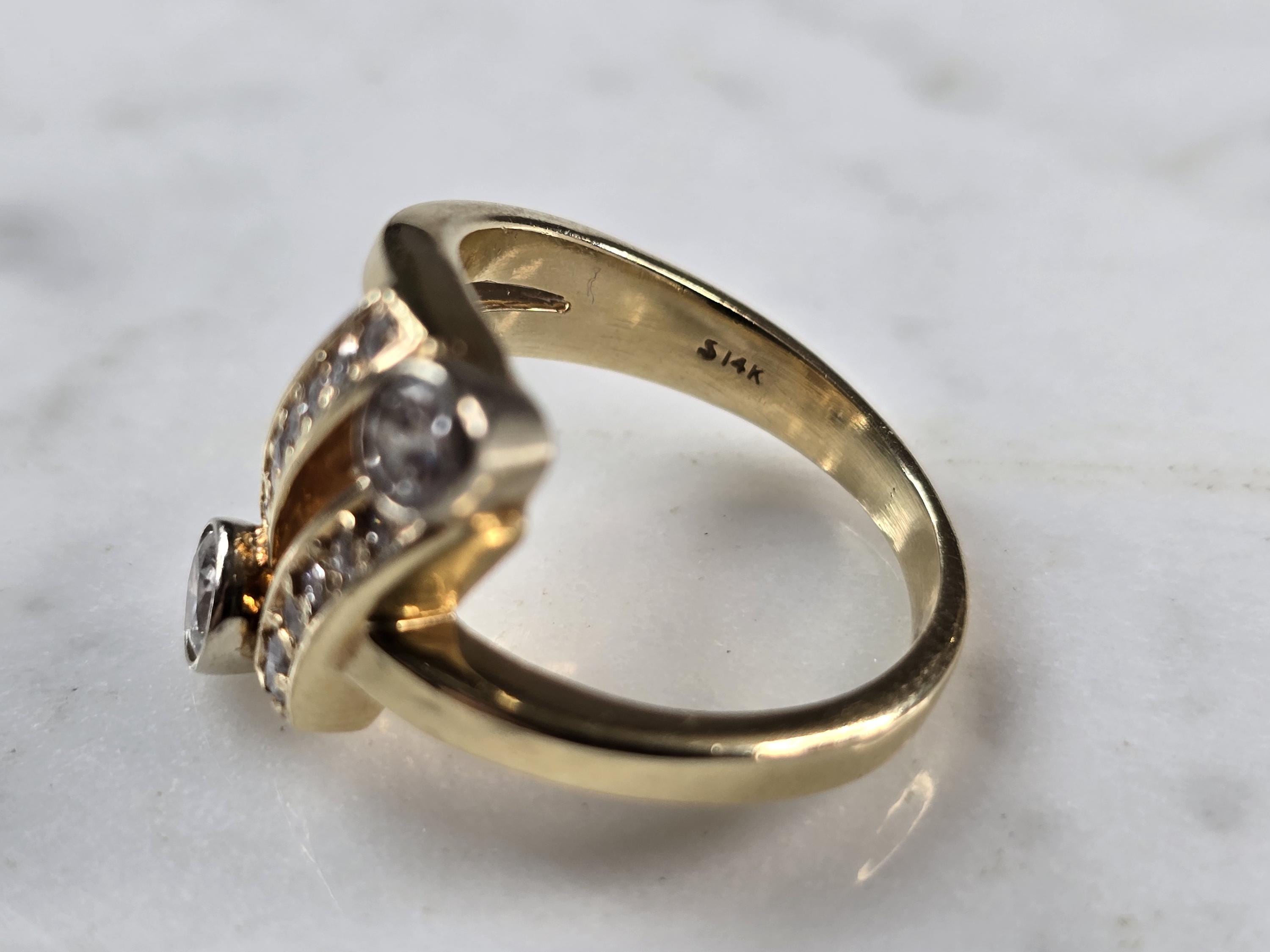 A WOMENS VINTAGE ESTATE 14K YELLOW GOLD MODERNIST DIAMOND RING. THE RING IS A SIZE 6.5 AND WEIGHS 6.8g. THE TWO DIAMONDS ARE ABOUT 0.25cts EACH WITH 13 TINY ACCENT DIAMONDS. THE LENGTH OF THE RING IS 3/4". THE RING MAKES A BEAUTIFUL GIFT FOR THAT SOMEONE SPECIAL. ANY QUESTIONS, PLEASE ASK. BE SURE TO CHECK OUT SOME OF MY OTHER GREAT ITEMS UP FOR SALE. THANK YOU