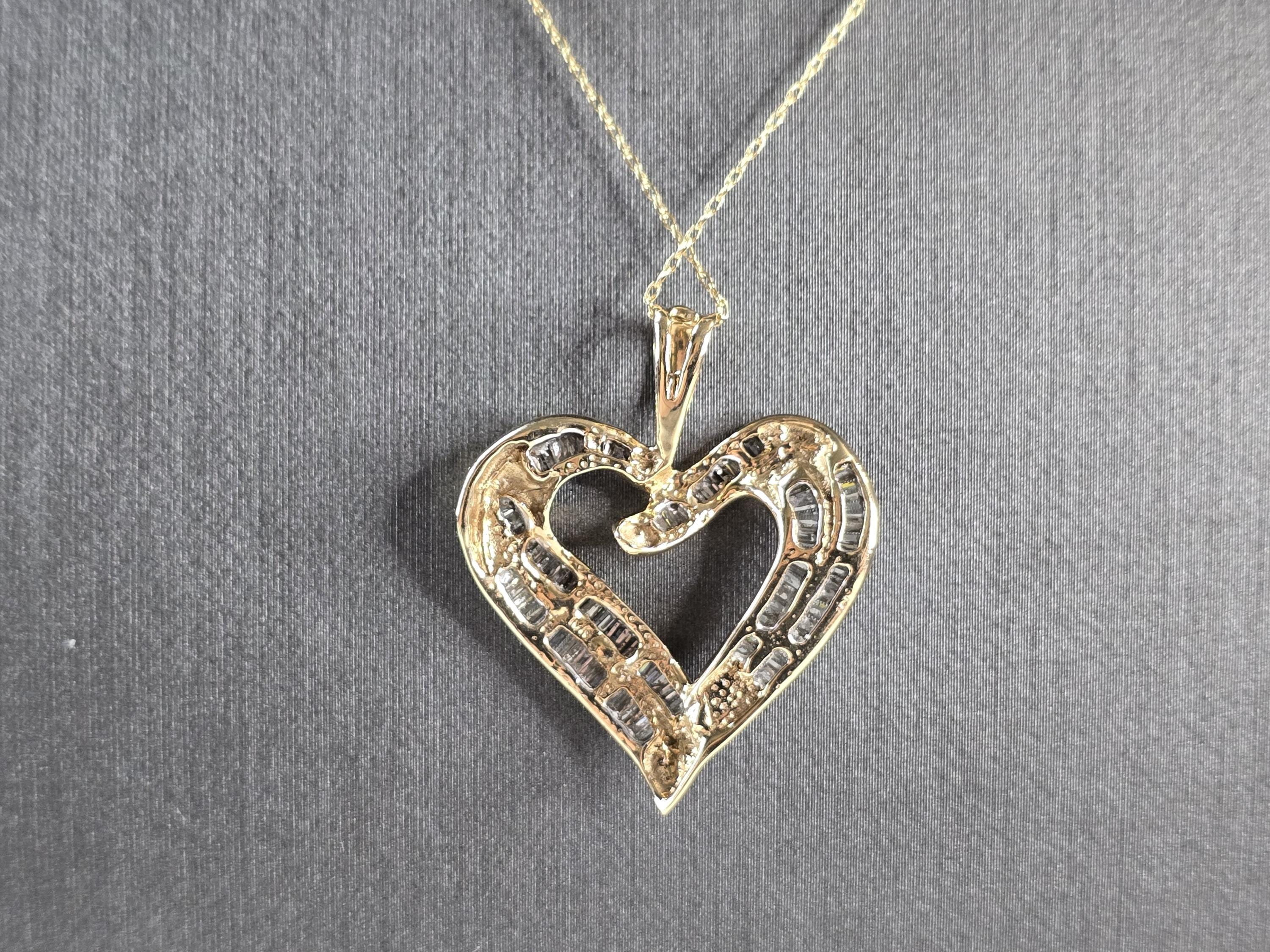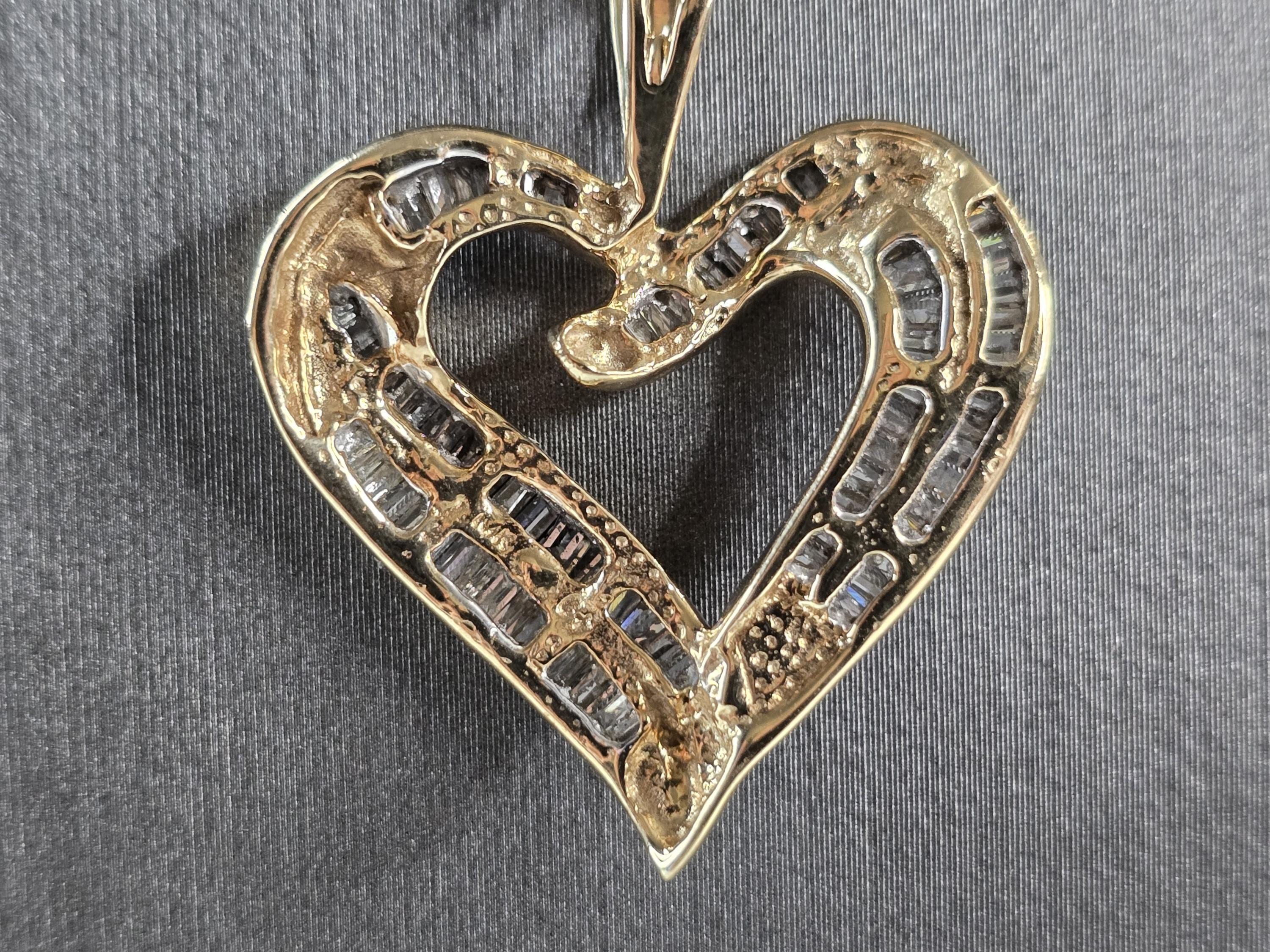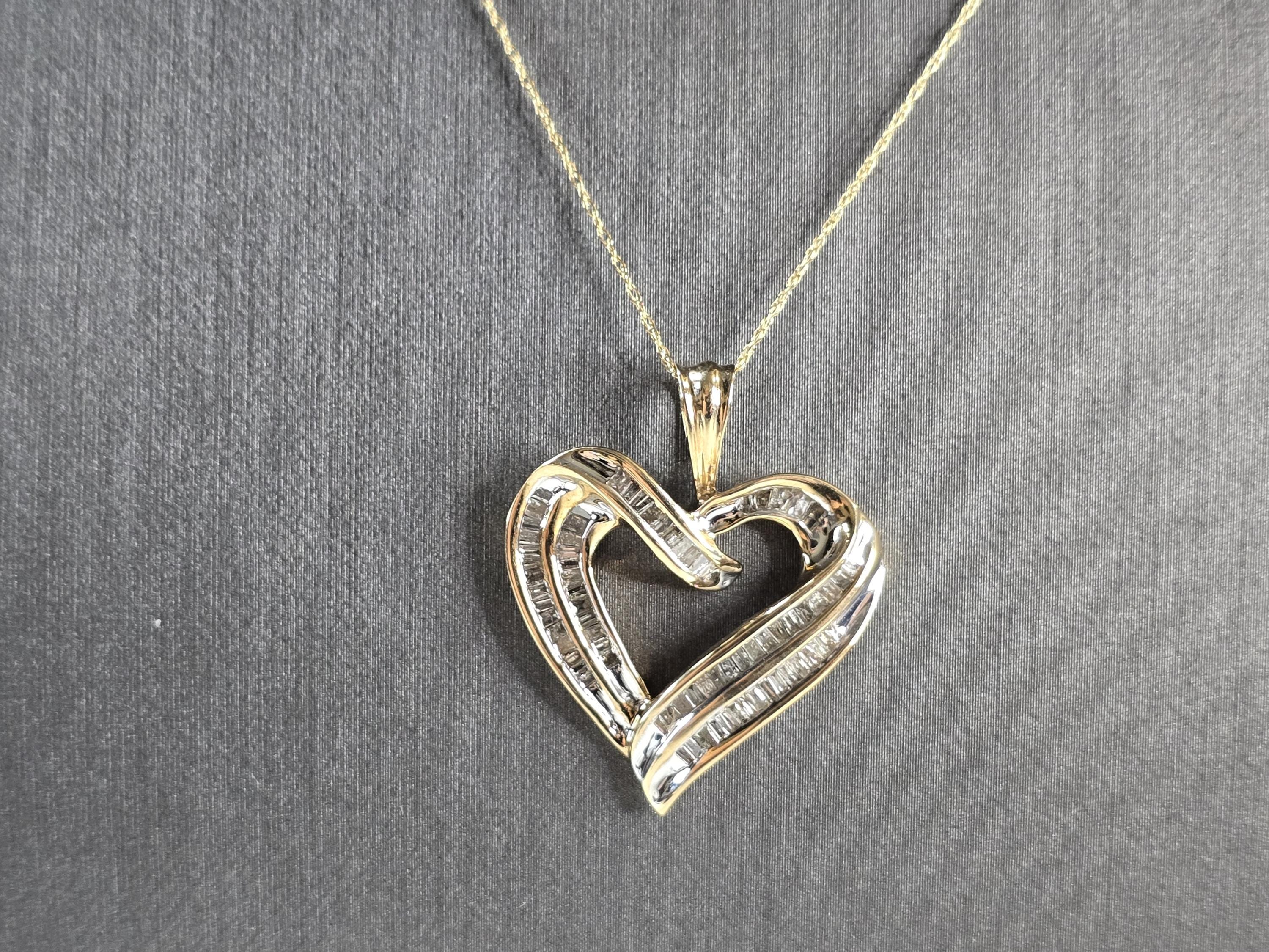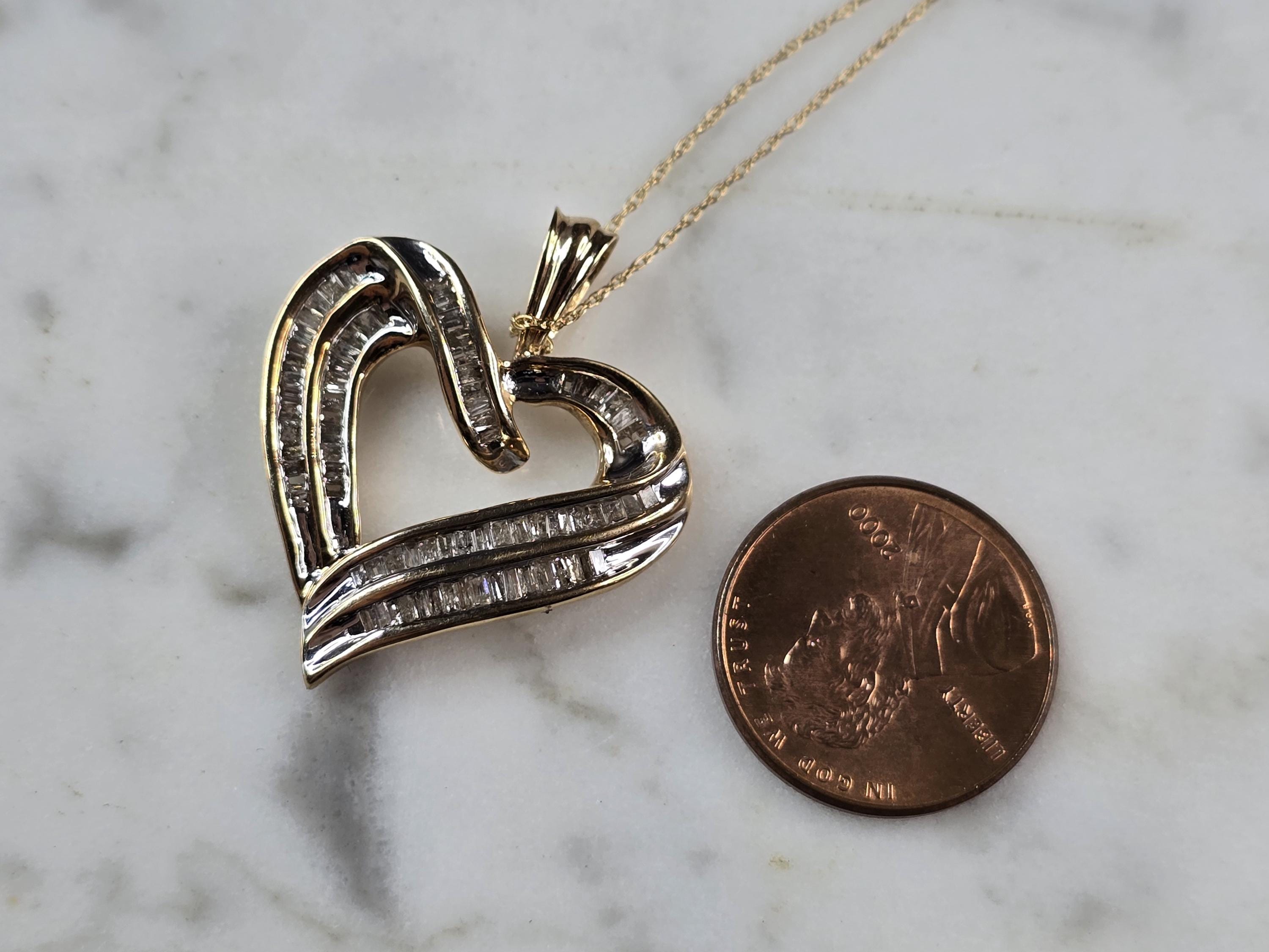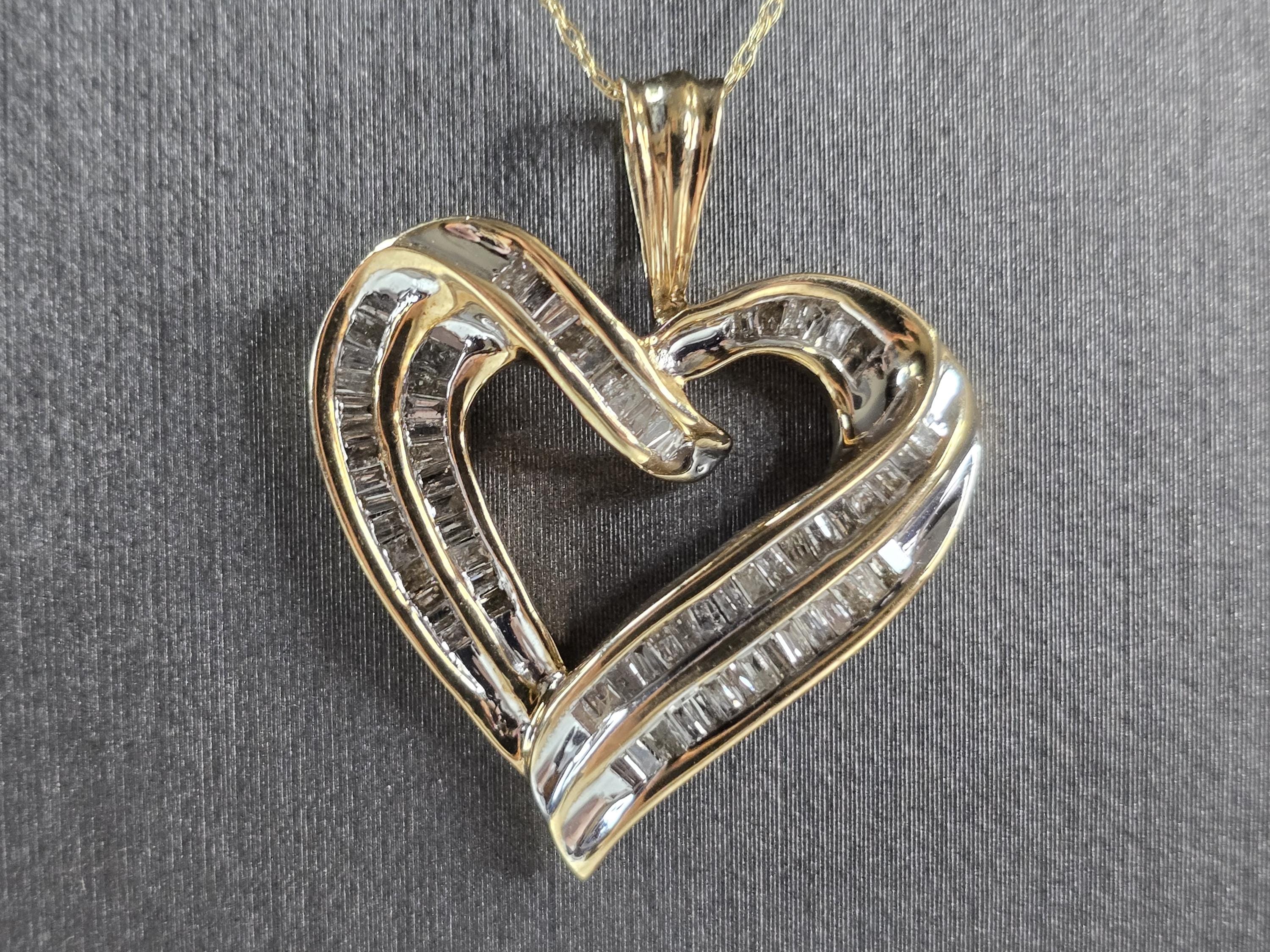 A LOVELY WOMENS VINTAGE ESTATE 10K YELLOW GOLD HEART PENDANT WITH DIAMONDS, AND A FINE LINK NECKLACE. THE NECKLACE AND PENDANT WEIGHS 4.6g. THE NECKLACE MEASURES 20" LONG, AND THE HEART PENDANT MEASURES 1 1/8" BY 1". THERE ARE ABOUT 50 BAGUETTE DIAMONDS IN THE PENDANT. THIS MAKES A GREAT GIFT FOR THAT SOMEONE SPECIAL. ANY QUESTIONS, PLEASE ASK. BE SURE TO CHECK OUT OUR OTHER ITEMS FOR SALE.