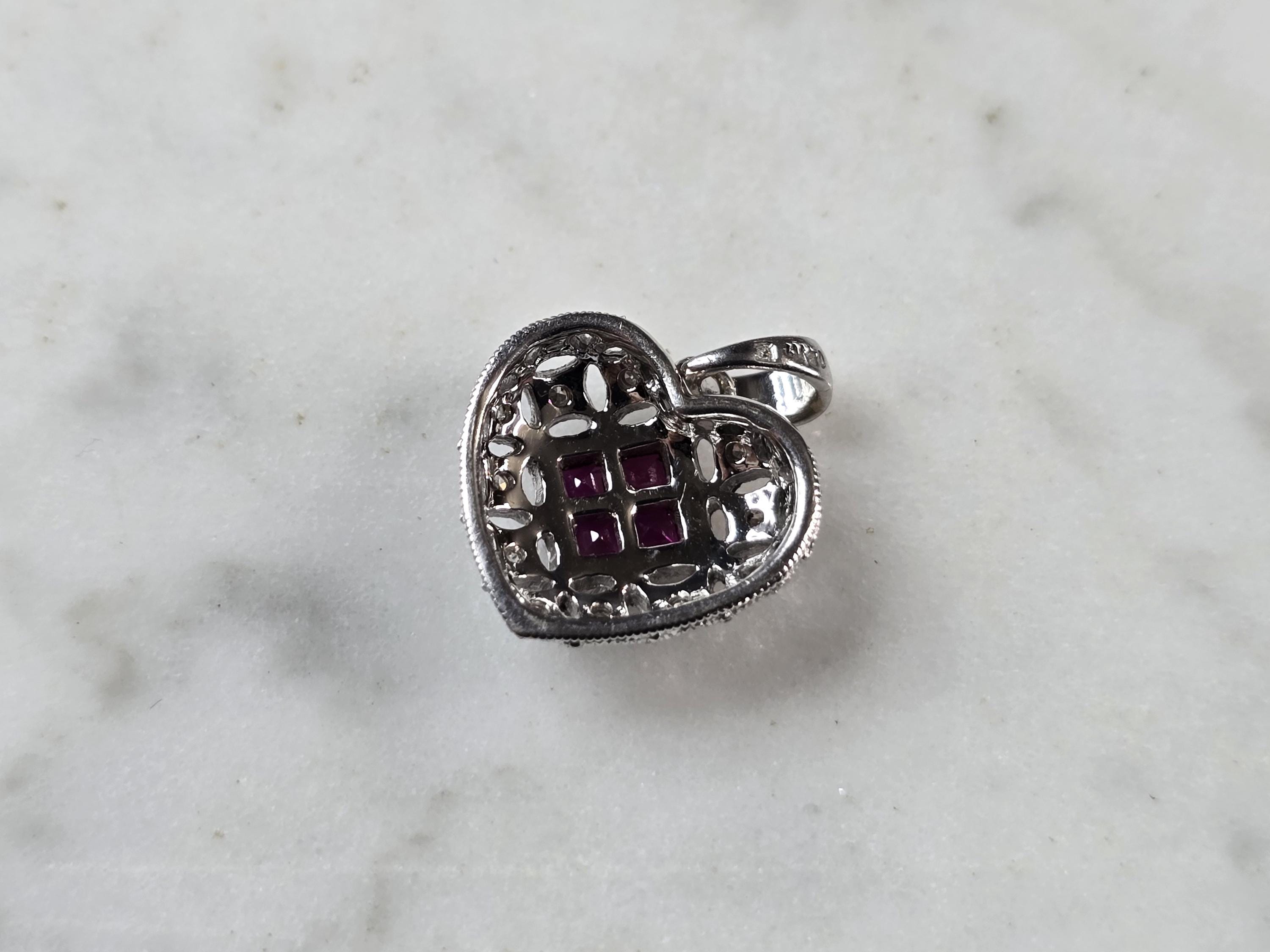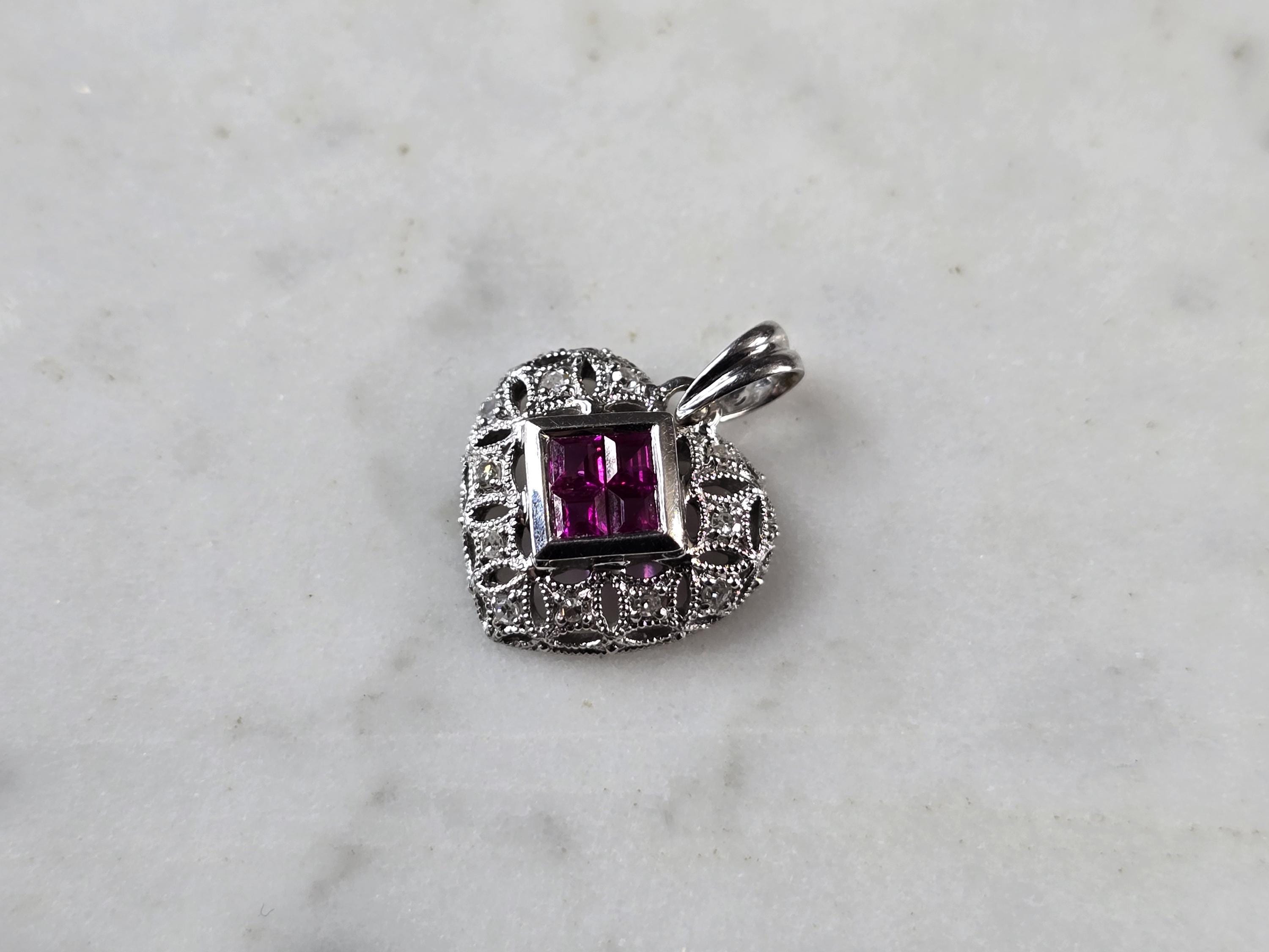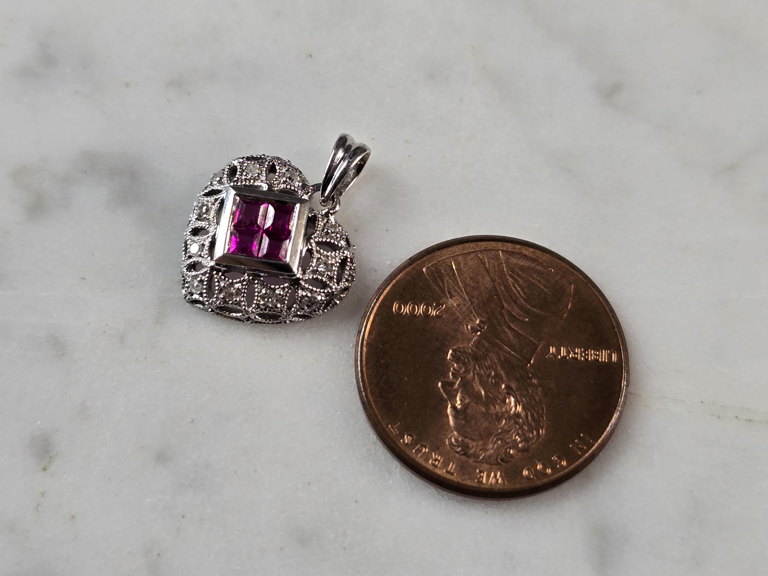 A WOMENS VINTAGE ESTATE 14K WHITE GOLD RUBY DIAMOND HEART PENDANT. THE TOTAL WEIGHT IS 1.8g. THE PENDANT MEASURES 5/8" LONG BY 1/2" WIDE. THERE ARE 11 DIAMONDS AND 4 TINY RUBIES. MAKES A GREAT GIFT FOR THAT SOMEONE SPECIAL. ANY QUESTIONS, PLEASE ASK. BE SURE TO CHECK OUT SOME OF MY OTHER GREAT ITEMS FOR SALE.