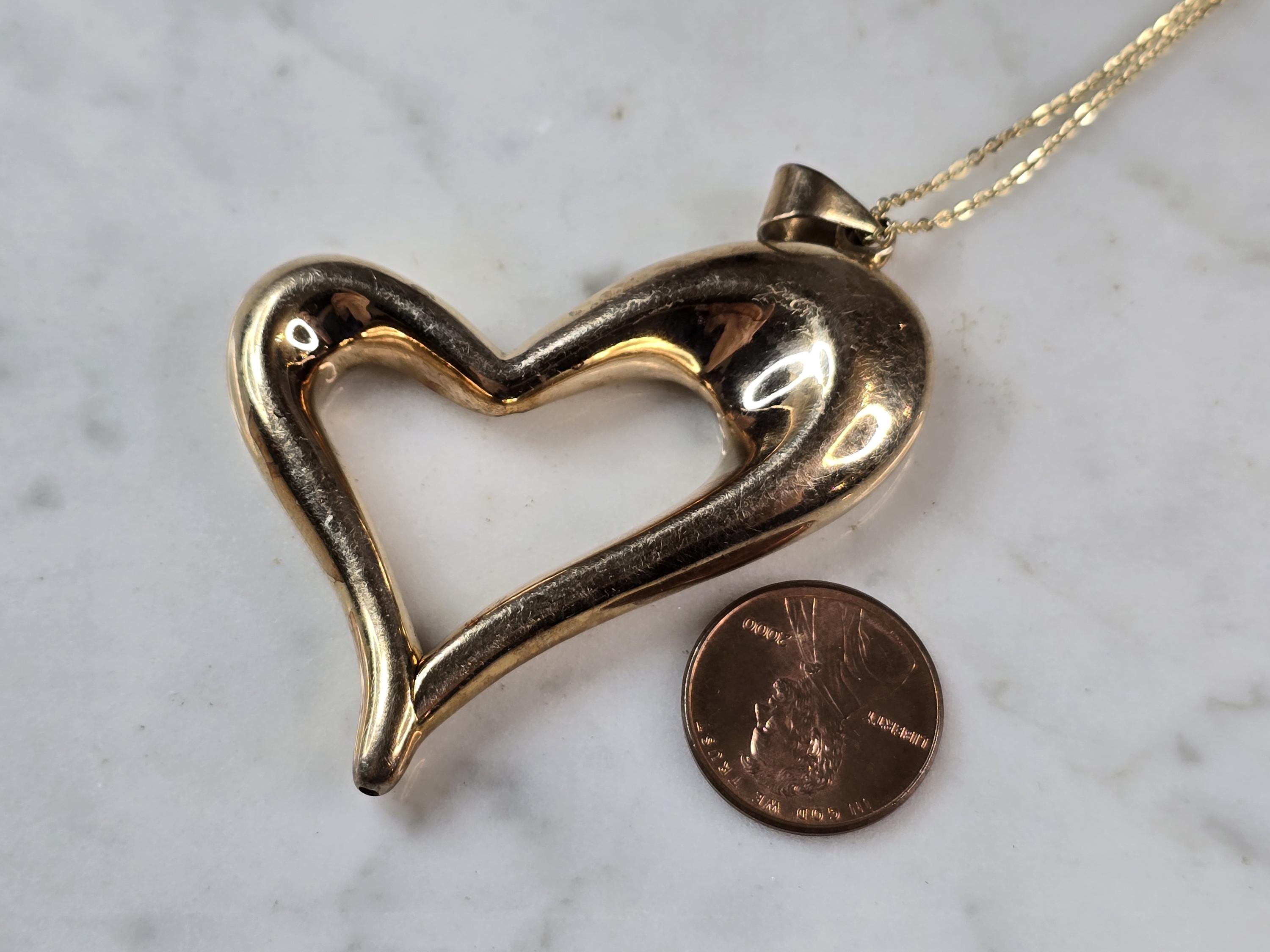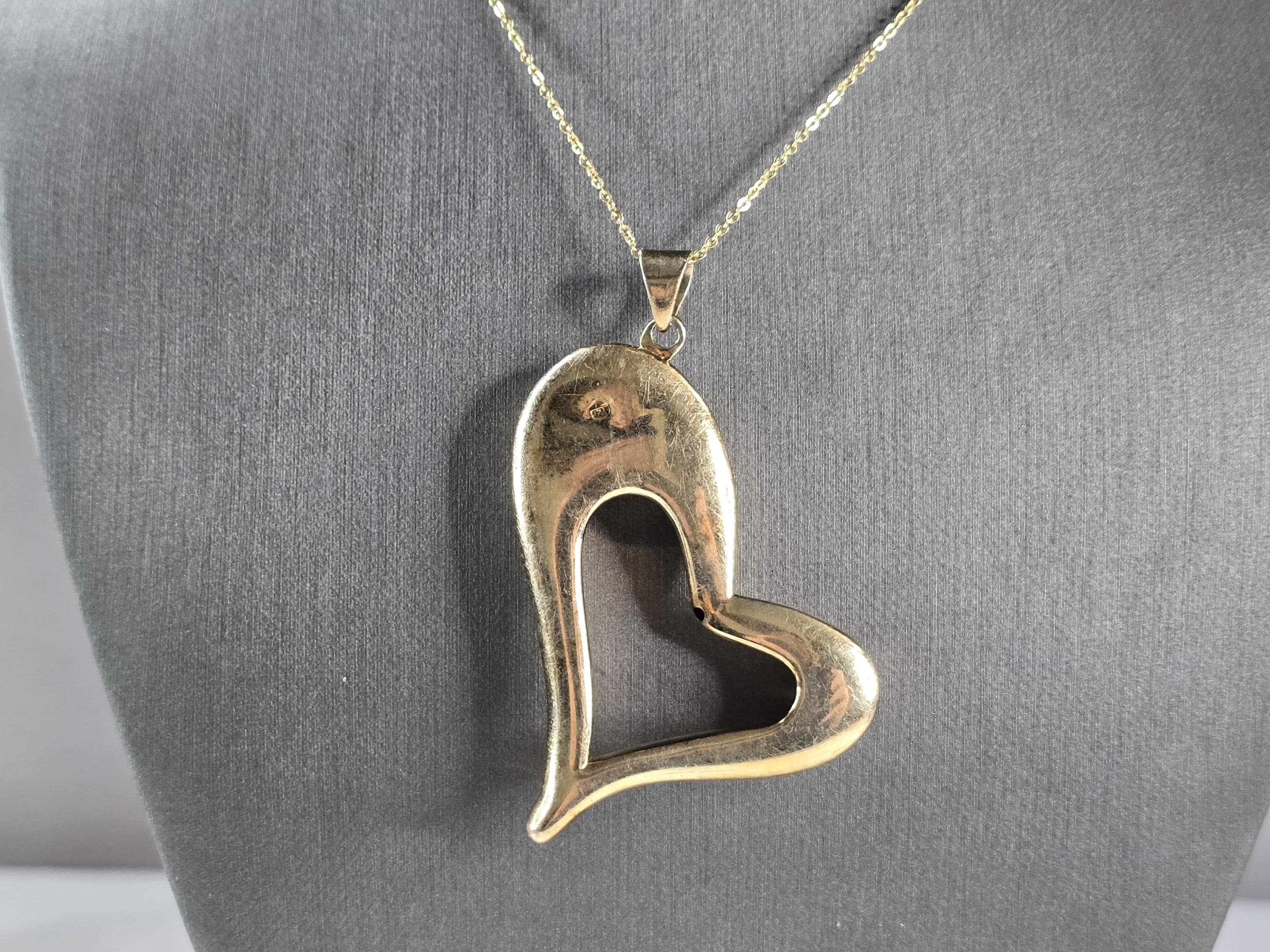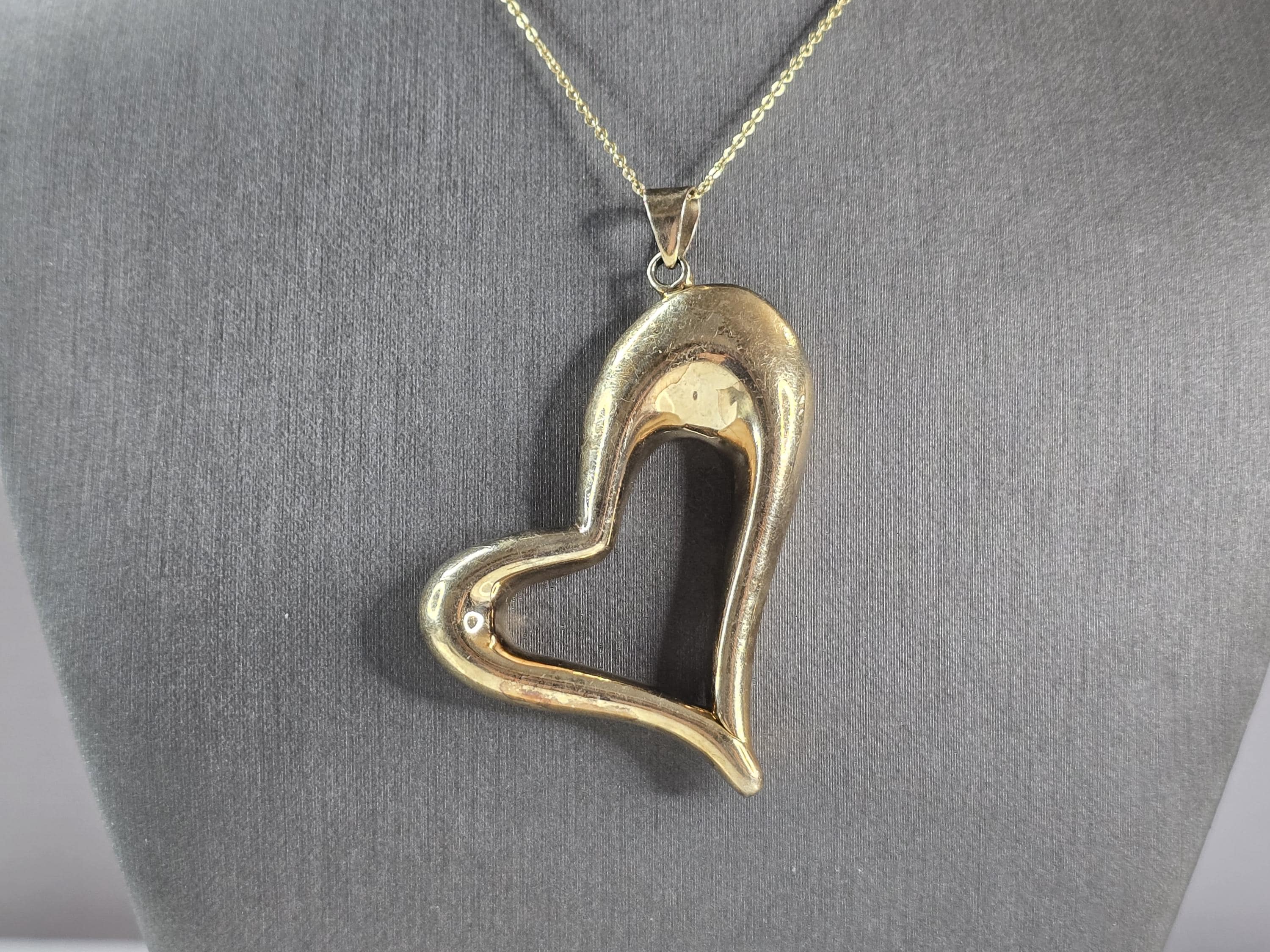 A BEAUTIFUL WOMEN'S VINTAGE ESTATE STERLING SILVER GOLD TONE HEART PENDANT WITH NECKLACE . THE PENDANT MEASURES 2 1/2" LONG BY 2" WIDE. THE NECKLACE MEASURES 18". TOGETHER THEY WEIGH 11.9g. AS YOU MAY BE ABLE TO SEE THERE IS A SUBTLE INDENTATION WHERE THE 925 MARK IS ON THE BACK. OTHER THAN THAT THE PENDANT LOOKS GREAT. WOULD MAKE A GREAT GIFT FOR THAT SPECIAL SOMEONE. ANY QUESTIONS PLEASE DO NOT HESITATE TO ASK. BE SURE TO CHECK OUT SOME OF MY OTHER GREAT ITEMS UP FOR SALE. THANK YOU.