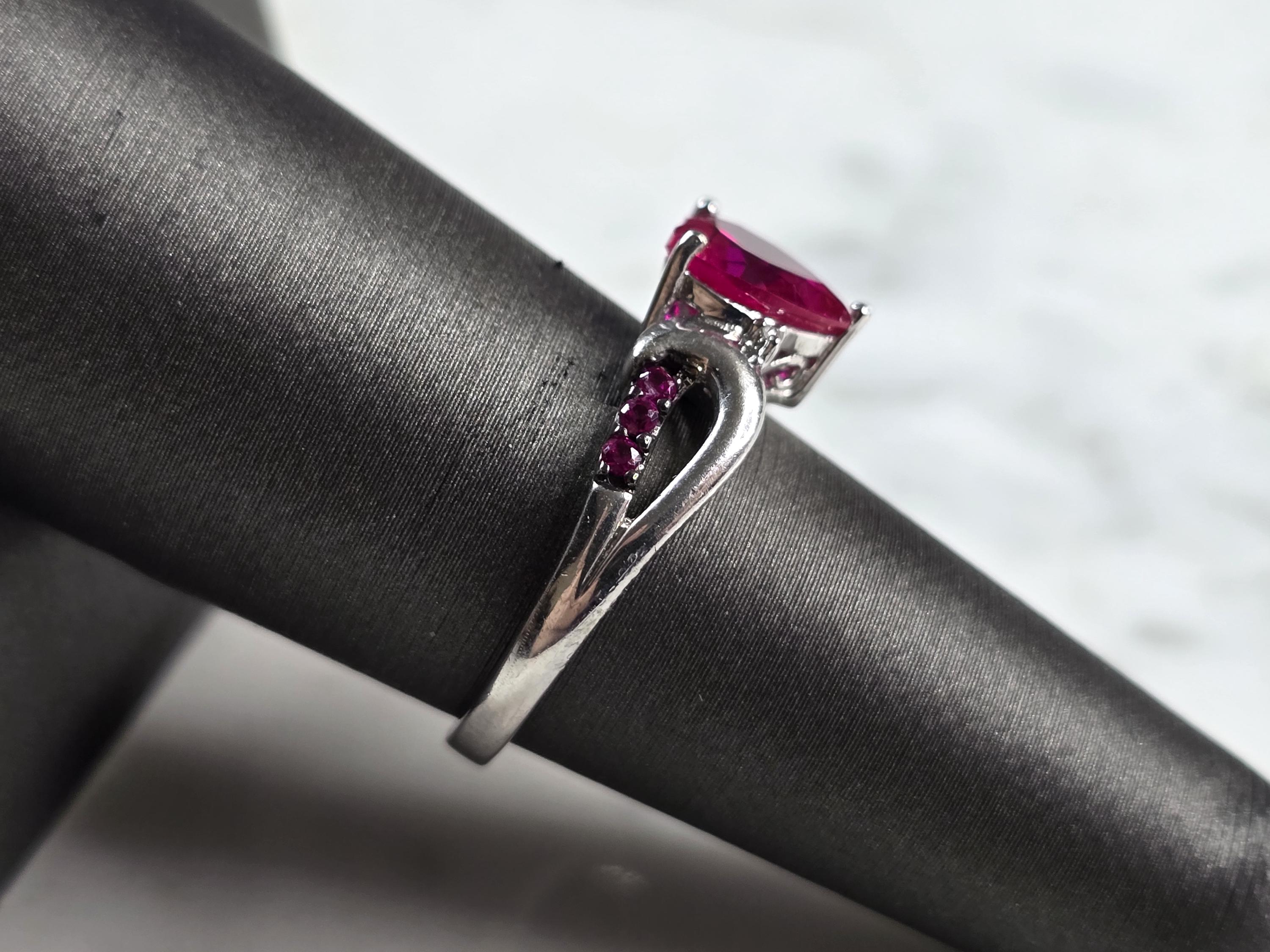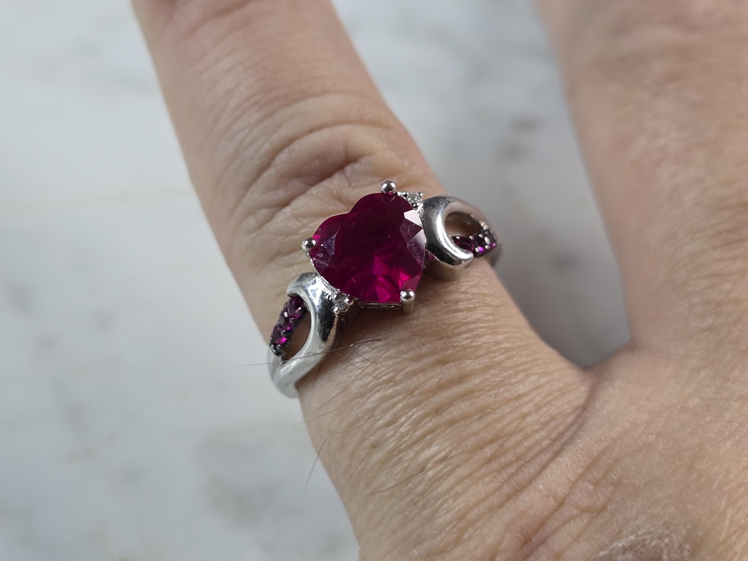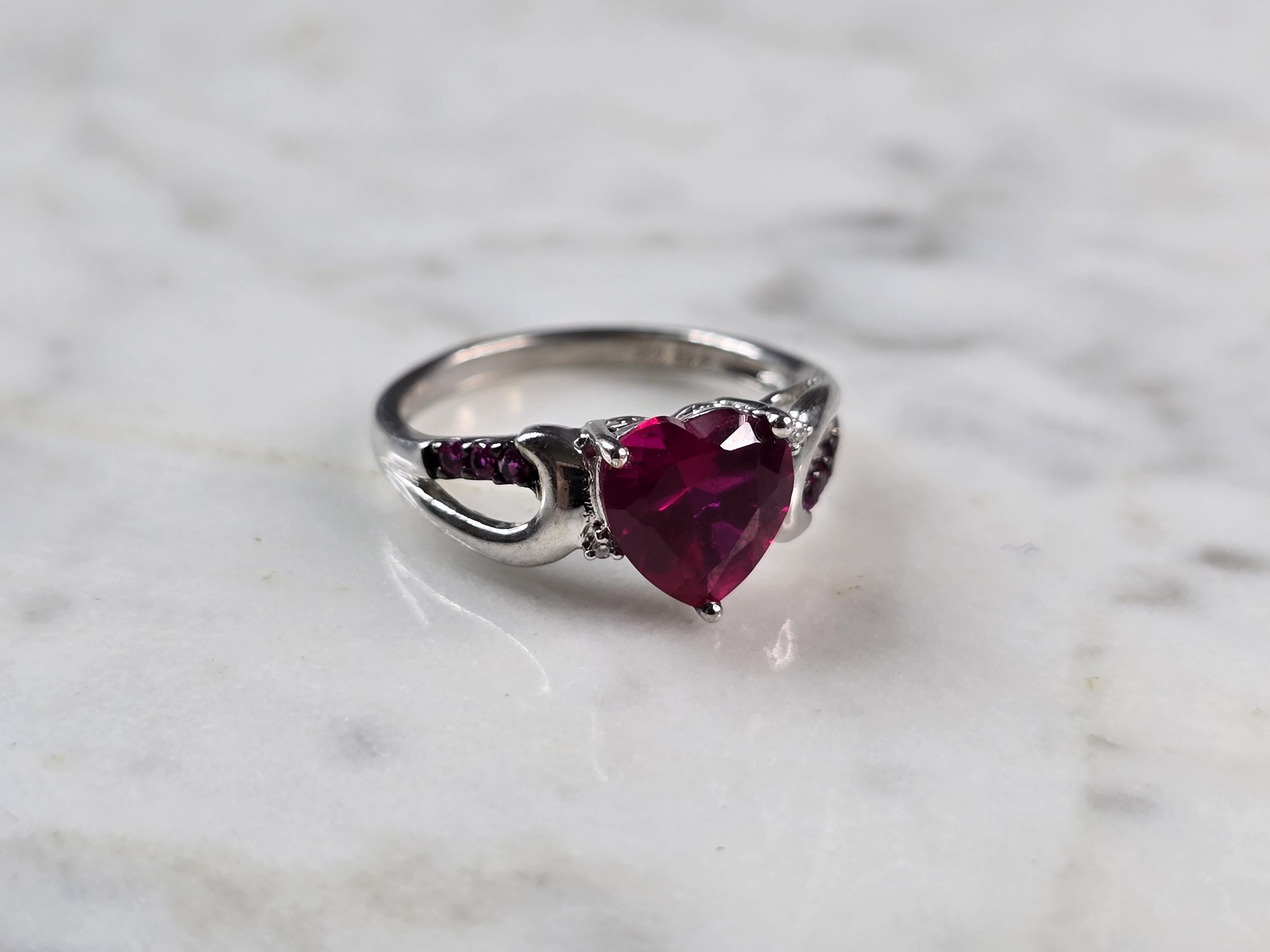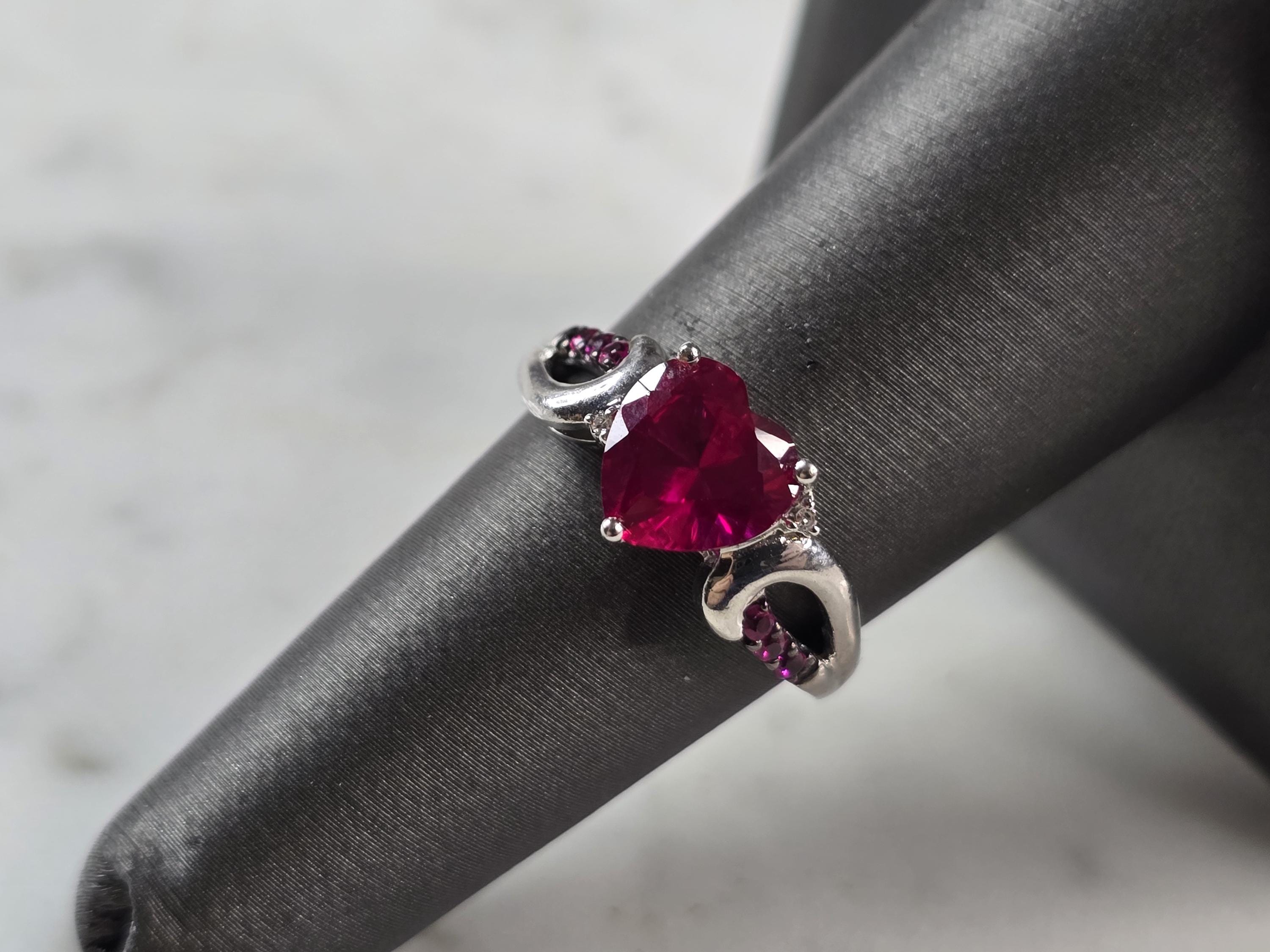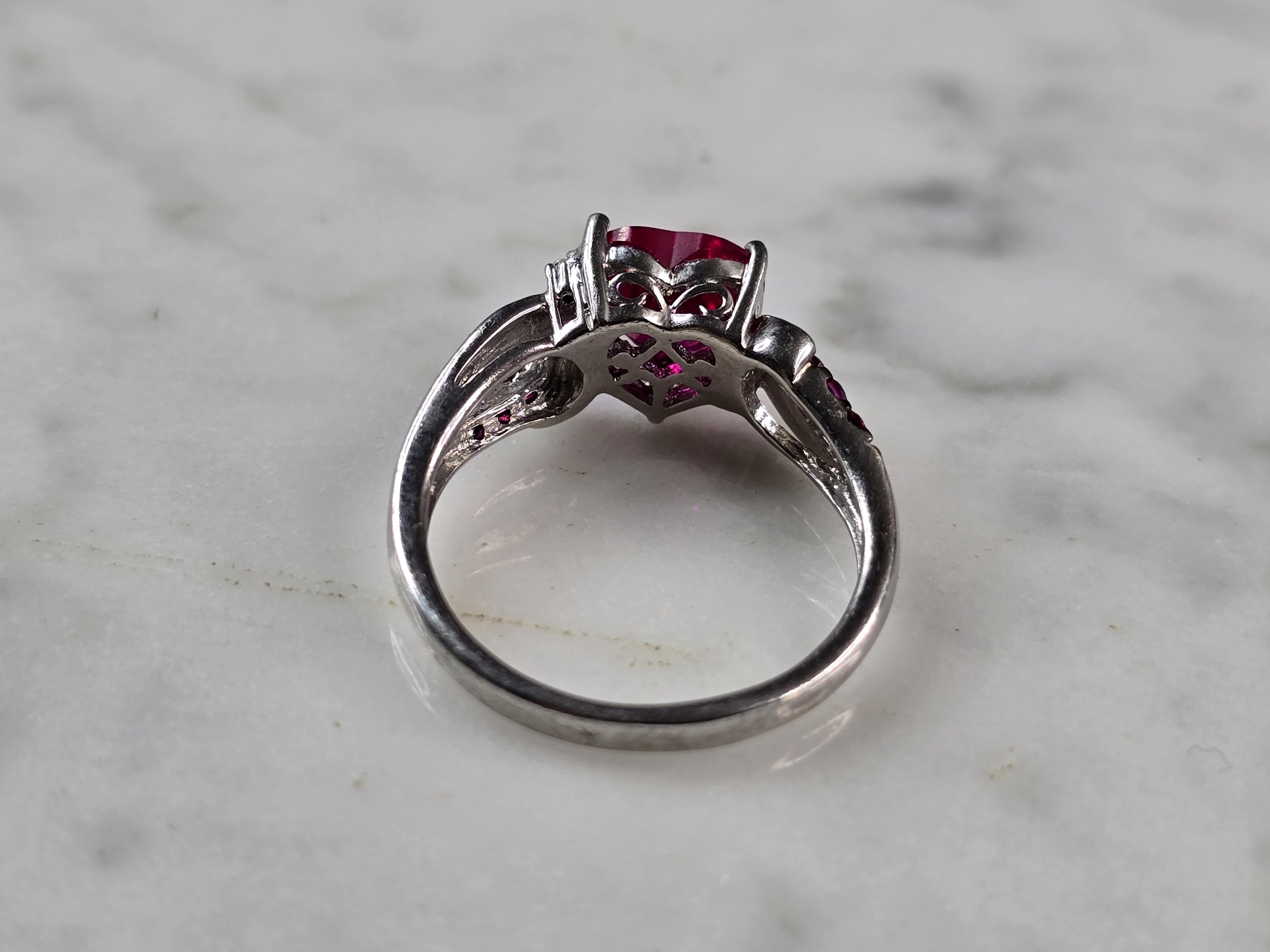 A WOMENS VINTAGE ESTATE STERLING SILVER RUBY COLORED HEART RING. THE RING SIZE IS A 7.0, AND WEIGHS 3.1g. THE WIDTH OF THE RING IS 3/8". STONE IS SYNTHETIC. THIS WOULD MAKE A NICE GIFT FOR THAT SOMEONE SPECIAL. ANY QUESTIONS PLEASE DO NOT HESITATE TO ASK. BE SURE TO CHECK OUT SOME OF MY OTHER GREAT ITEMS UP FOR SALE. THANK YOU.