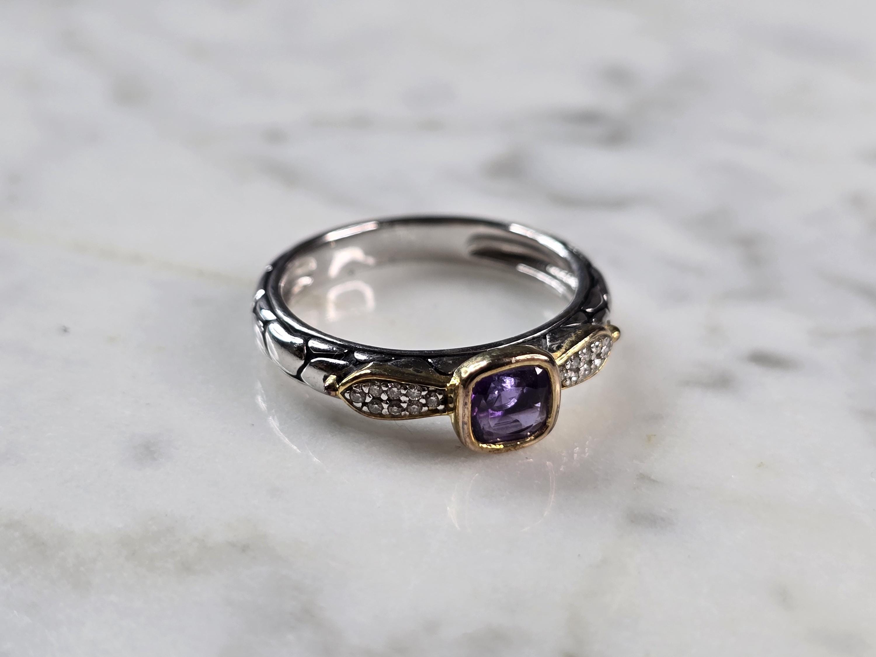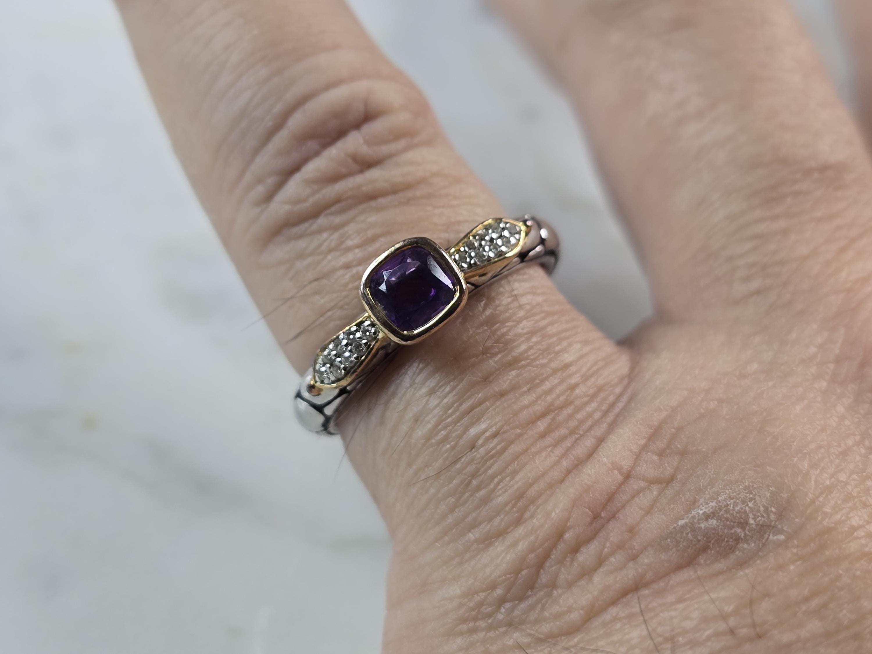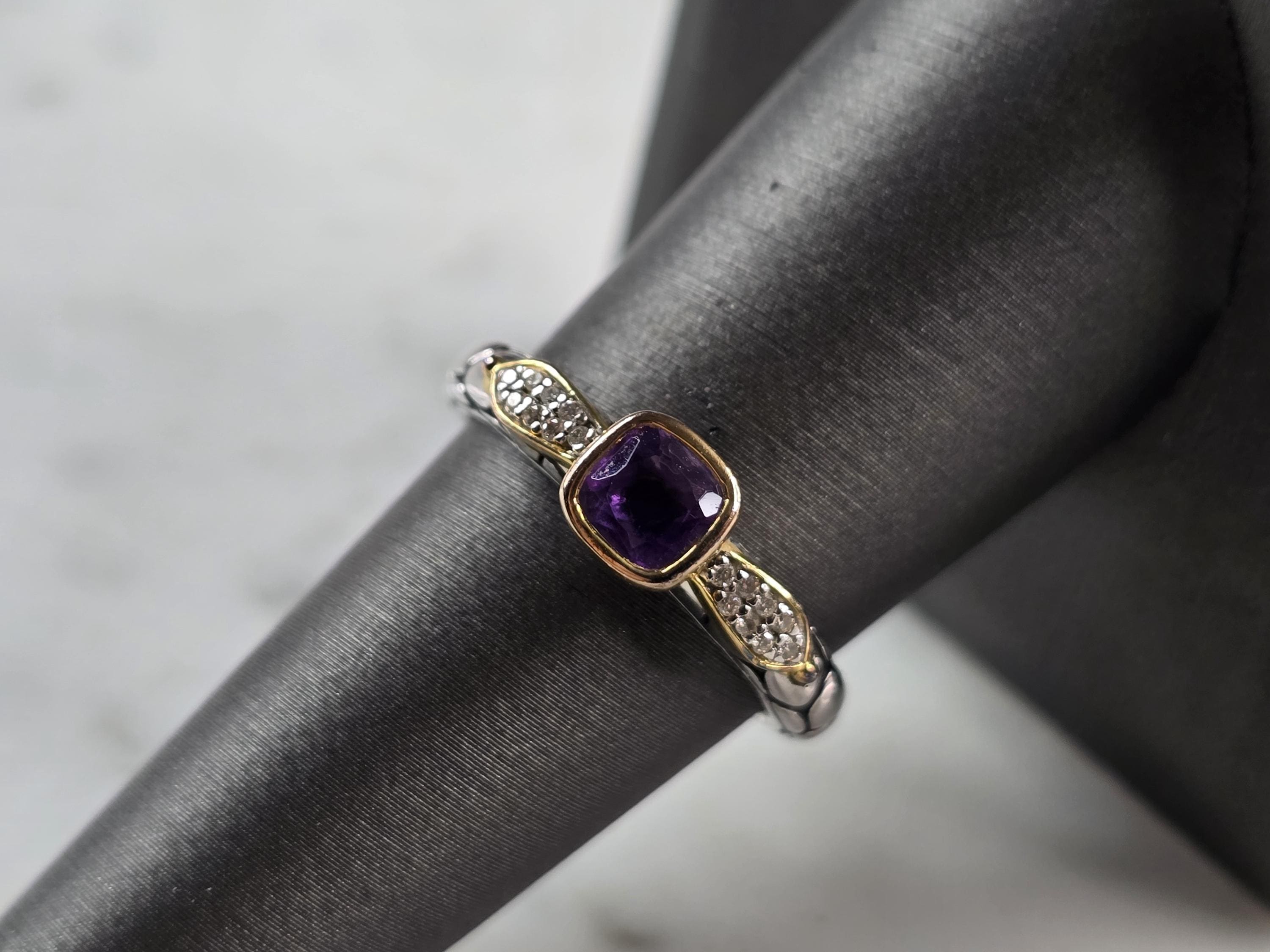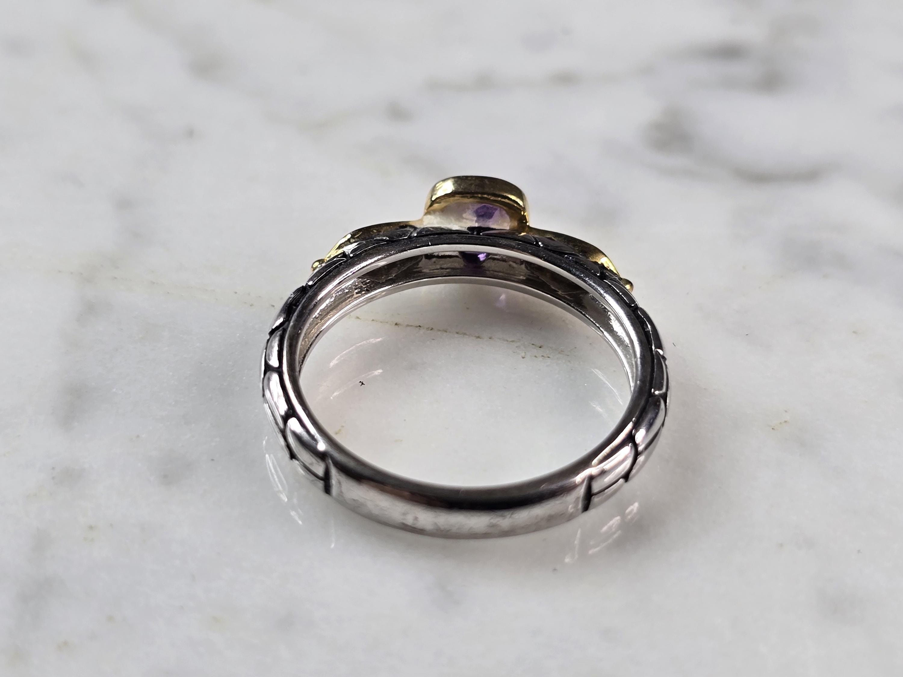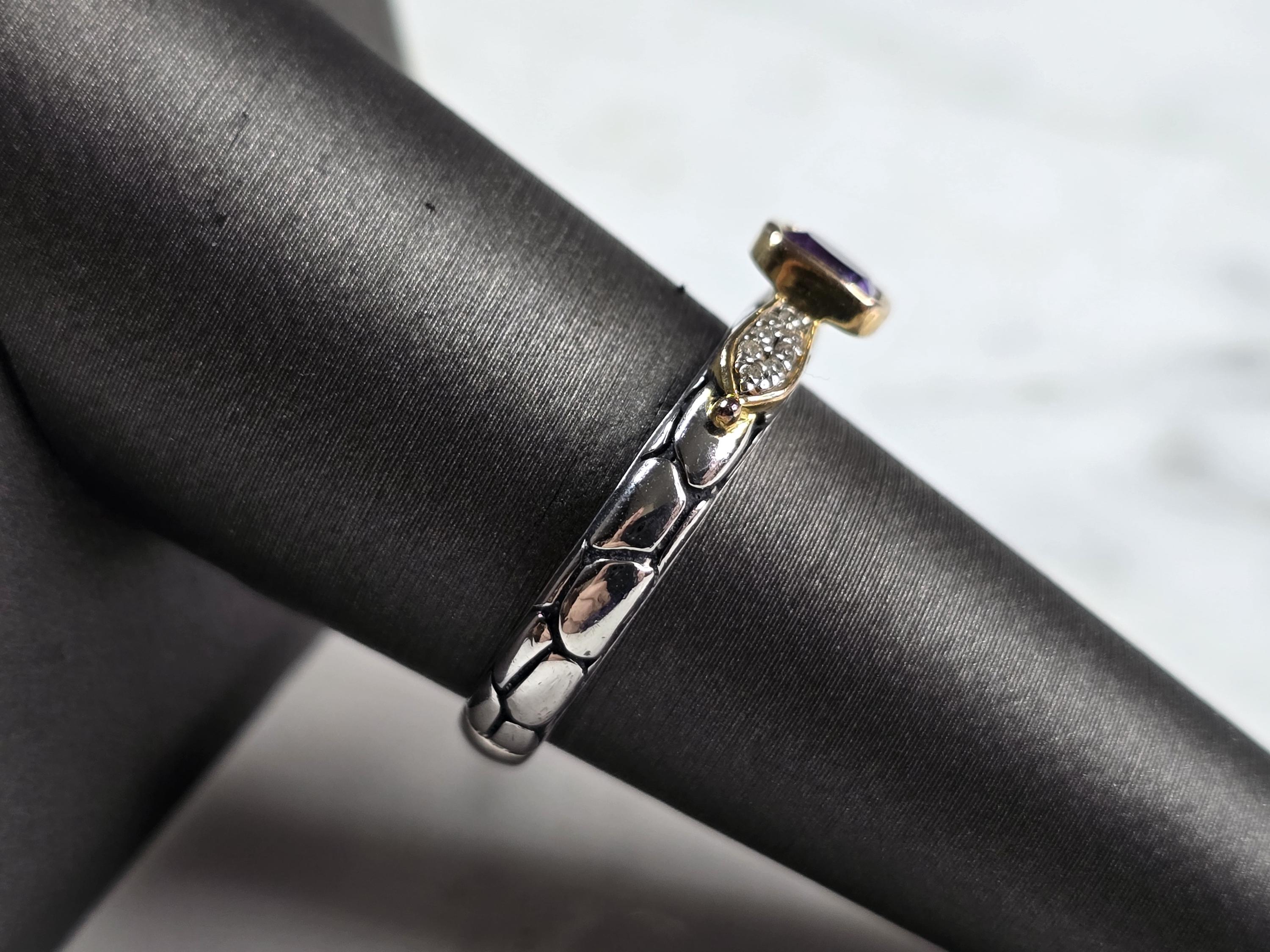 A WOMEN'S VINTAGE ESTATE STERLING SILVER MODERNIST AMETHYST RING WITH ACCENTS OF GOLD TONE. THE RING SIZE IS A 8.0, AND WEIGHS 3.4g. THE WIDTH OF THE RING IS 1/4". NOT SURE IF THE STONE IS NATURAL OR MAN MADE. THIS WOULD MAKE A NICE GIFT FOR THAT SOMEONE SPECIAL. ANY QUESTIONS PLEASE DO NOT HESITATE TO ASK. BE SURE TO CHECK OUT SOME OF MY OTHER GREAT ITEMS UP FOR SALE. THANK YOU.
