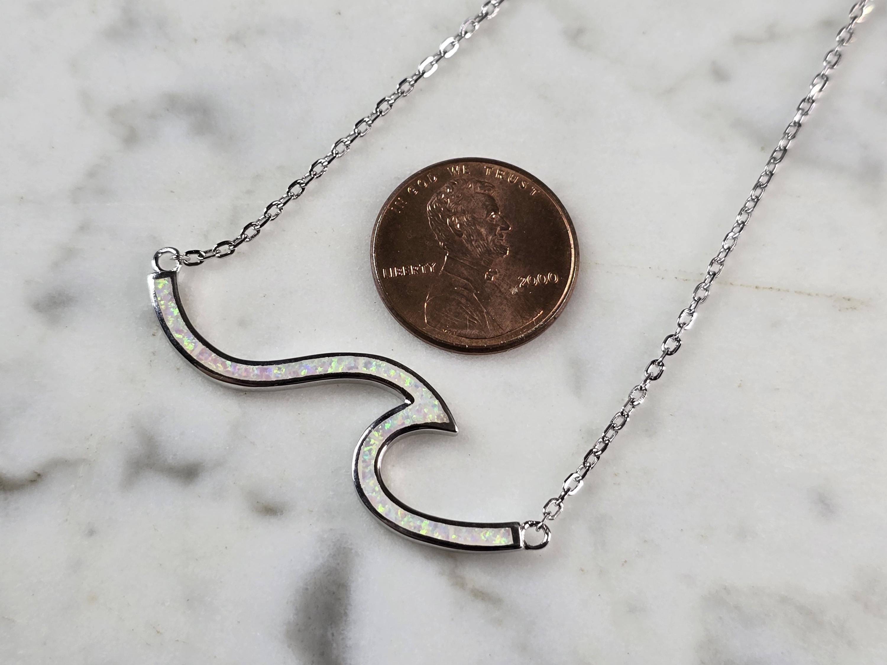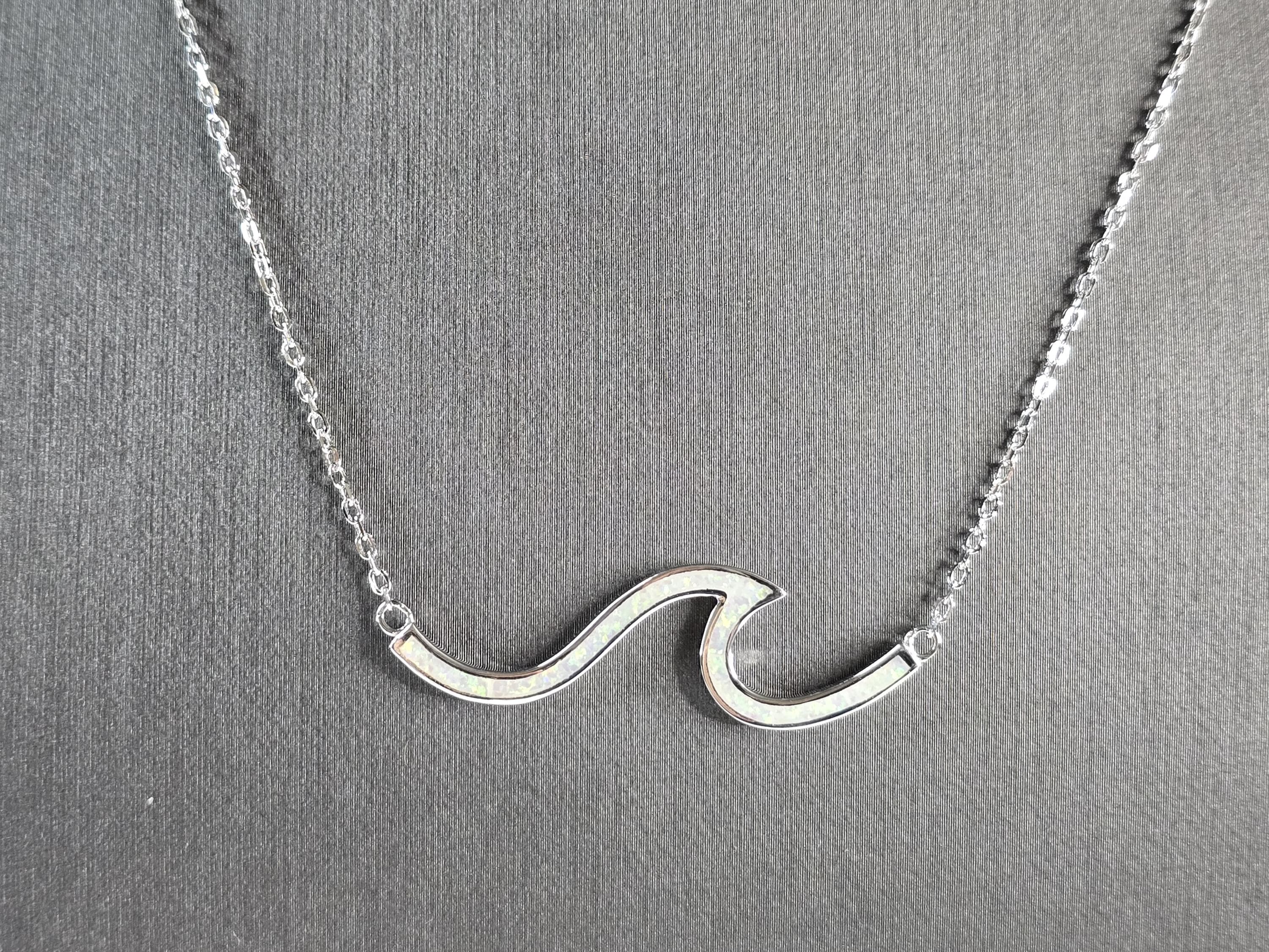 A WOMENS STERLING SILVER OPAL TSUNAMI WAVE PENDANT. THE PENDANT WITH NECKLACE WEIGHS 4.0g. THE PENDANT MEASURES 1 5/8" LONG BY 1/2" WIDE, AND THE NECKLACE MEASURES 18" LONG. NOT SURE IF STONES ARE NATURAL OR MAN MADE. MAKES A GREAT GIFT FOR THAT SOMEONE SPECIAL. ANY QUESTIONS, PLEASE ASK. BE SURE TO CHECK OUT OUR OTHER ITEMS FOR SALE.