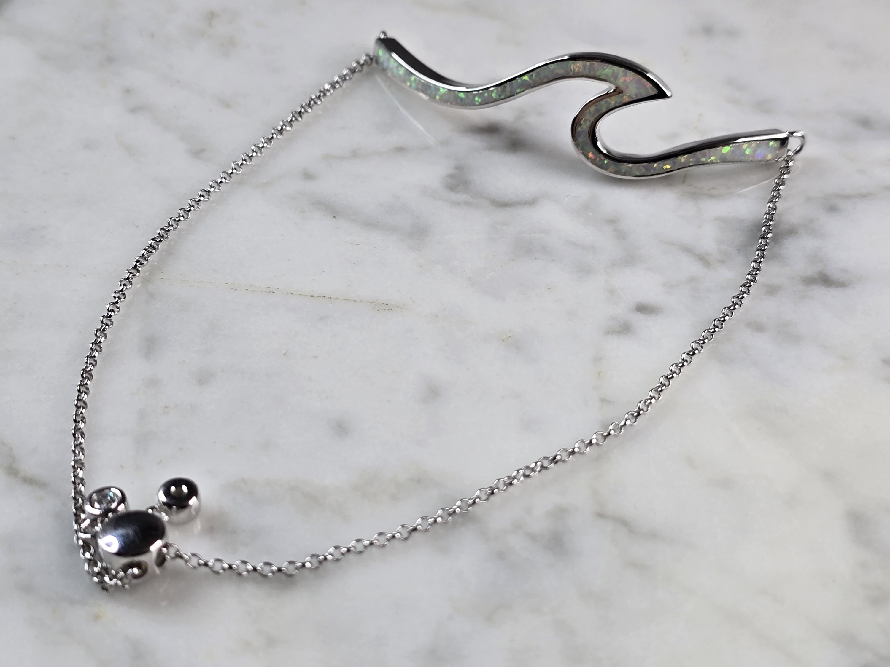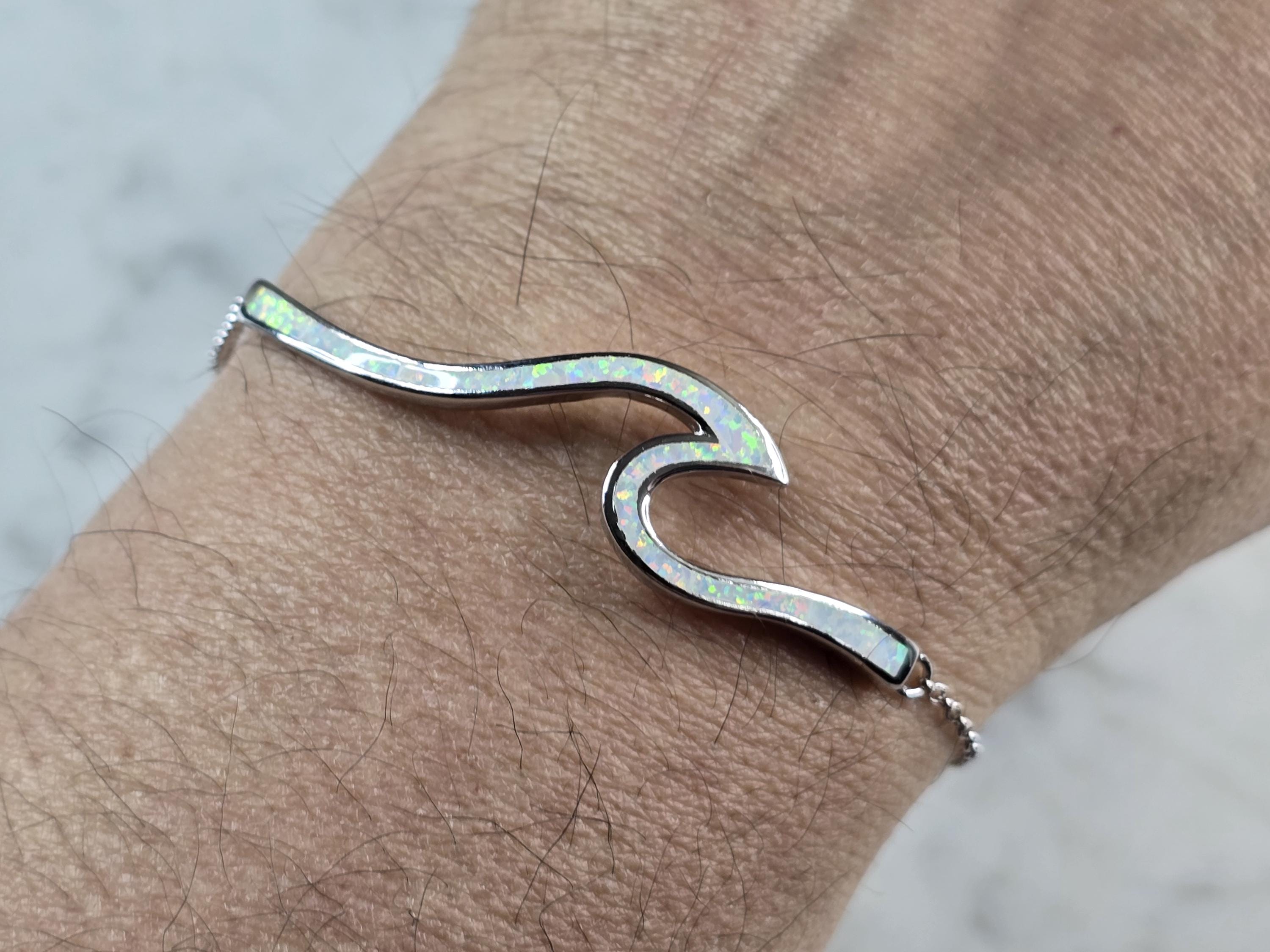 A WOMENS STERLING SILVER OPAL TSUNAMI WAVE ADJUSTABLE BRACELET. THE BRACELET WEIGHS 8.4g. THE BRACELET MEASURES 9 1/2" AT ITS MAX. THE BAR MEASURES 2 1/8" LONG BY 1/2" WIDE. NOT SURE IF STONES ARE NATURAL OR MAN MADE. MAKES A GREAT GIFT FOR THAT SOMEONE SPECIAL. ANY QUESTIONS, PLEASE ASK. BE SURE TO CHECK OUT OUR OTHER ITEMS FOR SALE.