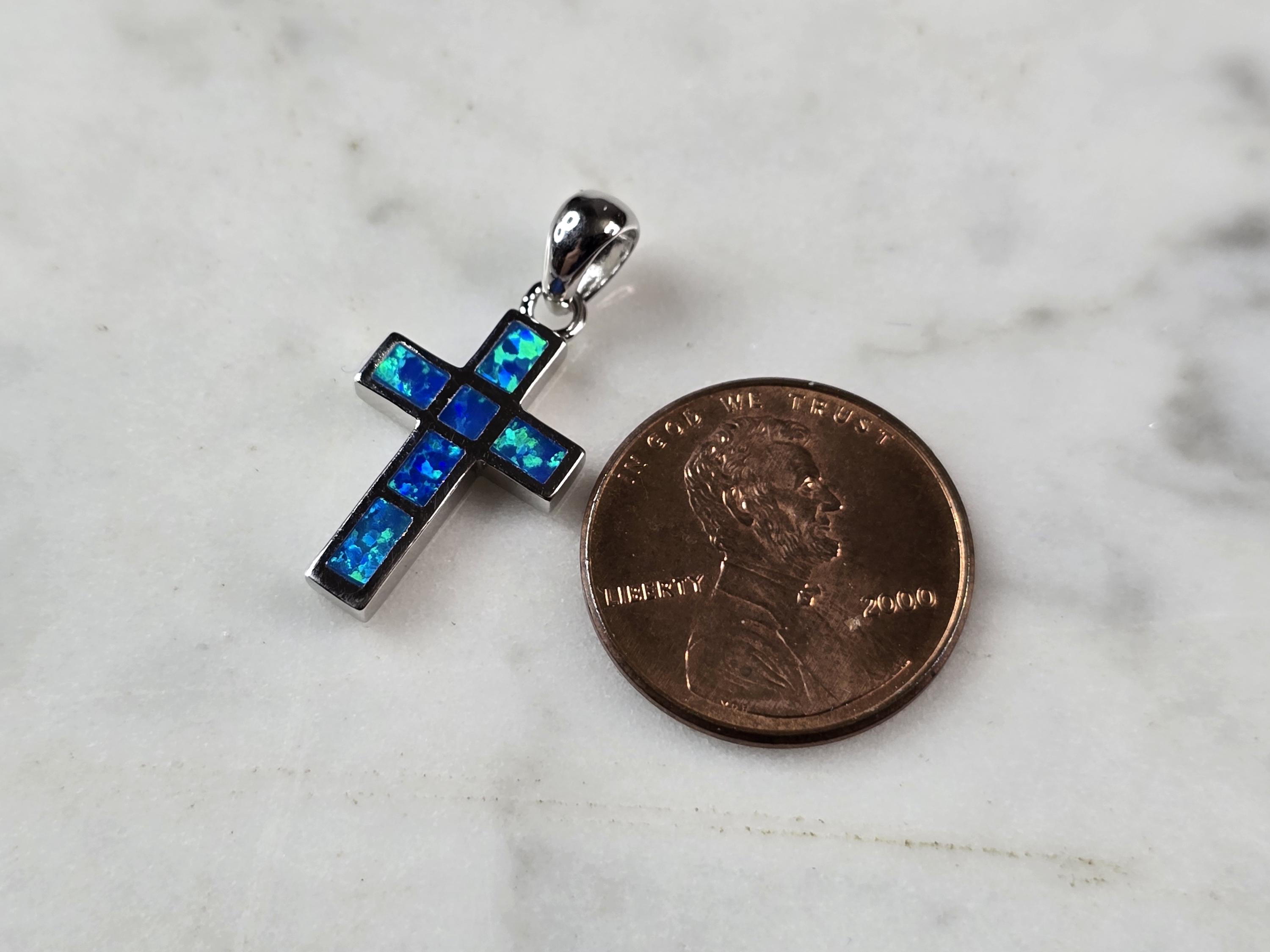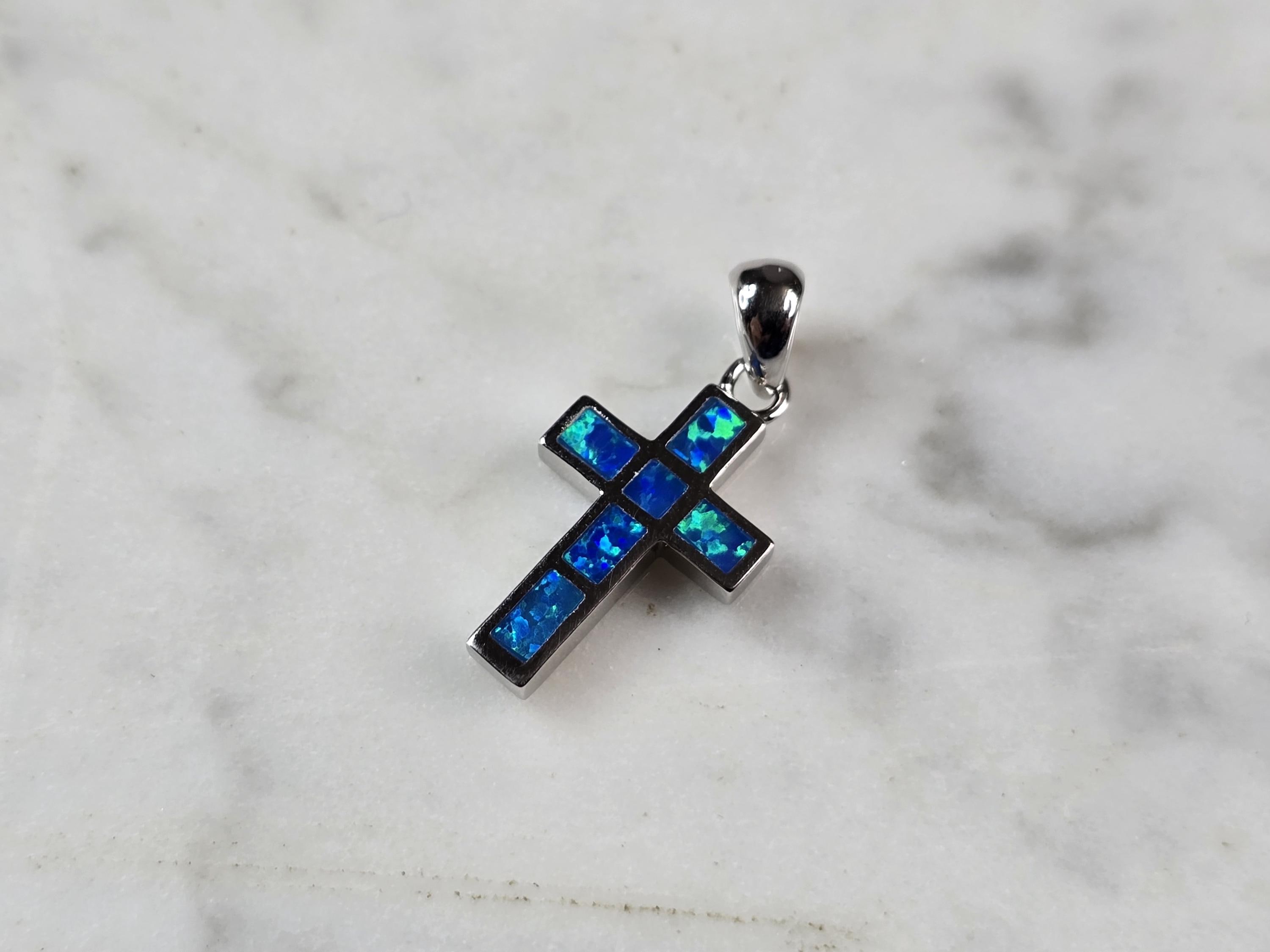 A WOMENS STERLING SILVER BLUE OPAL RELIGIOUS CROSS PENDANT. NOT SURE IF STONES ARE REAL OR MAN MADE. THE PENDANT WEIGHS 1.8g AND MEASURES 7/8" LONG BY 1/2" WIDE. MAKES A GREAT GIFT FOR THAT SOMEONE SPECIAL. ANY QUESTIONS, PLEASE ASK. BE SURE TO CHECK OUT OUR OTHER ITEMS FOR SALE.