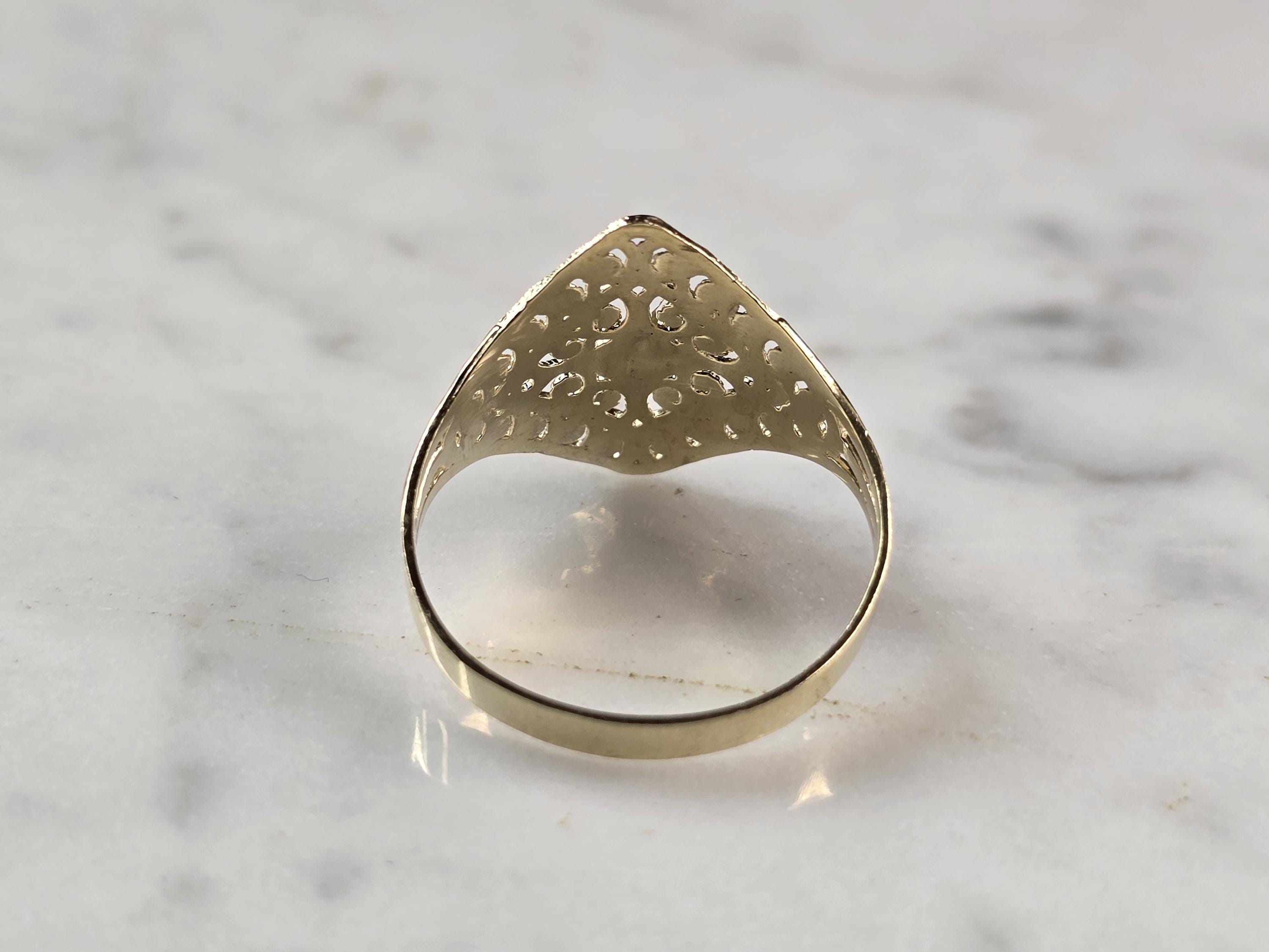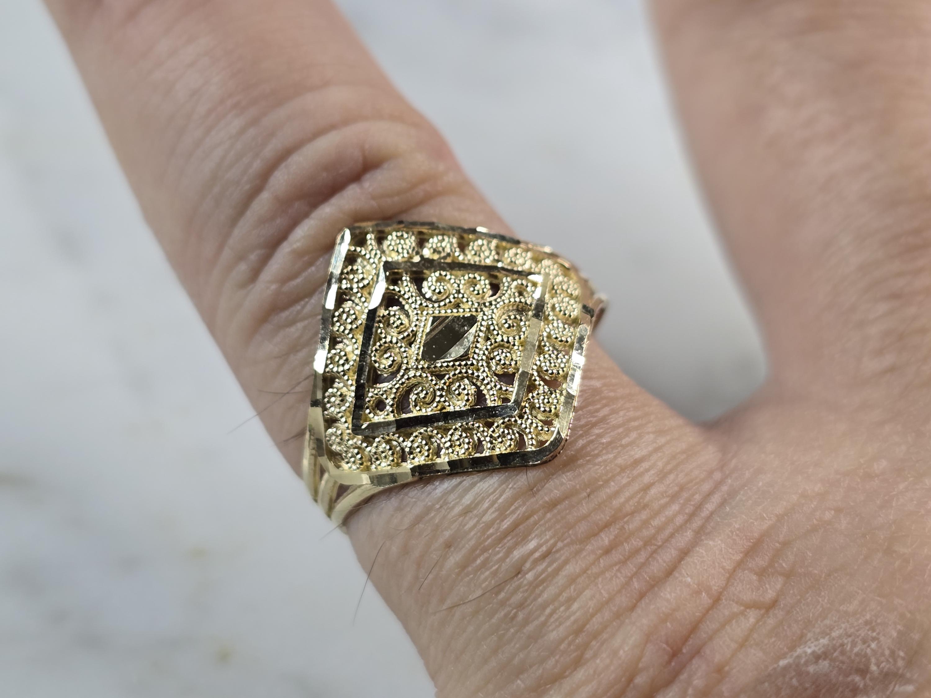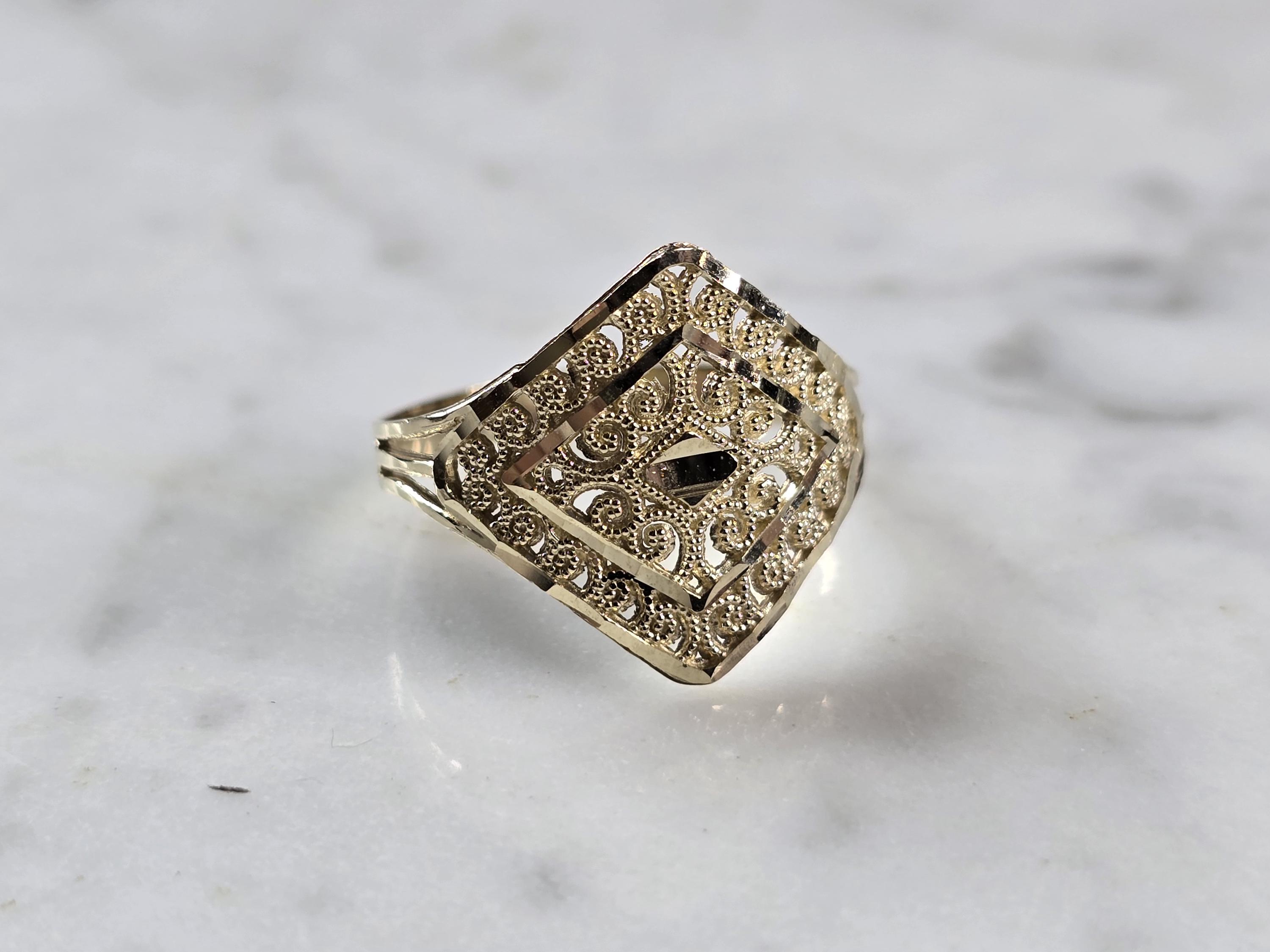 A WOMENS 10K YELLOW GOLD MODERNIST FILIGREE RING. THE RING IS A SIZE 8.75 AND WEIGHS 1.6g. THE WIDTH OF THE RING IS 3/4". THE RING MAKES A LOVELY GIFT FOR THAT SOMEONE SPECIAL. ANY QUESTIONS, PLEASE ASK. BE SURE TO CHECK OUT SOME OF MY OTHER GREAT ITEMS UP FOR SALE. THANK YOU