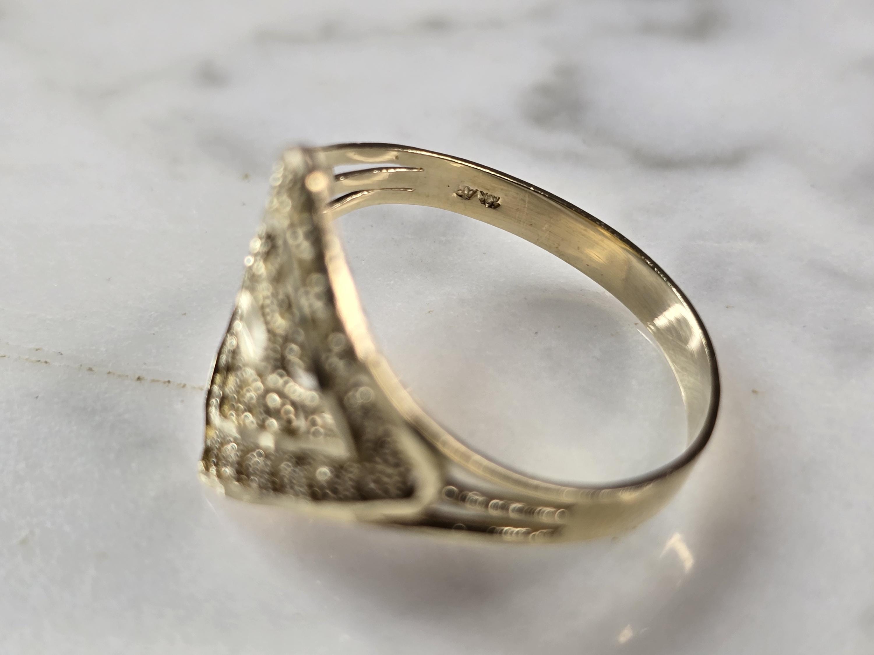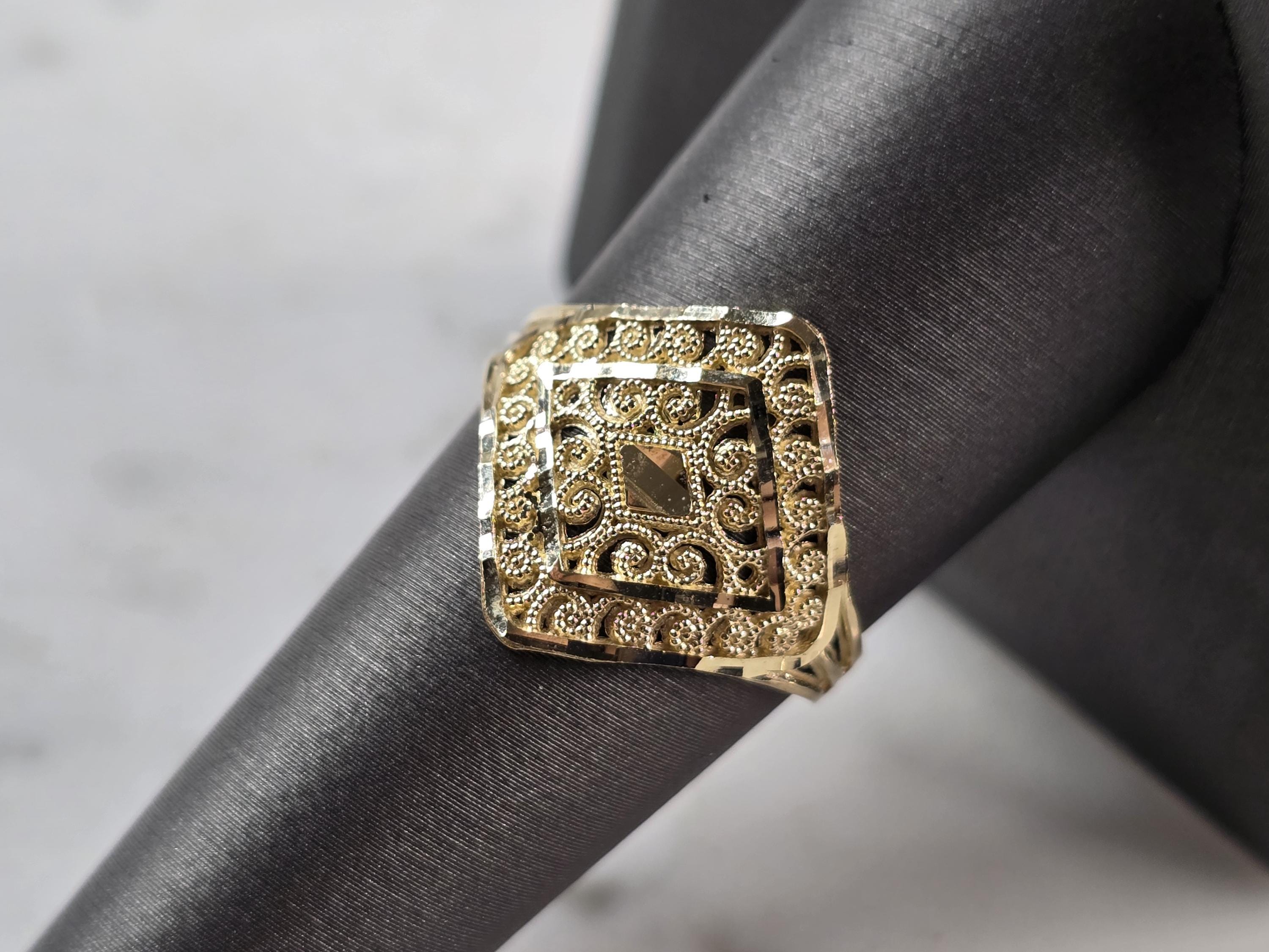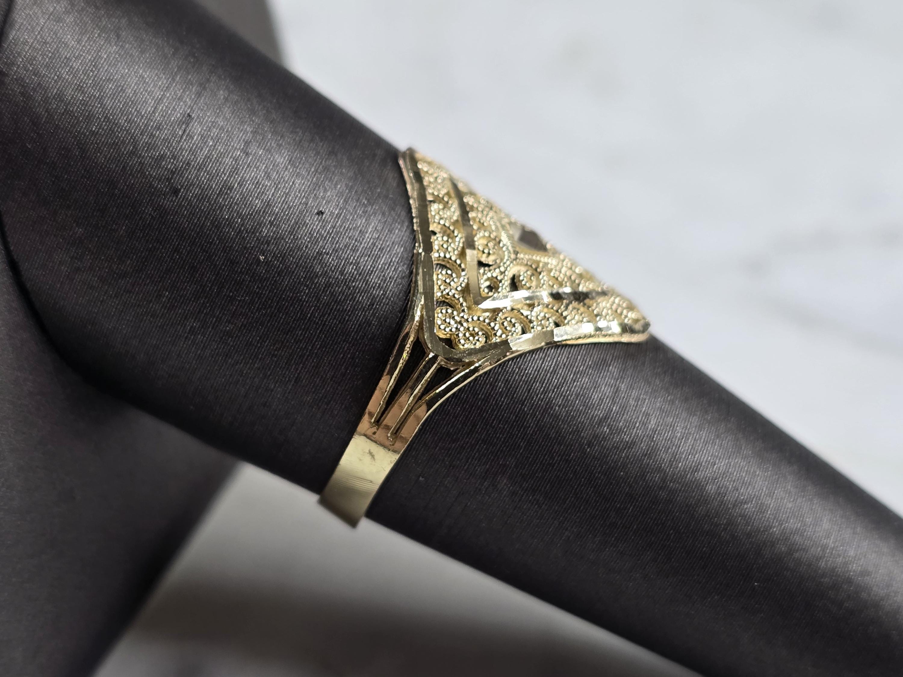 A WOMENS 10K YELLOW GOLD MODERNIST FILIGREE RING. THE RING IS A SIZE 8.75 AND WEIGHS 1.6g. THE WIDTH OF THE RING IS 3/4". THE RING MAKES A LOVELY GIFT FOR THAT SOMEONE SPECIAL. ANY QUESTIONS, PLEASE ASK. BE SURE TO CHECK OUT SOME OF MY OTHER GREAT ITEMS UP FOR SALE. THANK YOU
