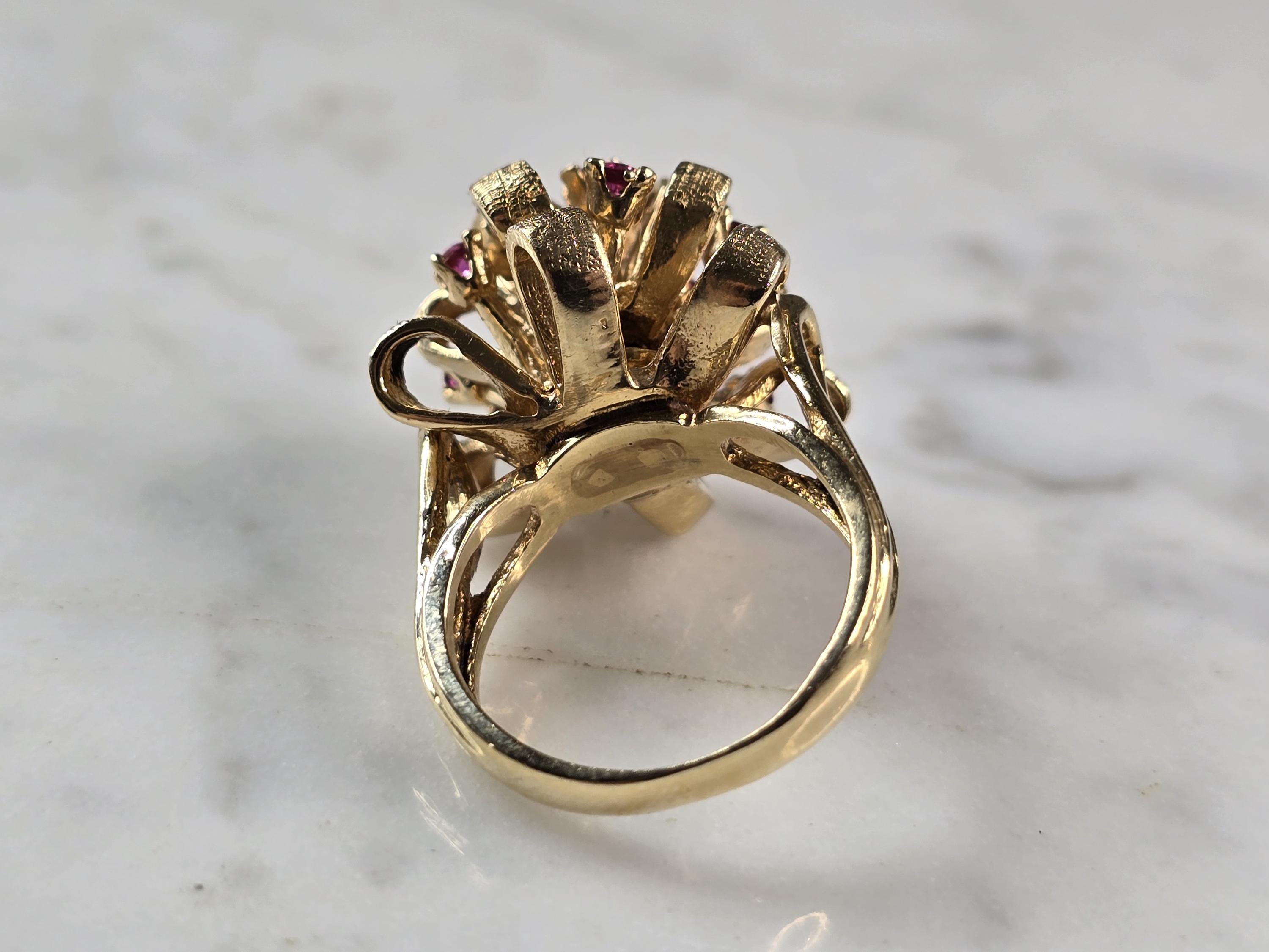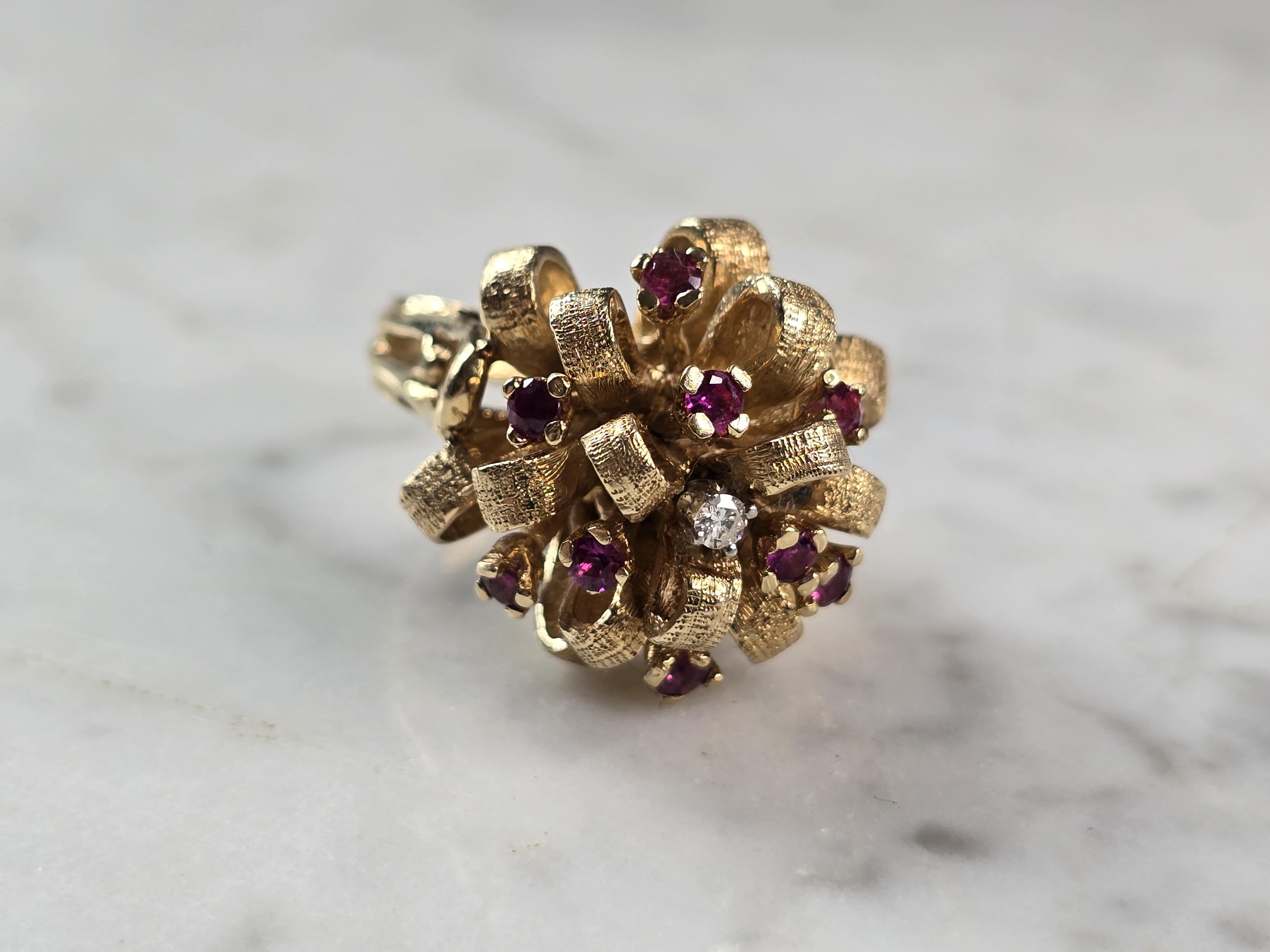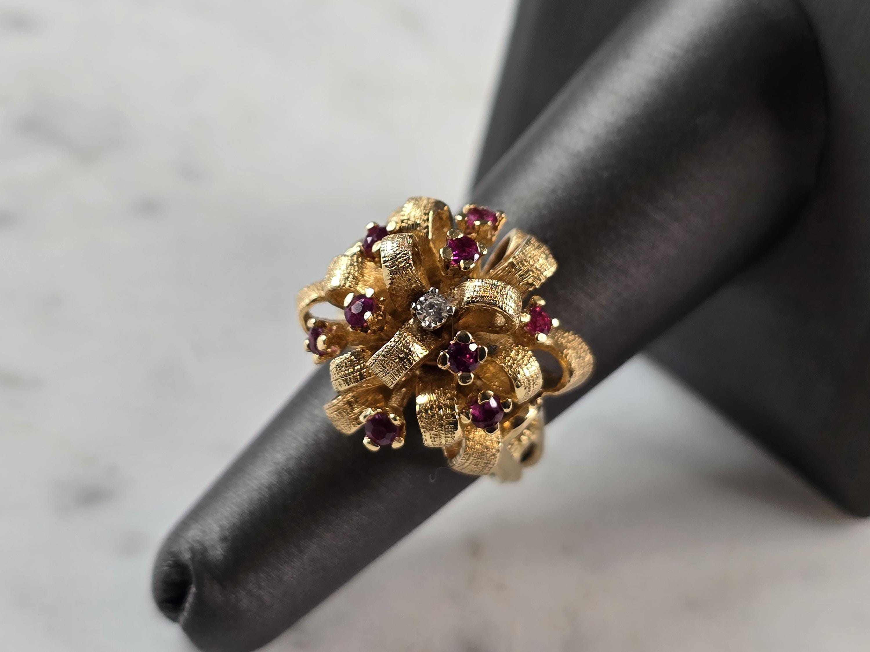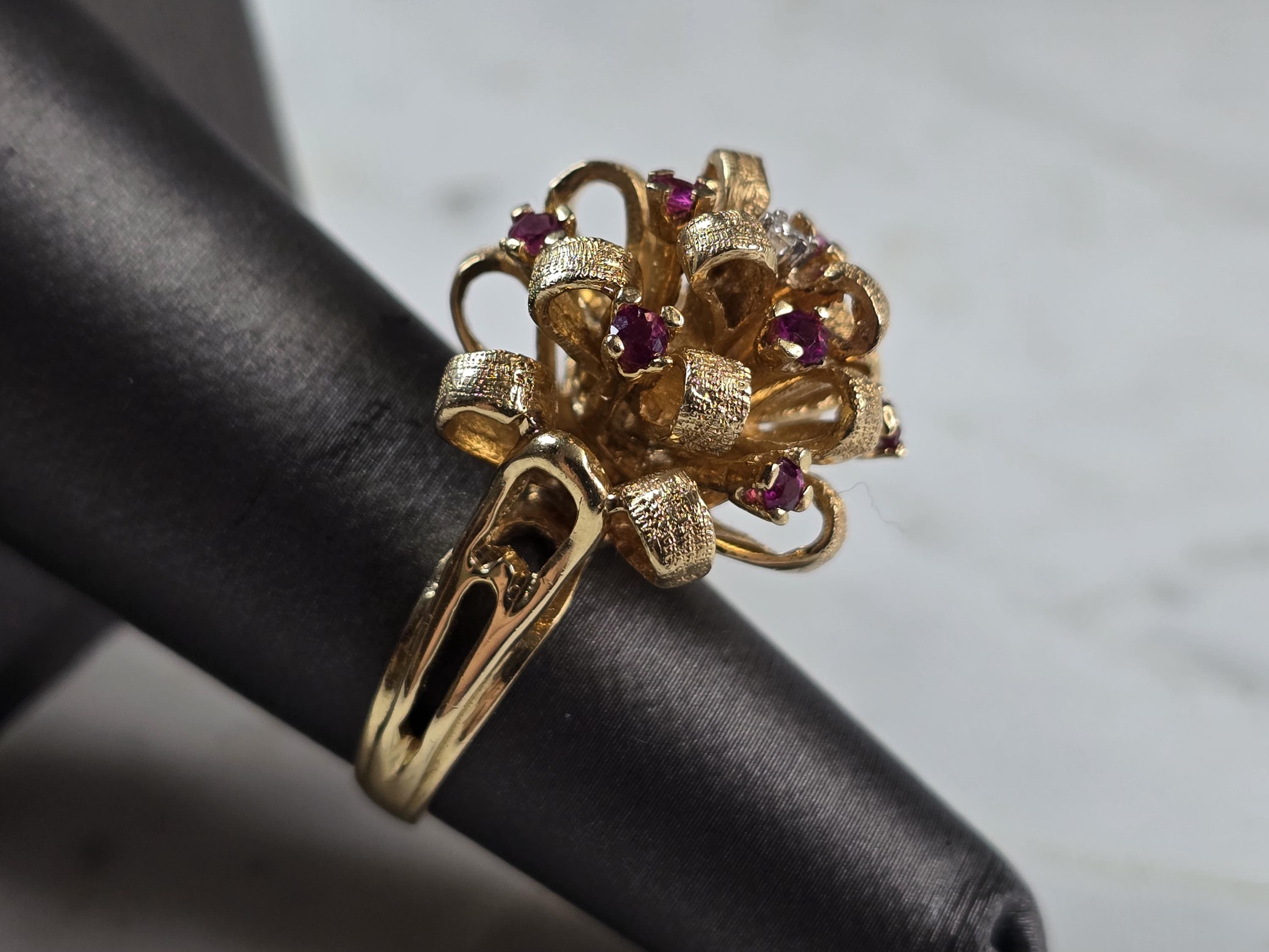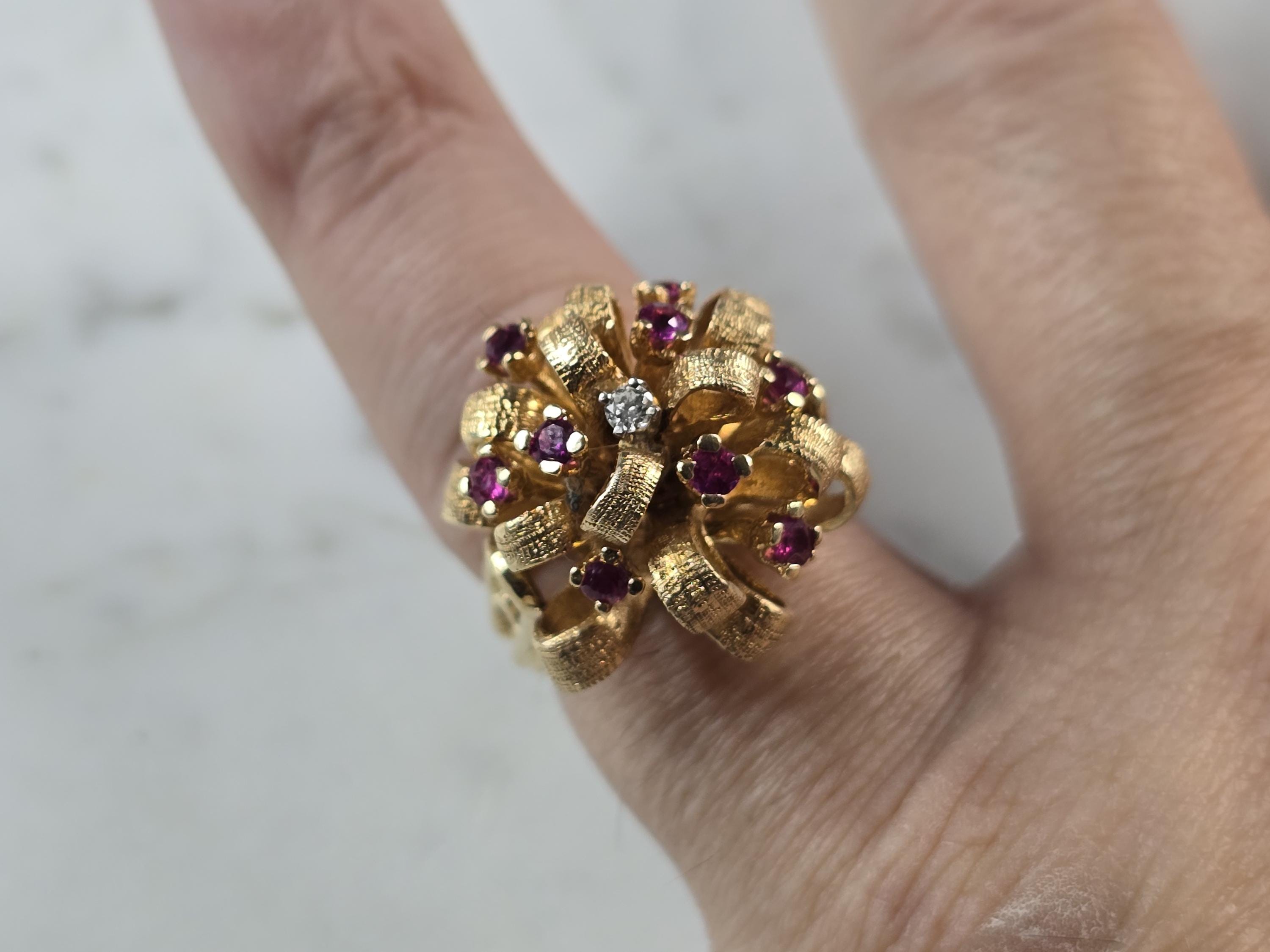 A WOMEN'S VINTAGE ESTATE 14K GOLD RUBY AND DIAMOND COCKTAIL RING. THERE ARE 12 SMALL RUBIES AND THE DIAMOND IS ABOUT .05 TO .07cts. THE RING IS A SIZE 6.0, AND WEIGHS 13.0g. THE WIDTH OF THE RING IS ABOUT 3/4". THIS IS A BEAUTIFUL, IMPRESSIVE GIFT FOR THAT SOMEONE SPECIAL. ANY QUESTIONS, PLEASE DON'T HESITATE TO ASK. BE SURE TO CHECK OUT SOME OF MY OTHER GREAT ITEMS UP FOR SALE. THANK YOU.