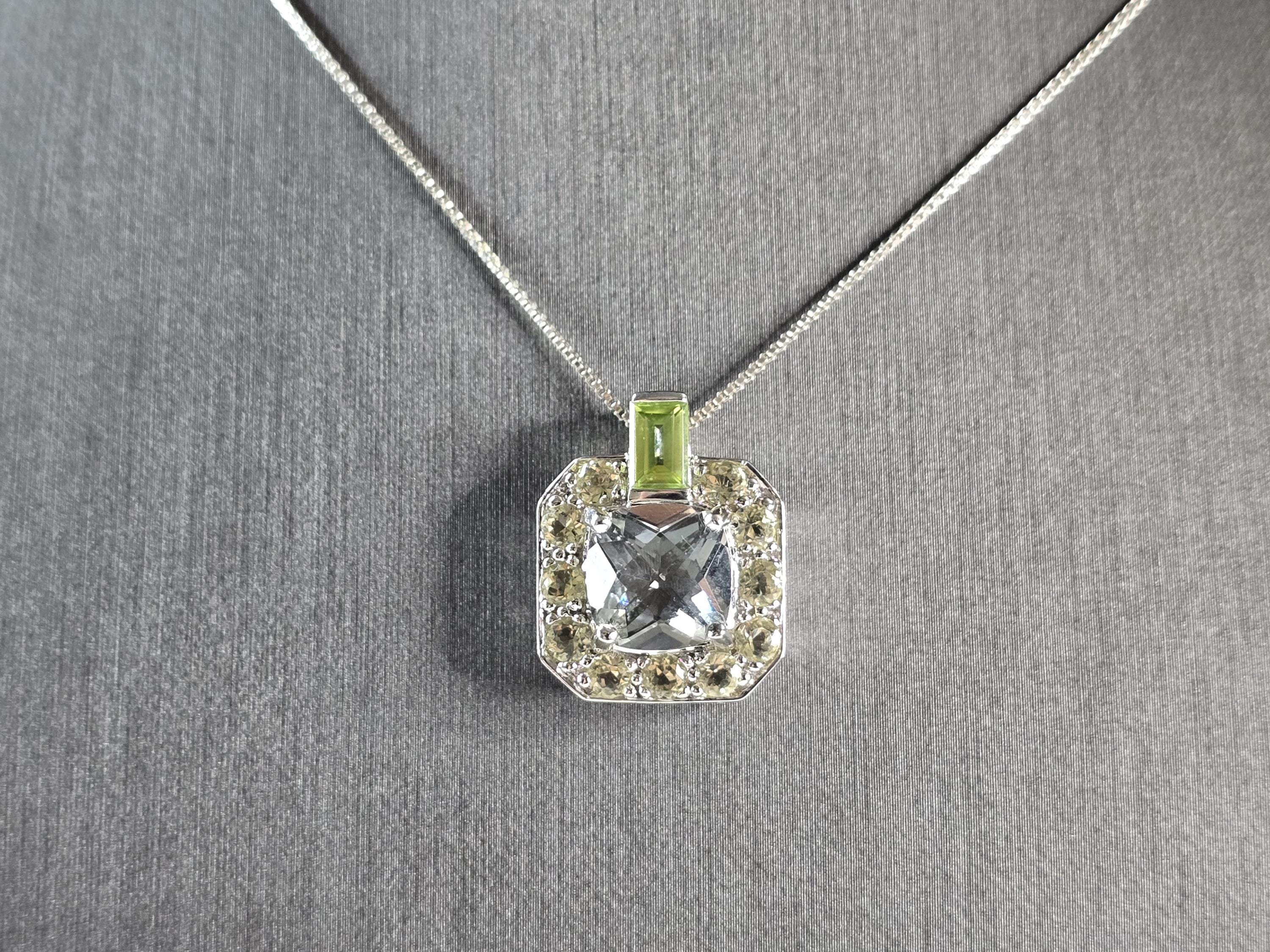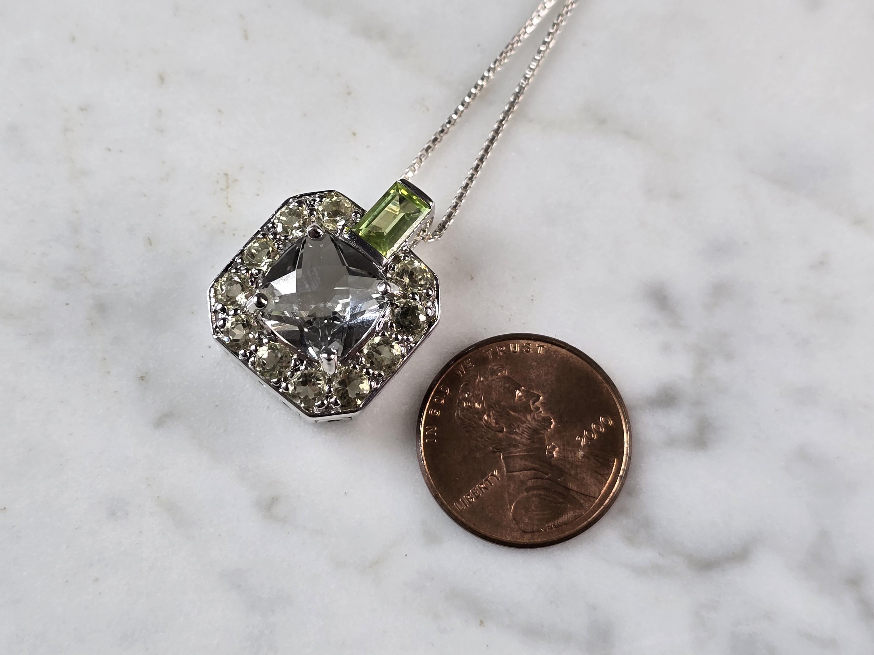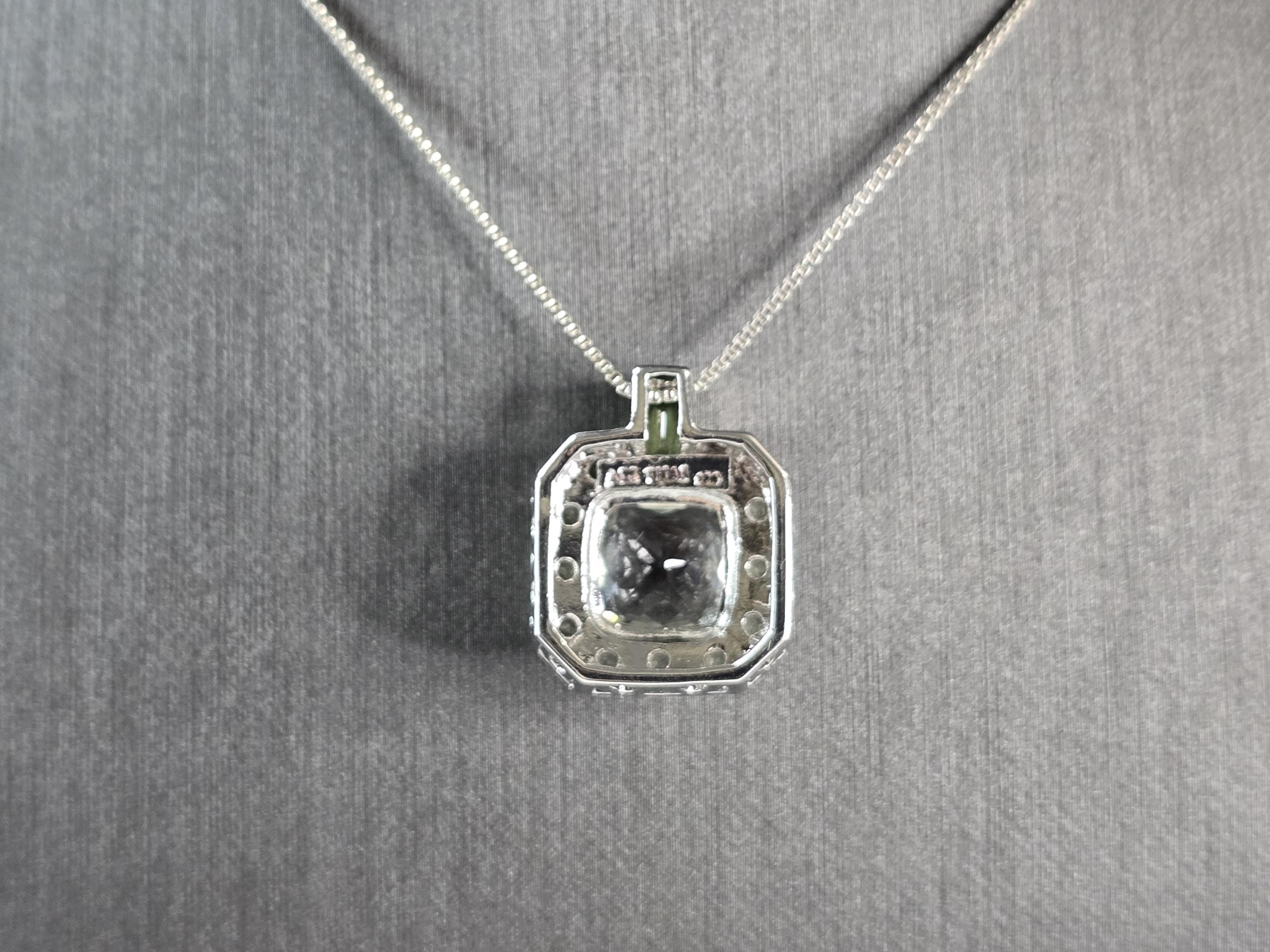 A WOMENS VINTAGE ESTATE STERLING SILVER CZ, PERIDOT COLORED PENDANT NECKLACE. NOT SURE IF THE STONES IS NATURAL OR MAN MADE. THE TOTAL WEIGHT IS 9.0g. NECKLACE MEASURES 18" LONG, AND THE PENDANT IS 7/8" BY 5/8". MAKES A GREAT GIFT FOR THAT SPECIAL SOMEONE. ANY QUESTIONS PLEASE DONT HESITATE TO ASK. BE SURE TO CHECK OUT SOME OF MY OTHER GREAT ITEMS UP FOR SALE. THANK YOU.