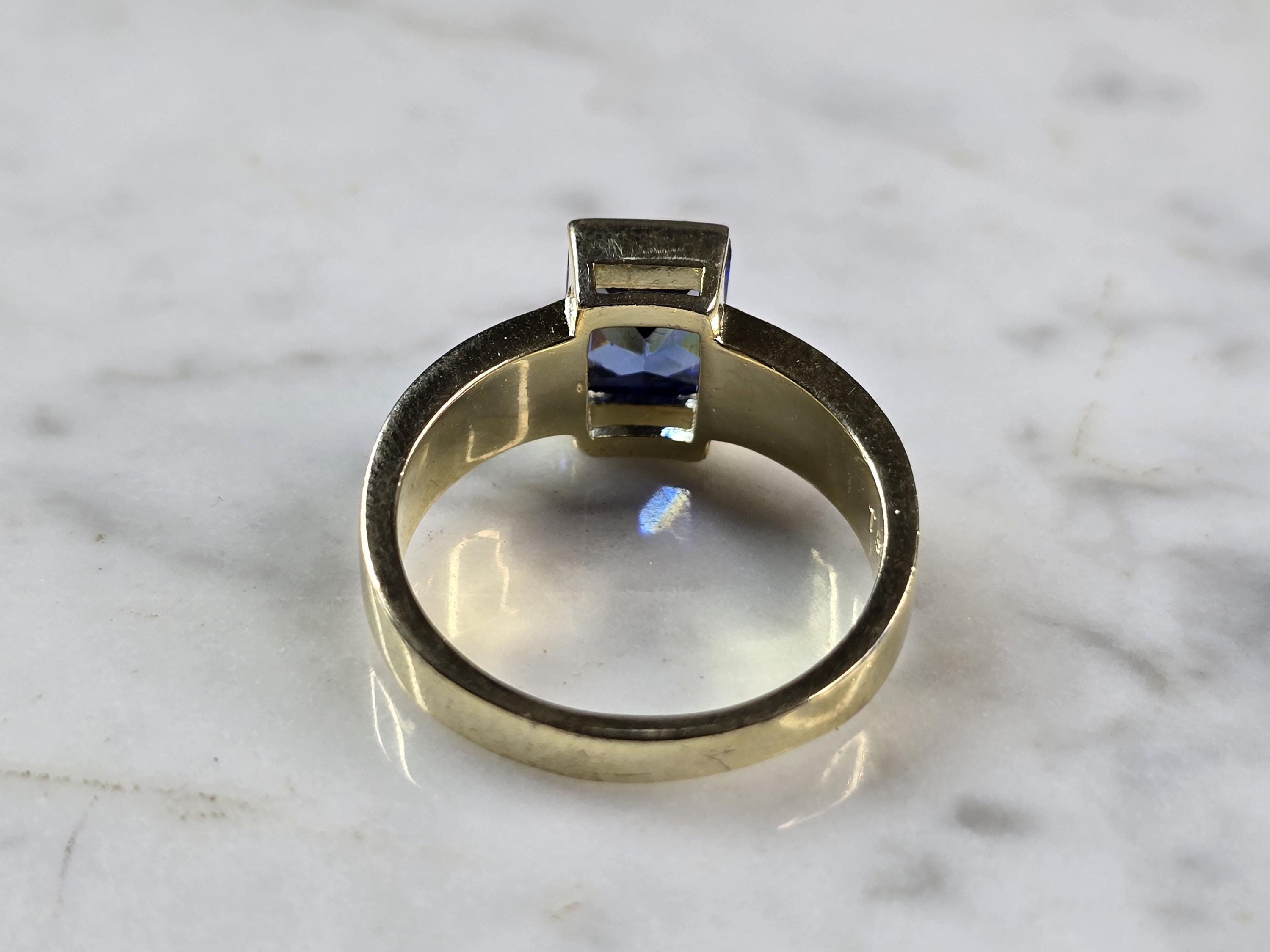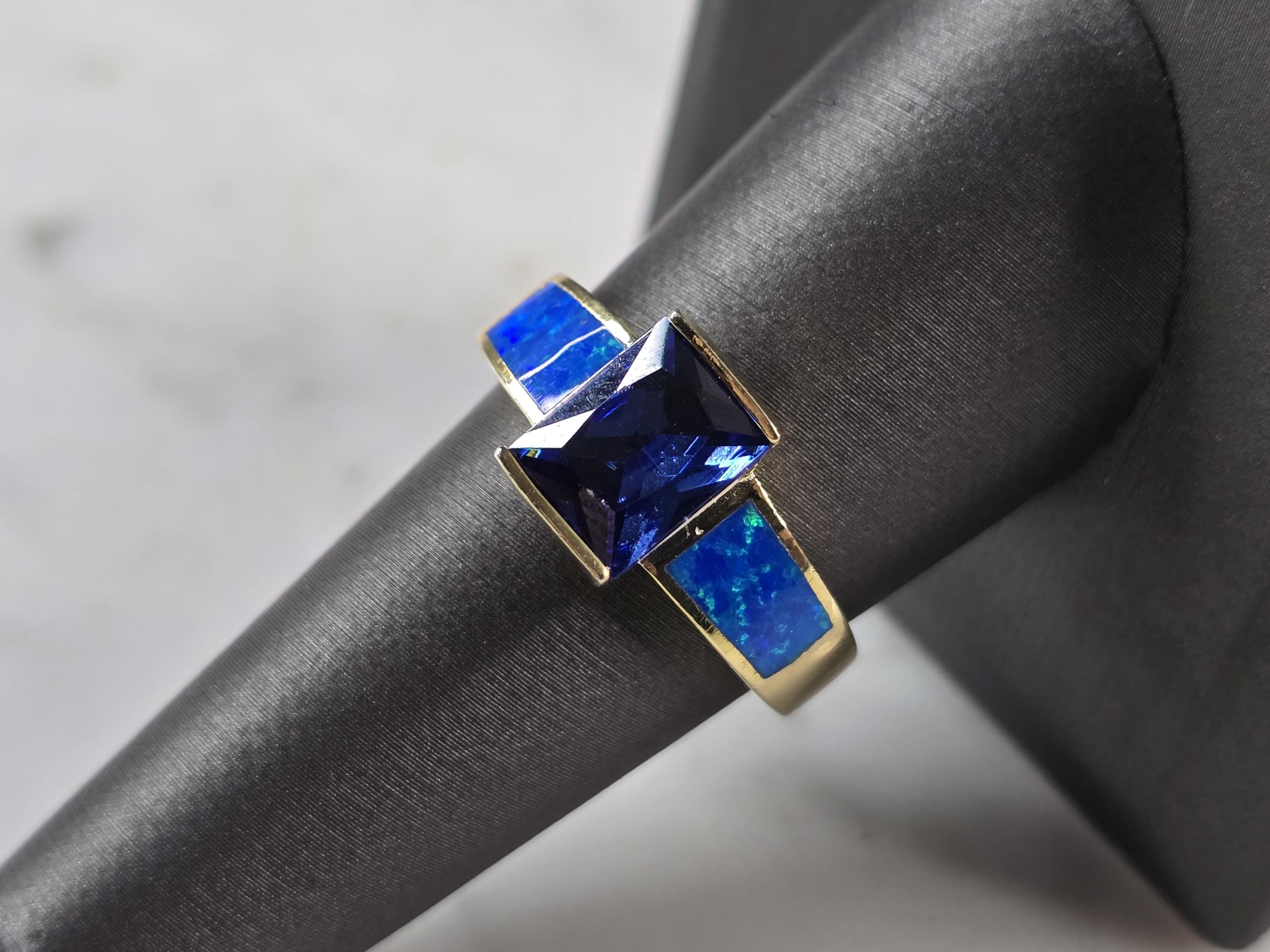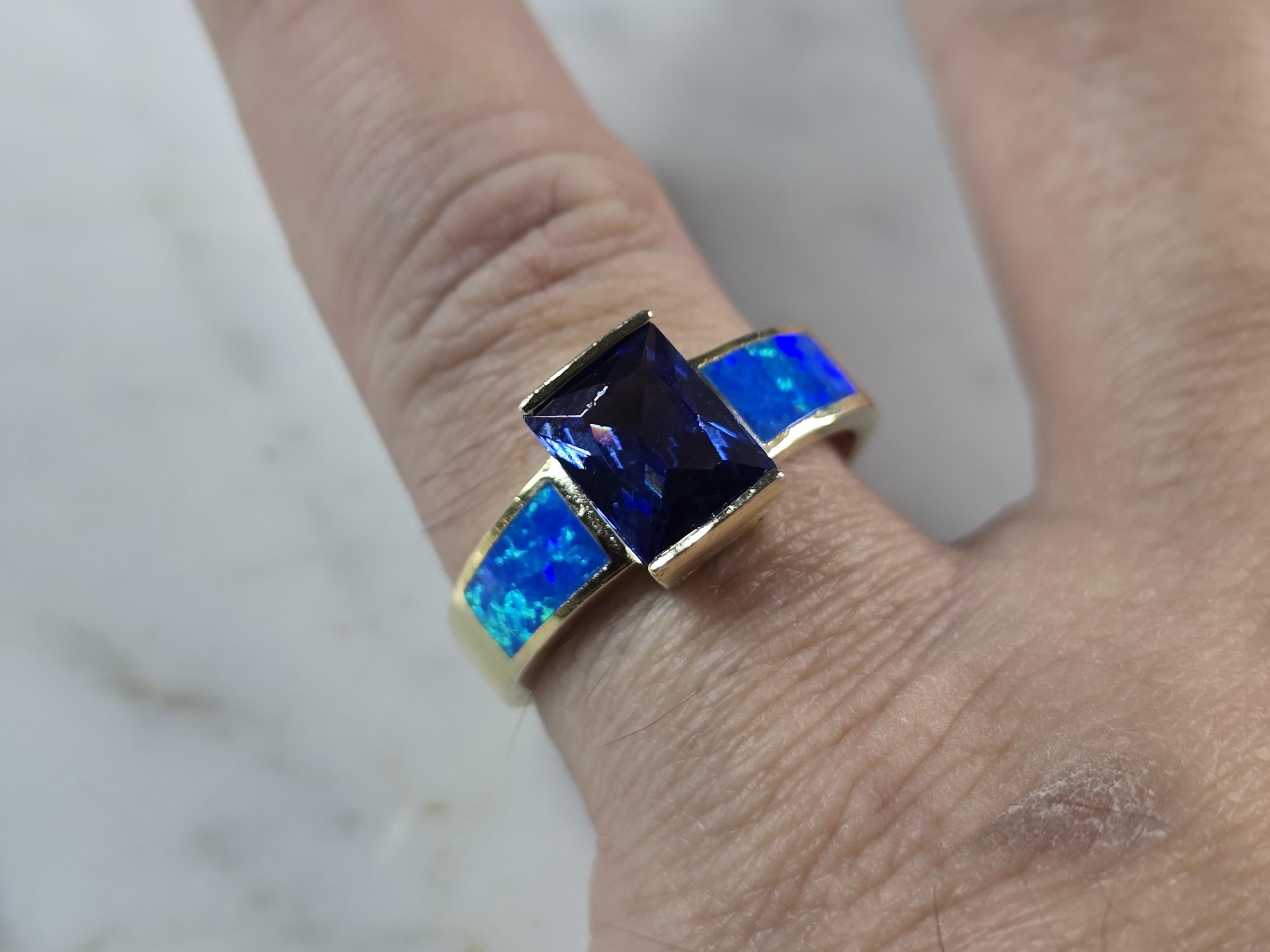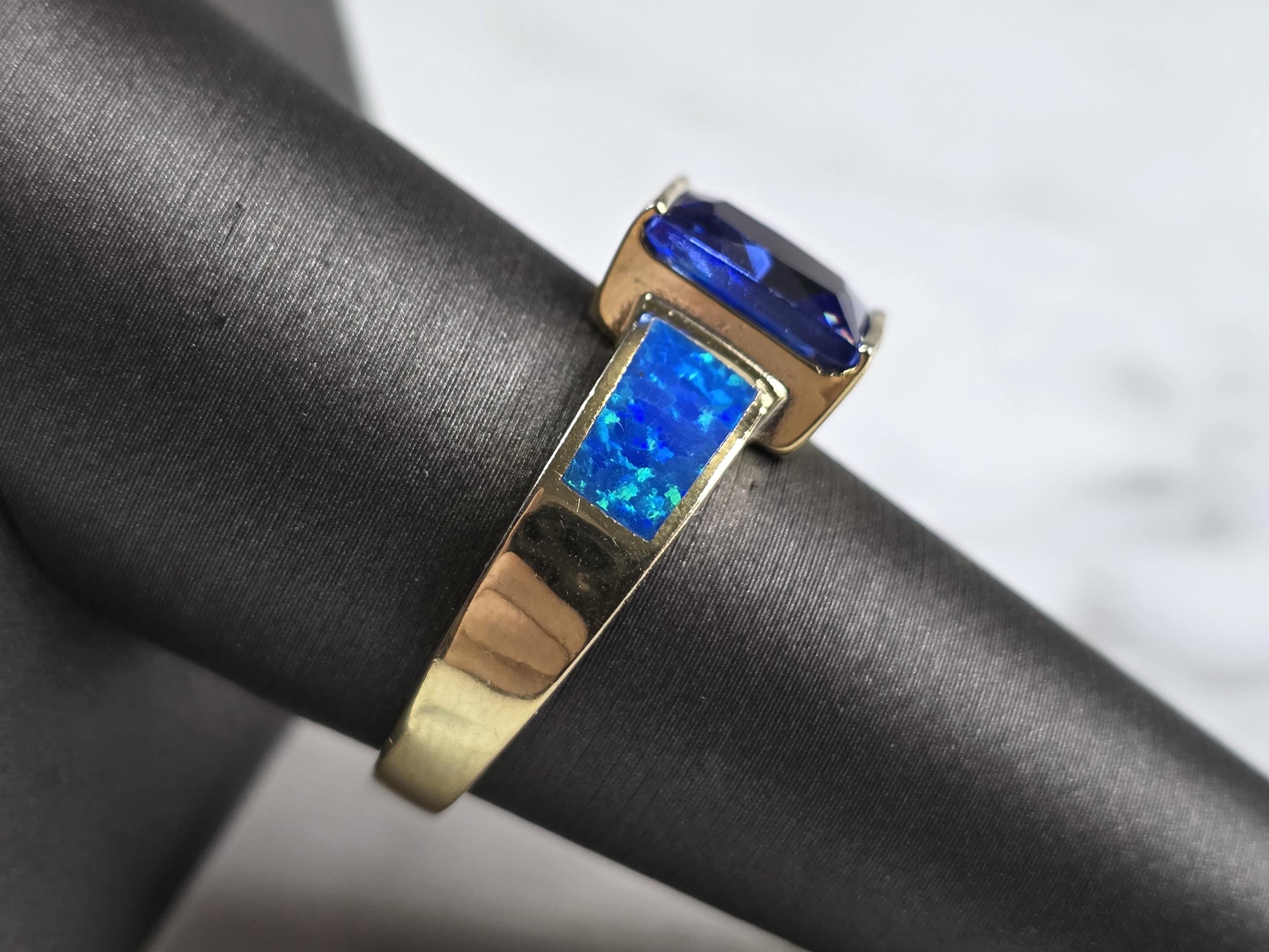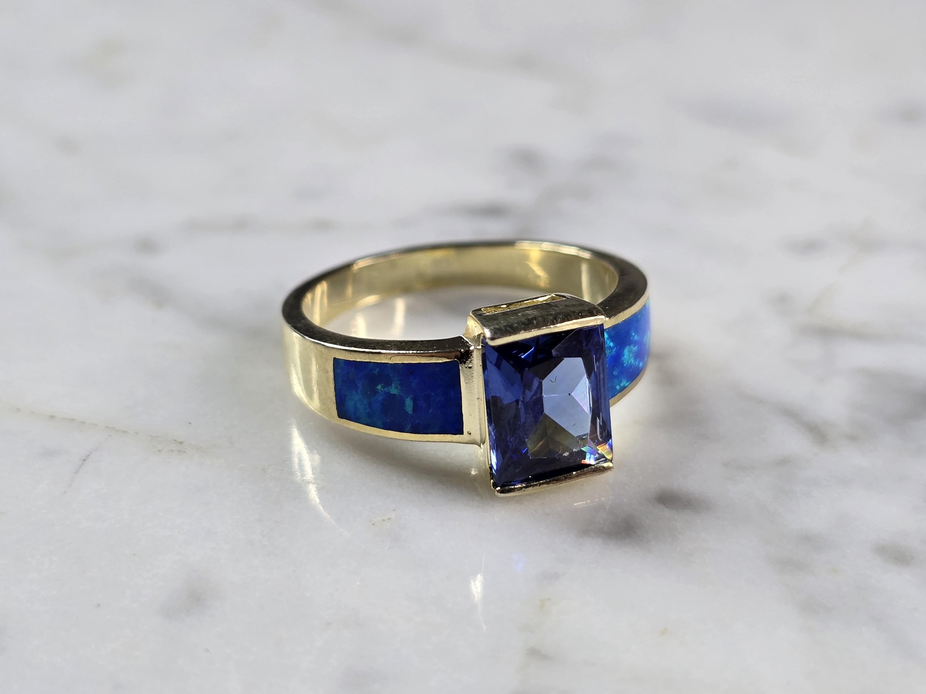 A WOMENS STERLING SILVER GOLD ONE BLUE OPAL & TANZANITE COLORED RING. THE RING IS A SIZE 9.0, AND WEIGHS 5.6g. WIDTH OF RING MEASURES 3/8". NOT SURE IF STONE IS NATURAL OR MAN MADE. THE RING MAKES A BEAUTIFUL GIFT FOR THAT SOMEONE SPECIAL. ANY QUESTIONS, PLEASE ASK. BE SURE TO CHECK OUT SOME OF MY OTHER GREAT ITEMS UP FOR SALE. THANK YOU.