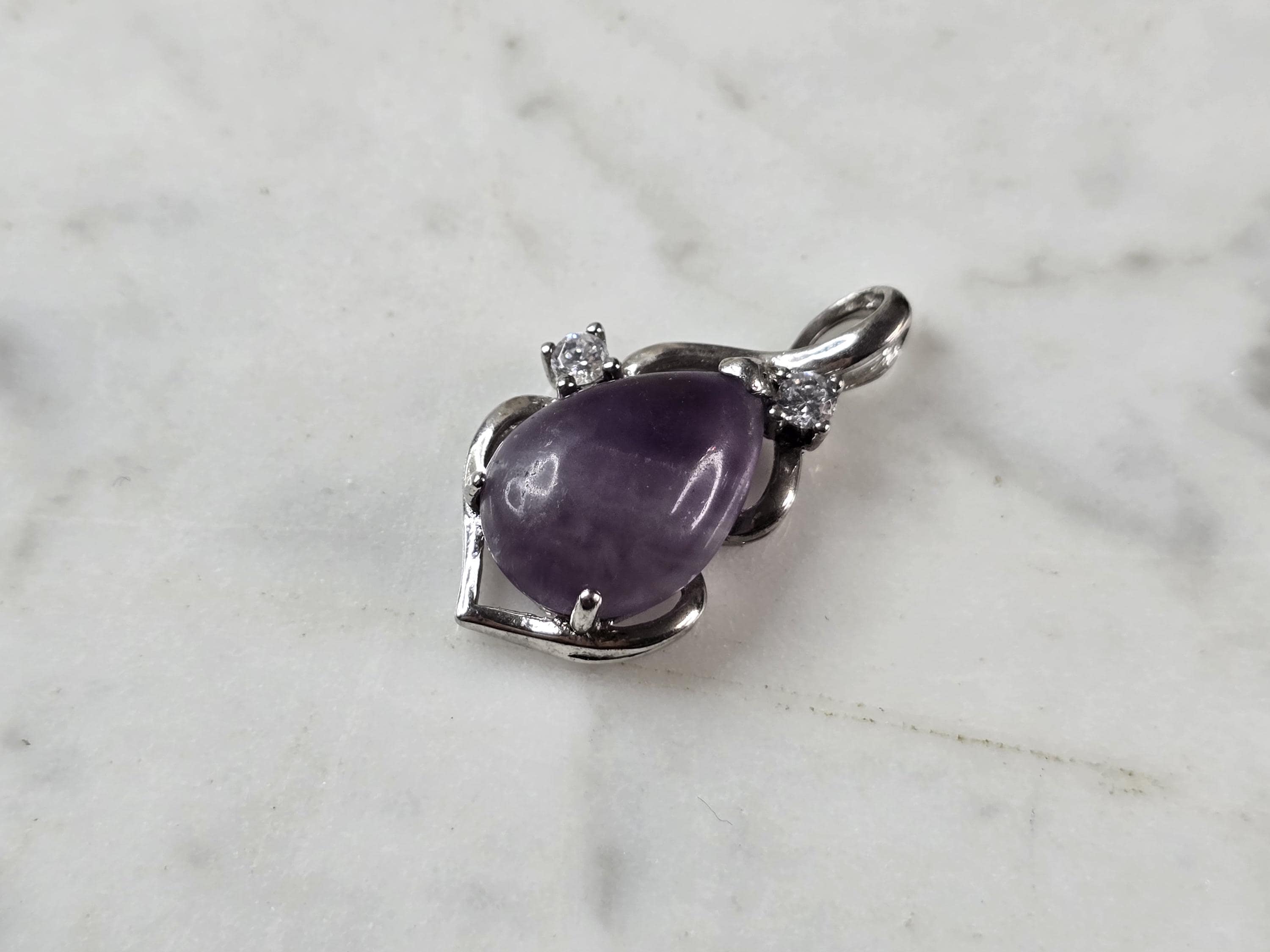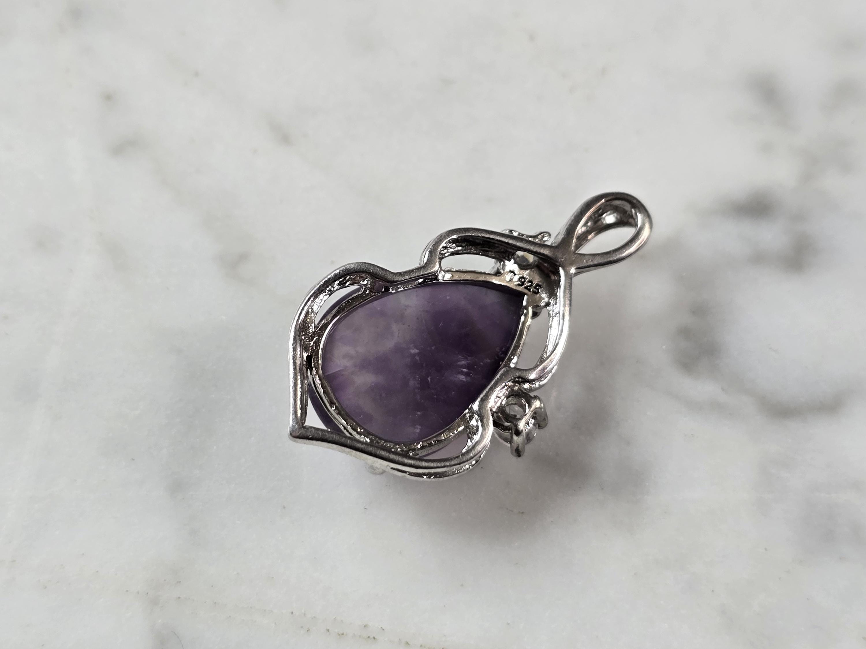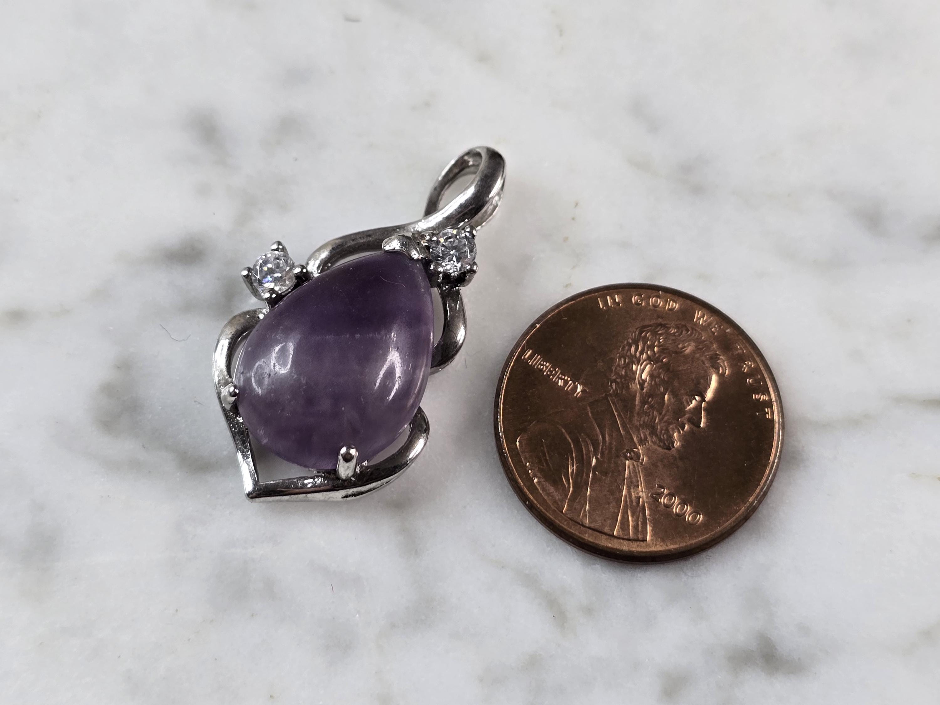 A WOMENS ESTATE STERLING SILVER AMETHYST PENDANT . THE PENDANT MEASURES 1 1/8" LONG BY 5/8" WIDE, AND WEIGHS 3.4g. WOULD MAKE A GREAT GIFT FOR THAT SPECIAL SOMEONE. ANY QUESTIONS PLEASE DO NOT HESITATE TO ASK. BE SURE TO CHECK OUT SOME OF MY OTHER GREAT ITEMS UP FOR SALE. THANK YOU.