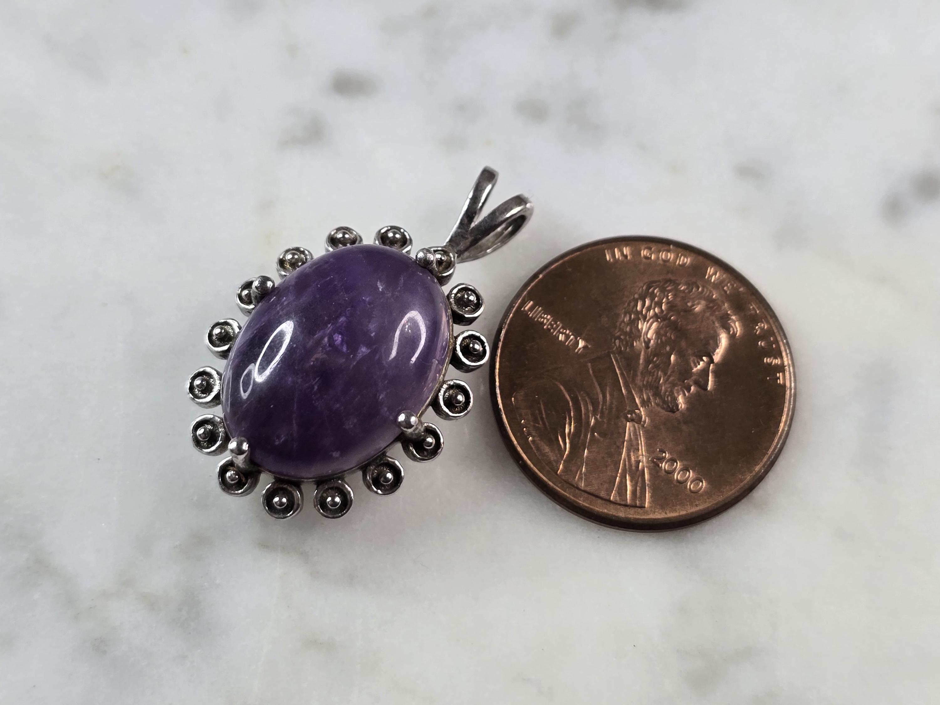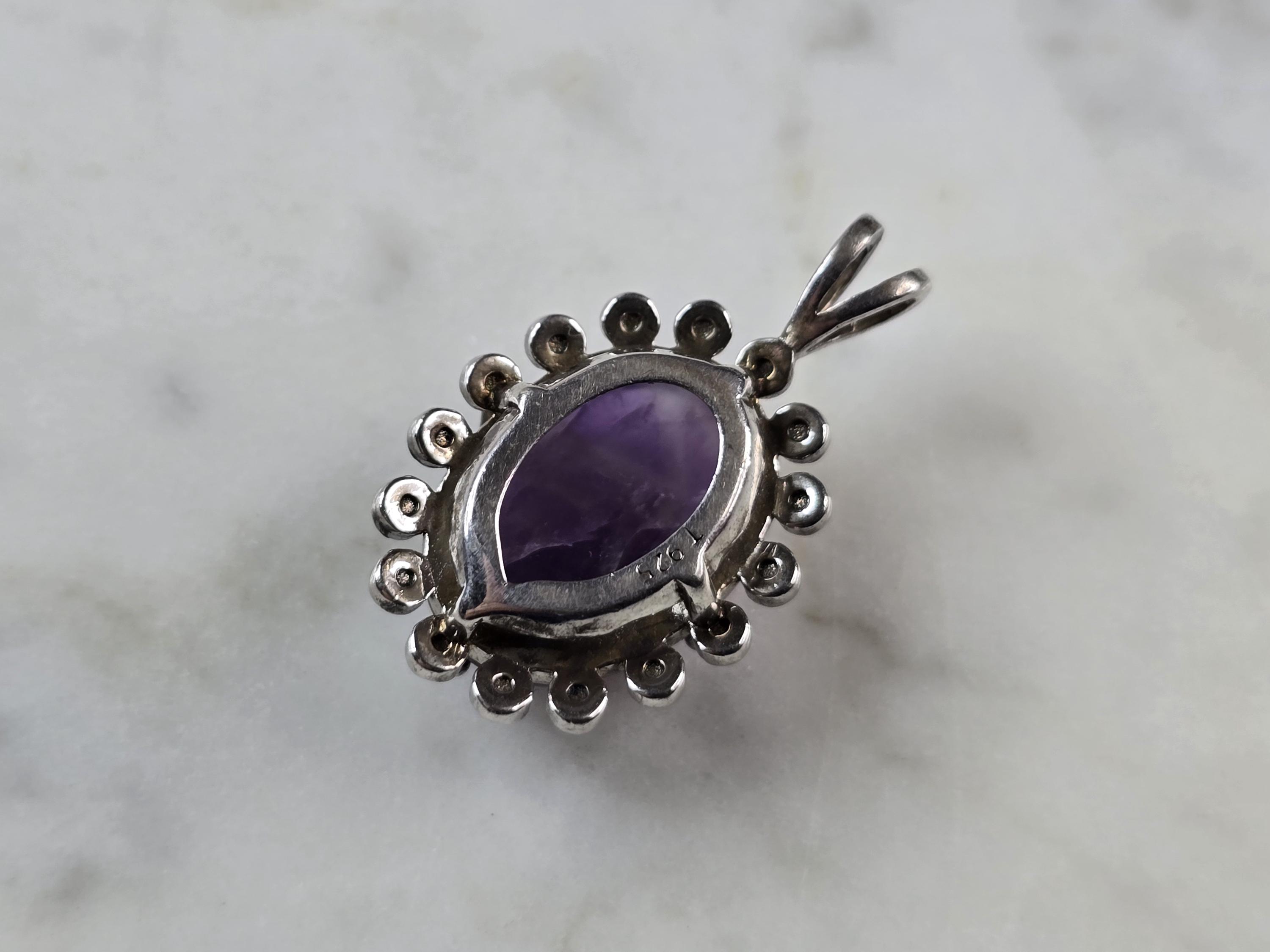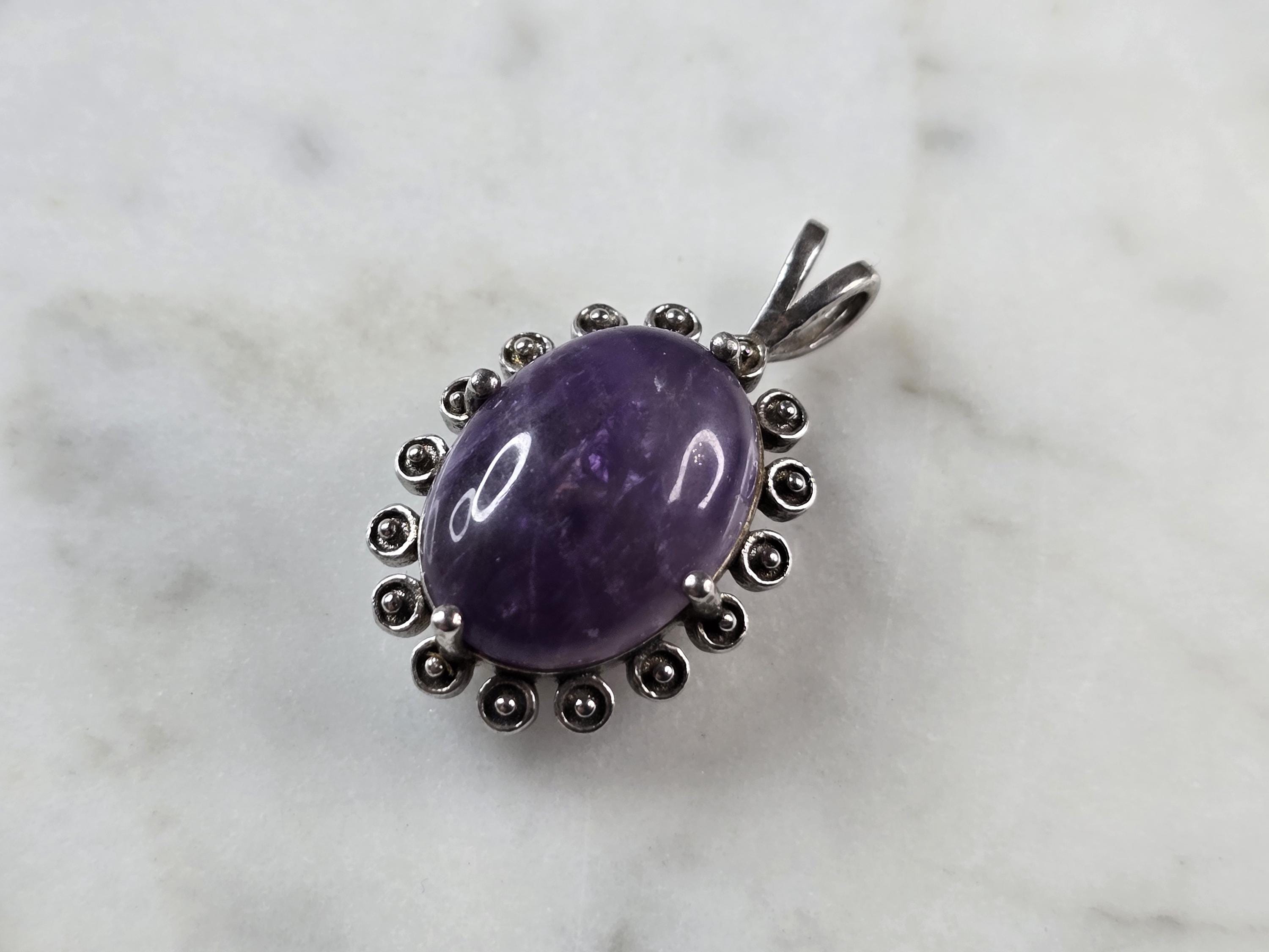 A WOMENS ESTATE STERLING SILVER AMETHYST PENDANT . THE PENDANT MEASURES 1" LONG BY 5/8" WIDE, AND WEIGHS 4.0g. WOULD MAKE A GREAT GIFT FOR THAT SPECIAL SOMEONE. ANY QUESTIONS PLEASE DO NOT HESITATE TO ASK. BE SURE TO CHECK OUT SOME OF MY OTHER GREAT ITEMS UP FOR SALE. THANK YOU.